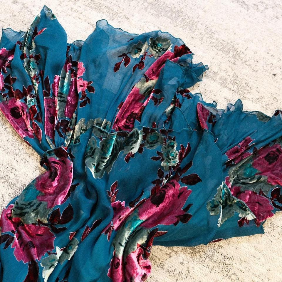 A mermaid allure dress with lush blooms of deep magenta and velvet green.
