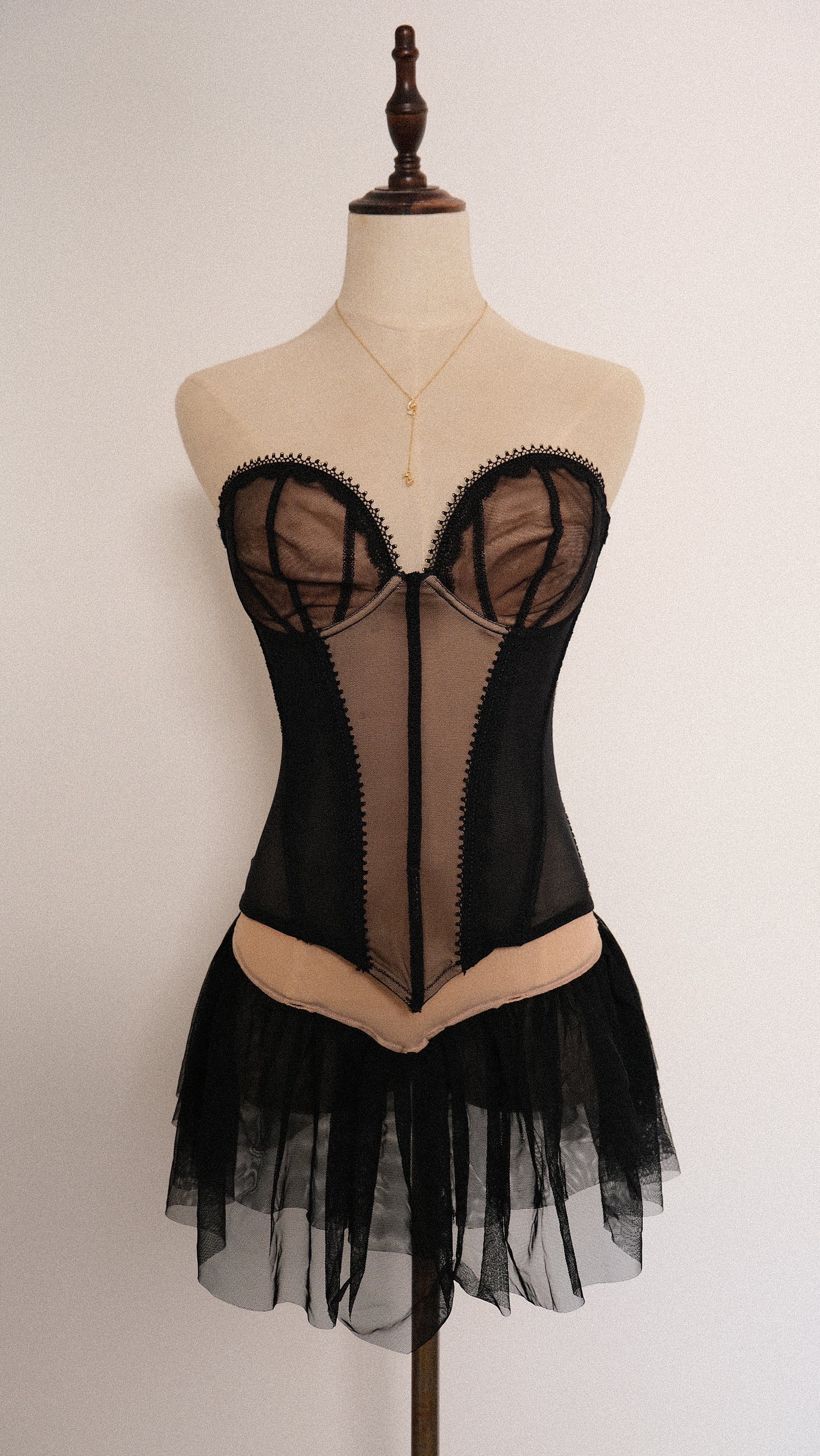 A French 2 piece set sculpted like the elegance of a mermaid’s cloak rising from the depths. A corset combined with a delicate mesh tutu ultra mini skirt.