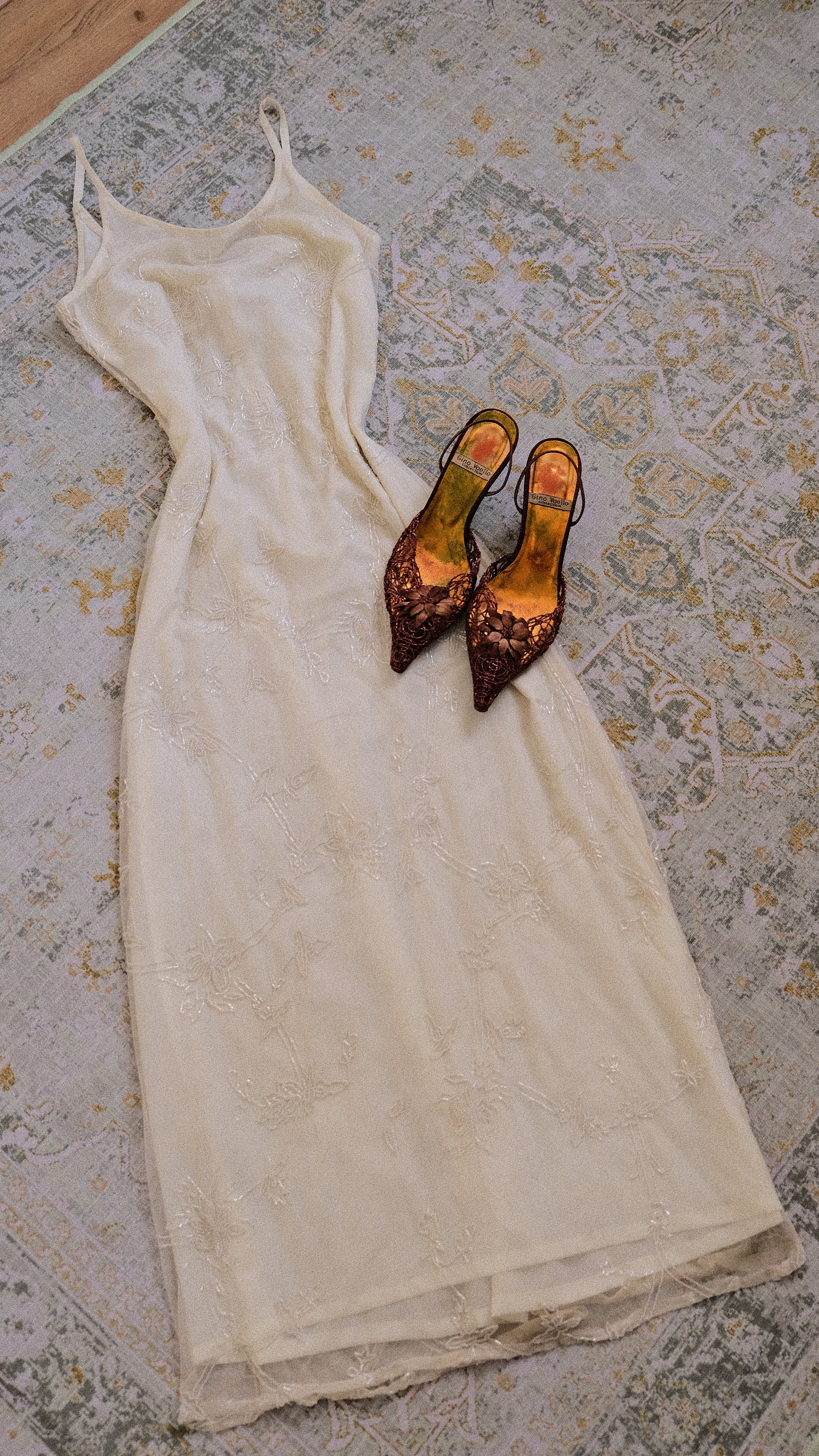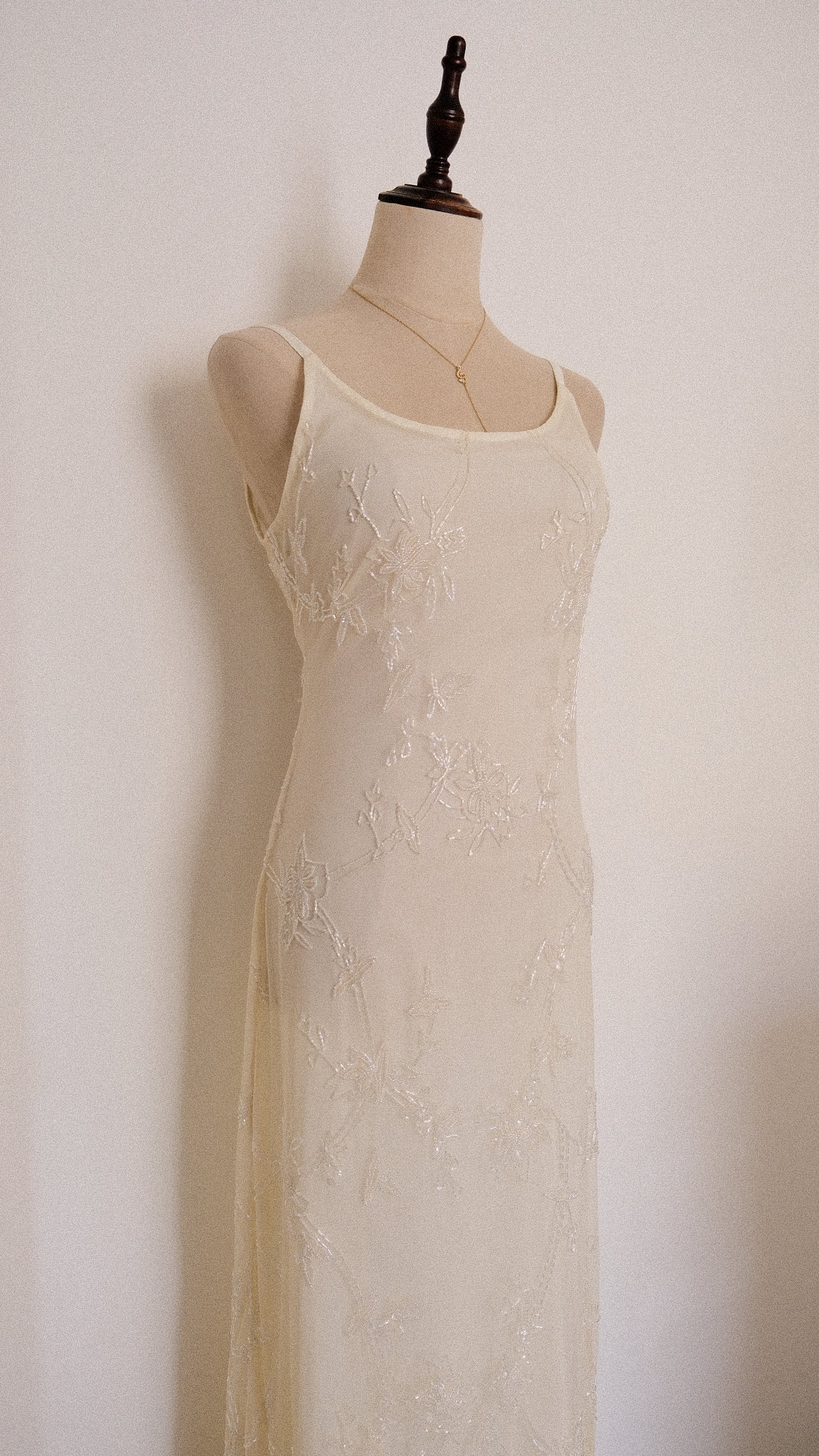 A delicate evening dress that whispers of a secret meadow kissed by morning dew. The dress has a sheer overlay that captures gentle and timeless beauty with floral embellishments.