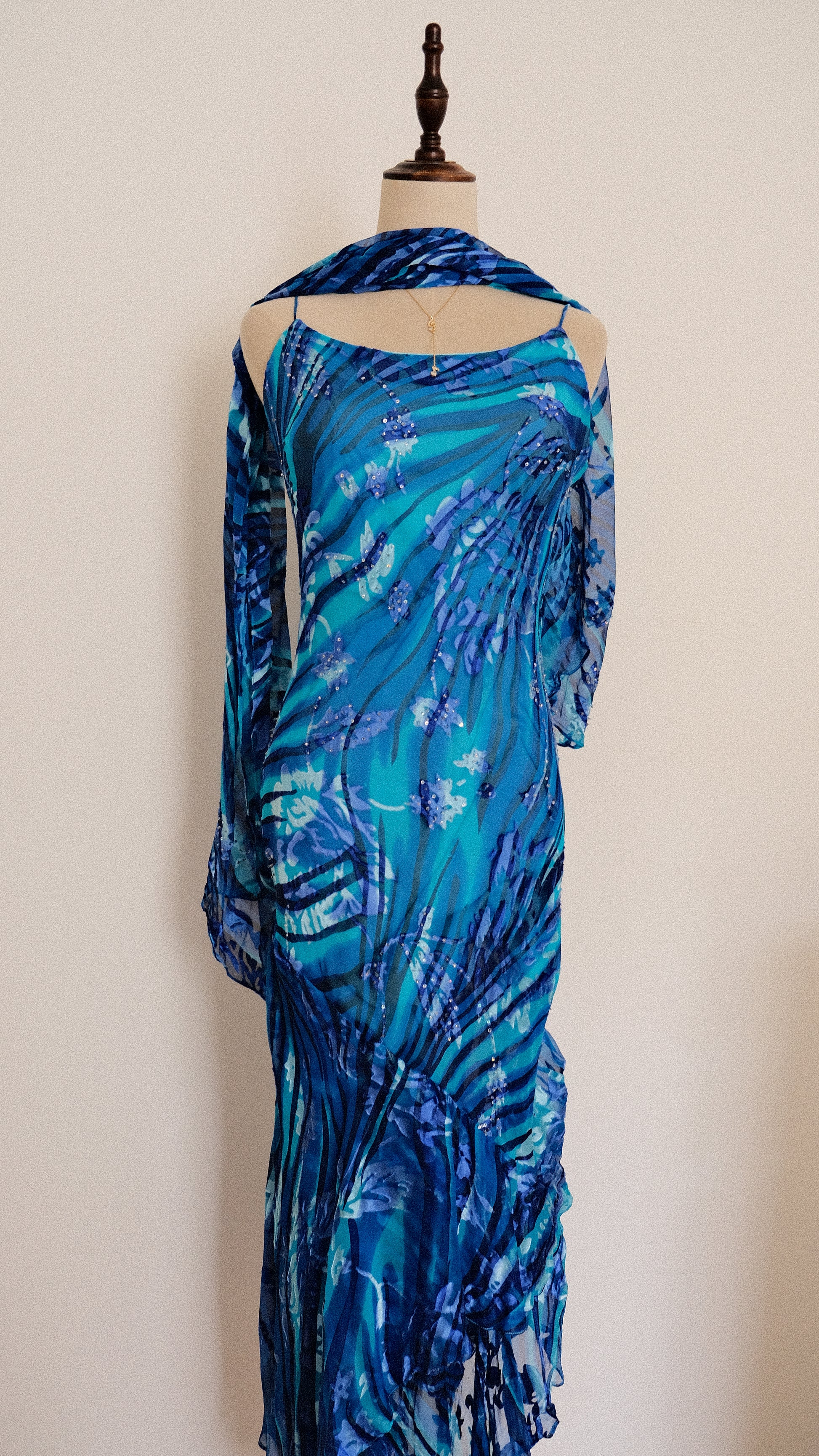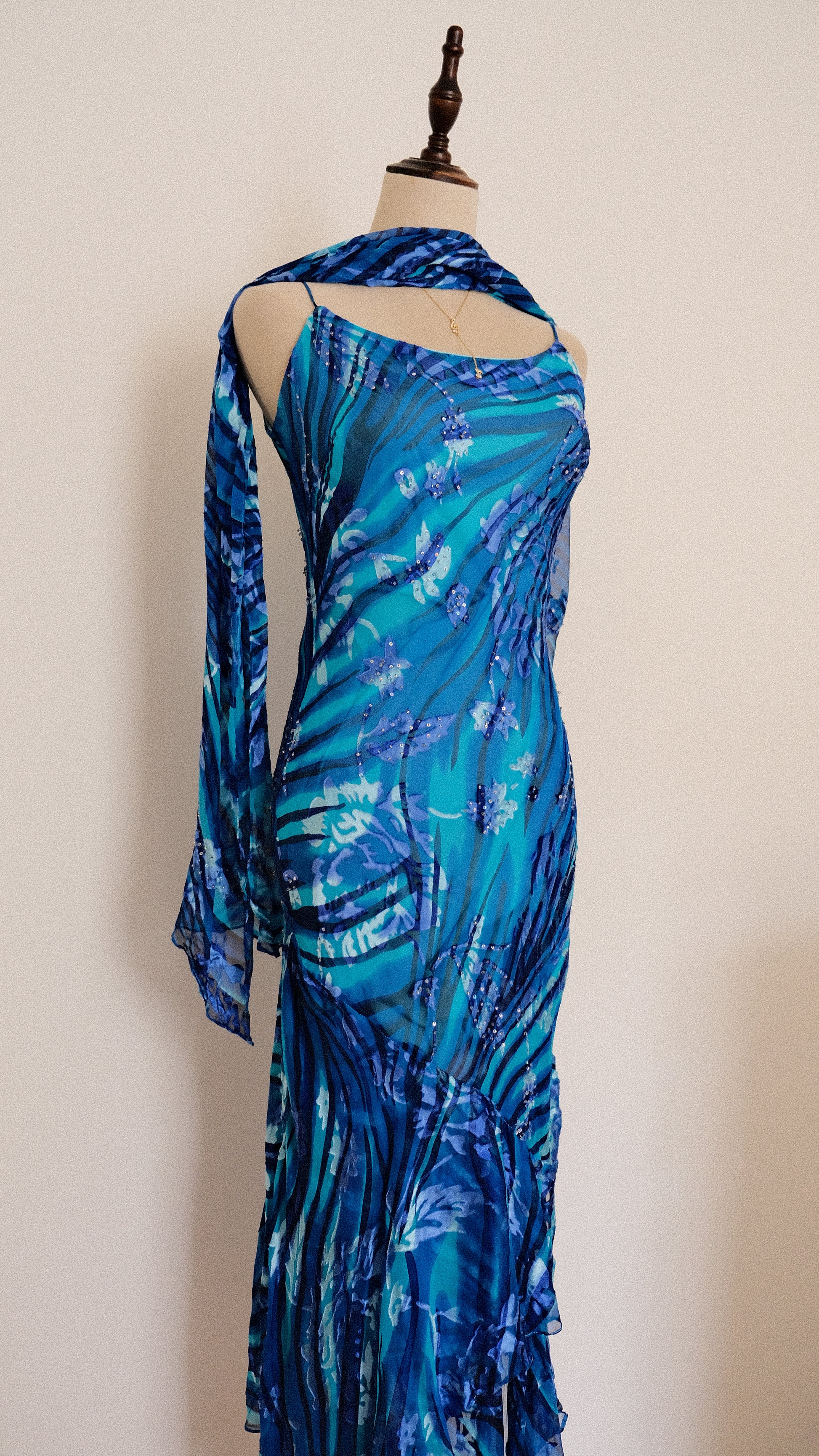 A mermaid dress with mystical waves in shades of deep blue colors.