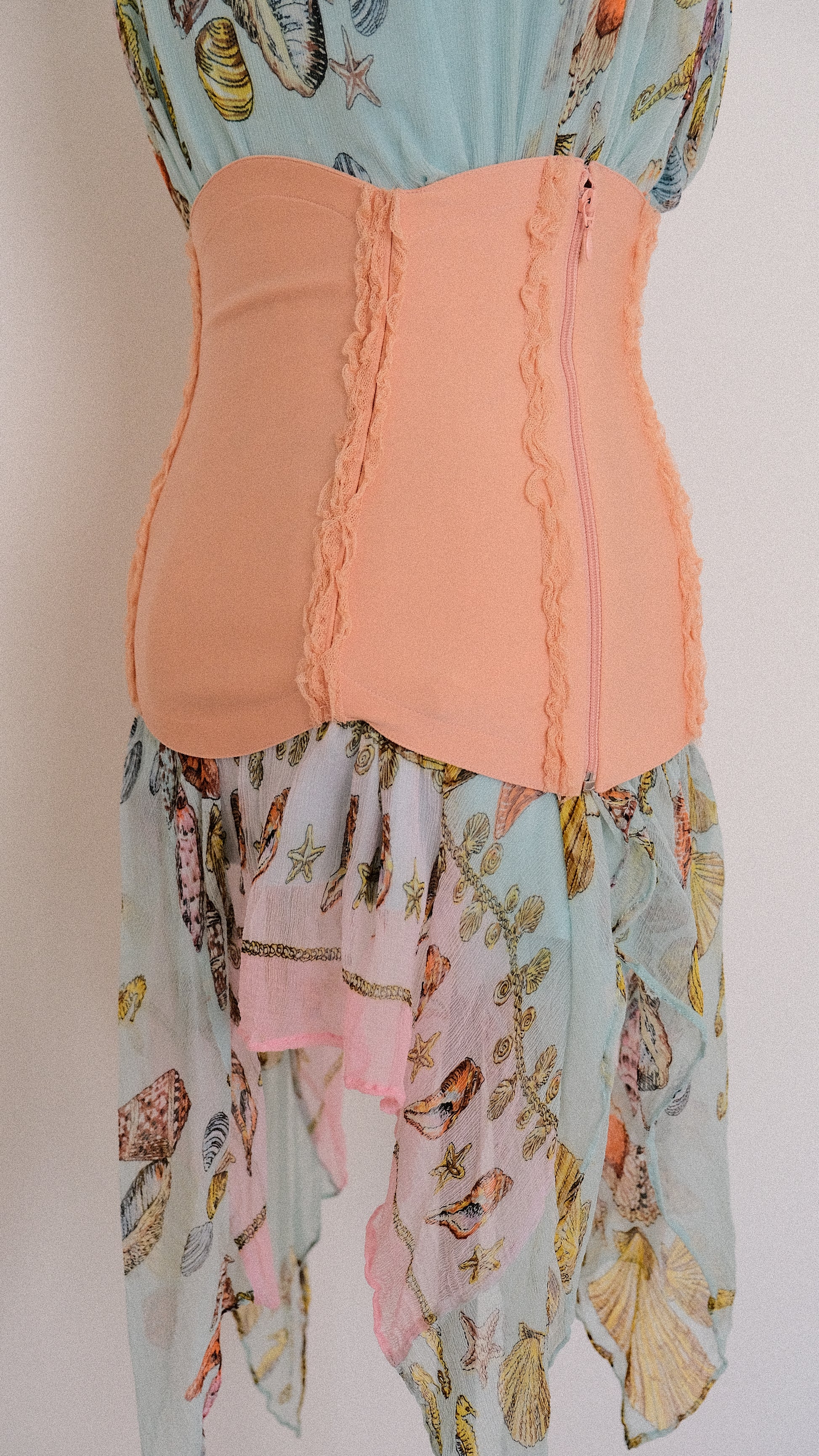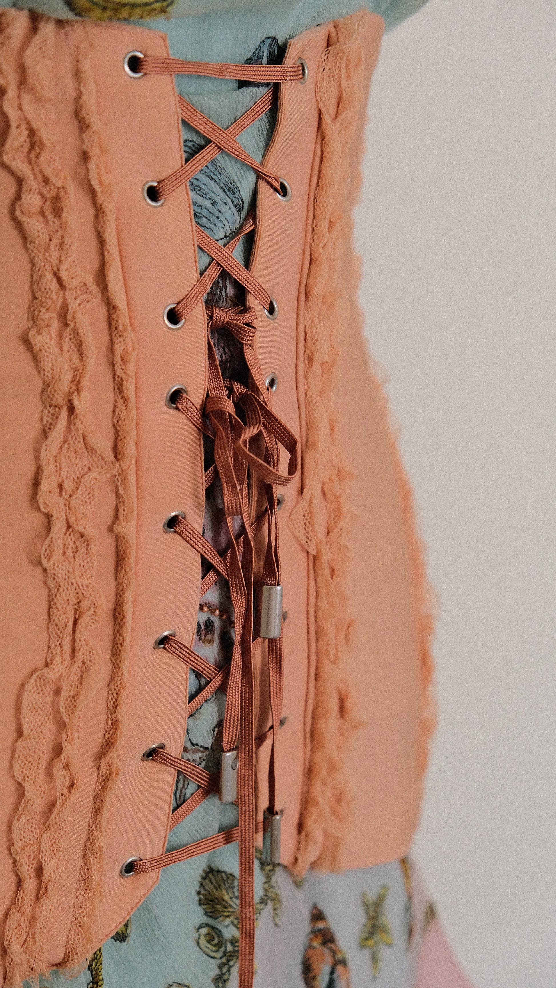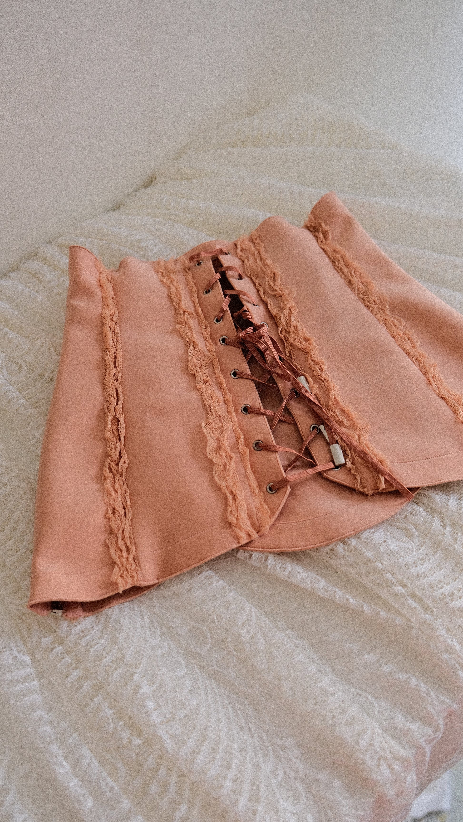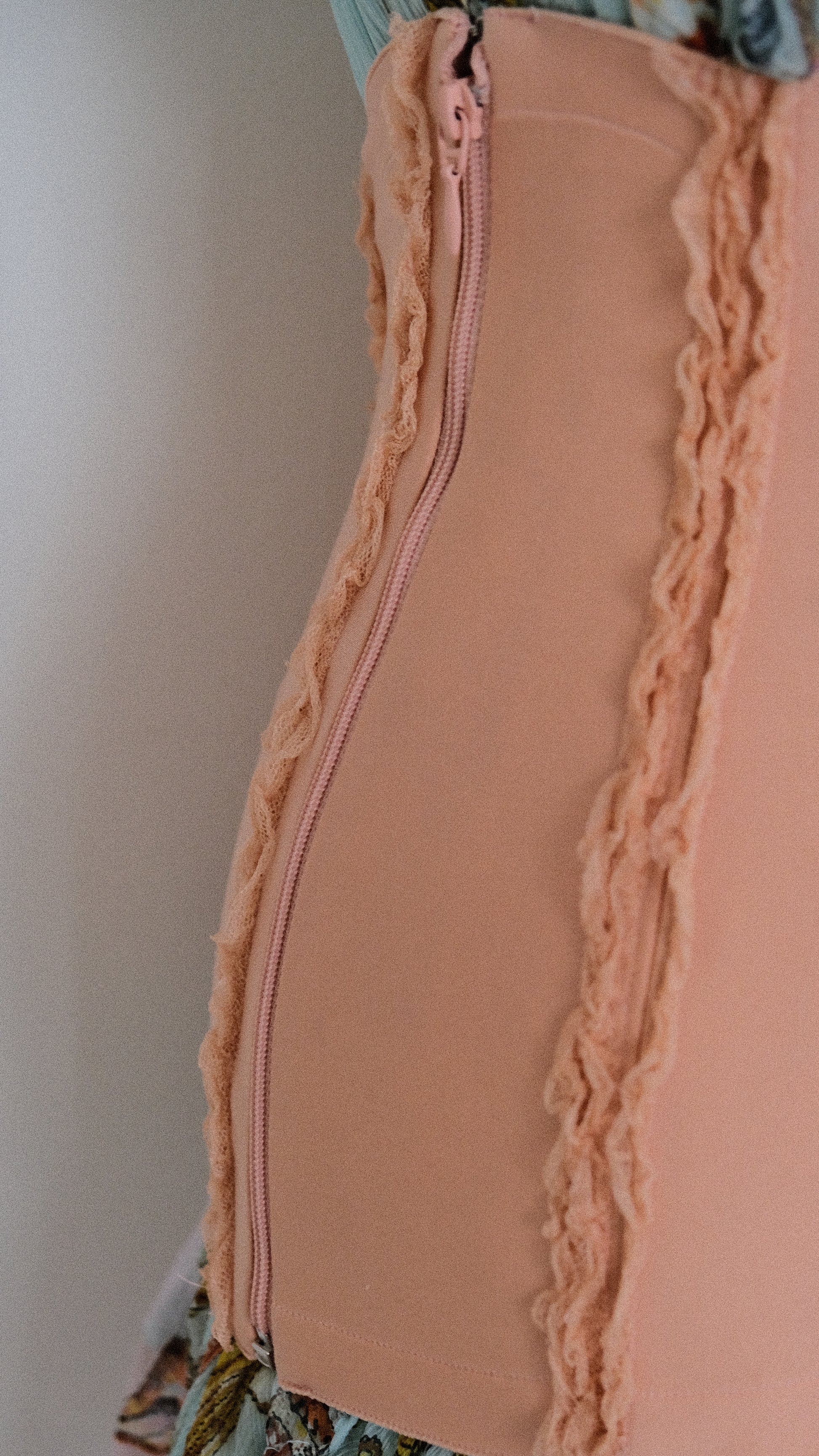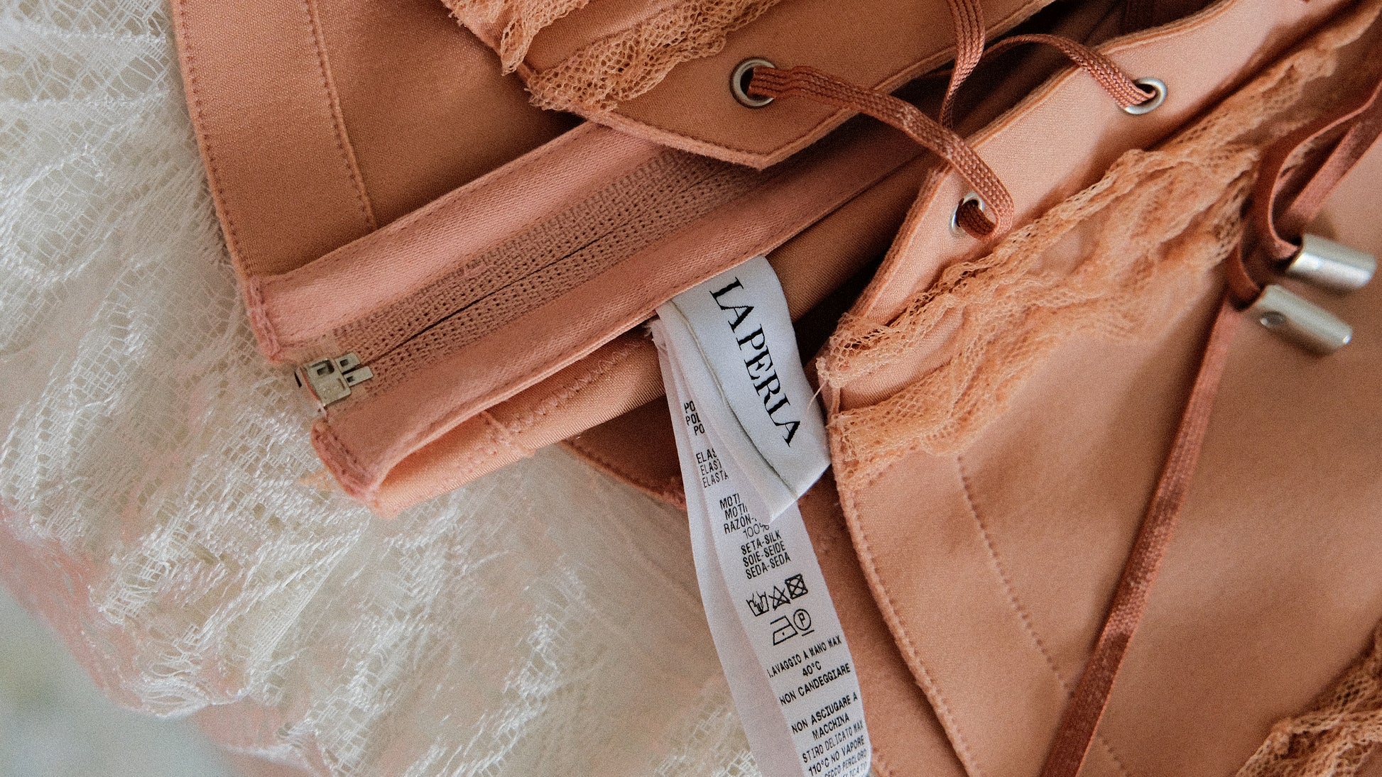 A peachy blush garter belt with ruffles and lace from the brand La Perla.