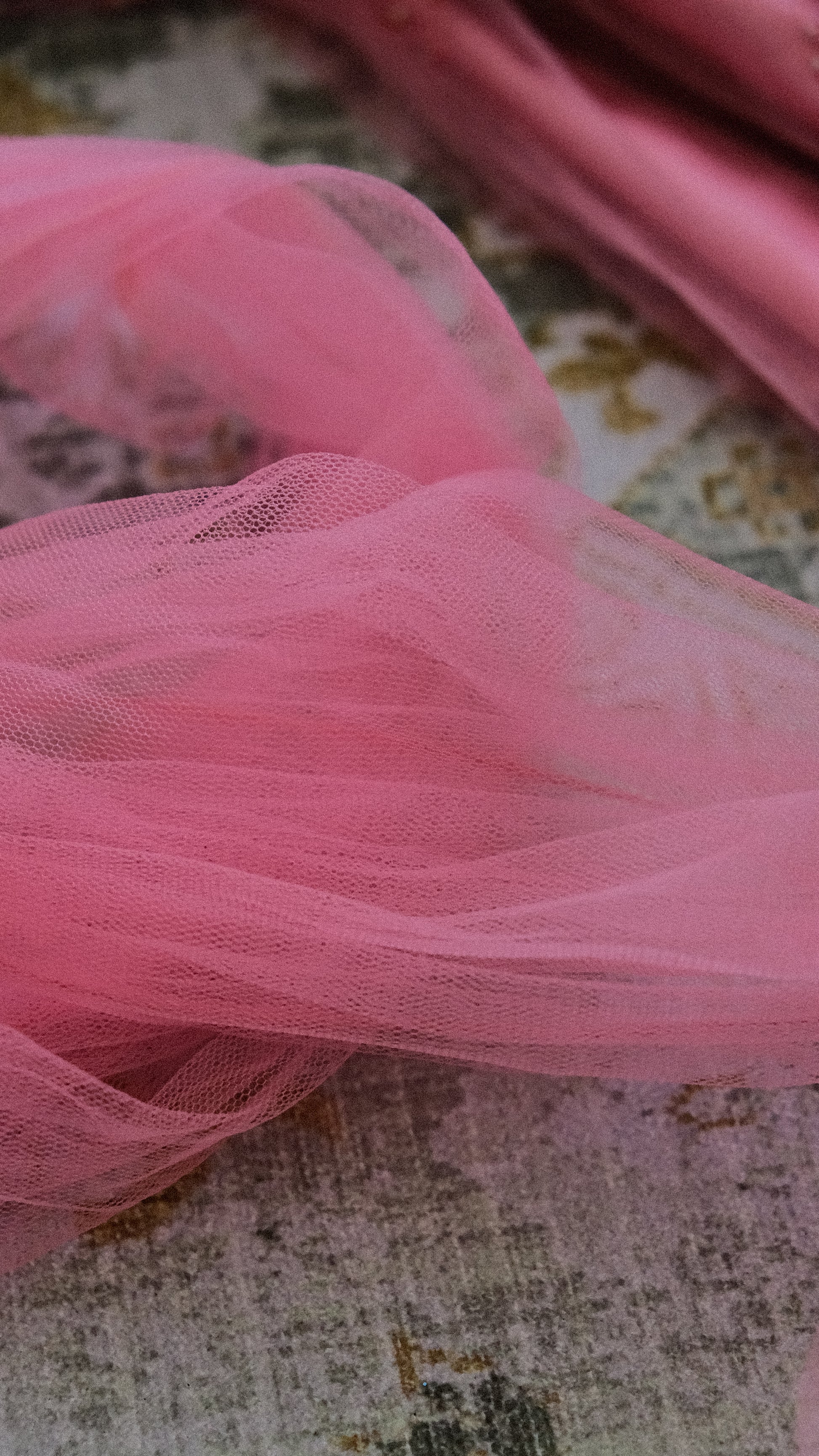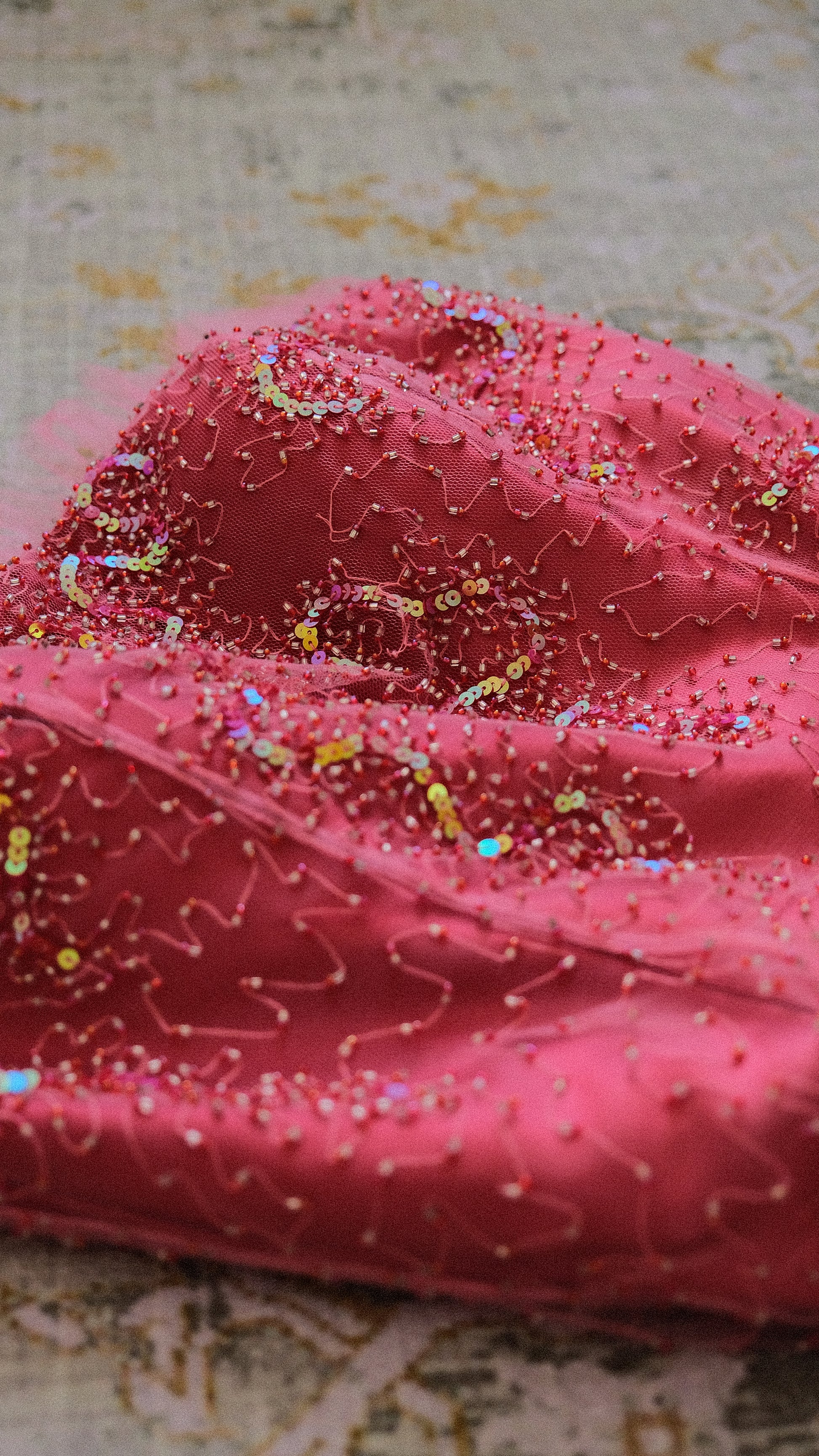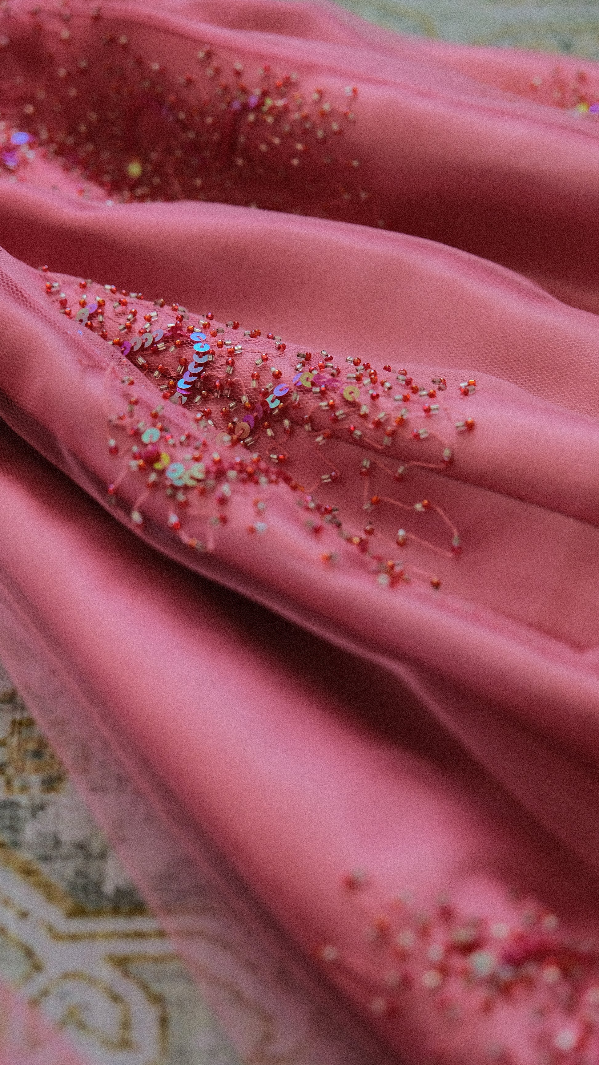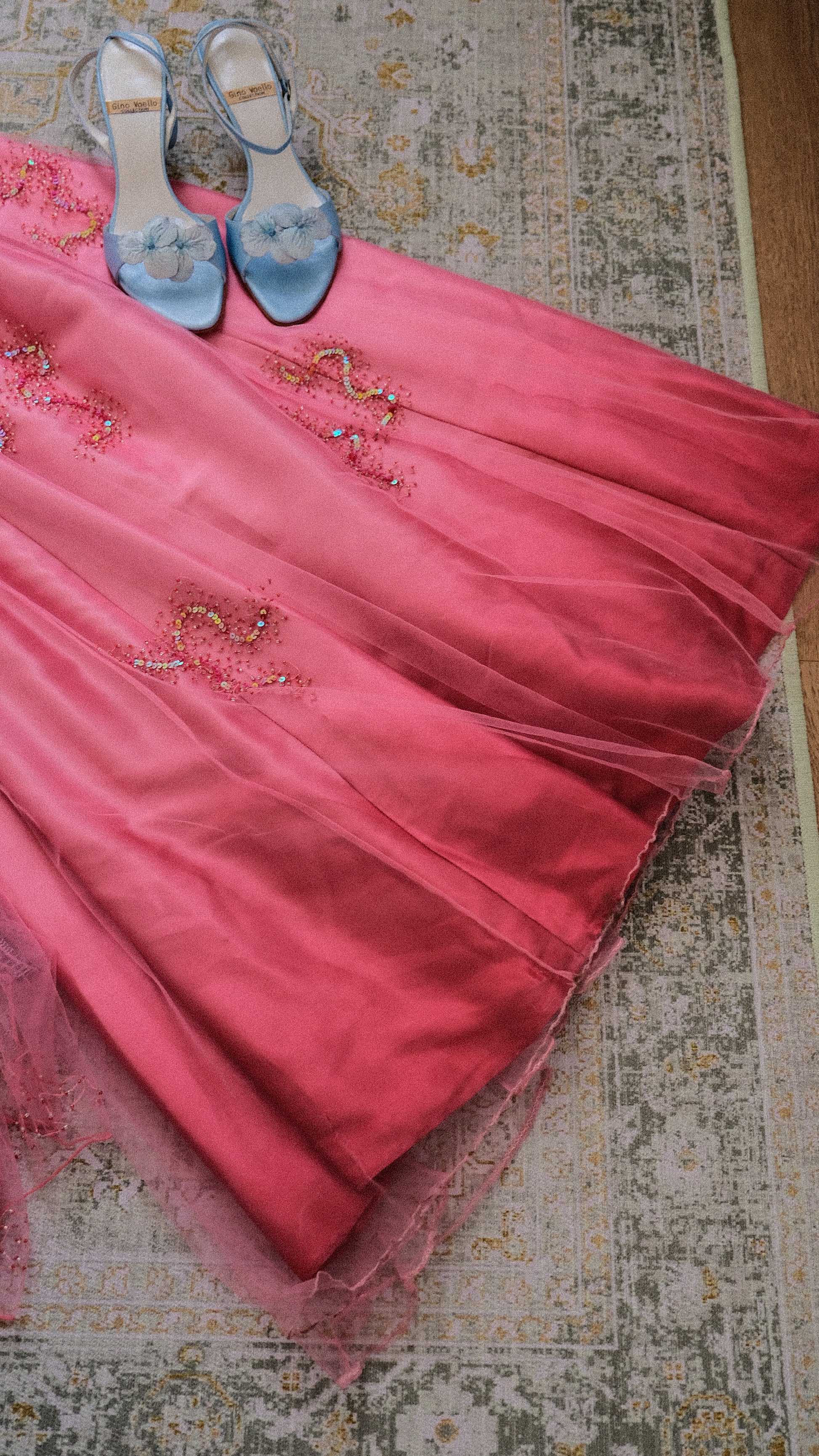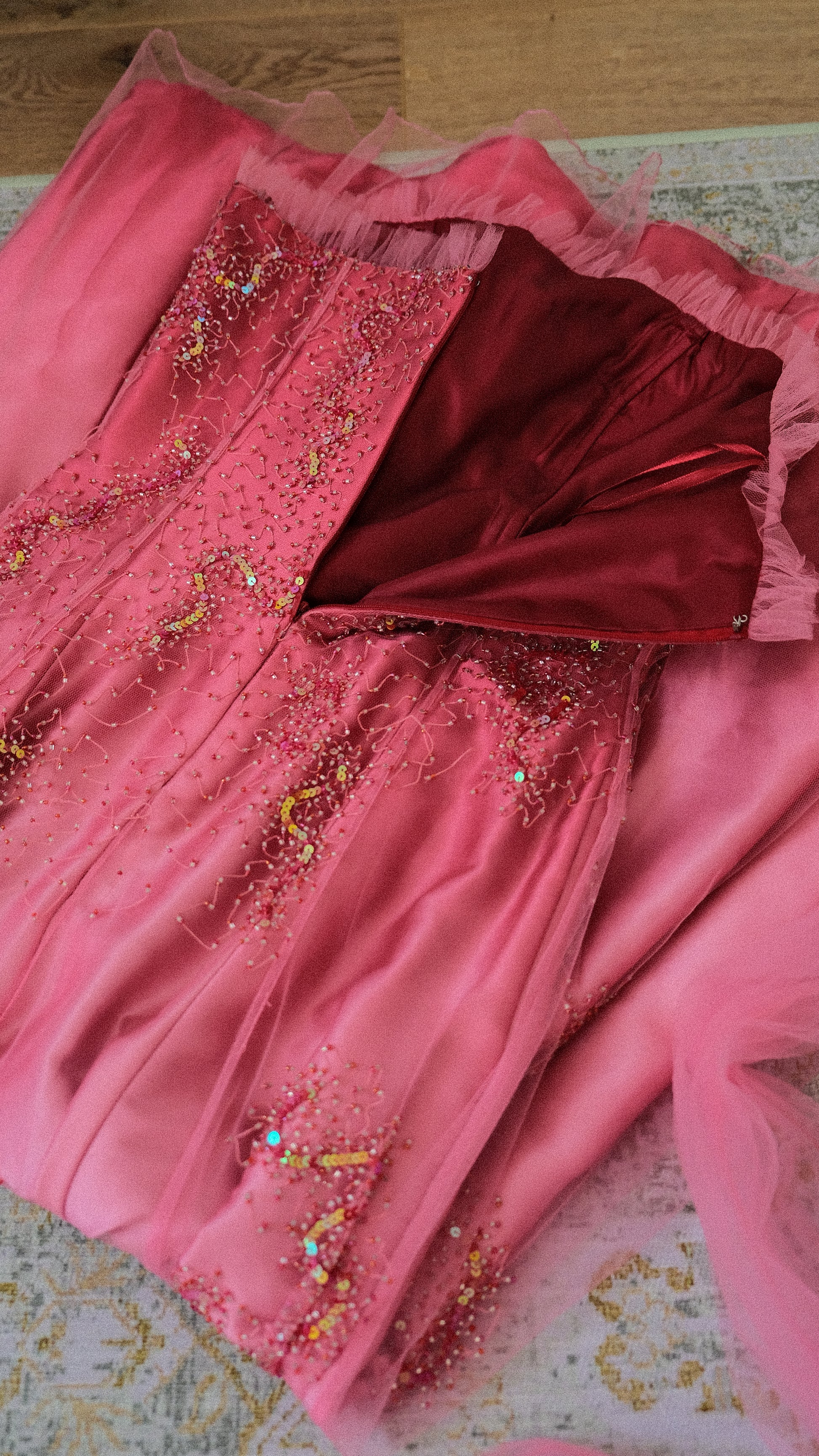 A rare embellished pink ombre strapless dress; luminous and floating like a dream.