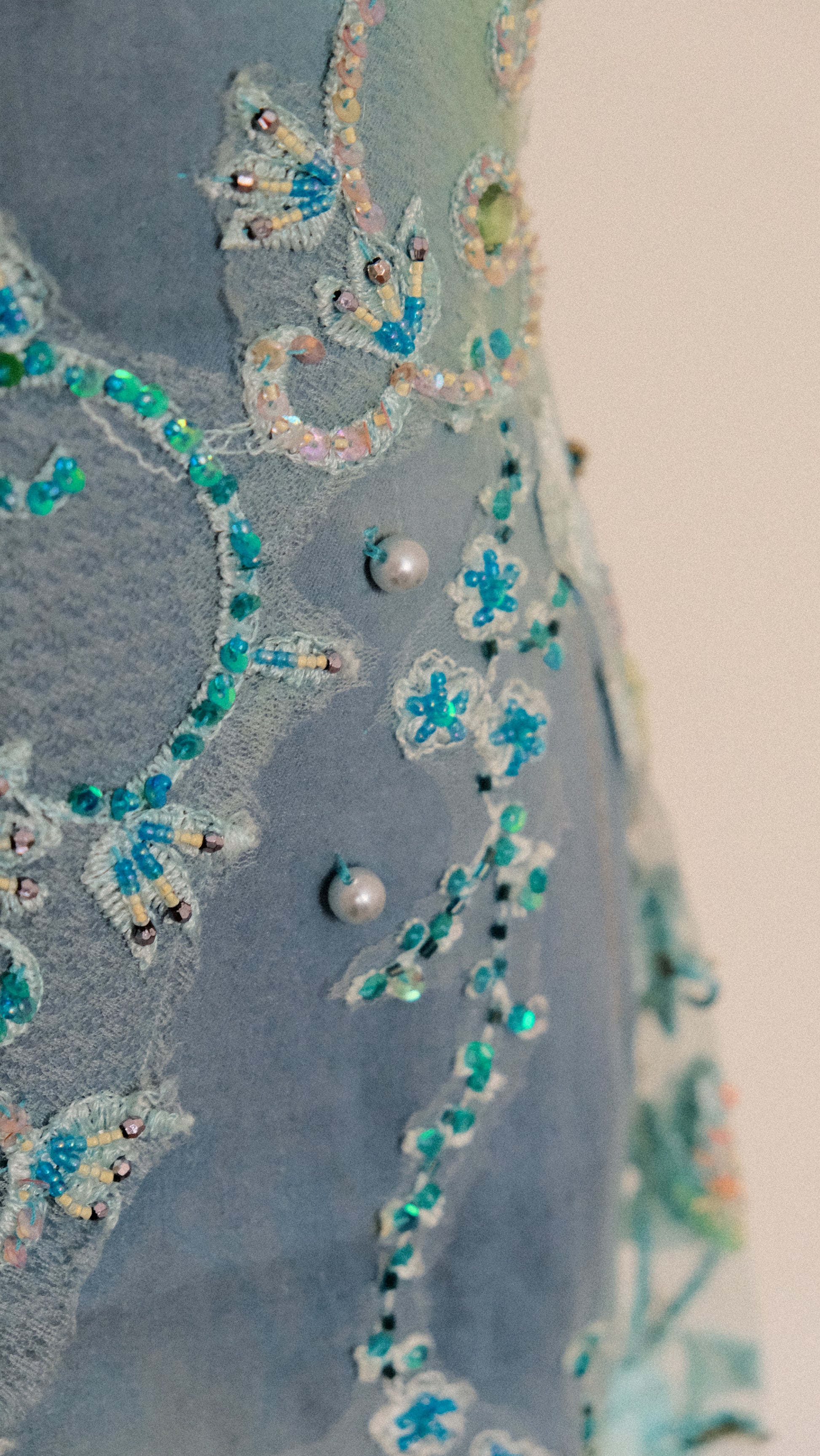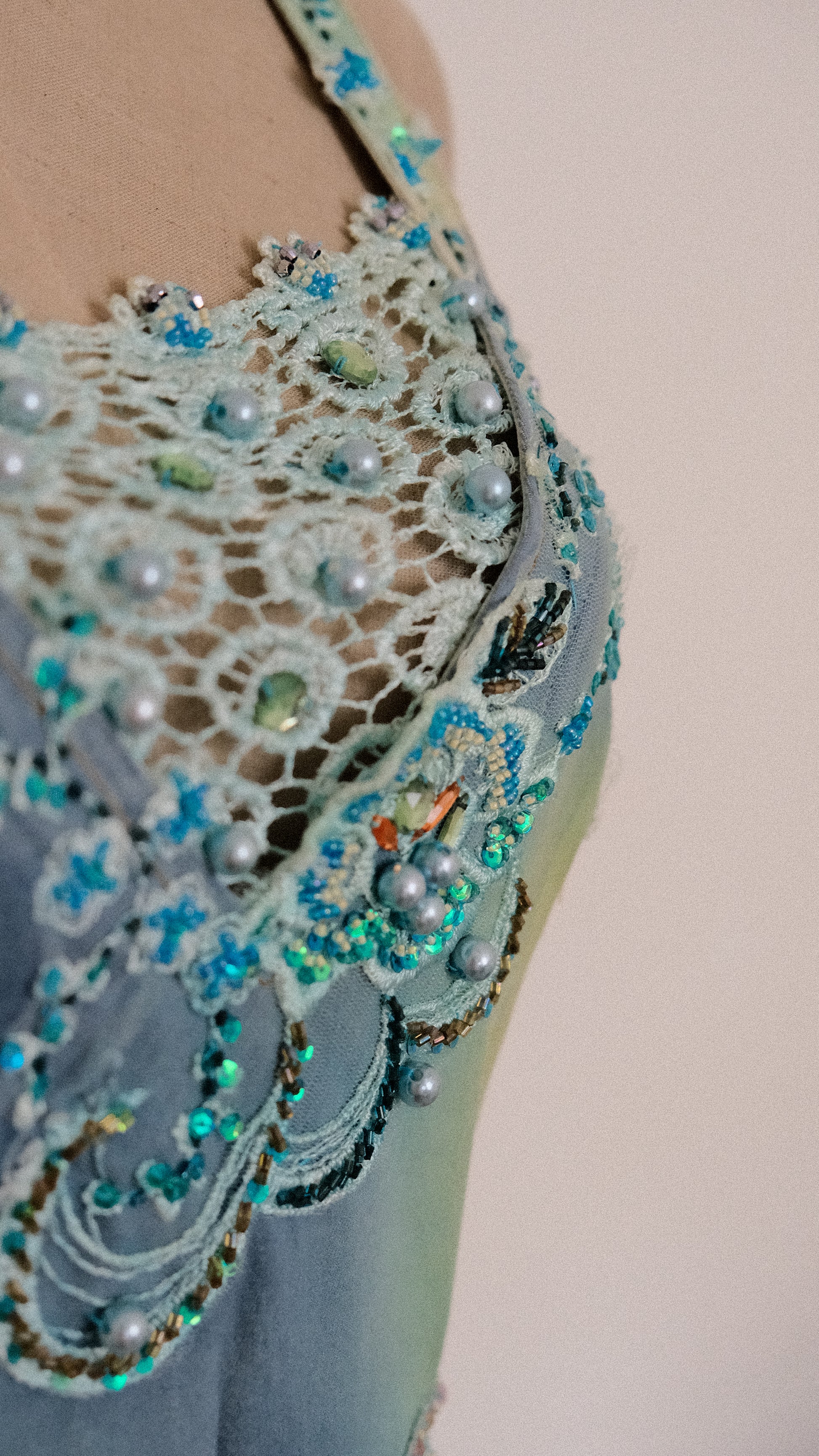 A rare romantic mermaid dress with a mesmerizing oceanic color palette and the most beautiful sequins, embroidery and faux pearl detailing.