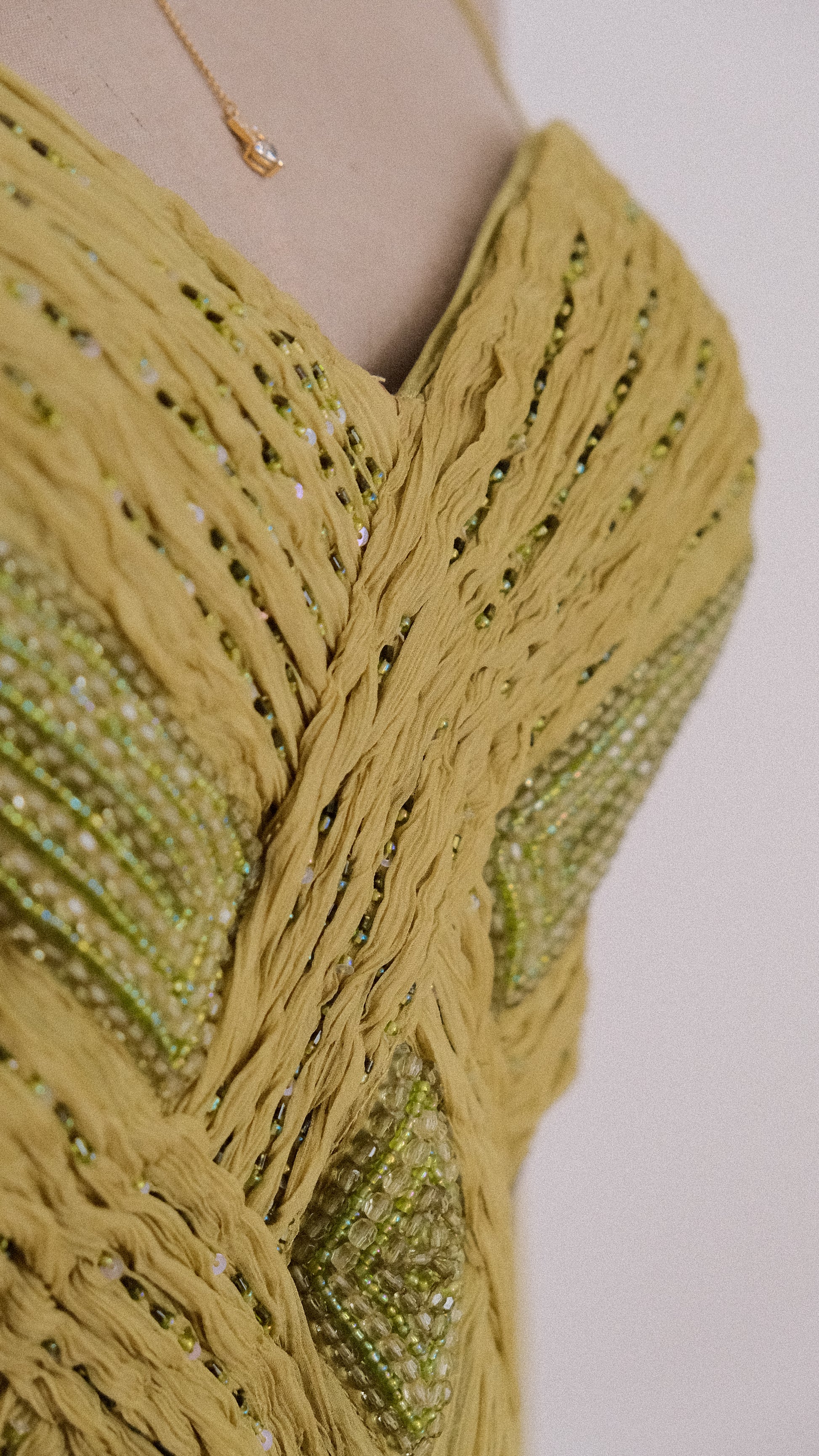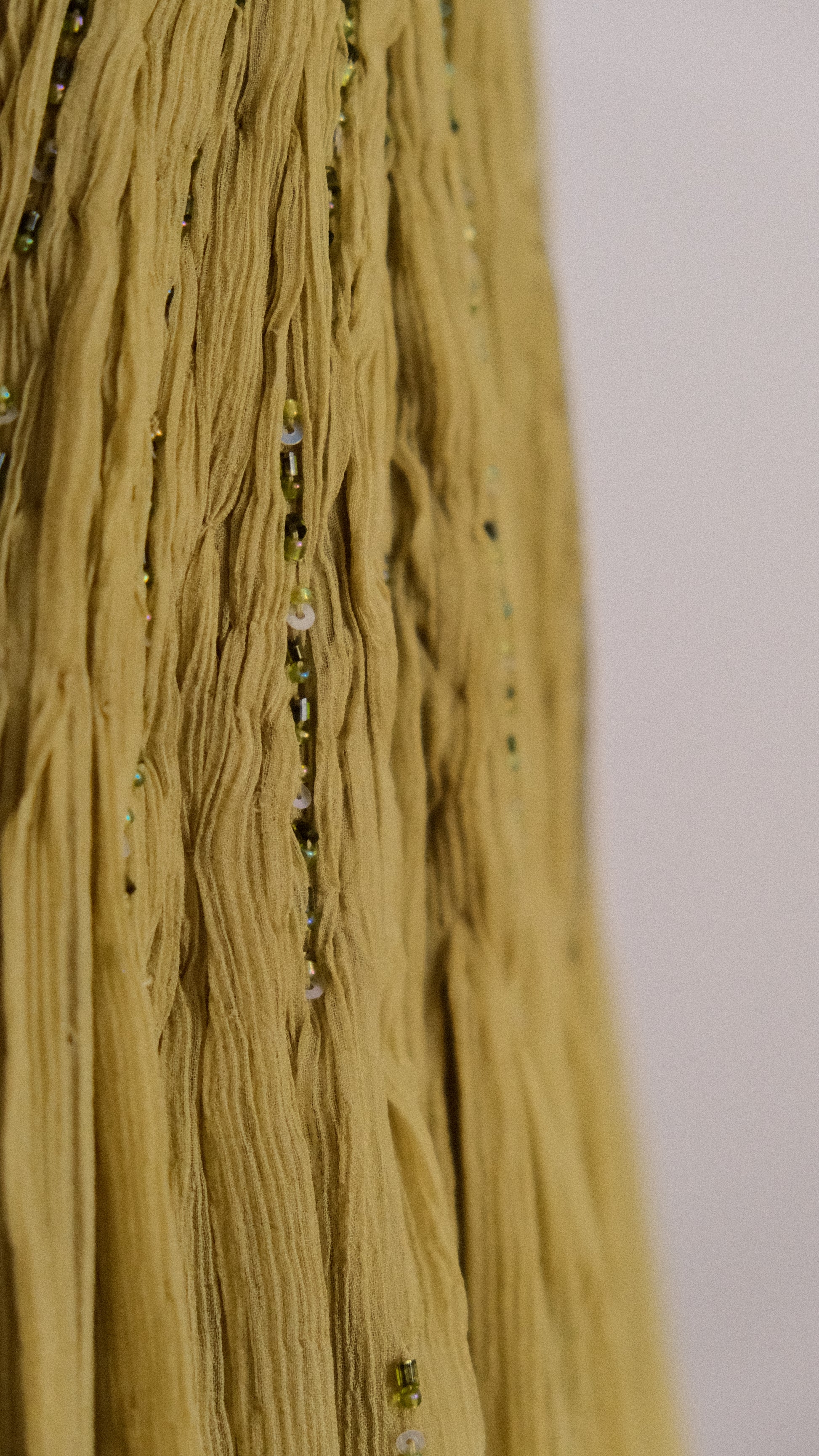 An olive colored flowy fairycore dress! The dress has a bustier with embellished detailing and the bottom part of this gown is extremely flowy, for an even more dreamy look.