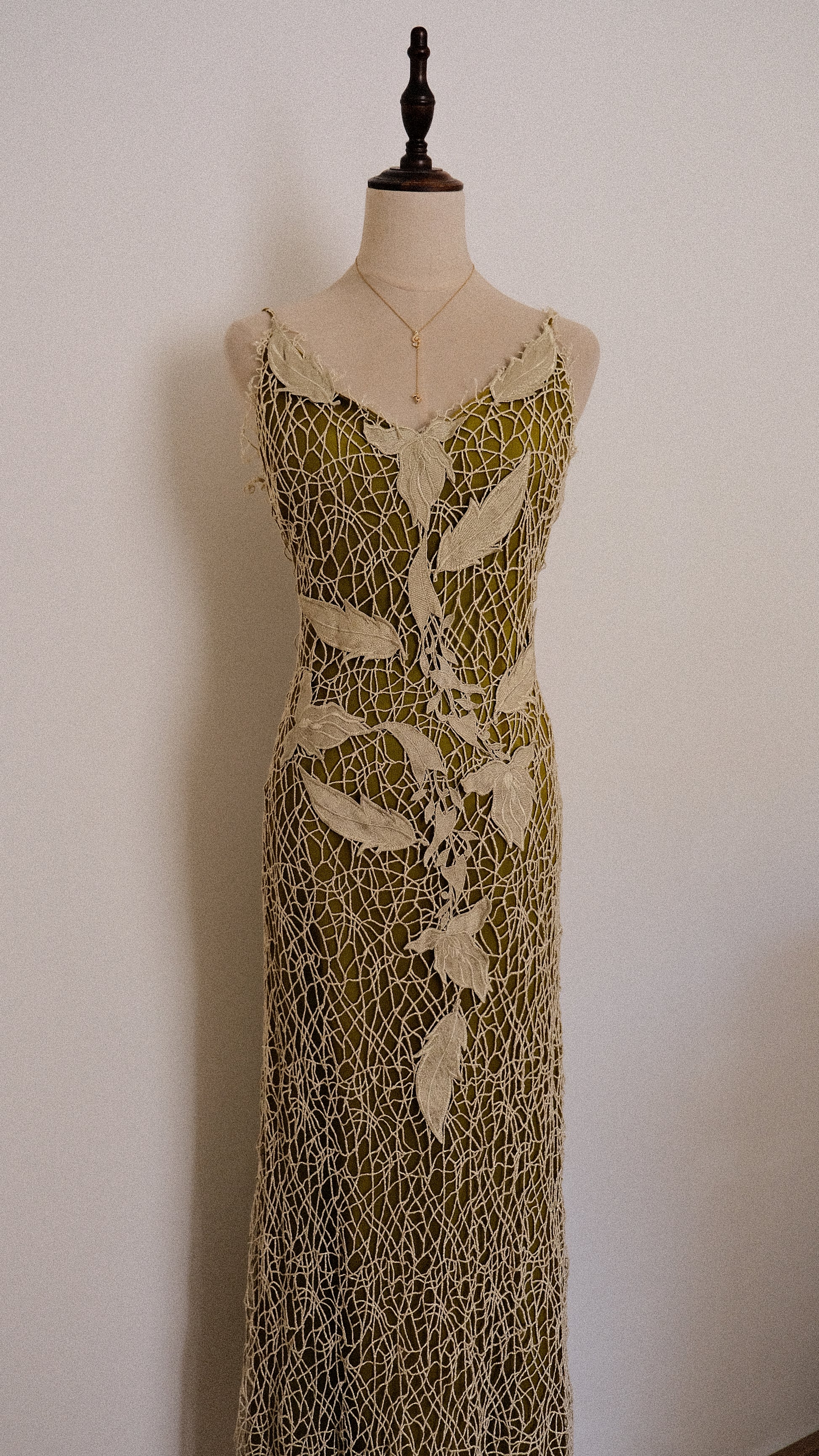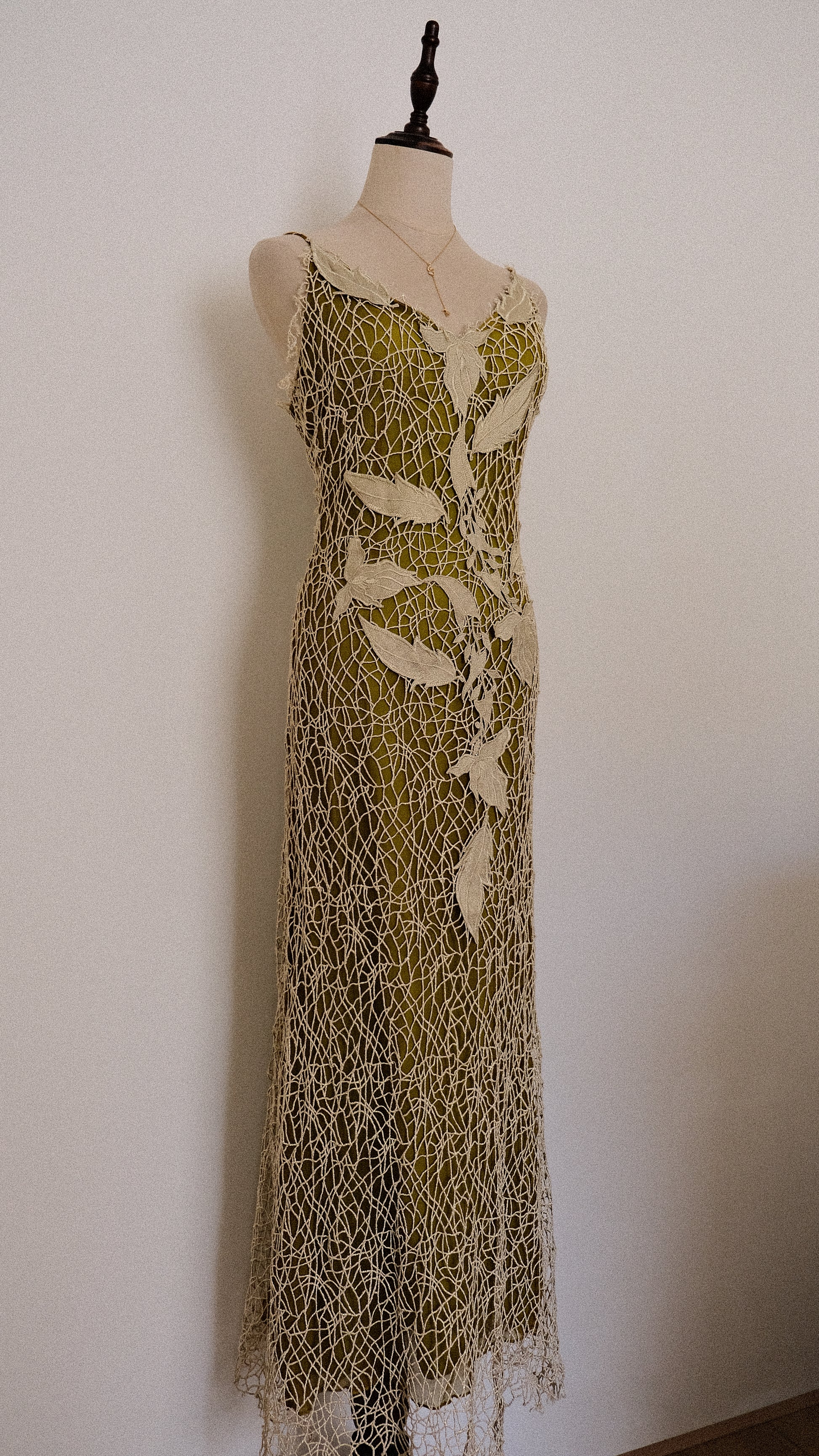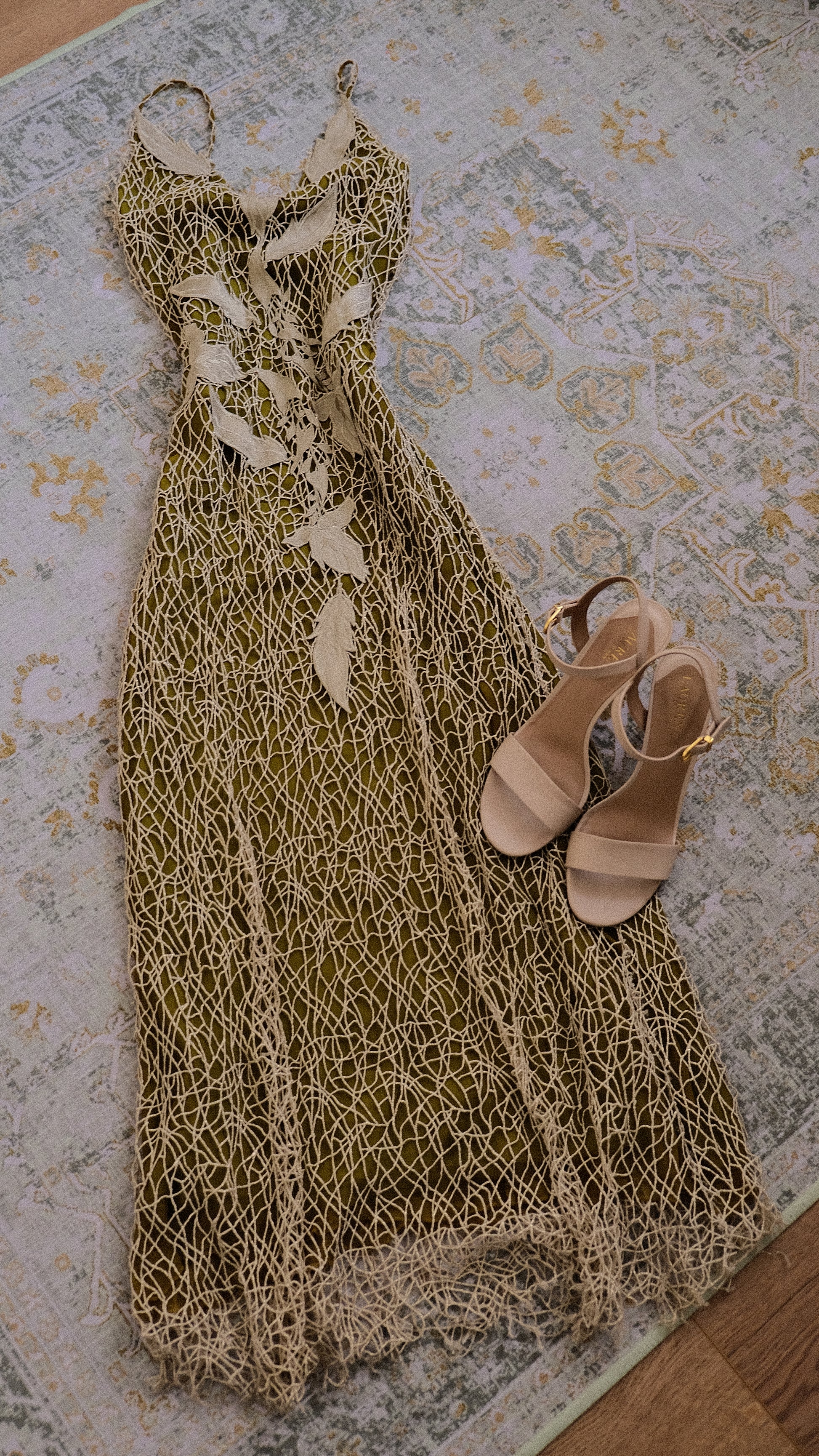A romantic olive green fairytale dress with golden nets and leaf detailing.