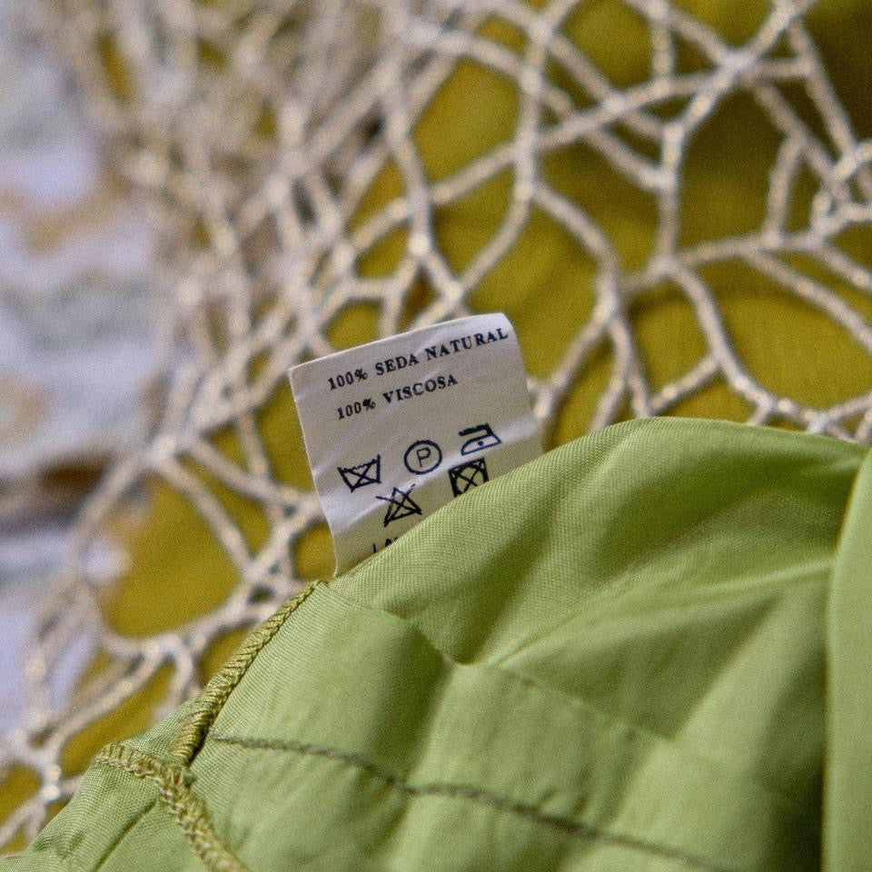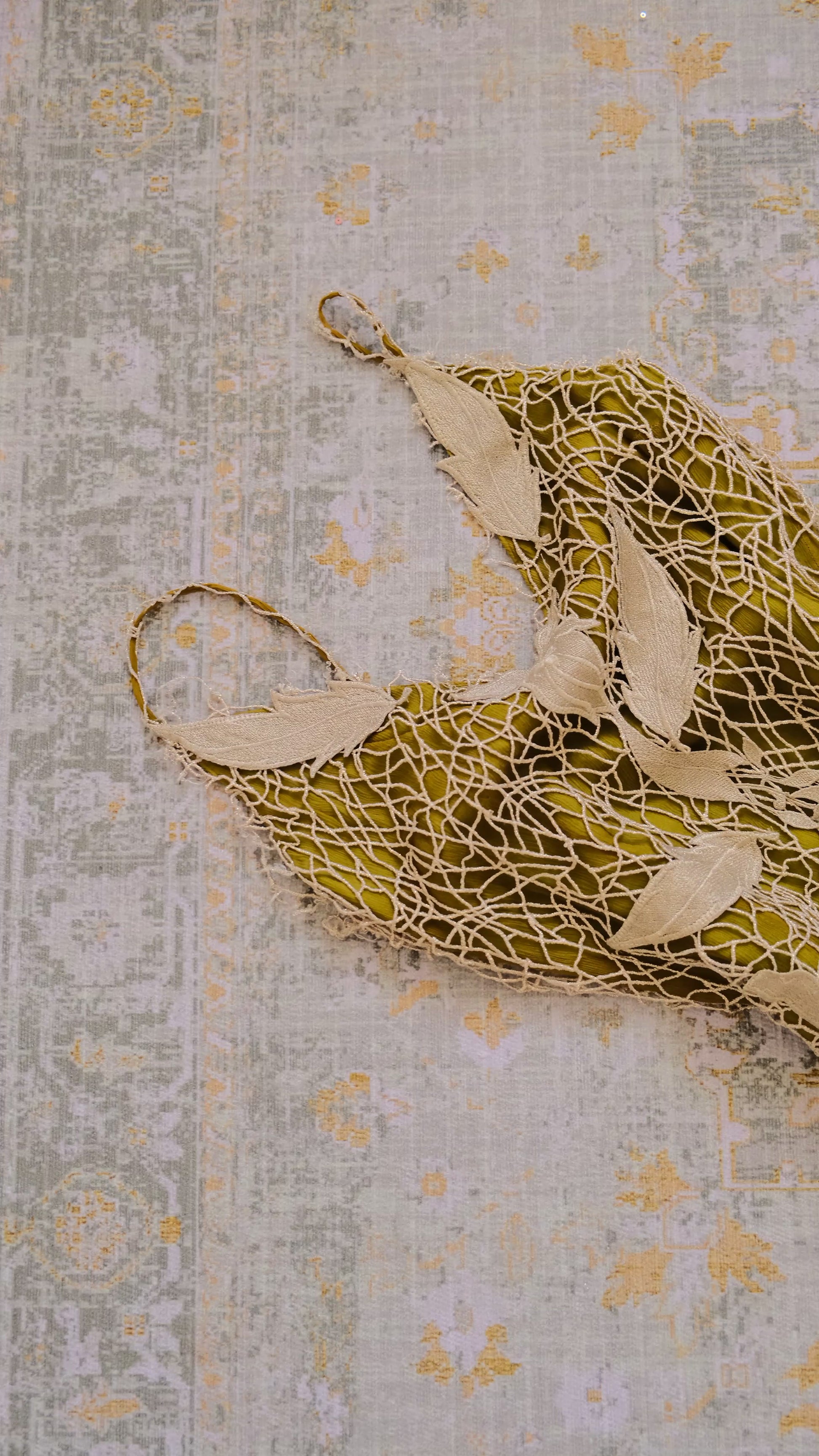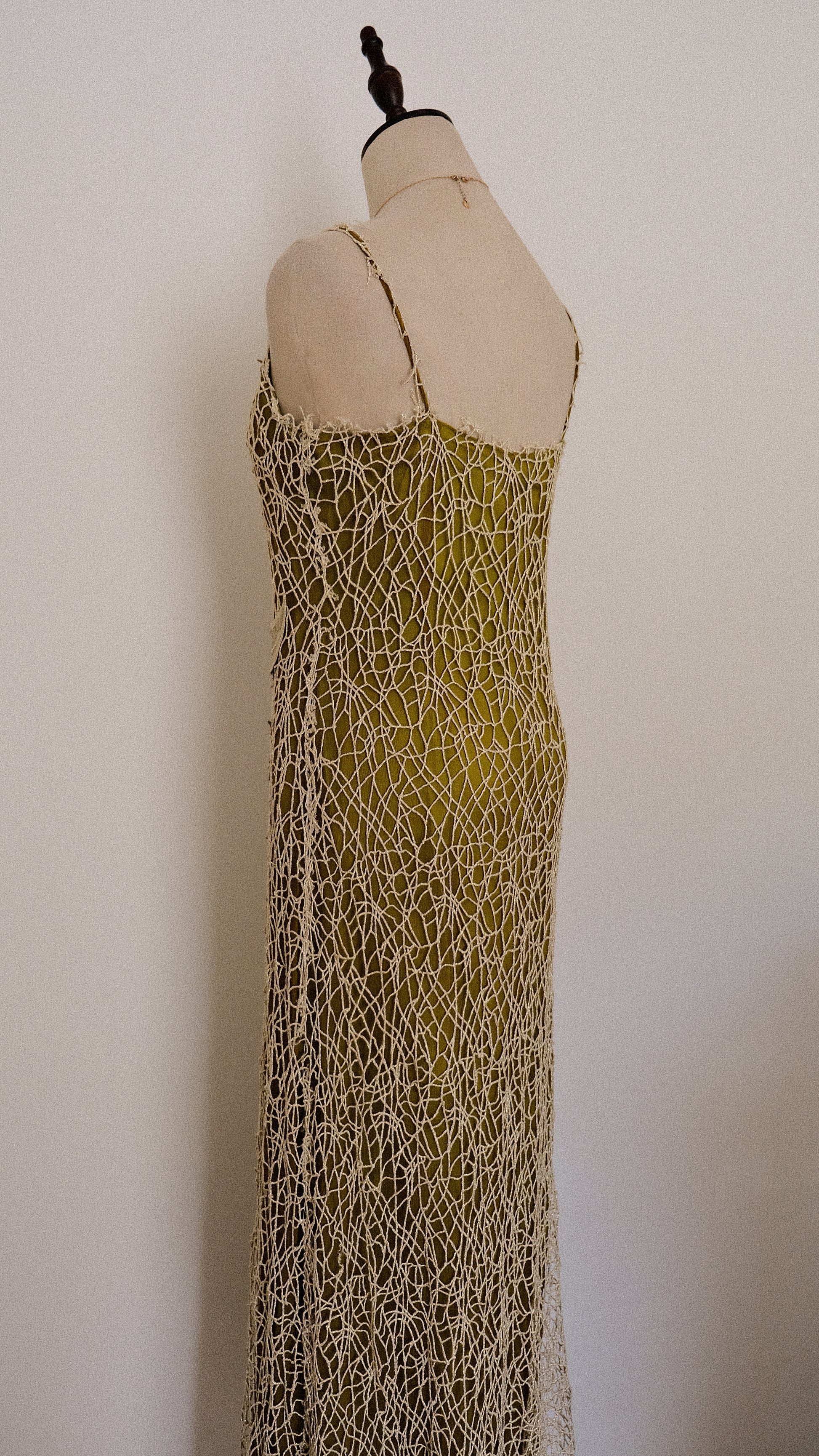 A romantic olive green fairytale dress with golden nets and leaf detailing.