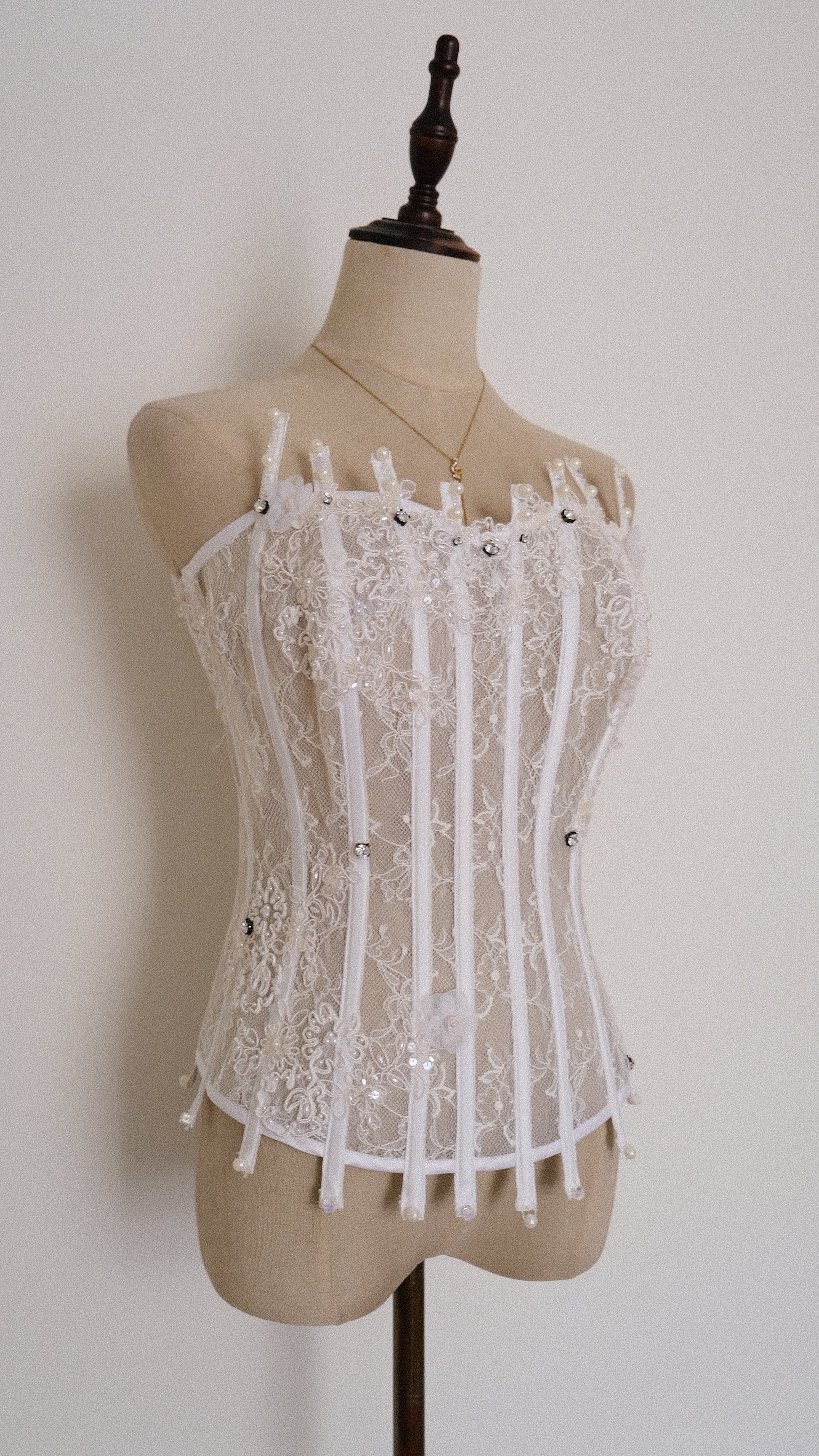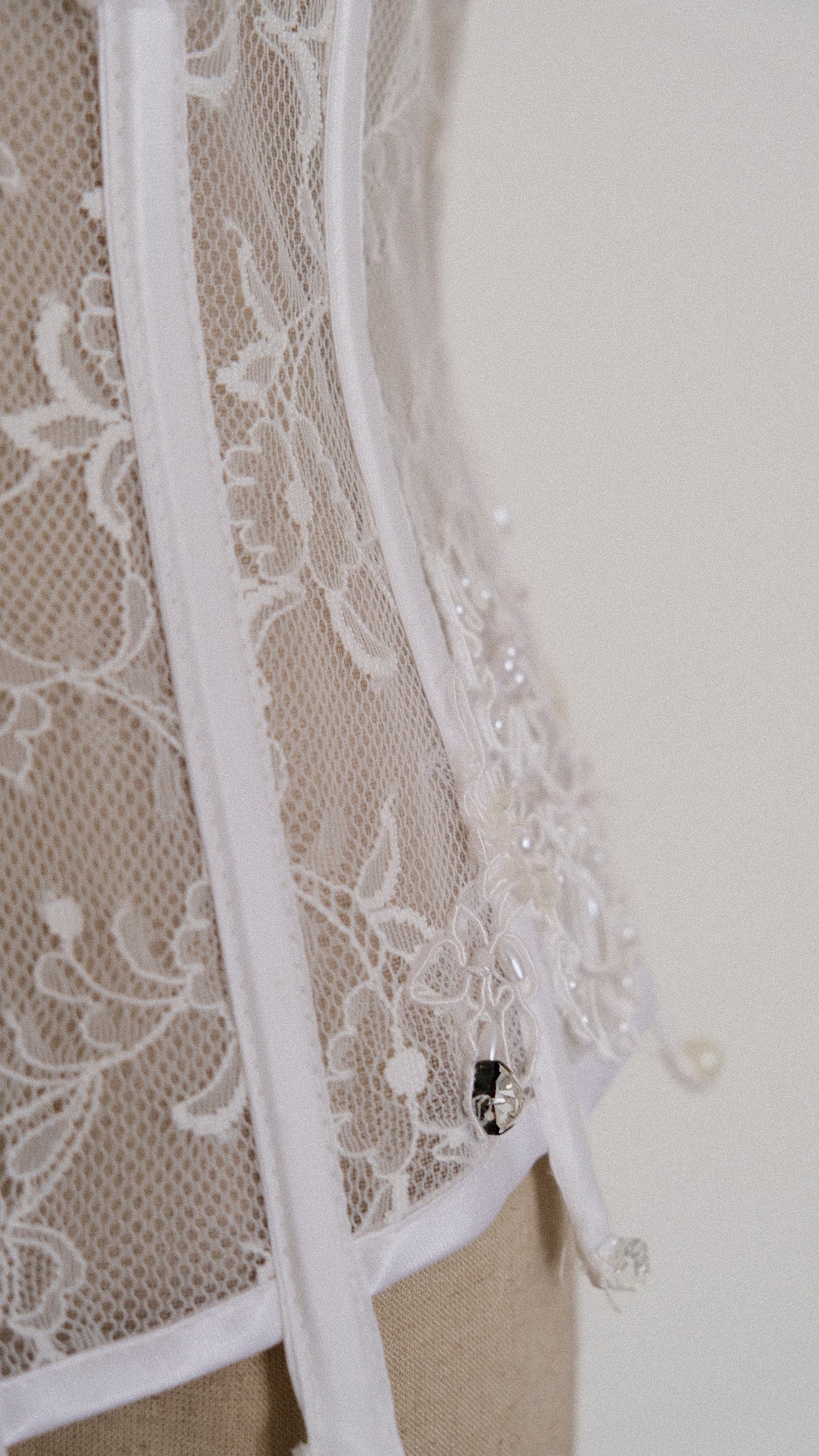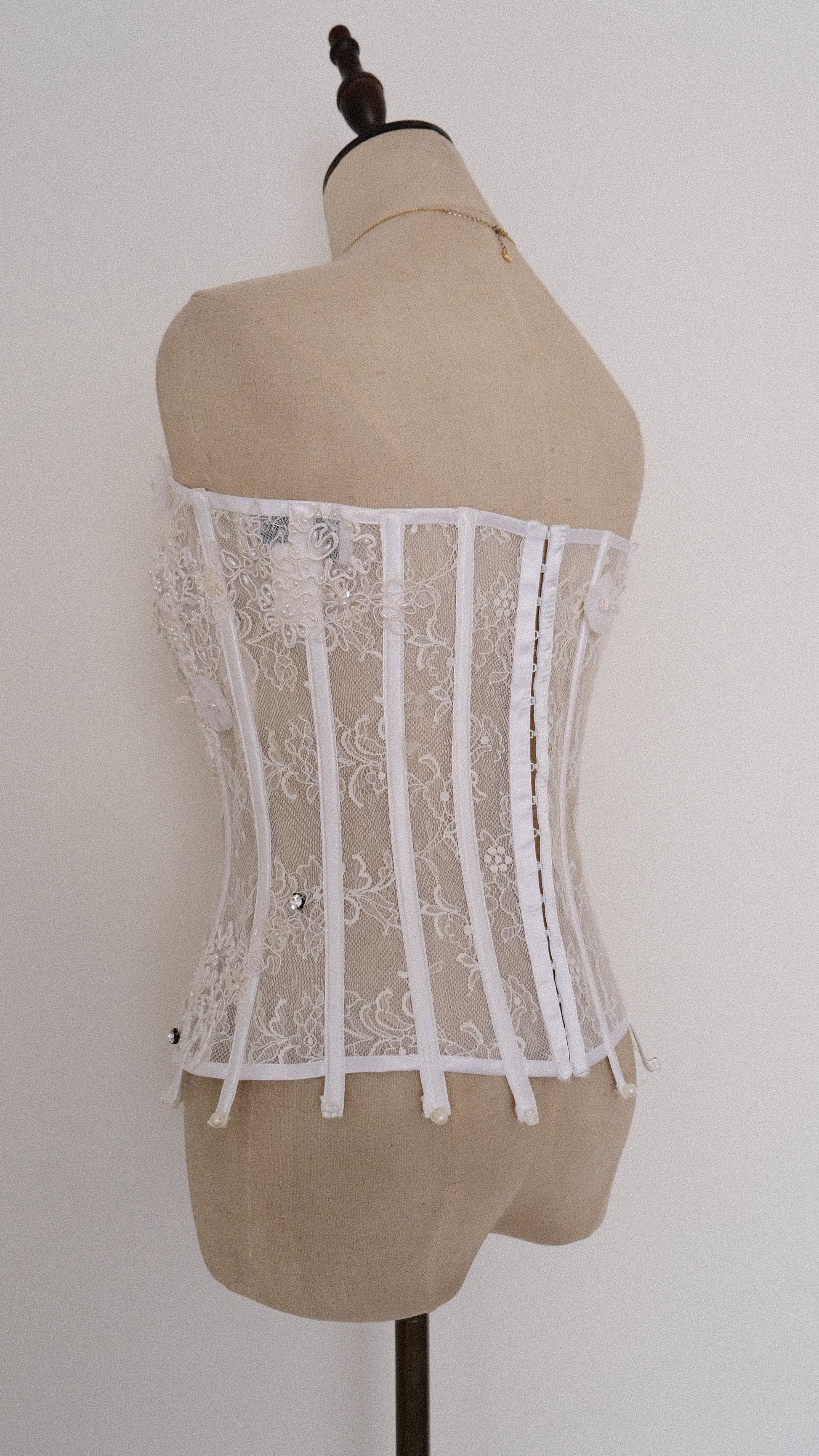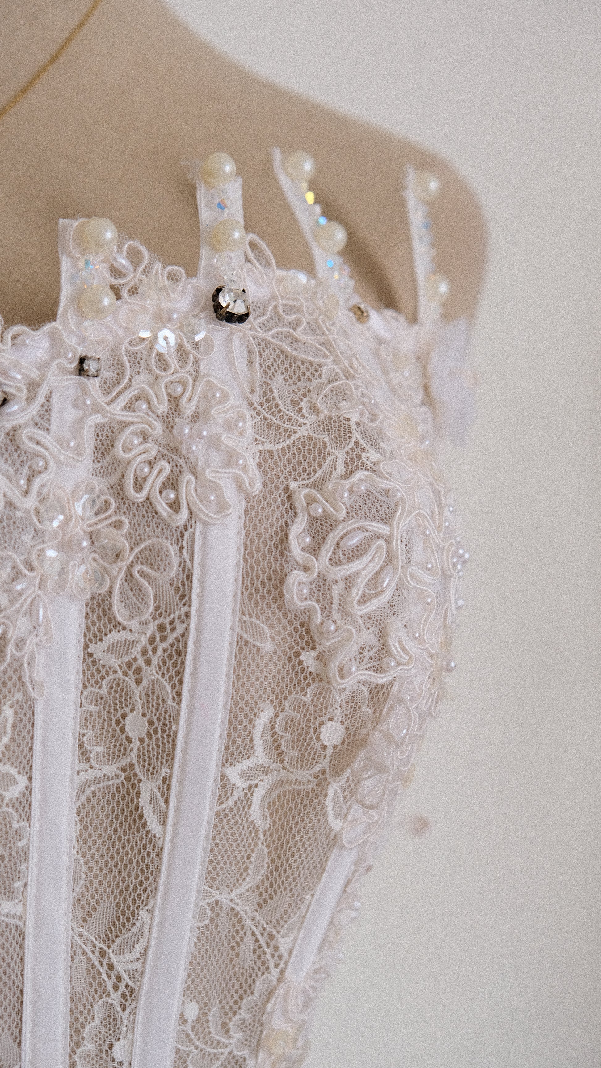 An one of one bridal bustier with lace, embroidery and faux pearl details.