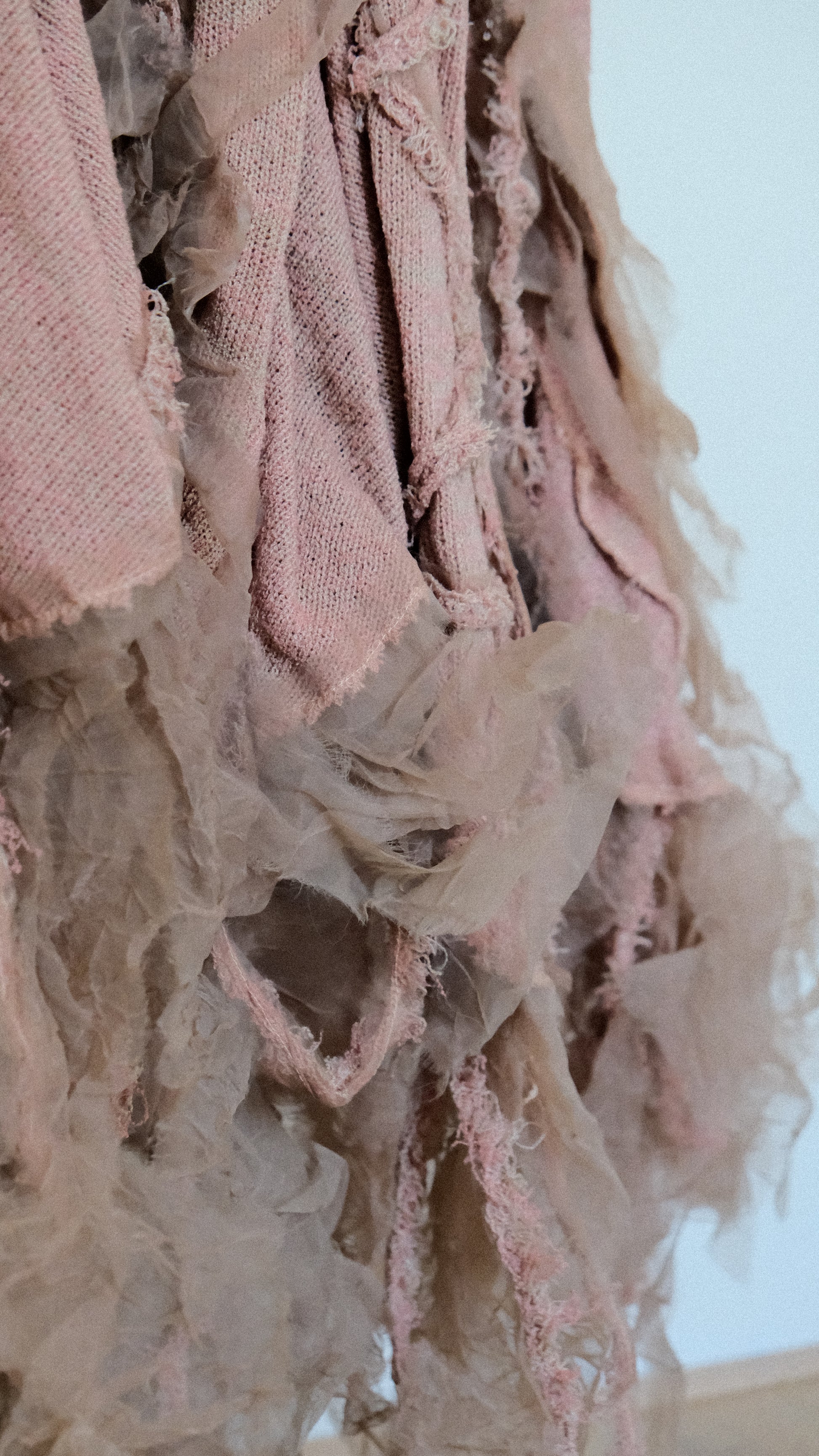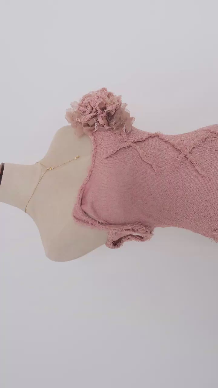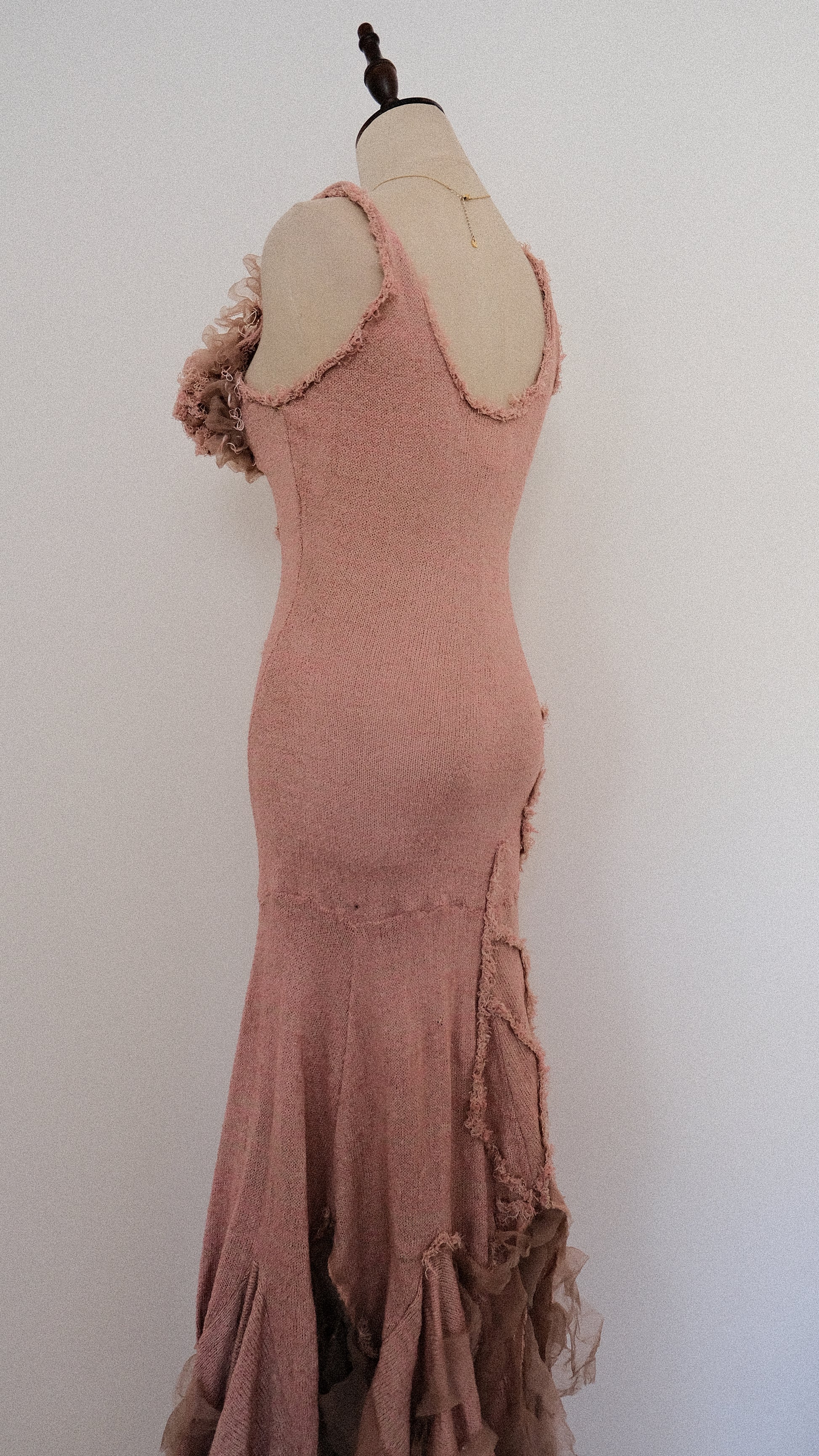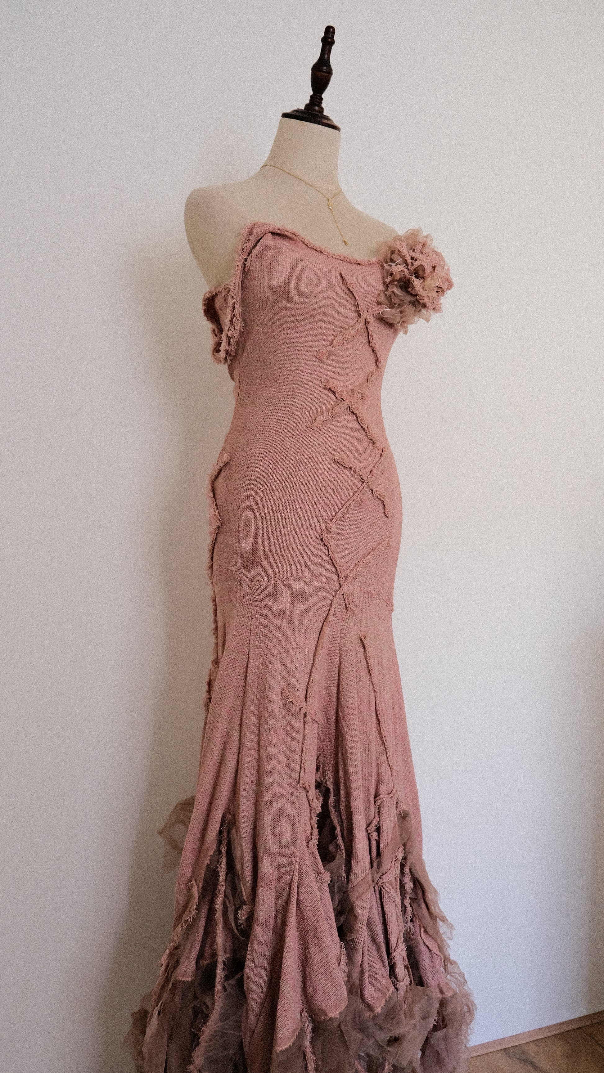 A stunning blush colored vintage puffy princes dreamy dress with mini split details and the cutest flower detailing at the top.