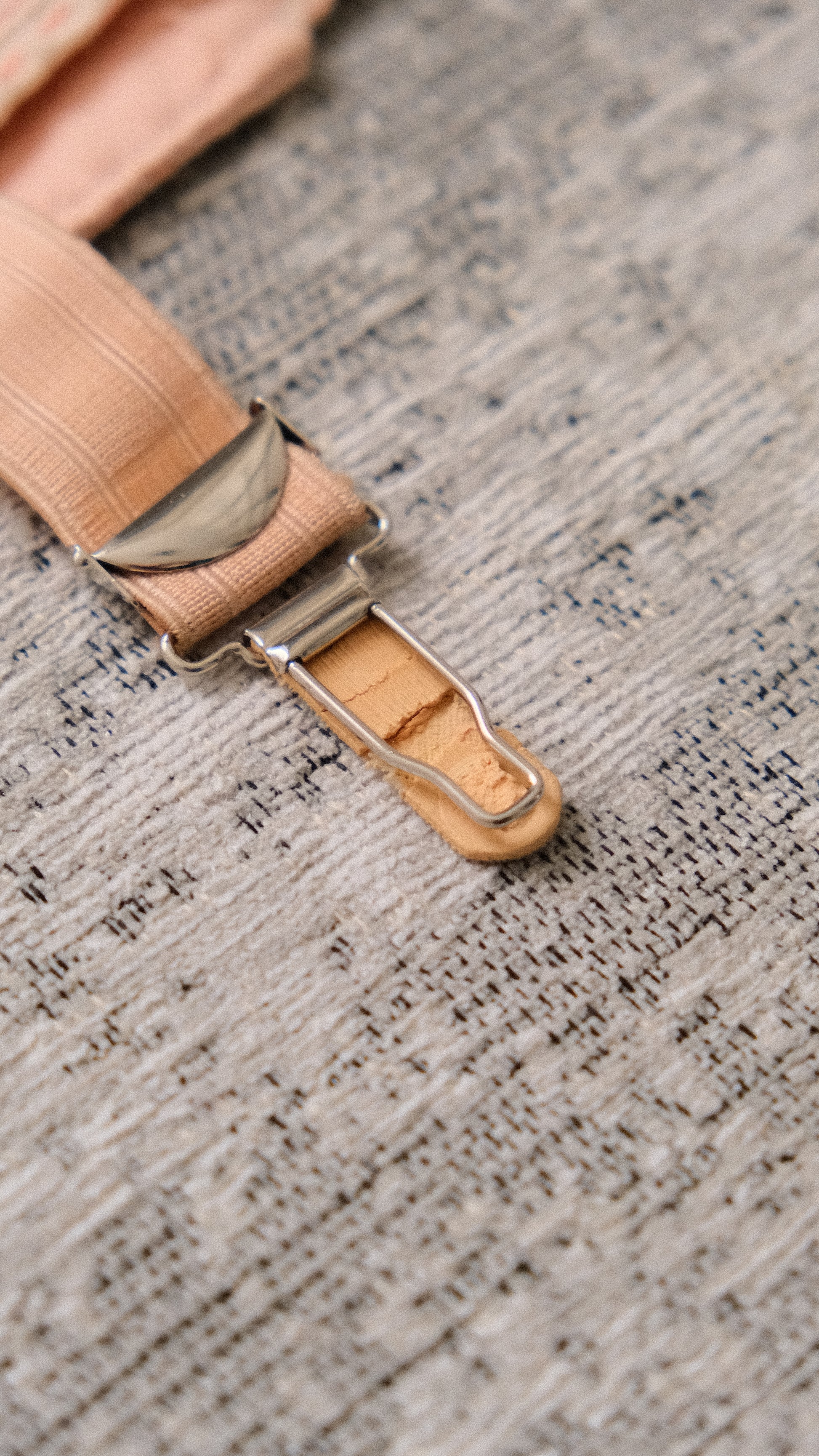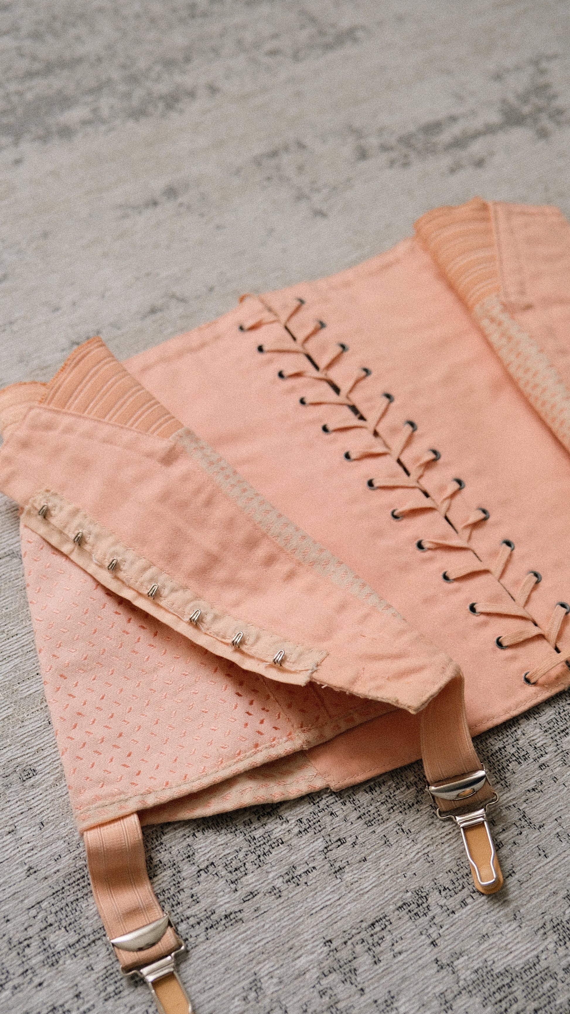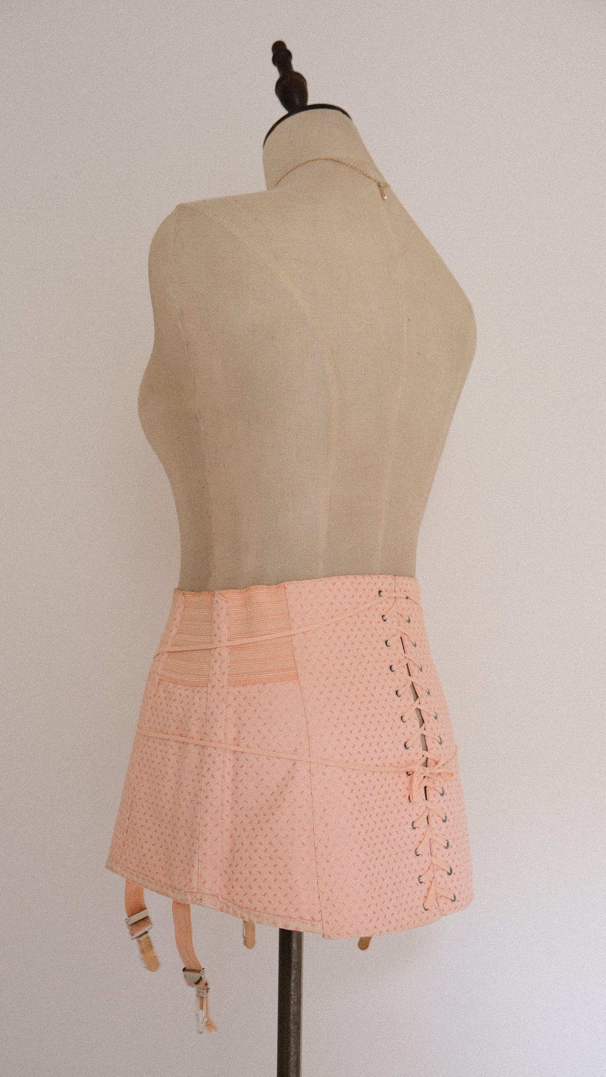 An antique blush girdle skirt with lacing and a hook closure.