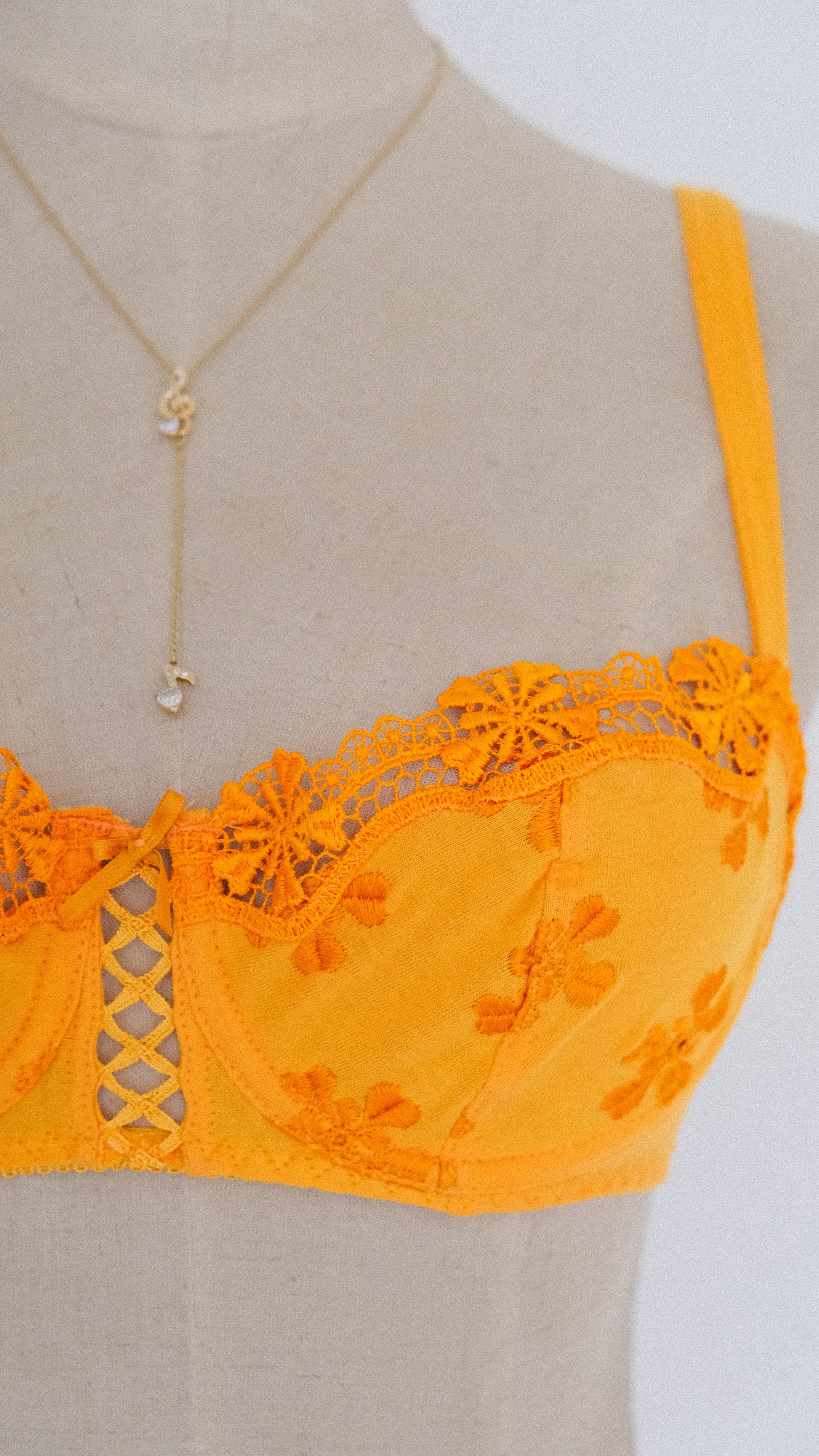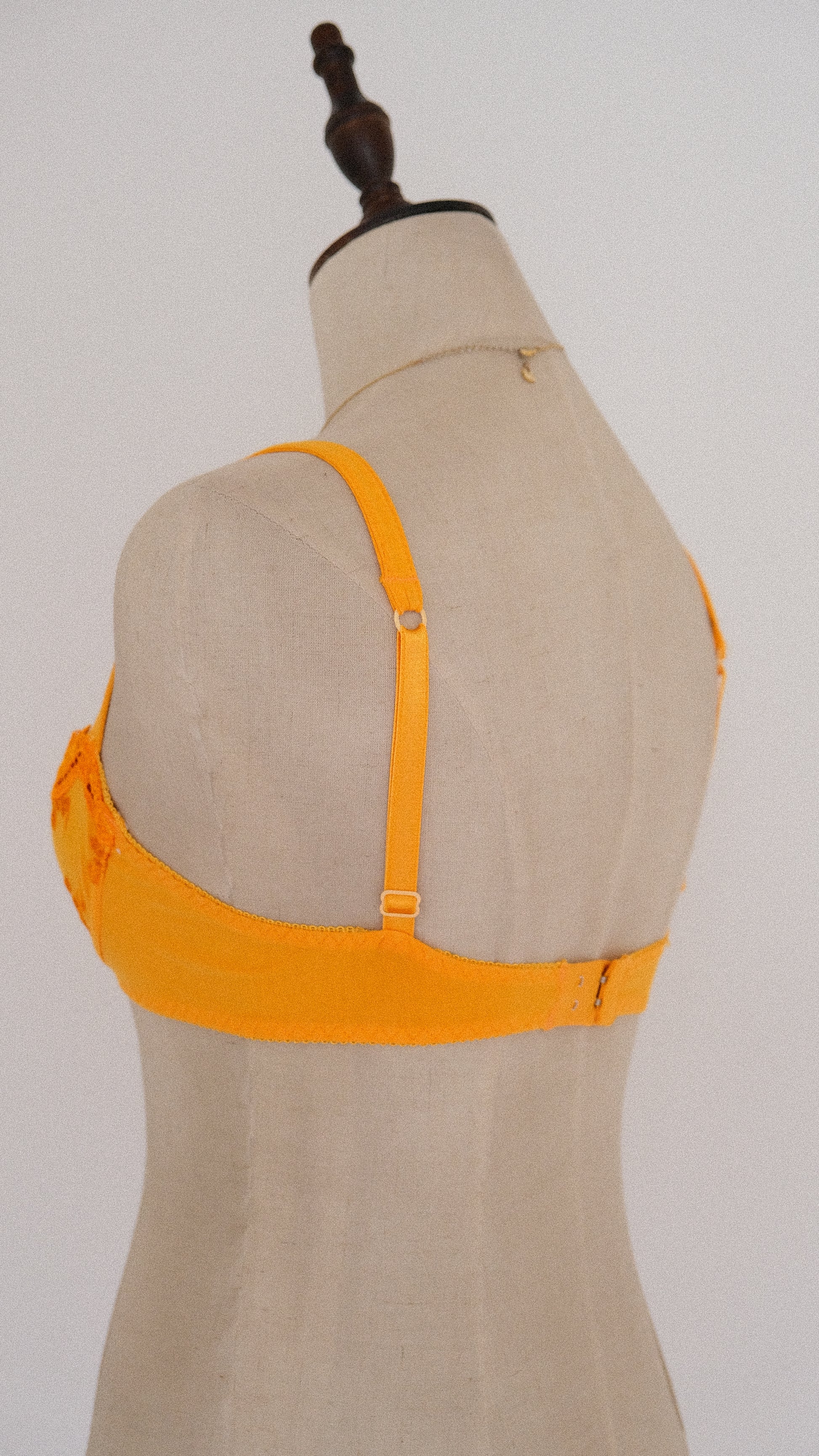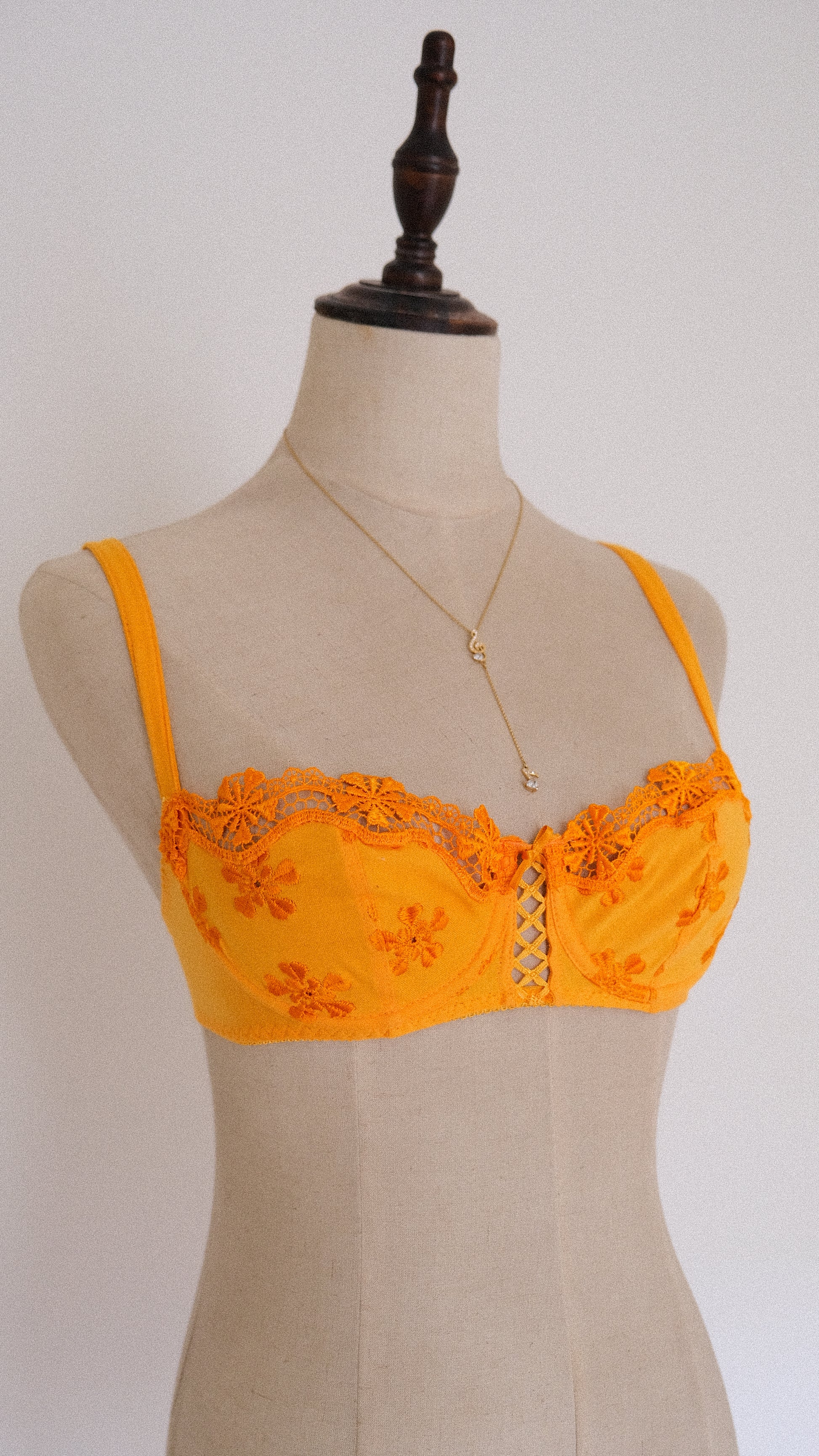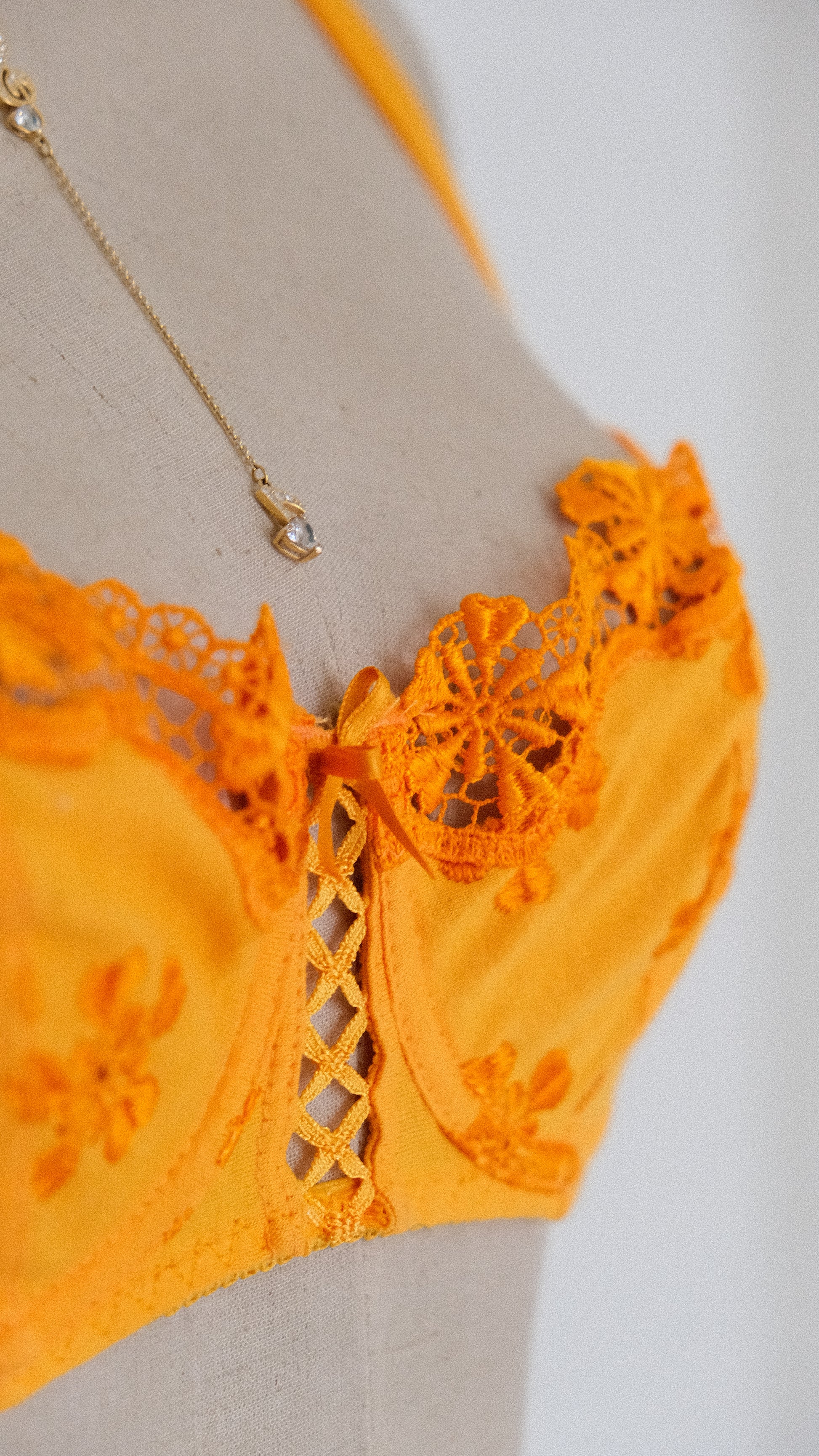 A coquette style vintage bra in a bright citrus orange color and embroidery detailing.