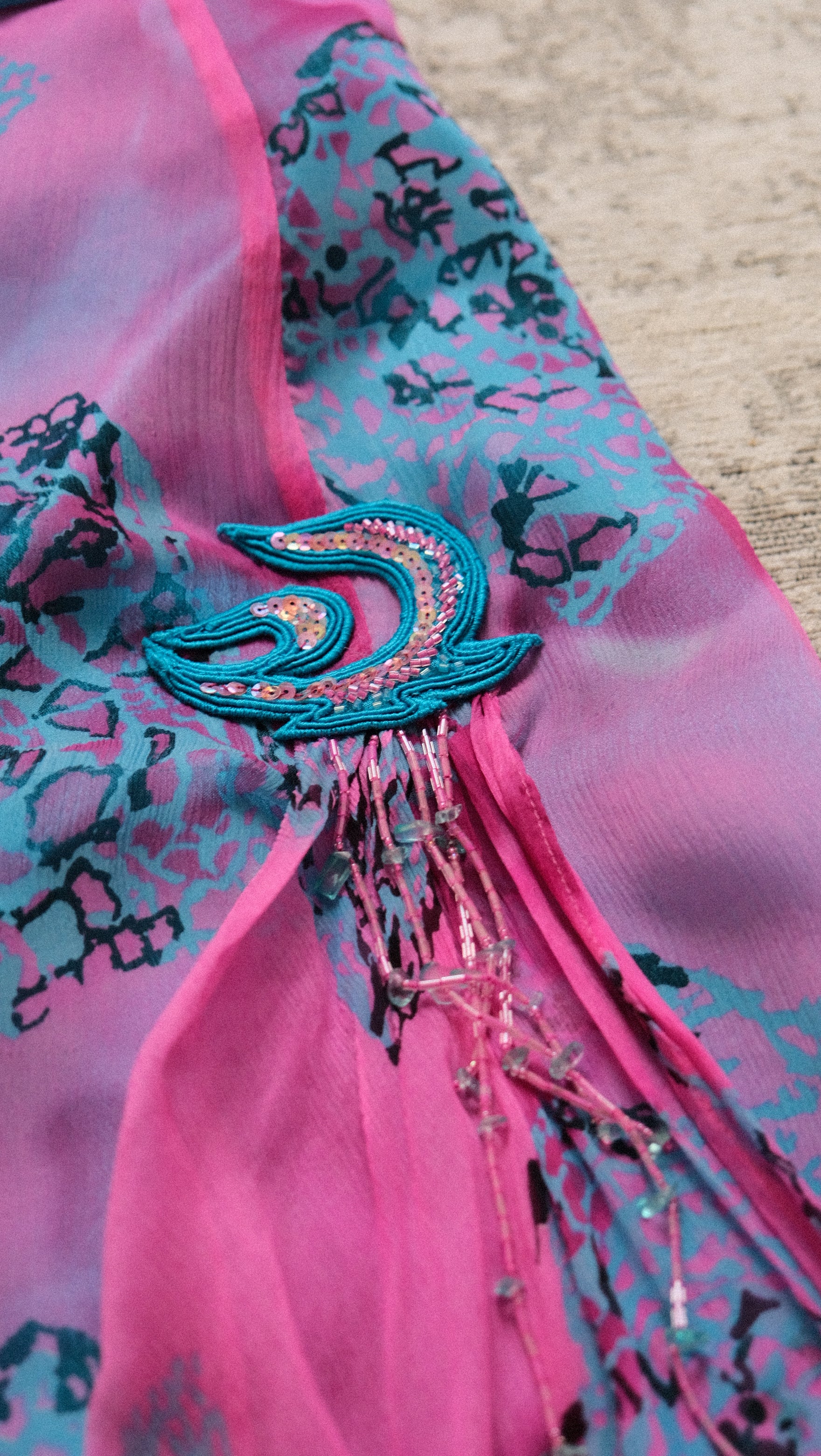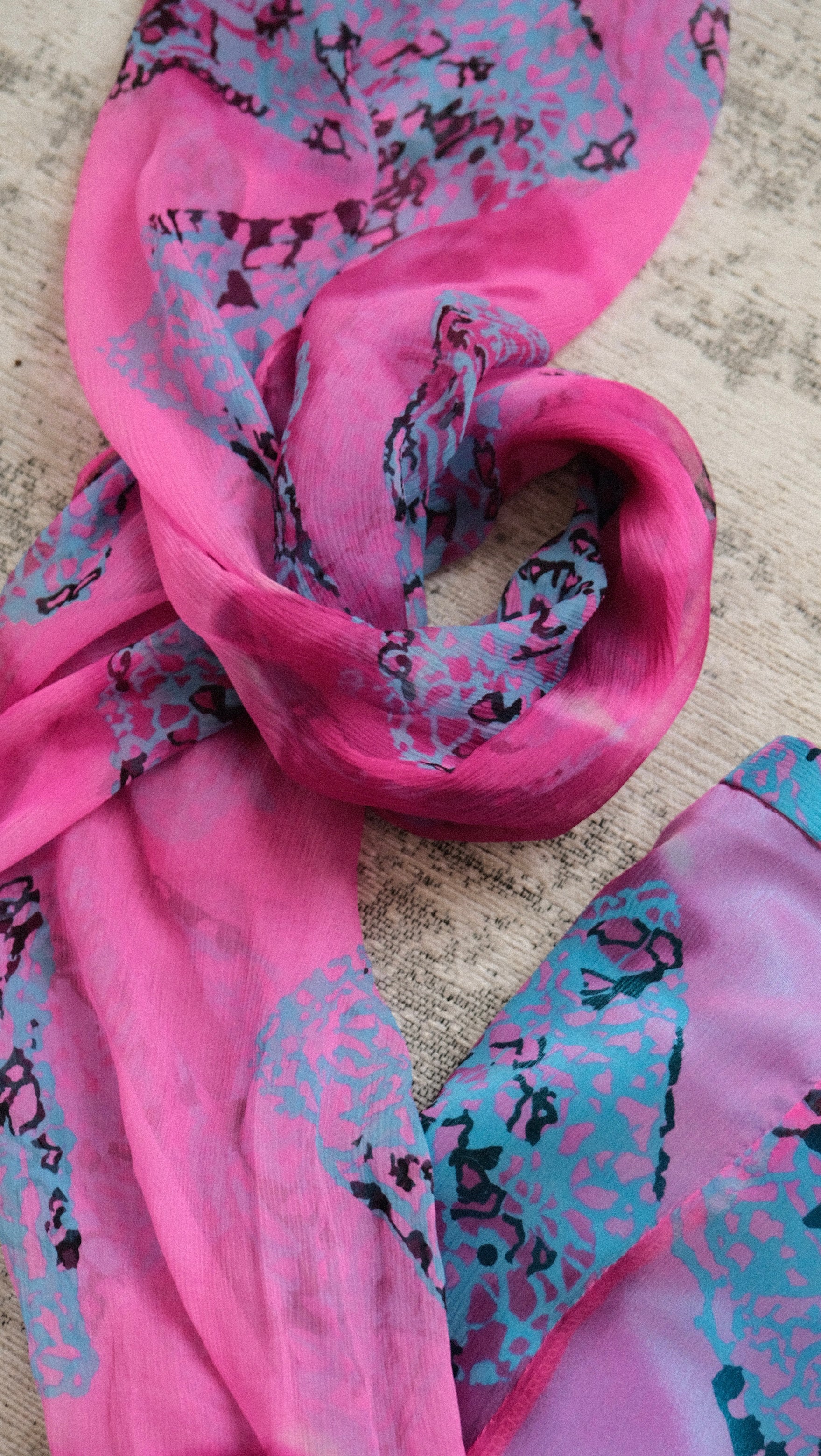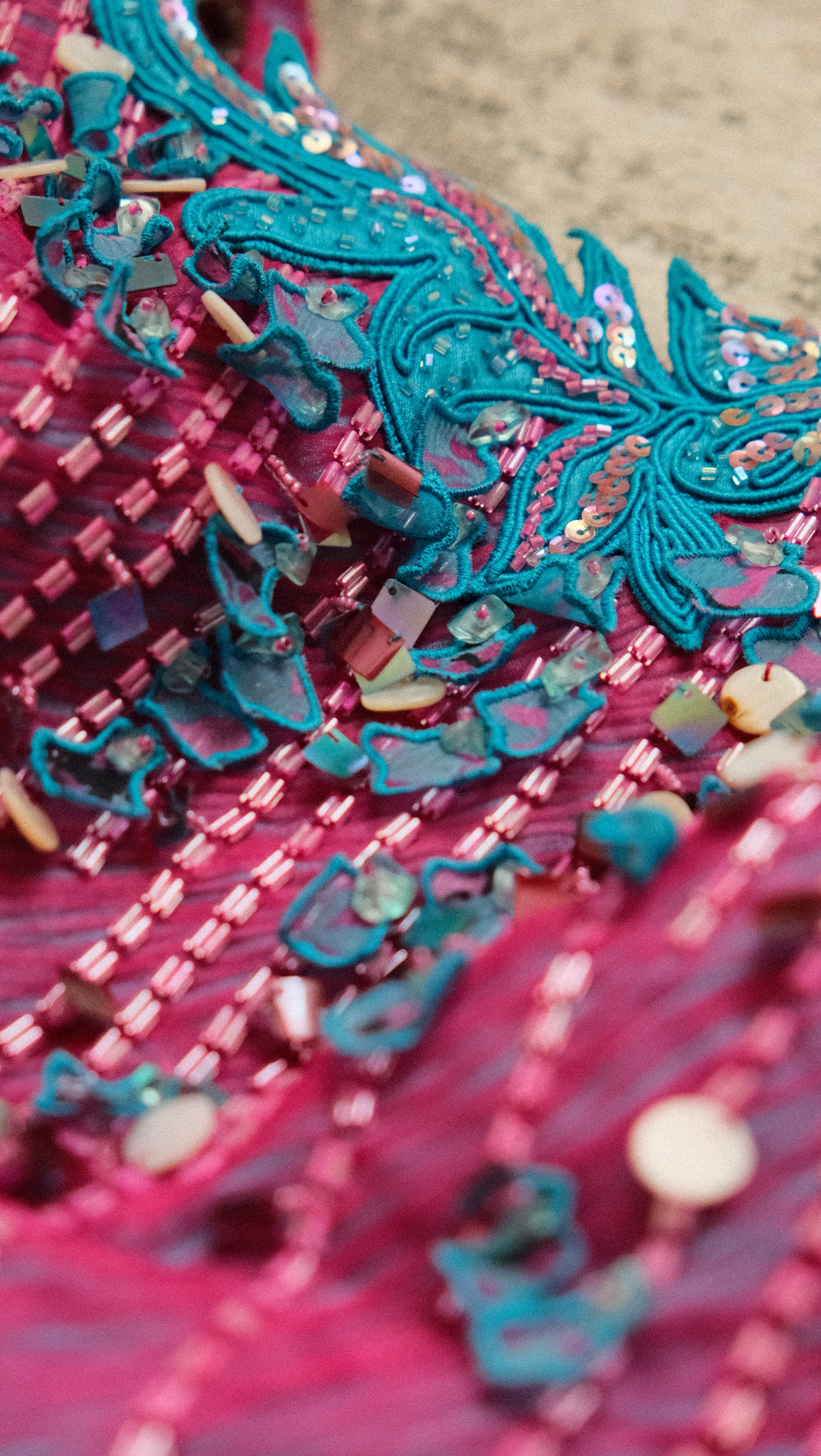 A dazzling, radiant and sweet magenta colored 3 piece set with a touch of magical blue colors and embroidery.