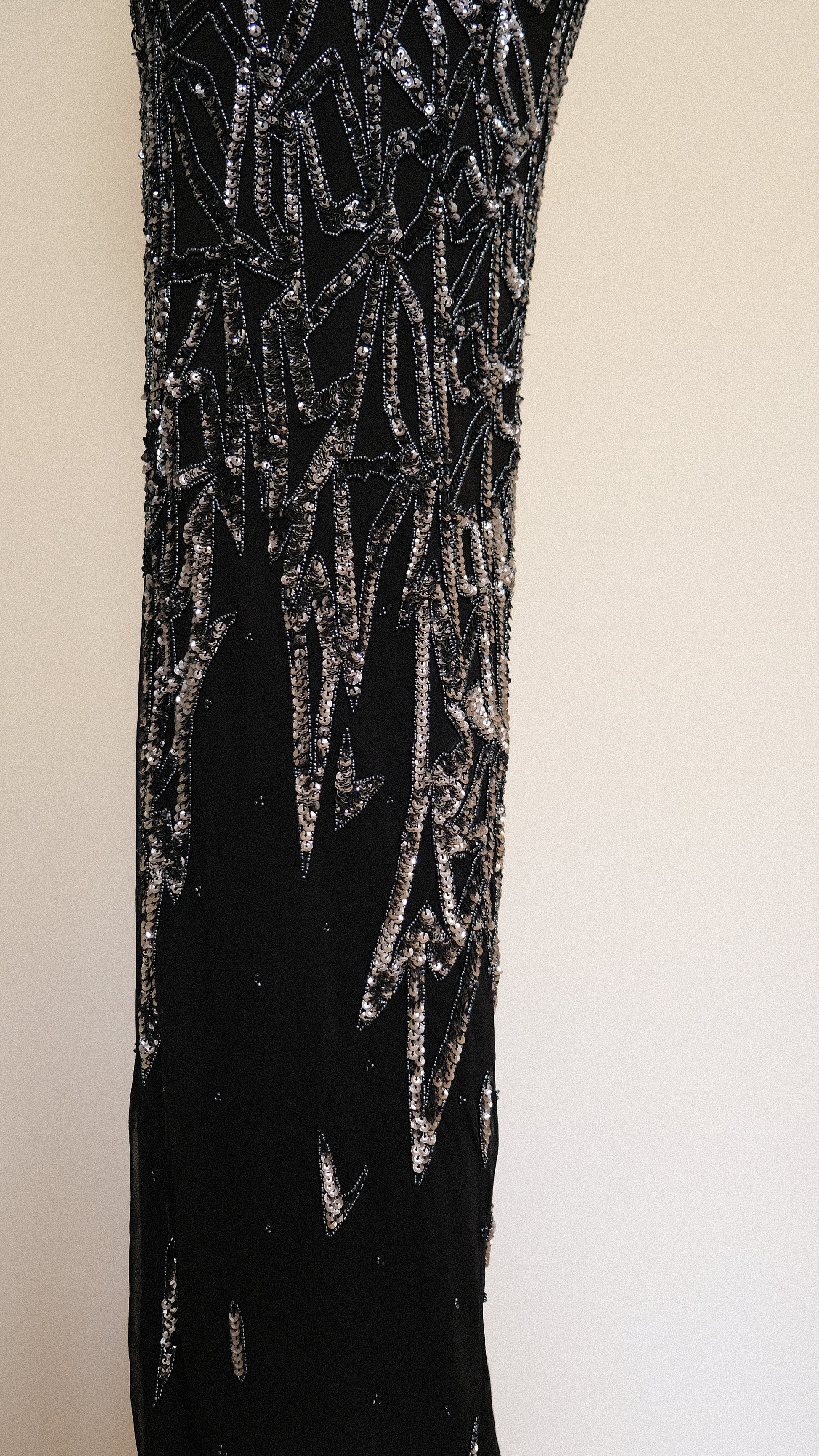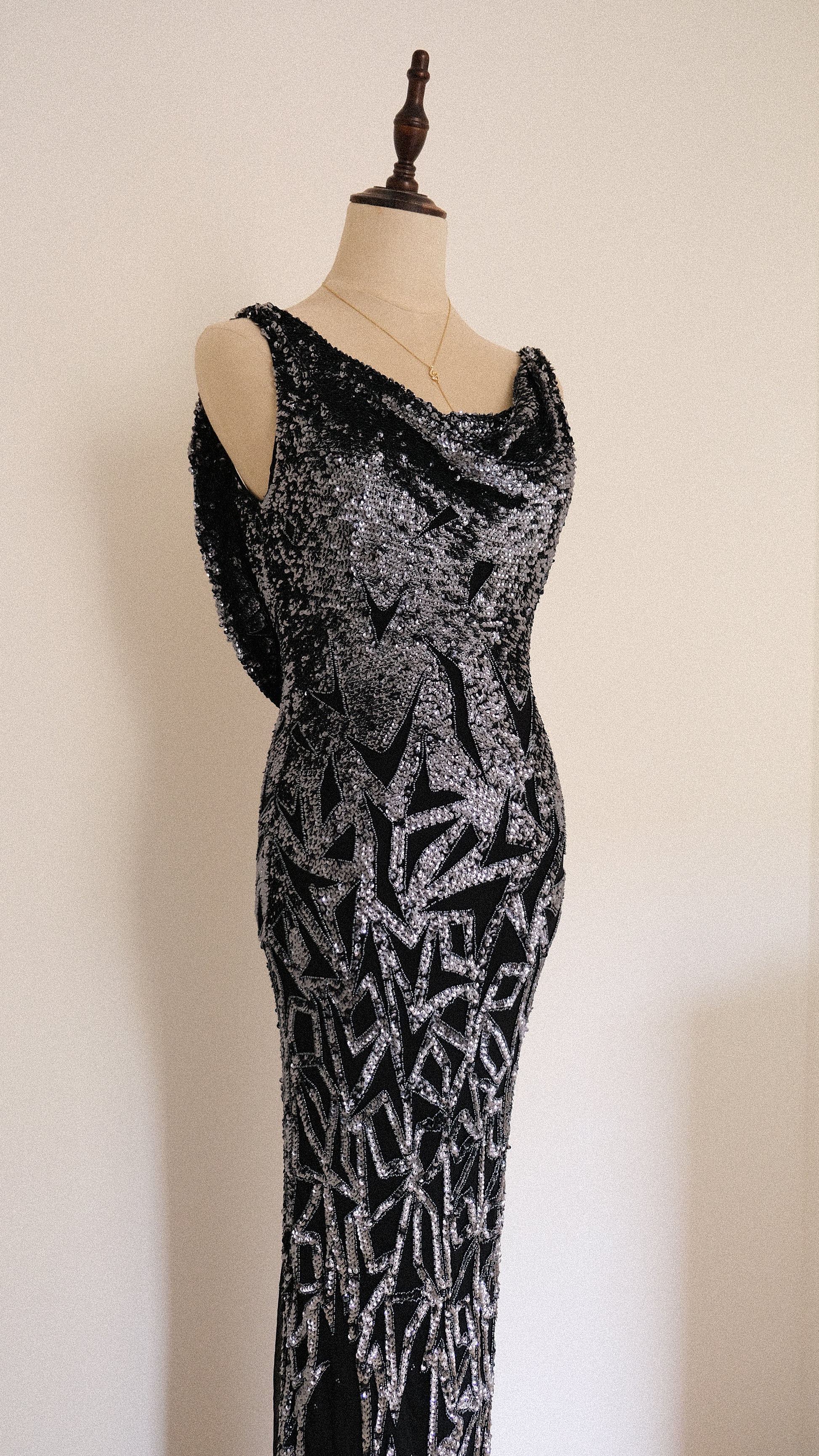 A 100% silk dress dripping in celestial shimmer. She has a draped back detail for an even more magical look.