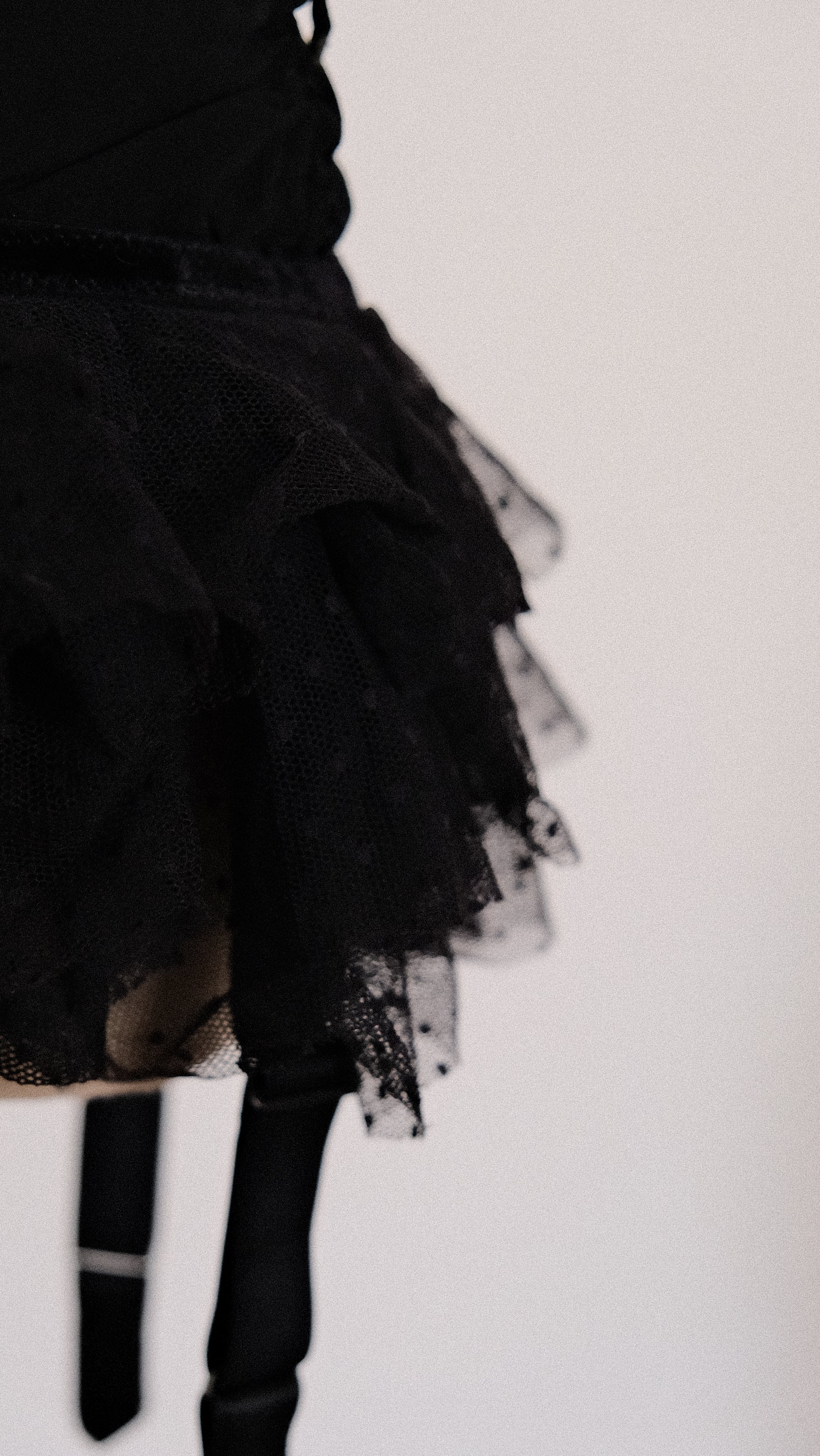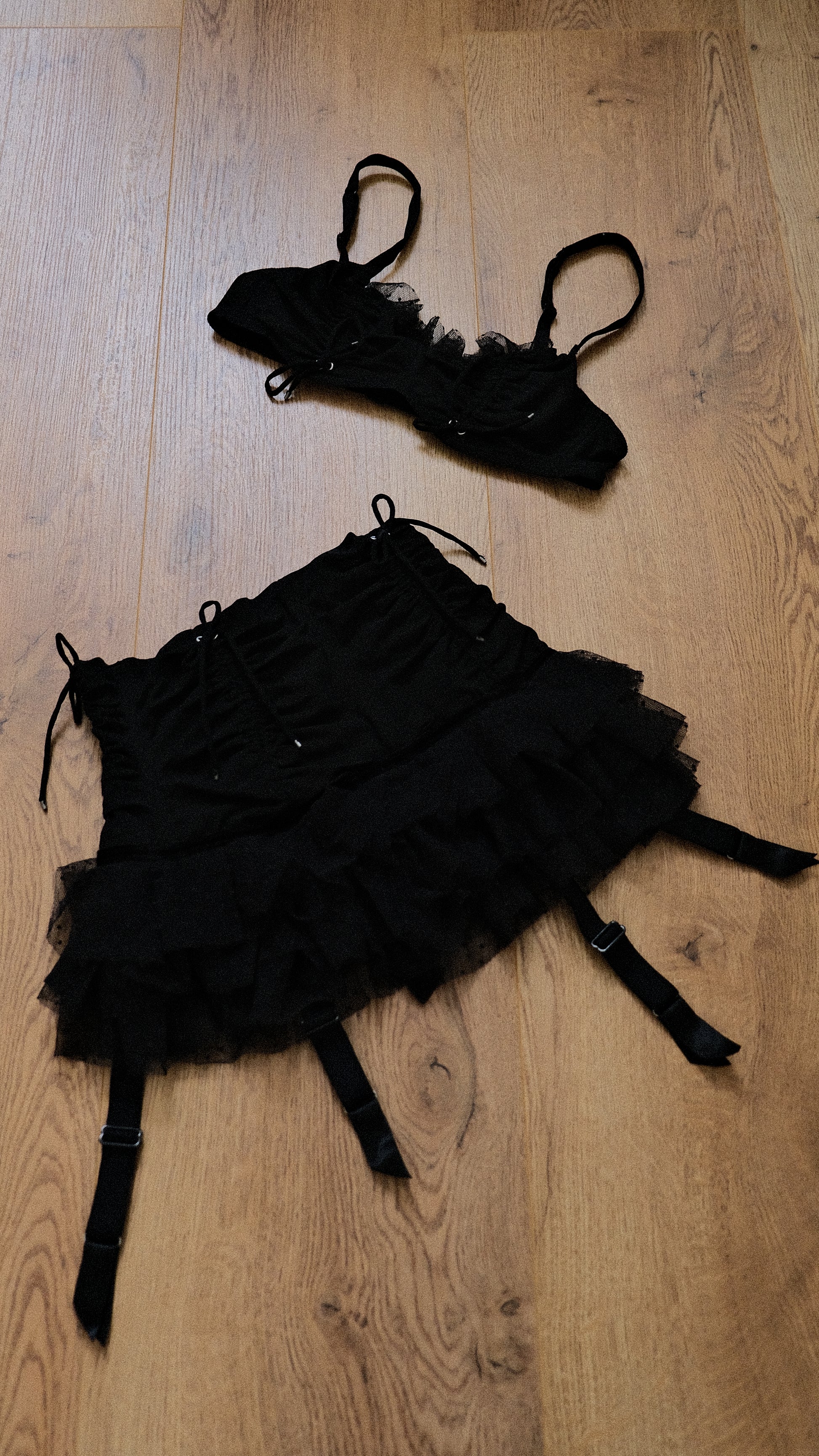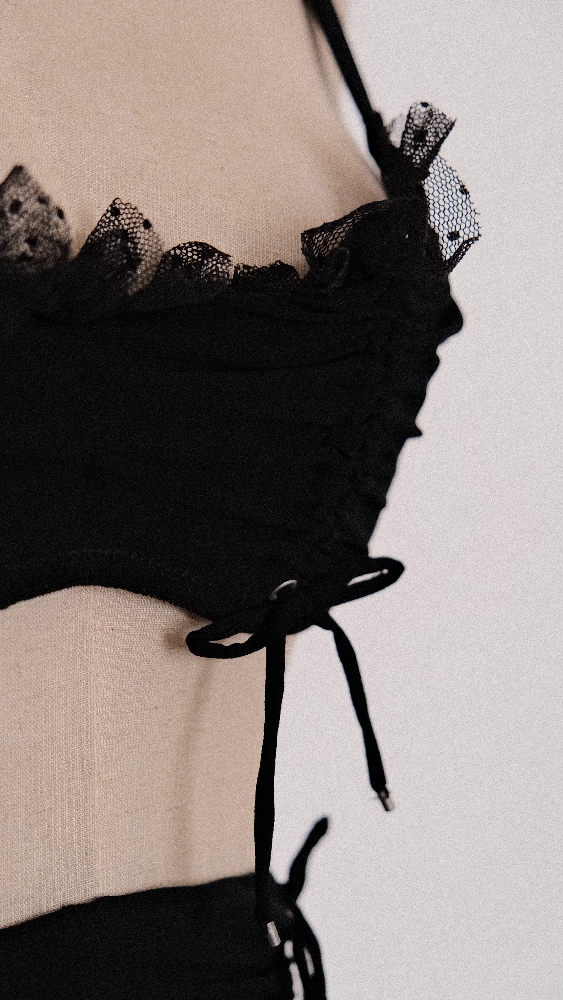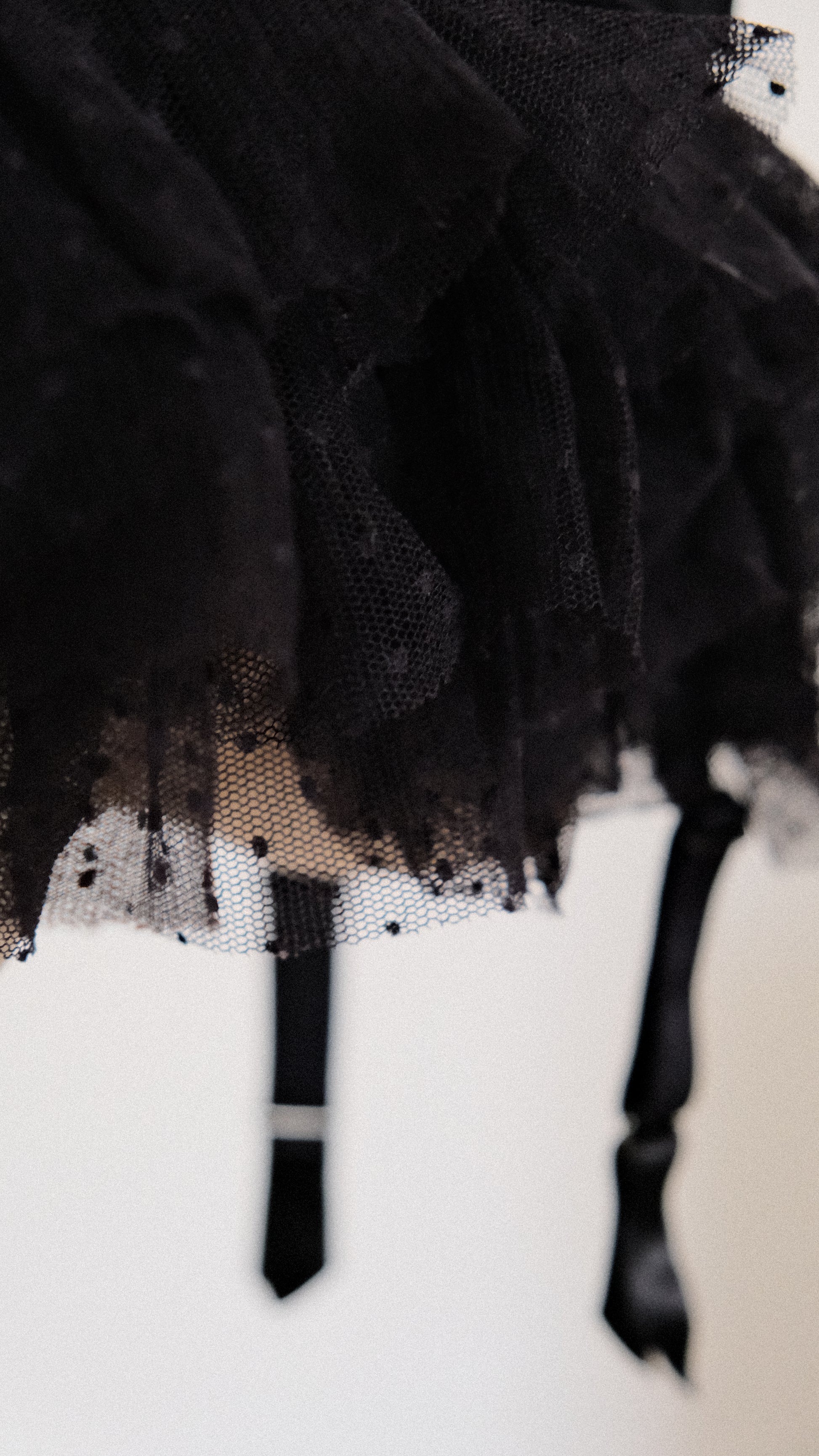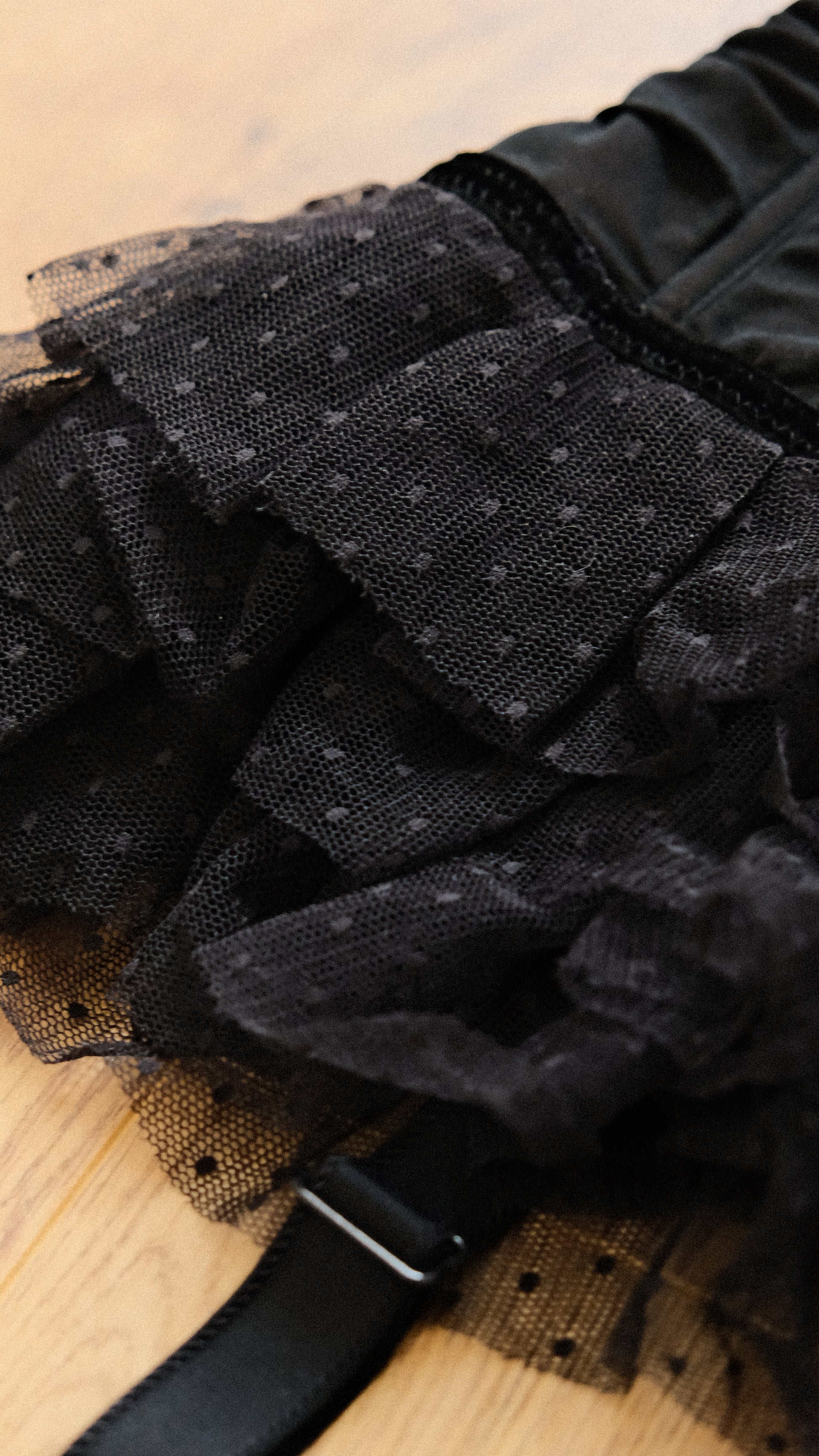 Chantal Thomass lingerie 2 piece set with sheer polka dot ruffled edges; bra and garter.