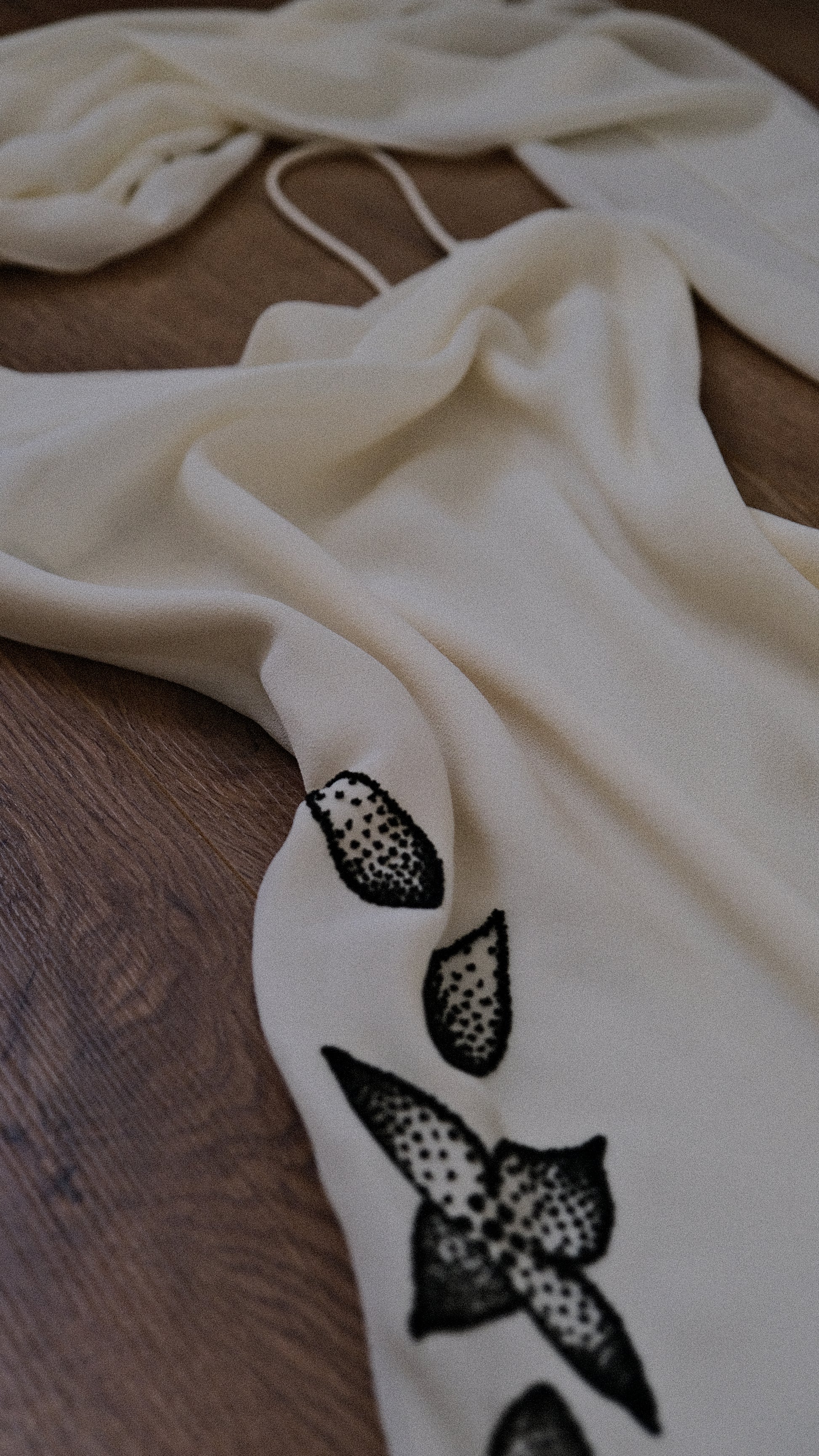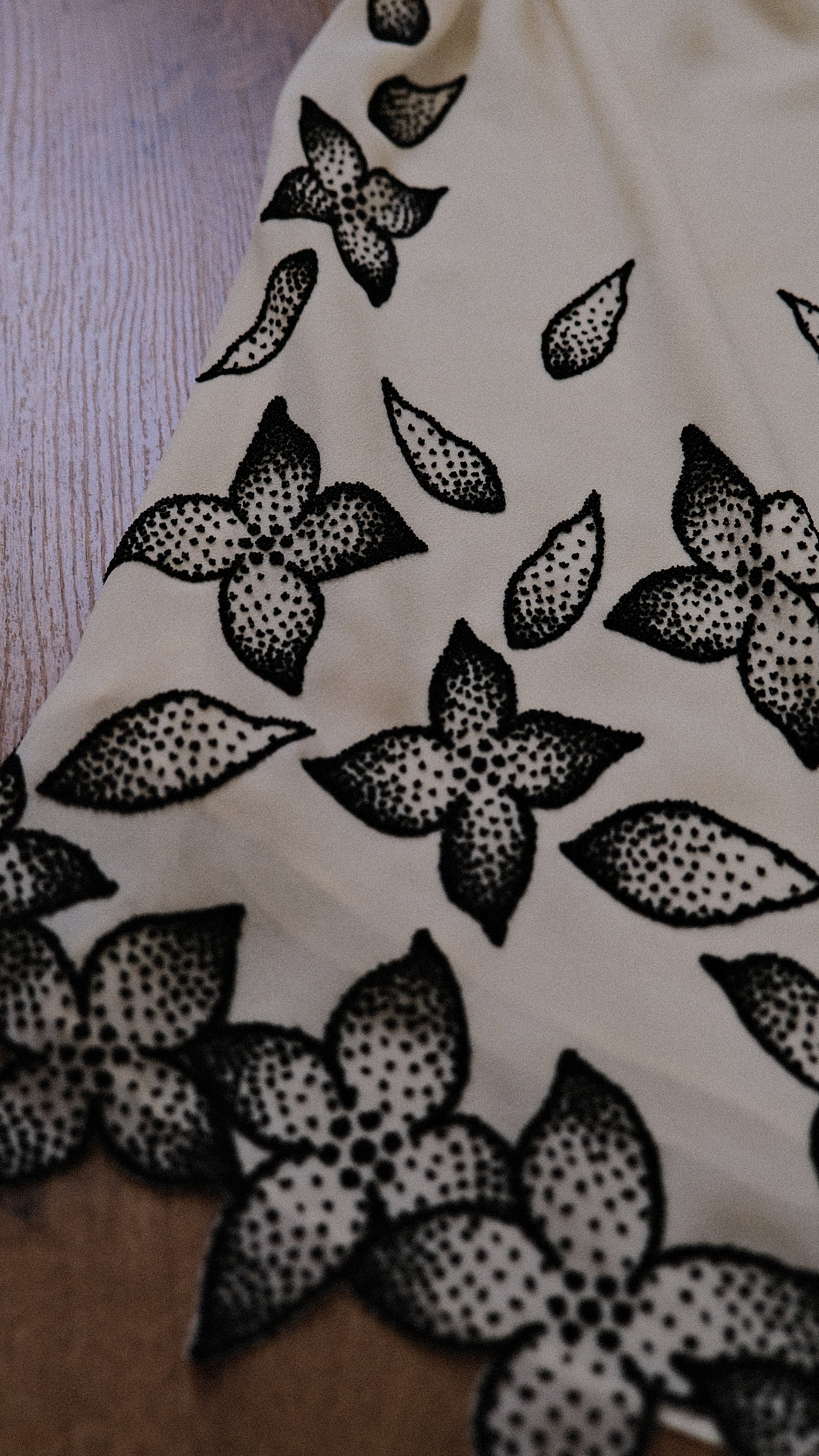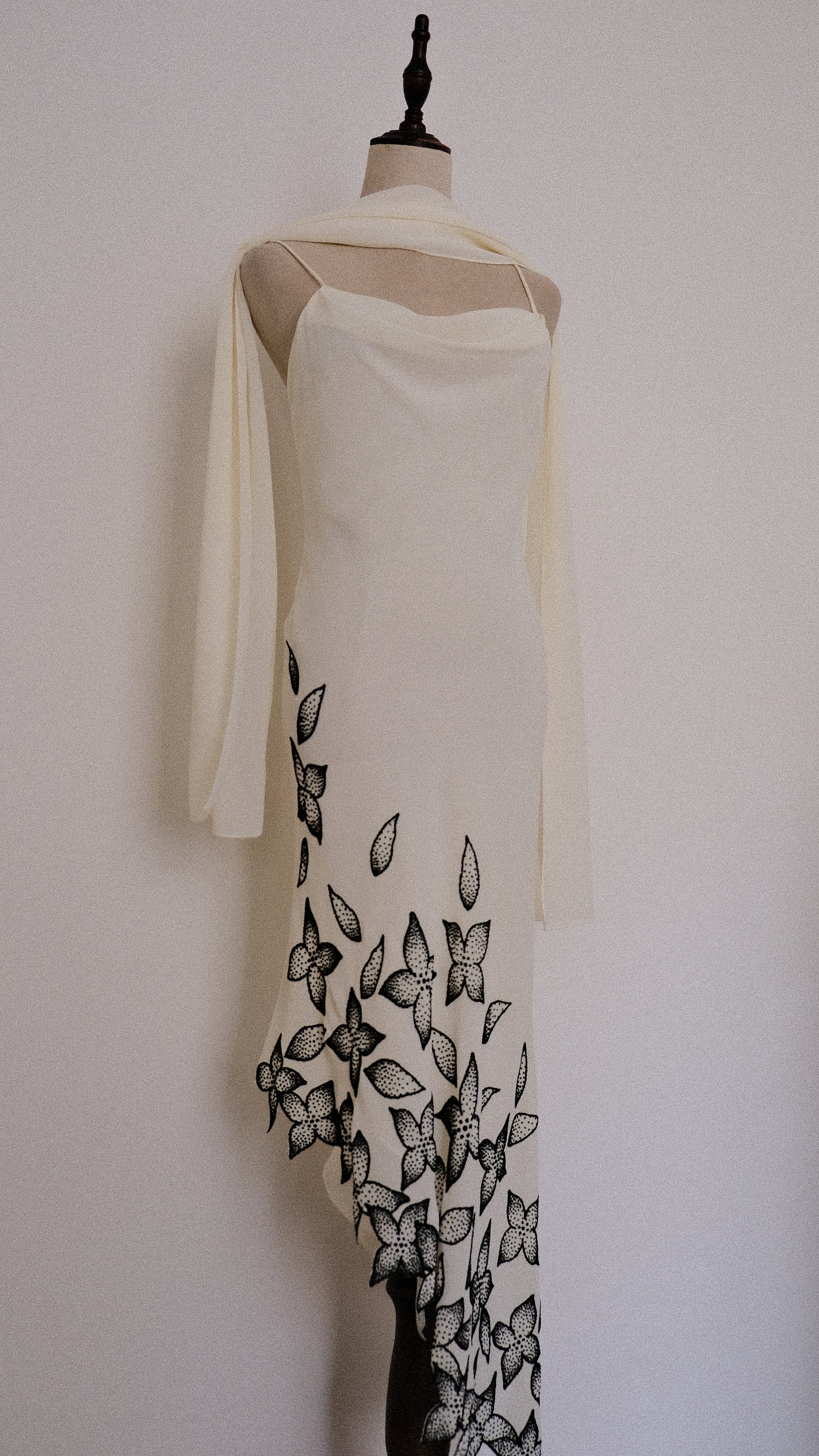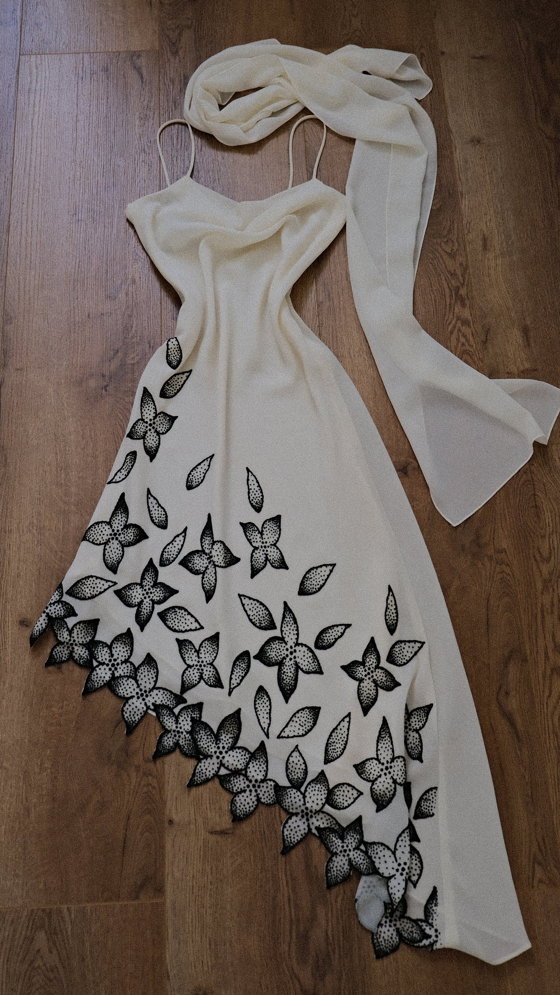 A dress with fragile florals blooming under moonlight.