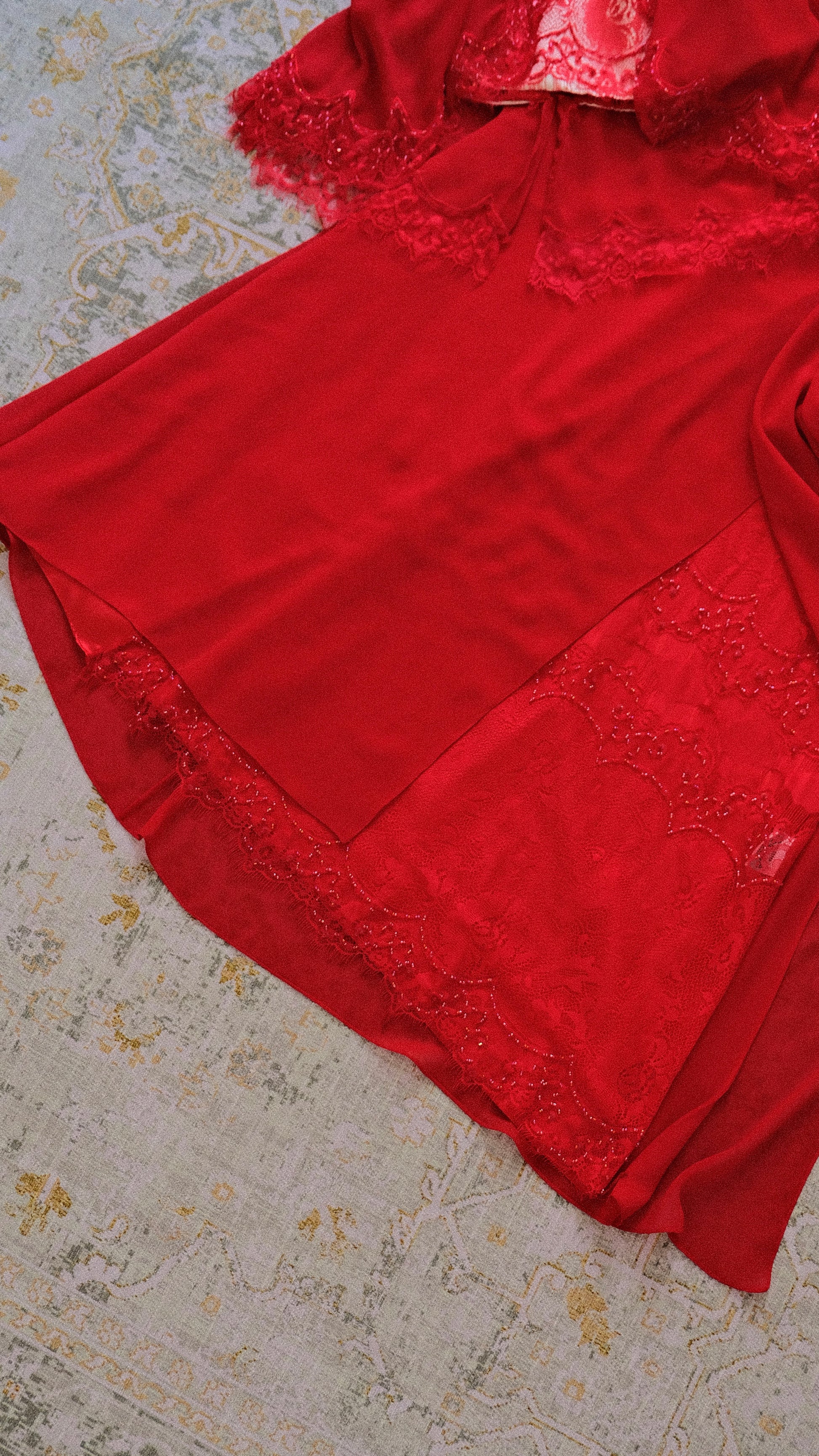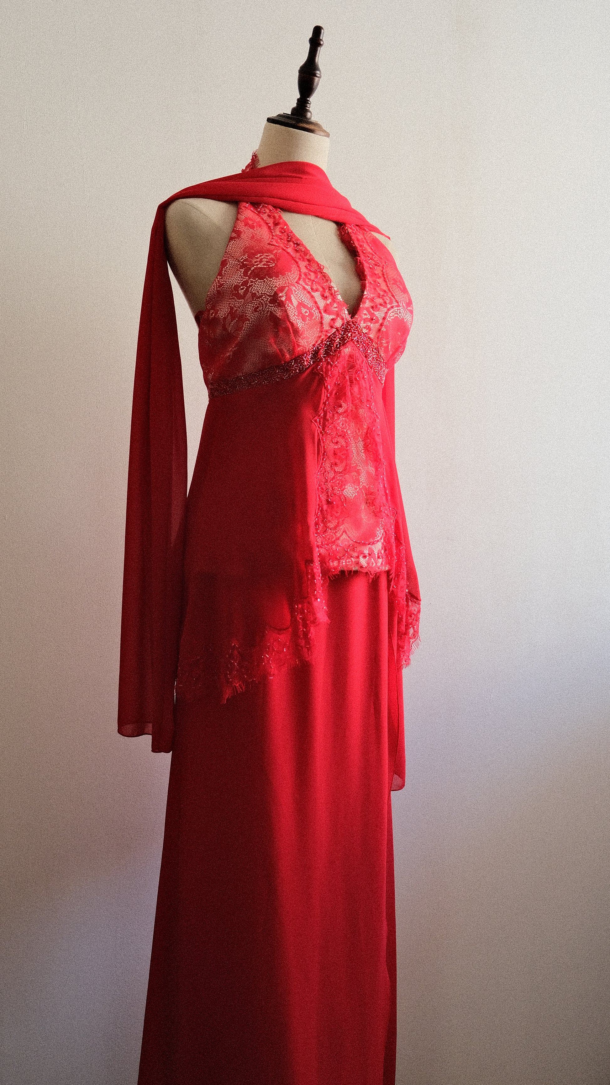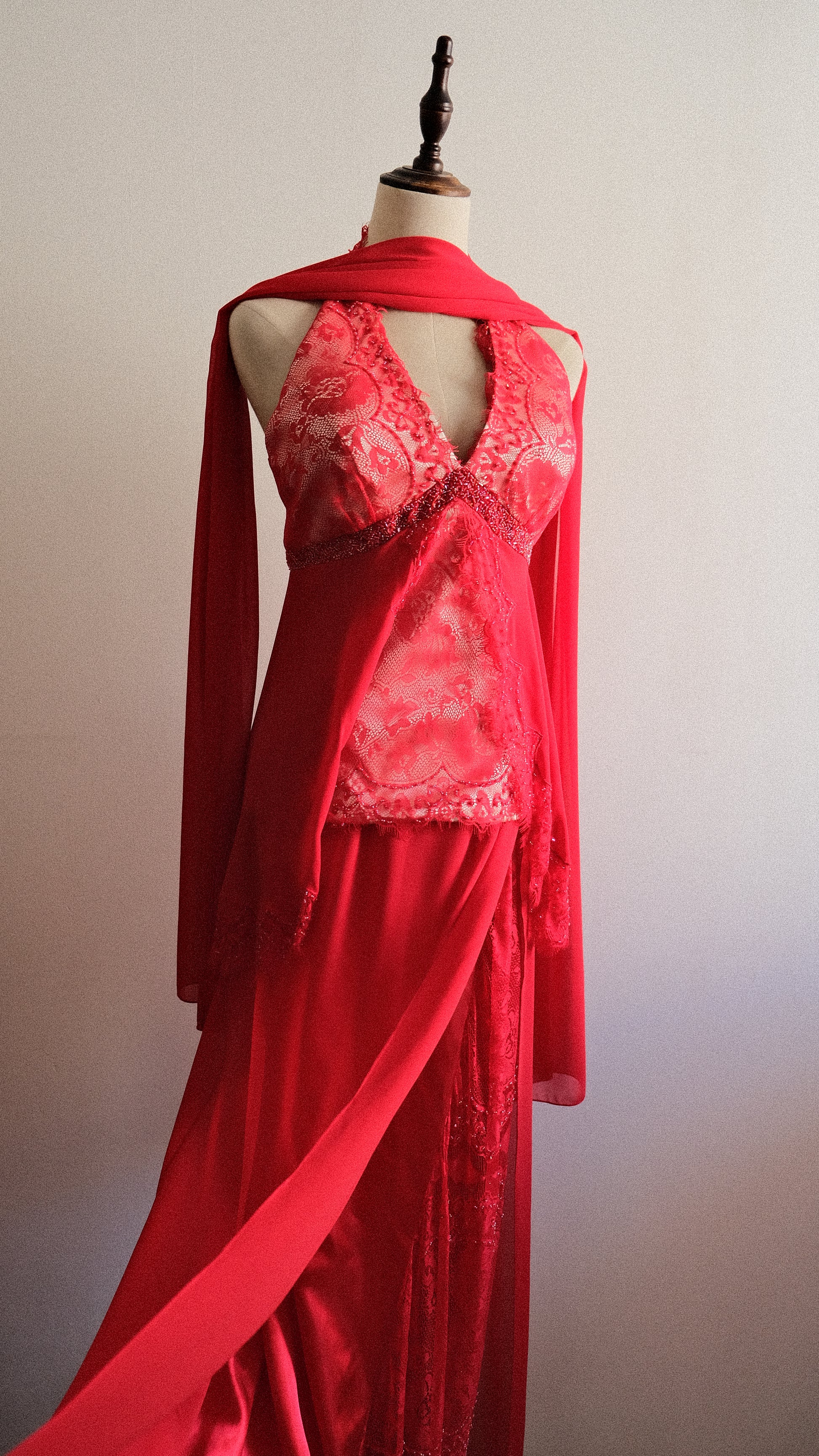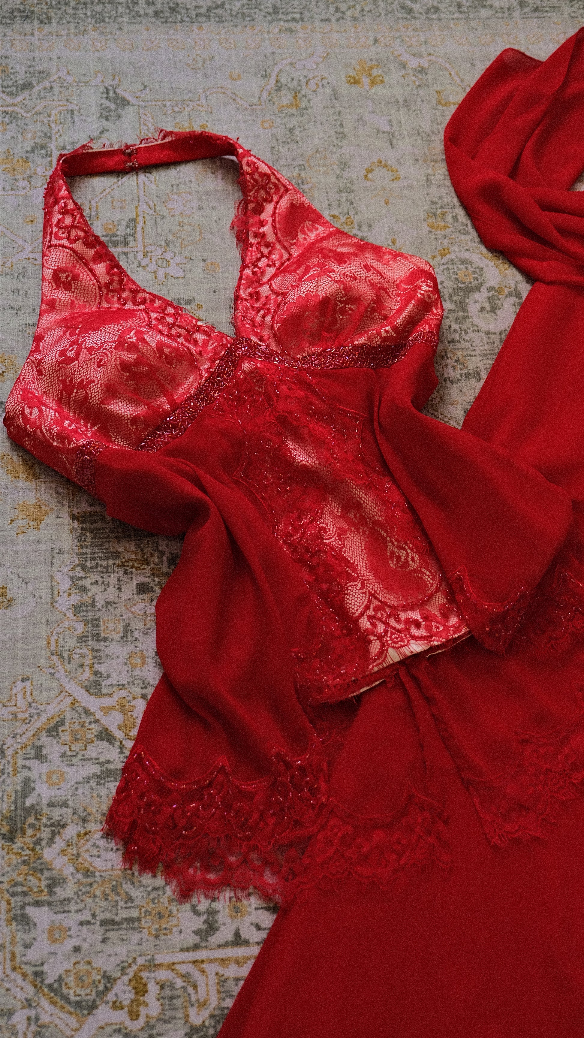 A vintage 3 piece set in a vibrant red color combined with embellished and lace detailing. On pics will be coming soon.
