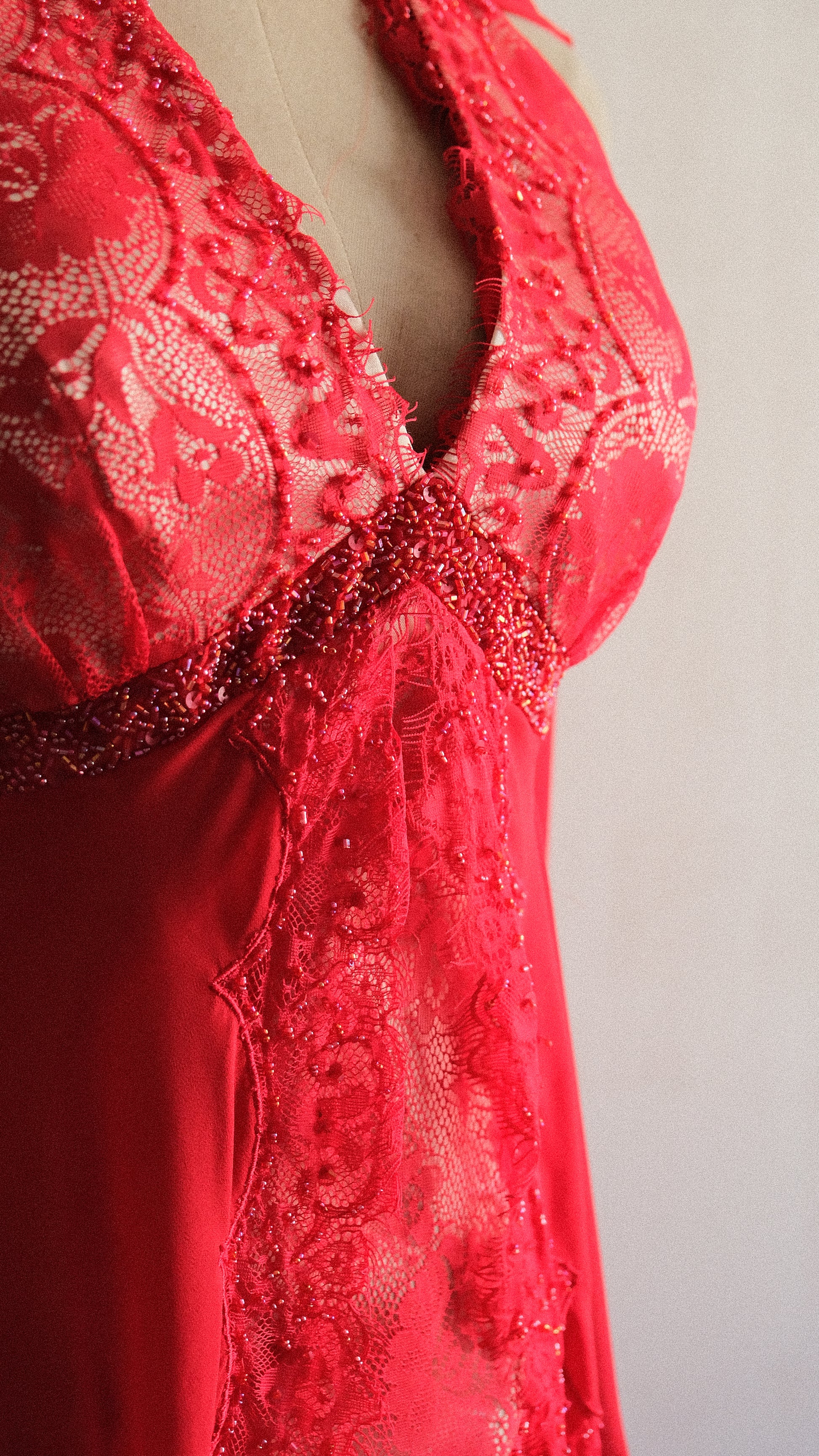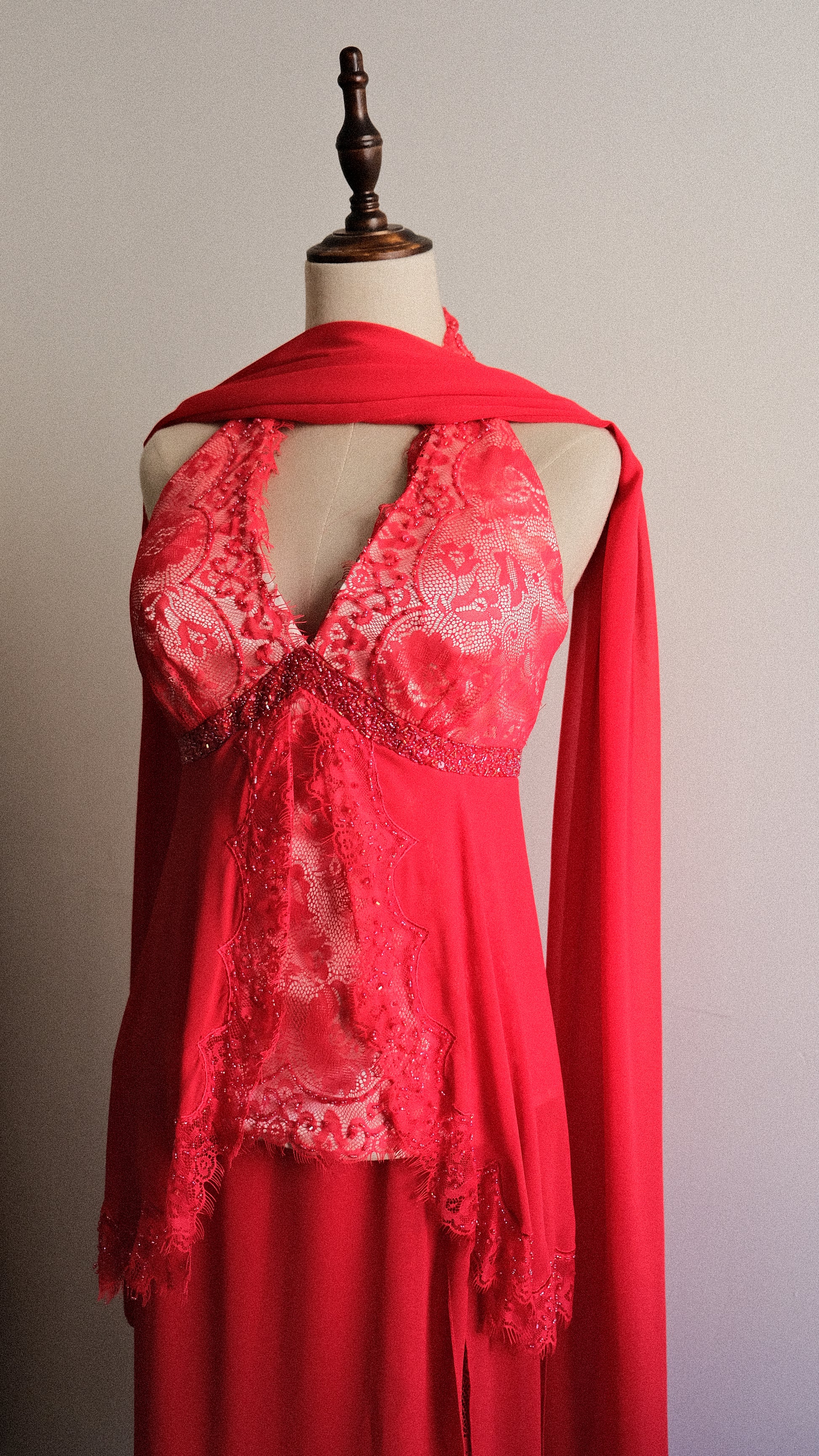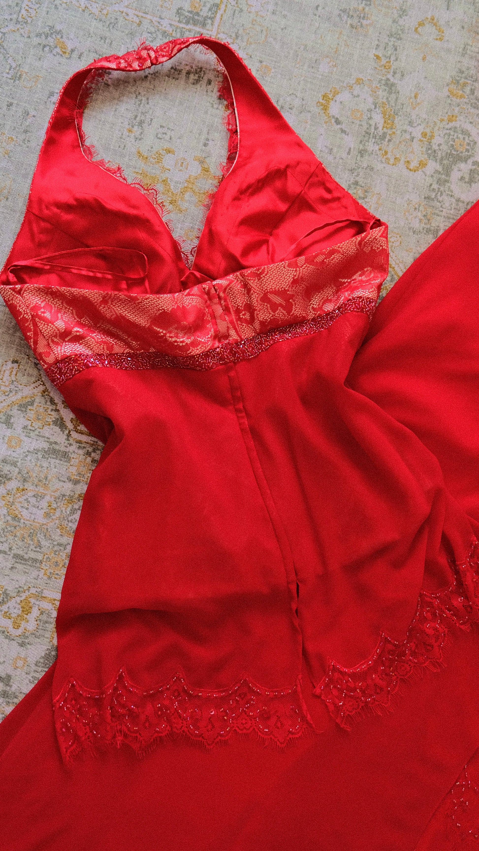 A vintage 3 piece set in a vibrant red color combined with embellished and lace detailing. On pics will be coming soon.