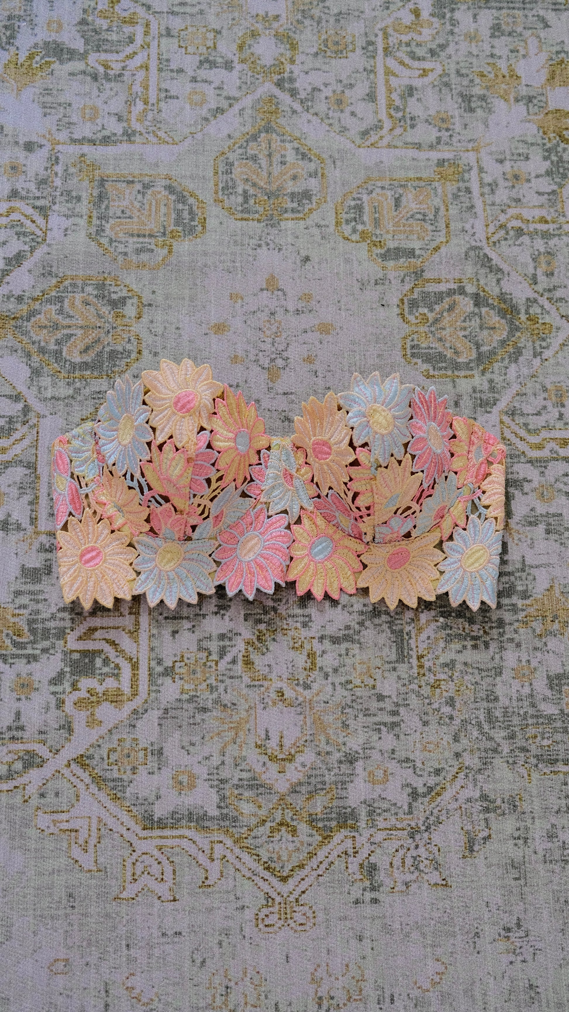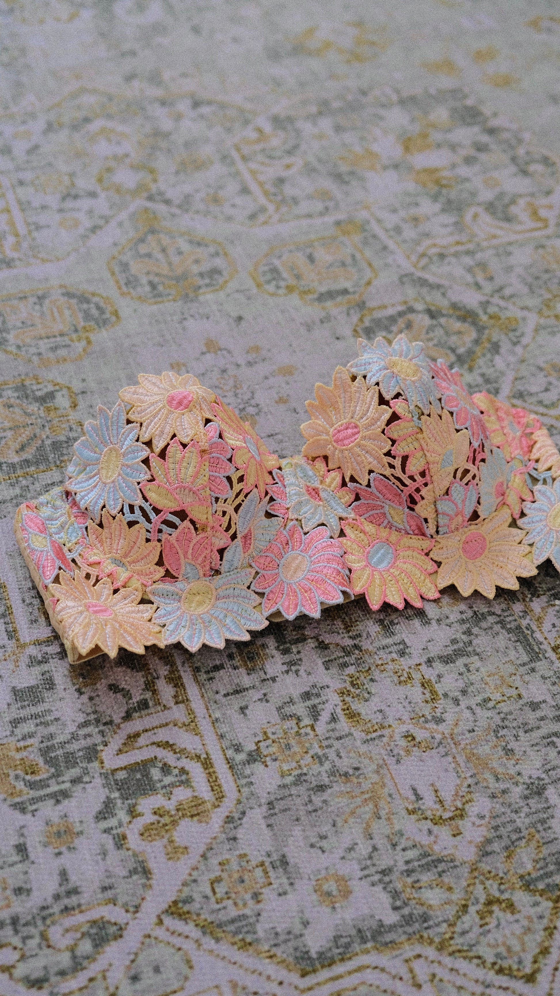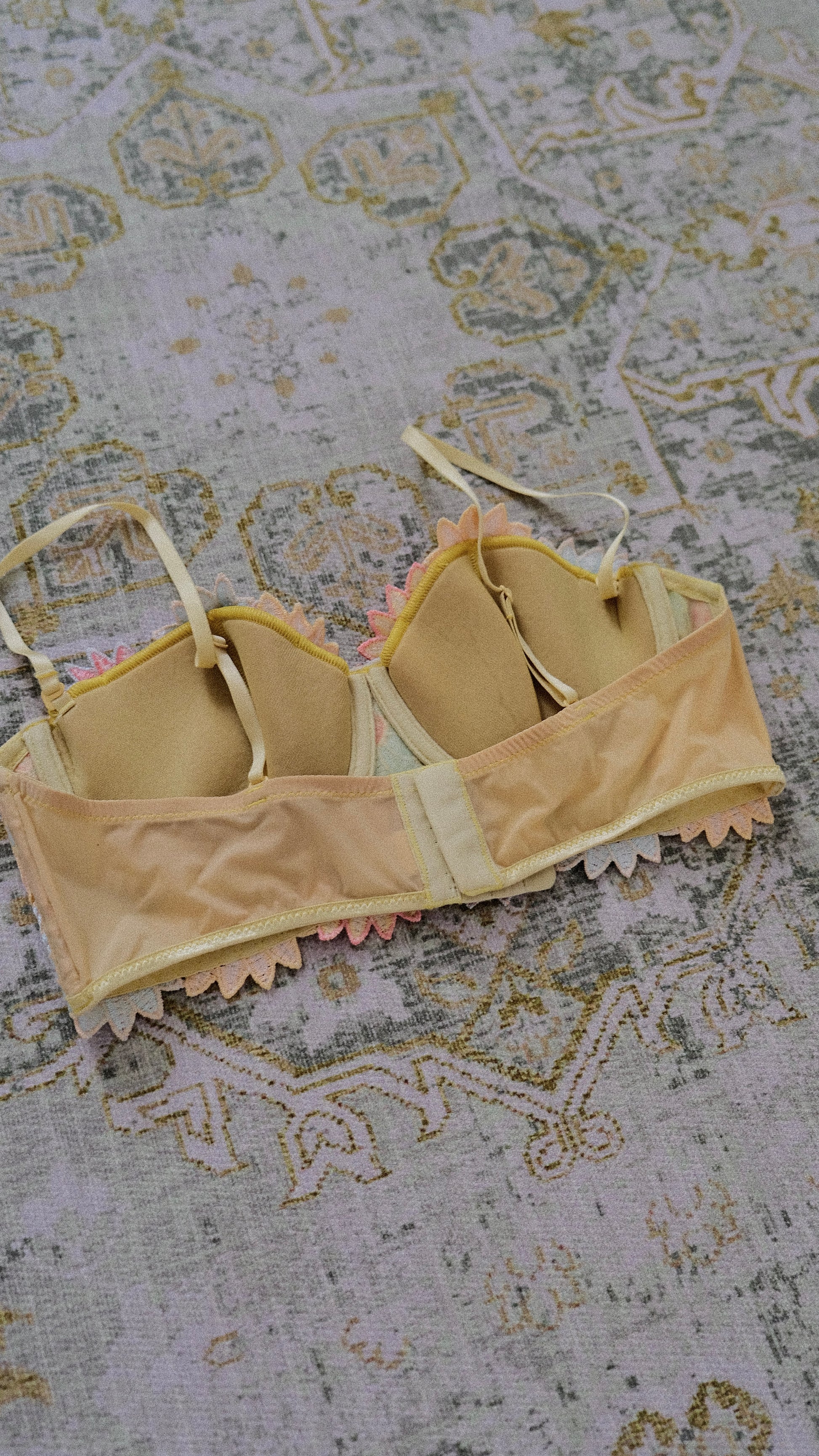 A vintage pastel colored floral balconette from a discontinued French brand.