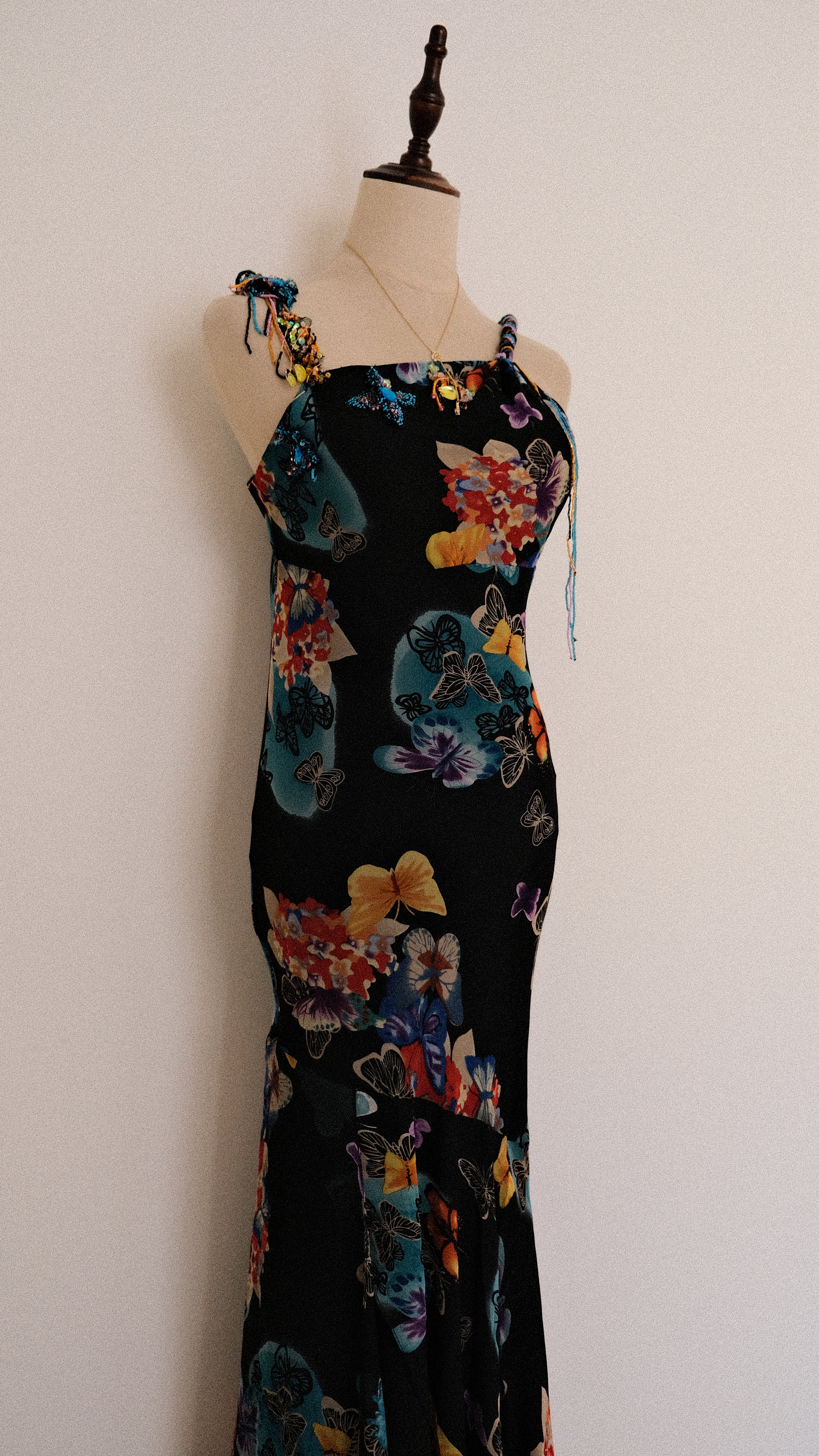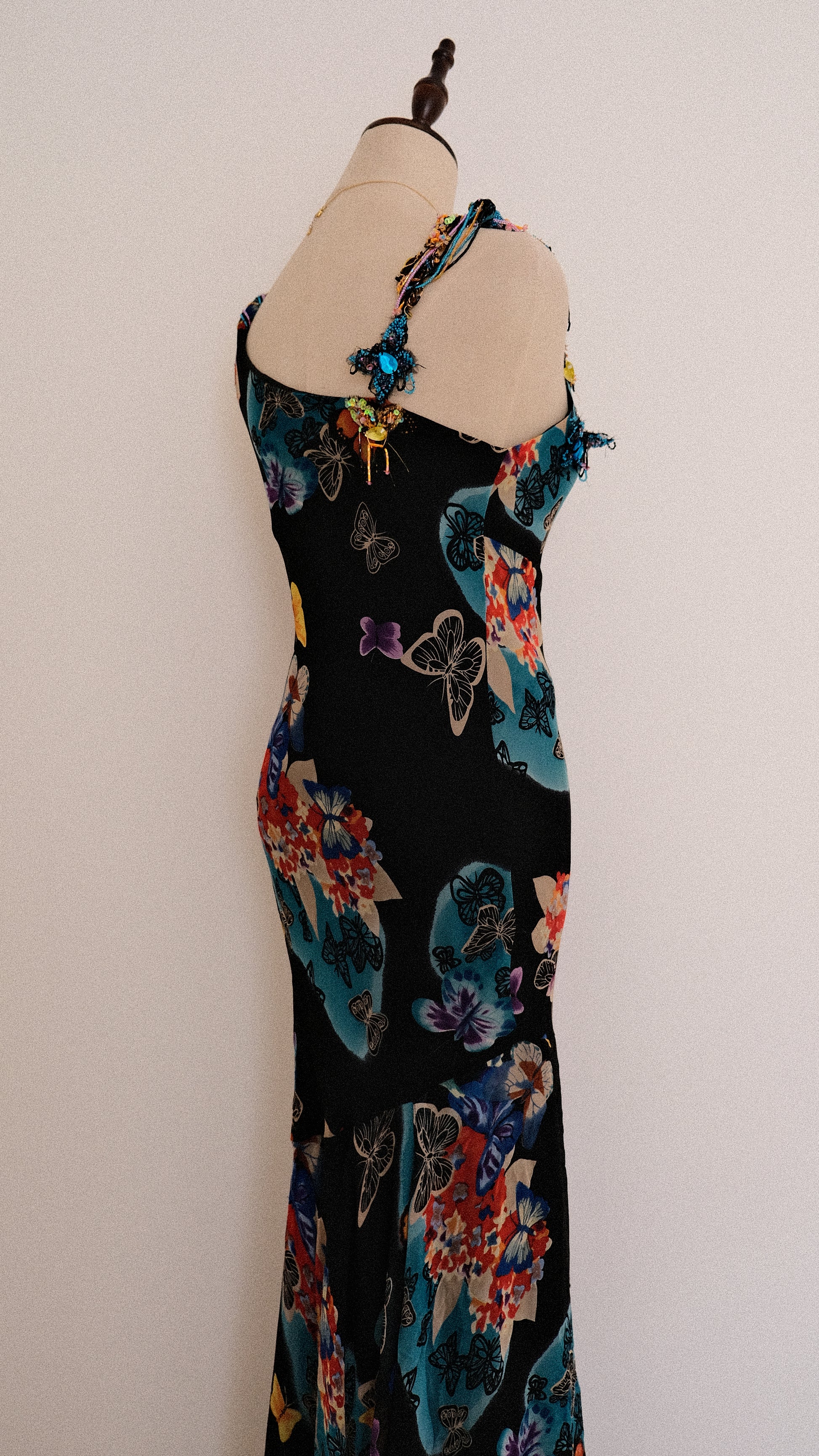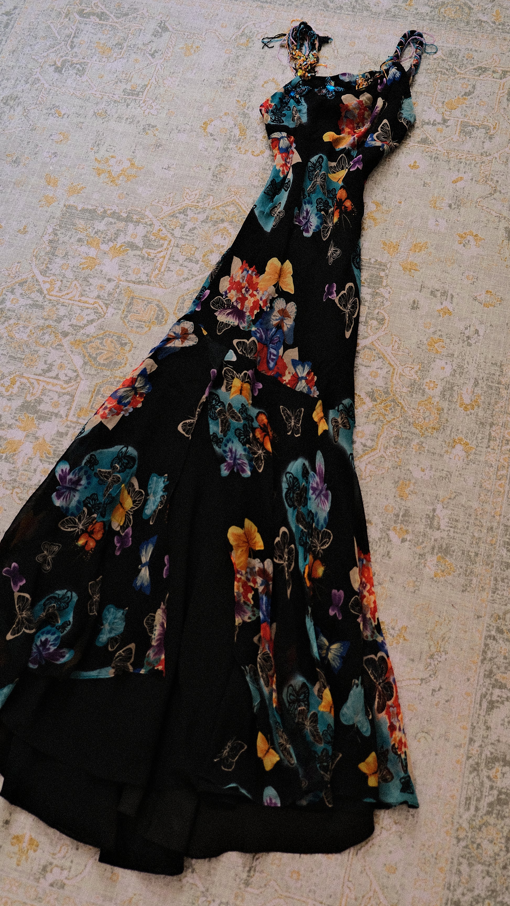 A breathtaking evening dress with embellished details around the neckline and on the straps, combined with a pattern full of butterflies.
