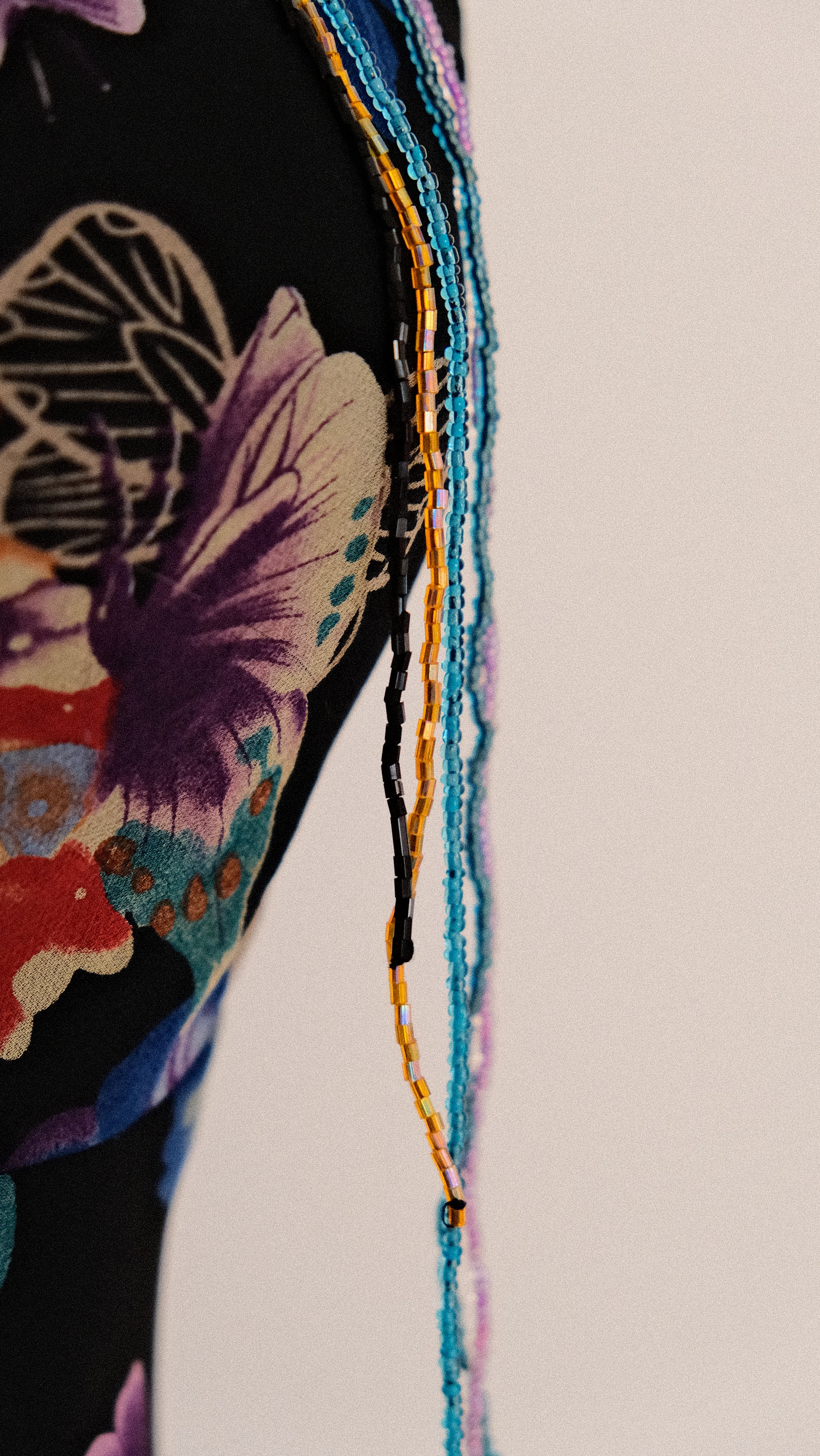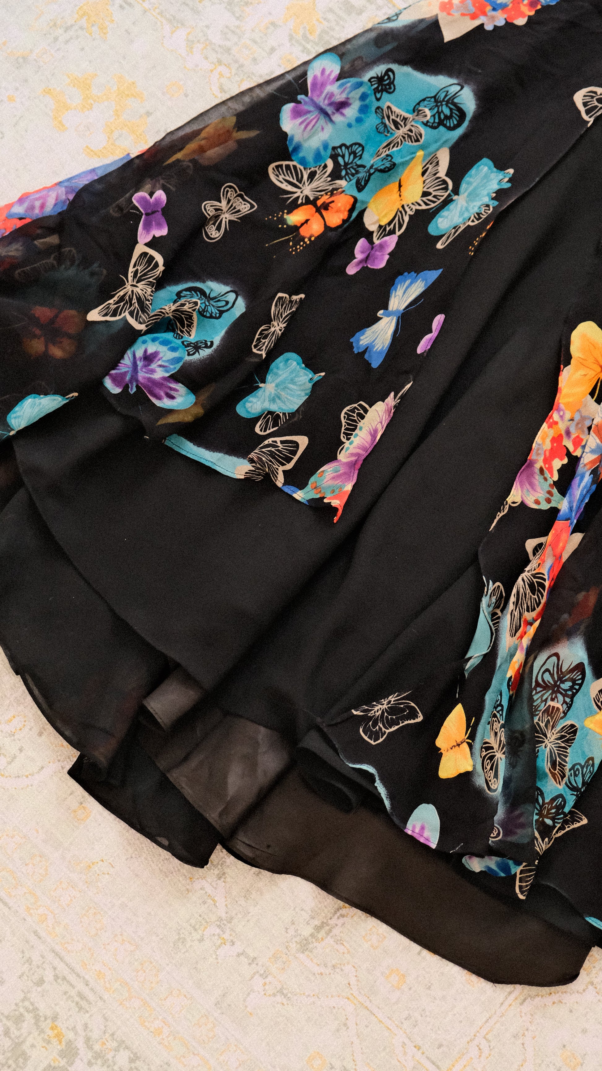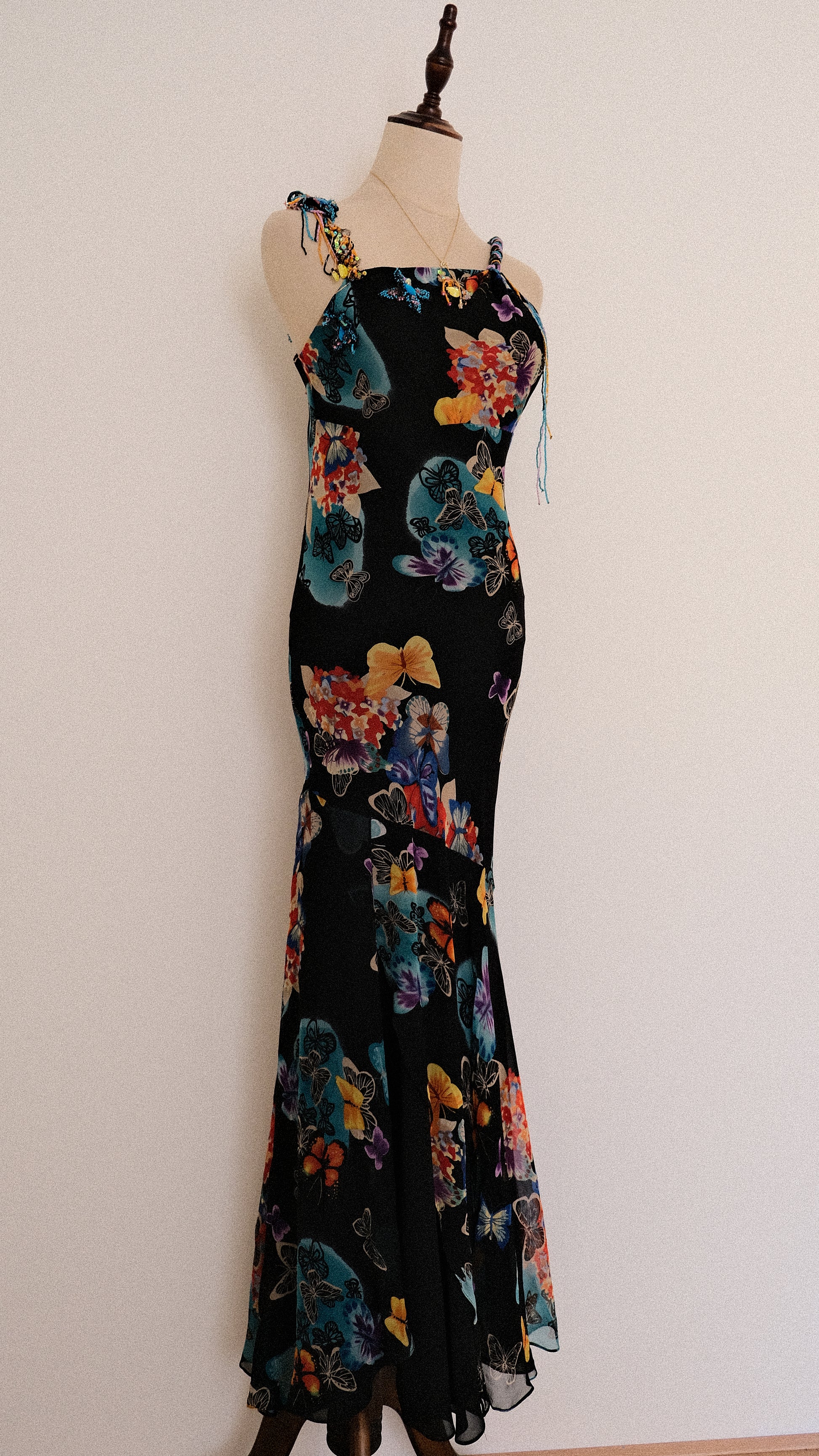 A breathtaking evening dress with embellished details around the neckline and on the straps, combined with a pattern full of butterflies.