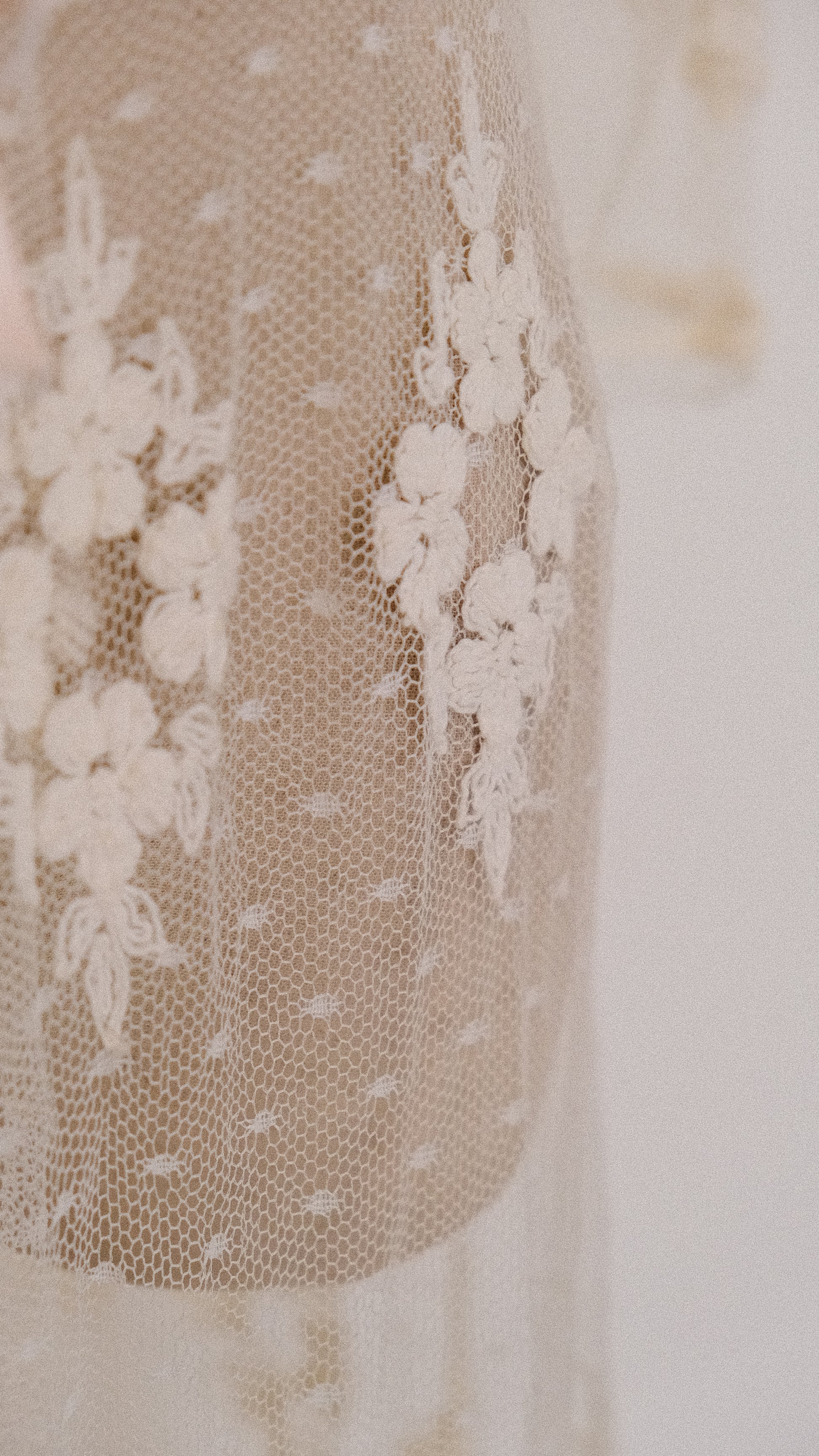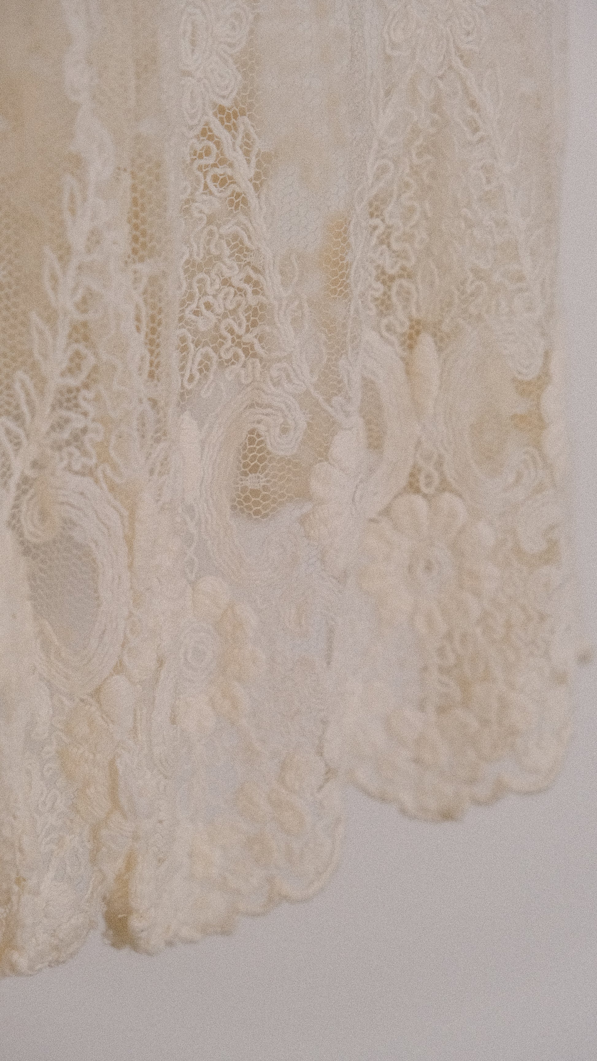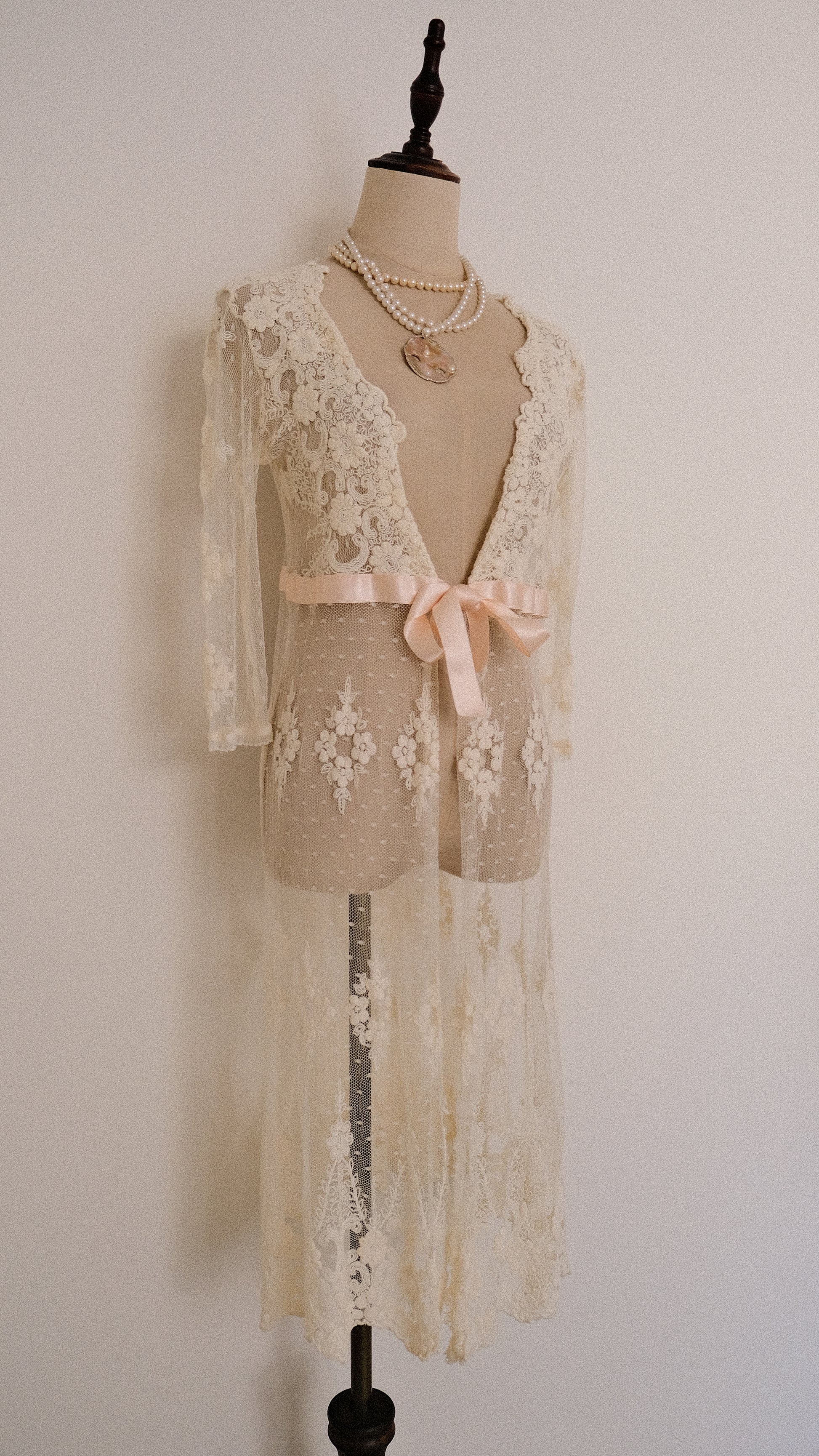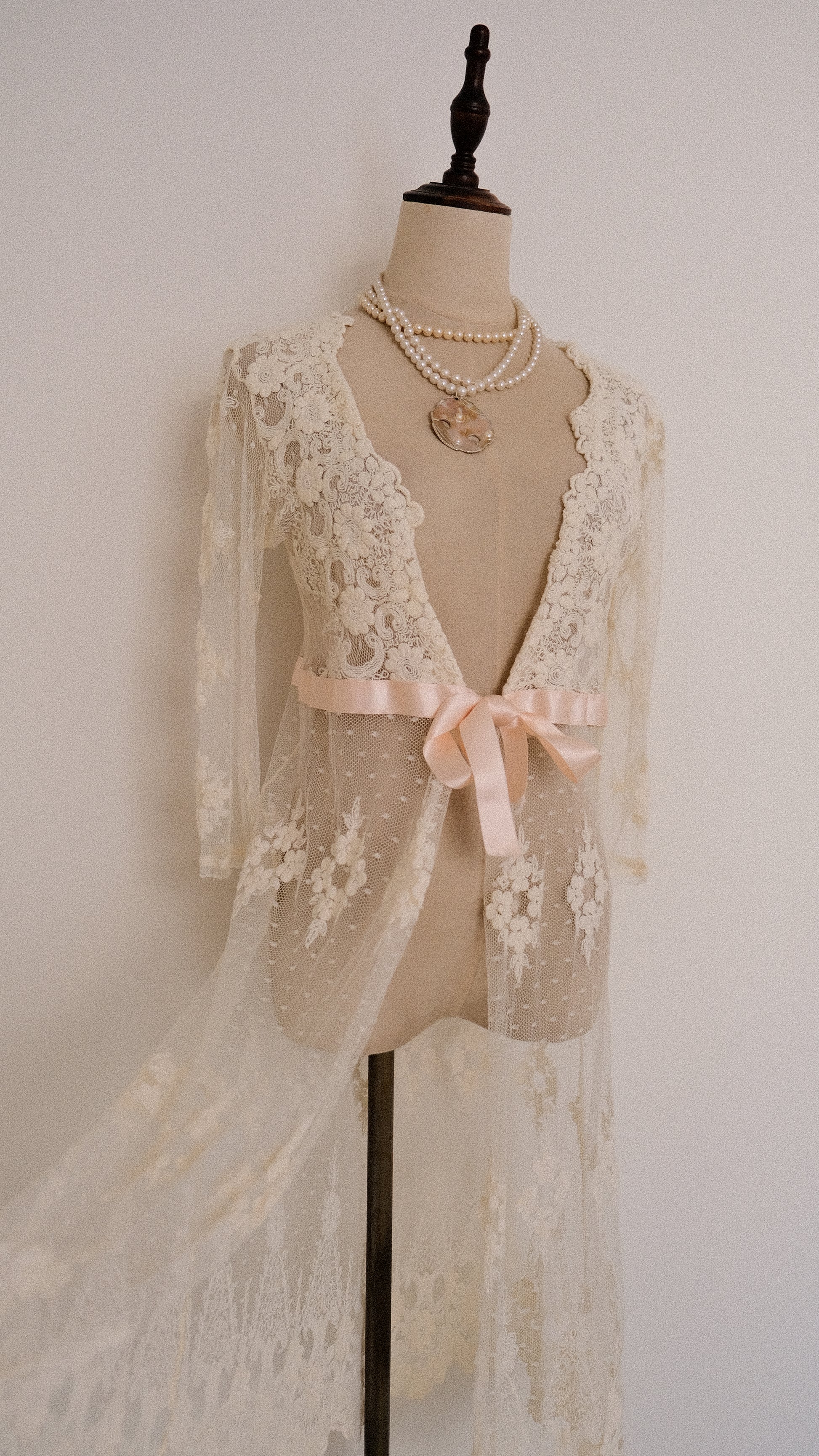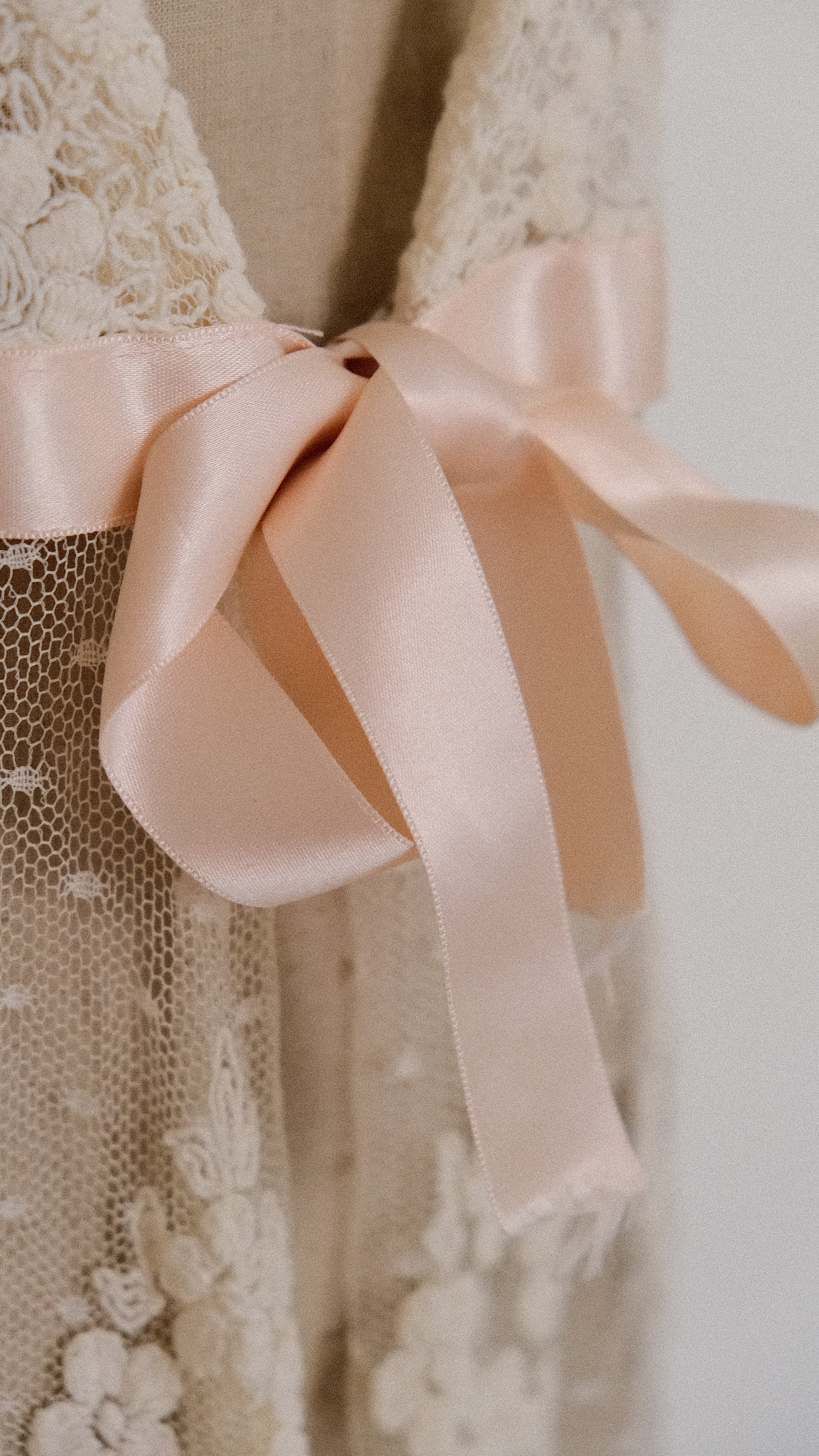 A vintage French lace duster with pink straps that can be tied into a bow.