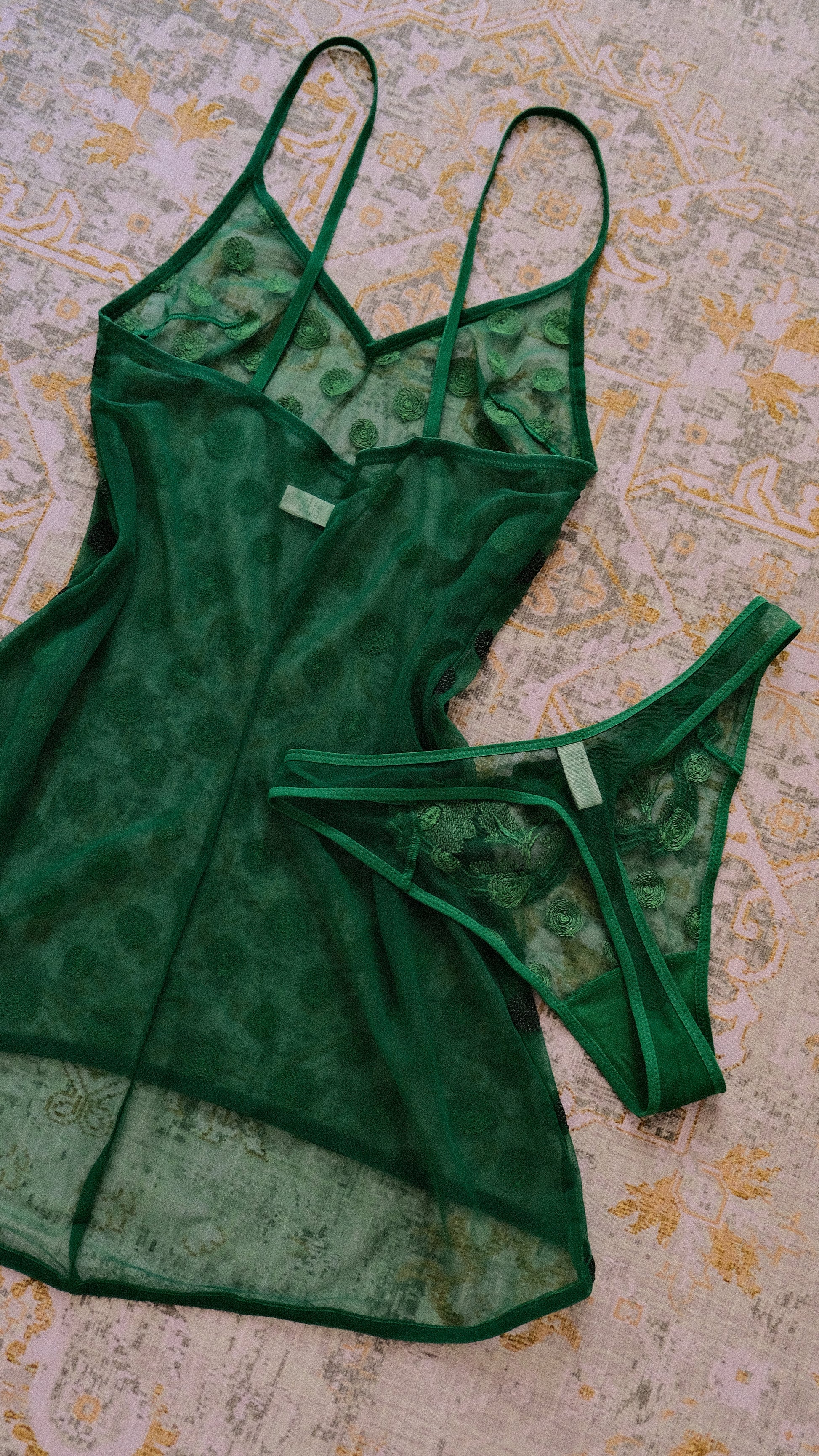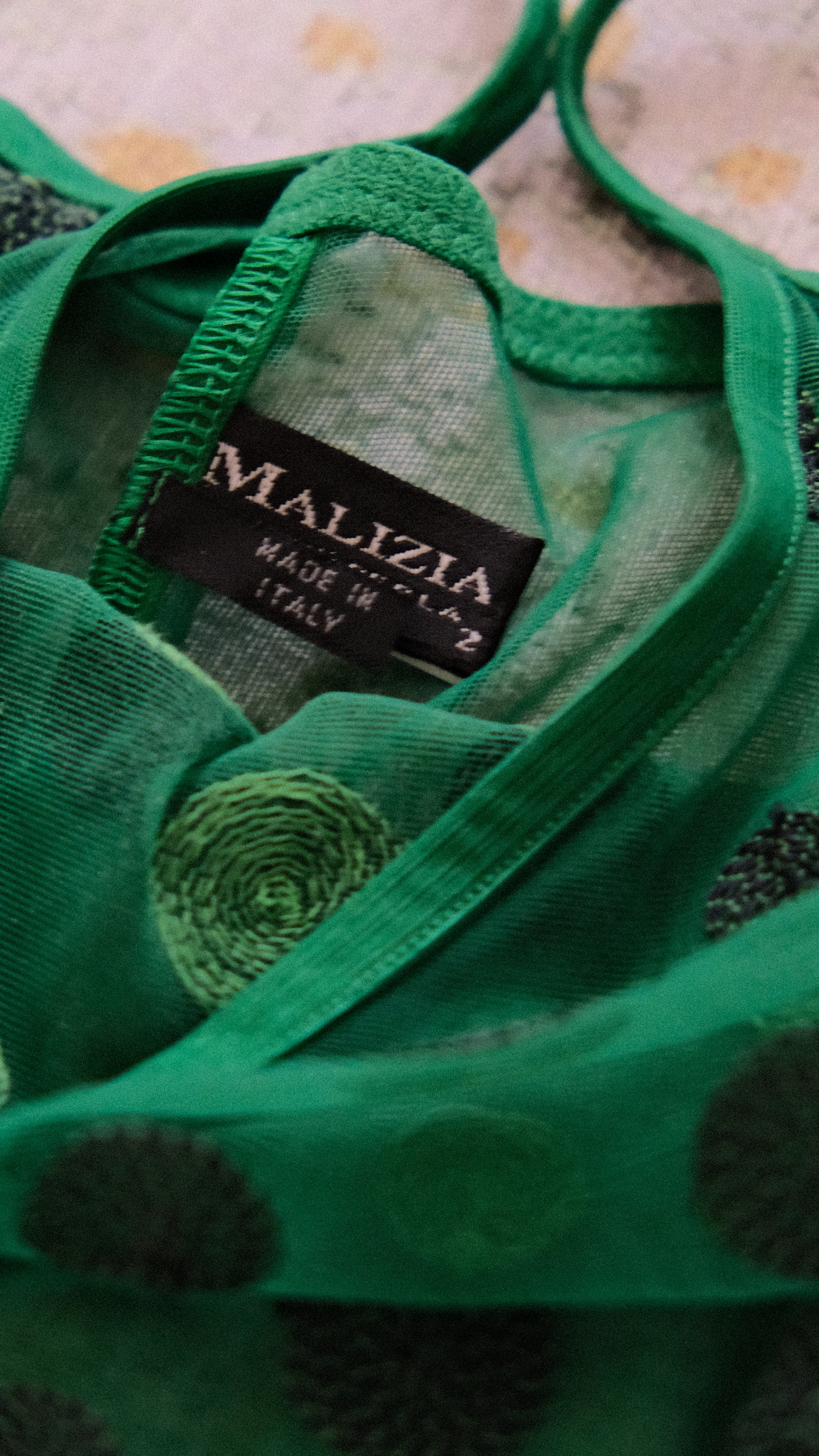A sheer babydoll from the brand Malizia by La Perla in a bright green color with polka dot pattern.