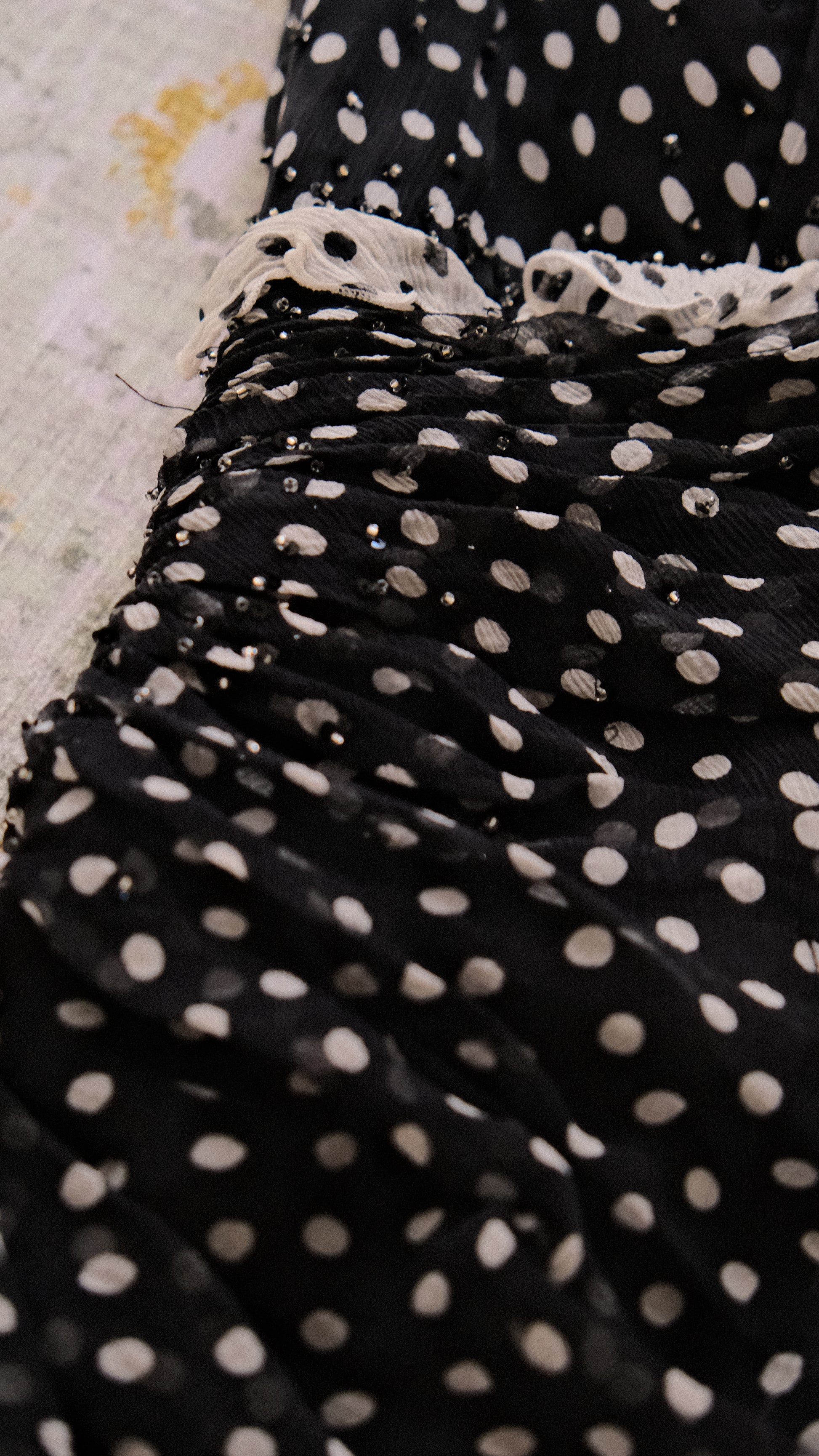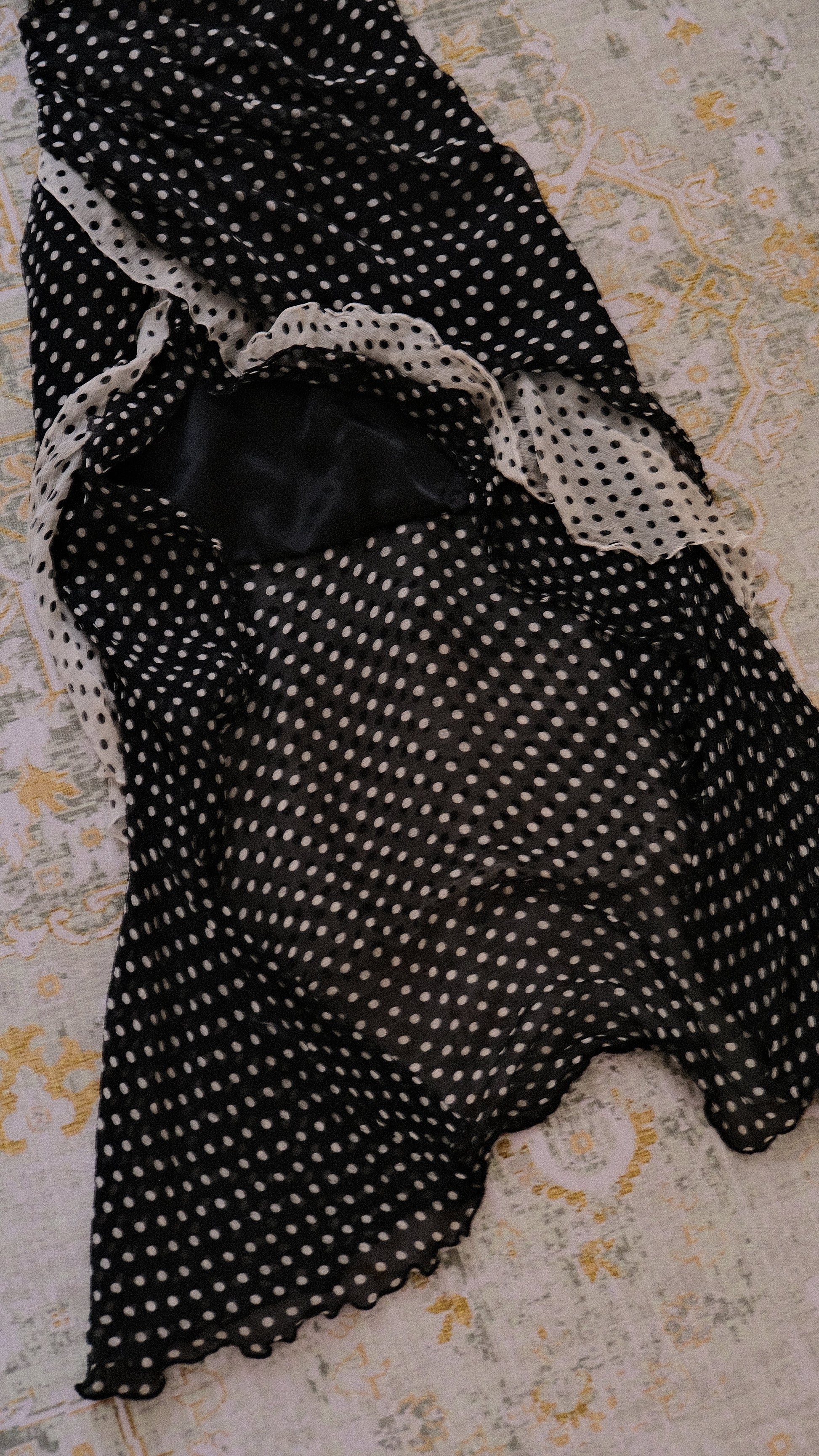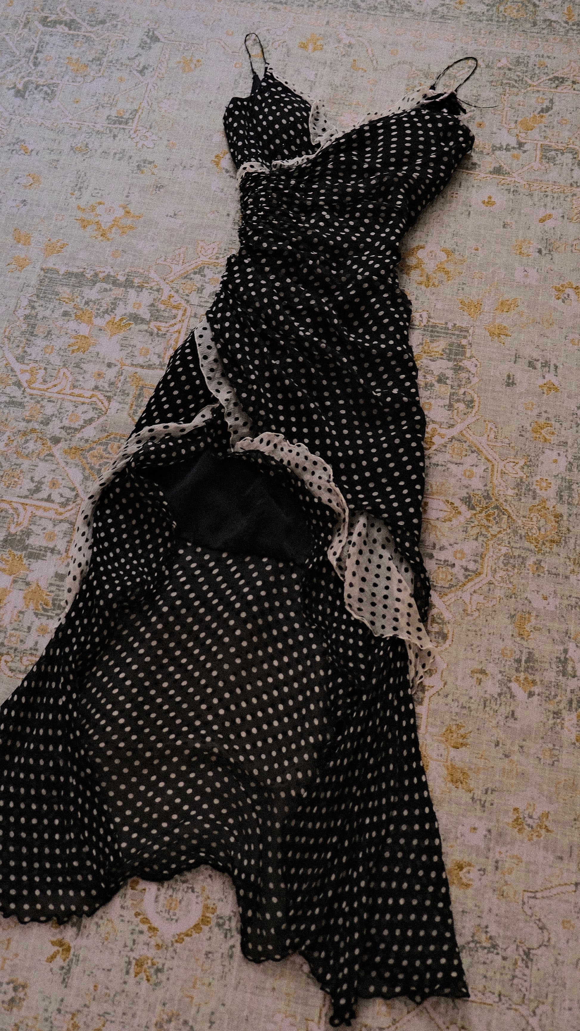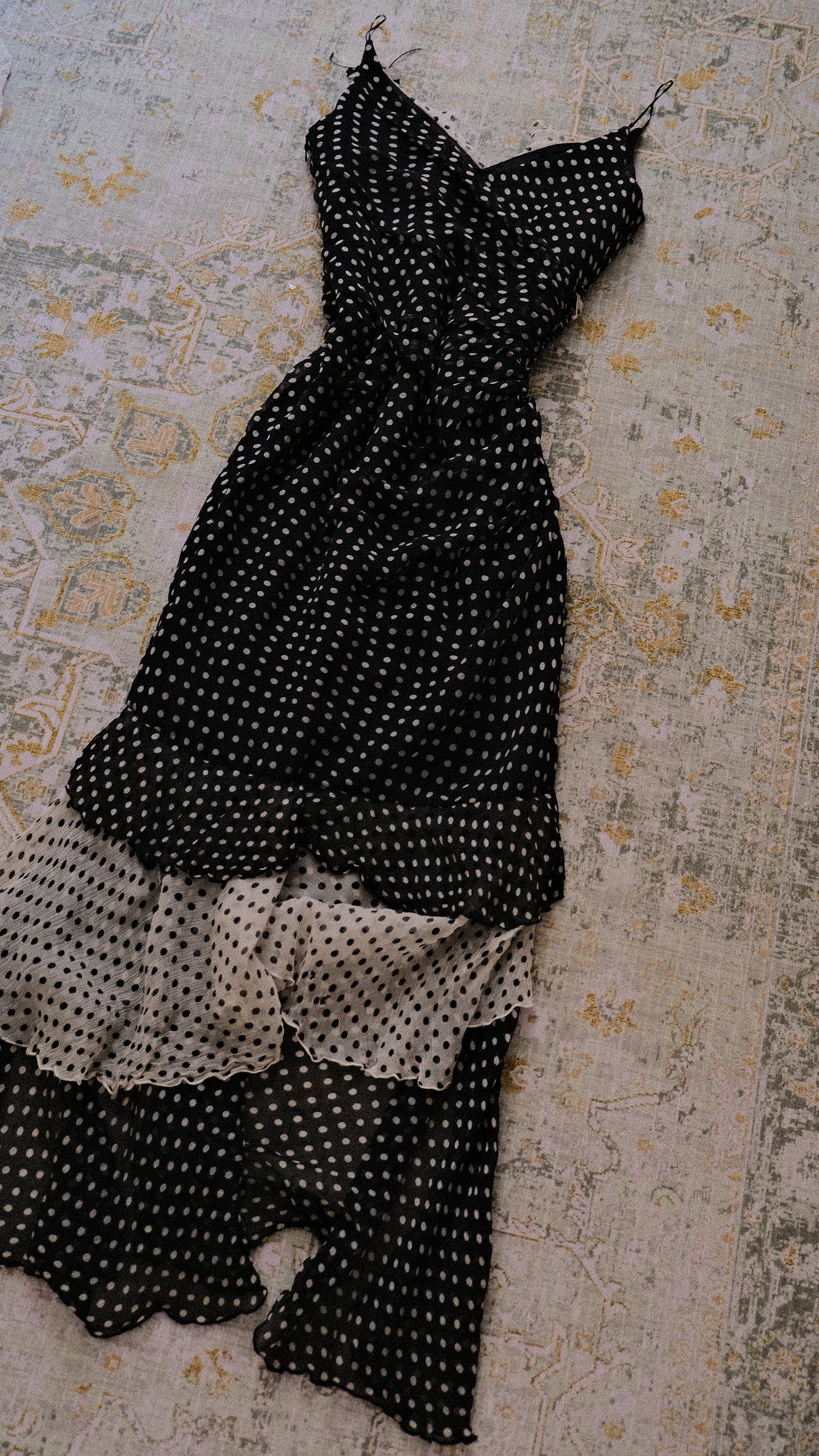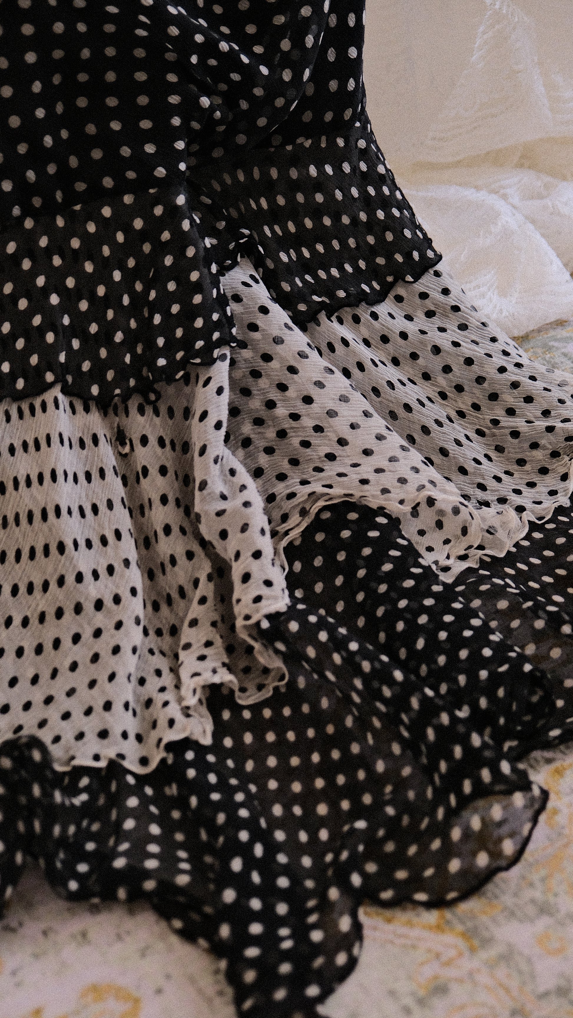 A rare layered fairytale dress covered in polka dot pattern. Has some embellishments around the waist.