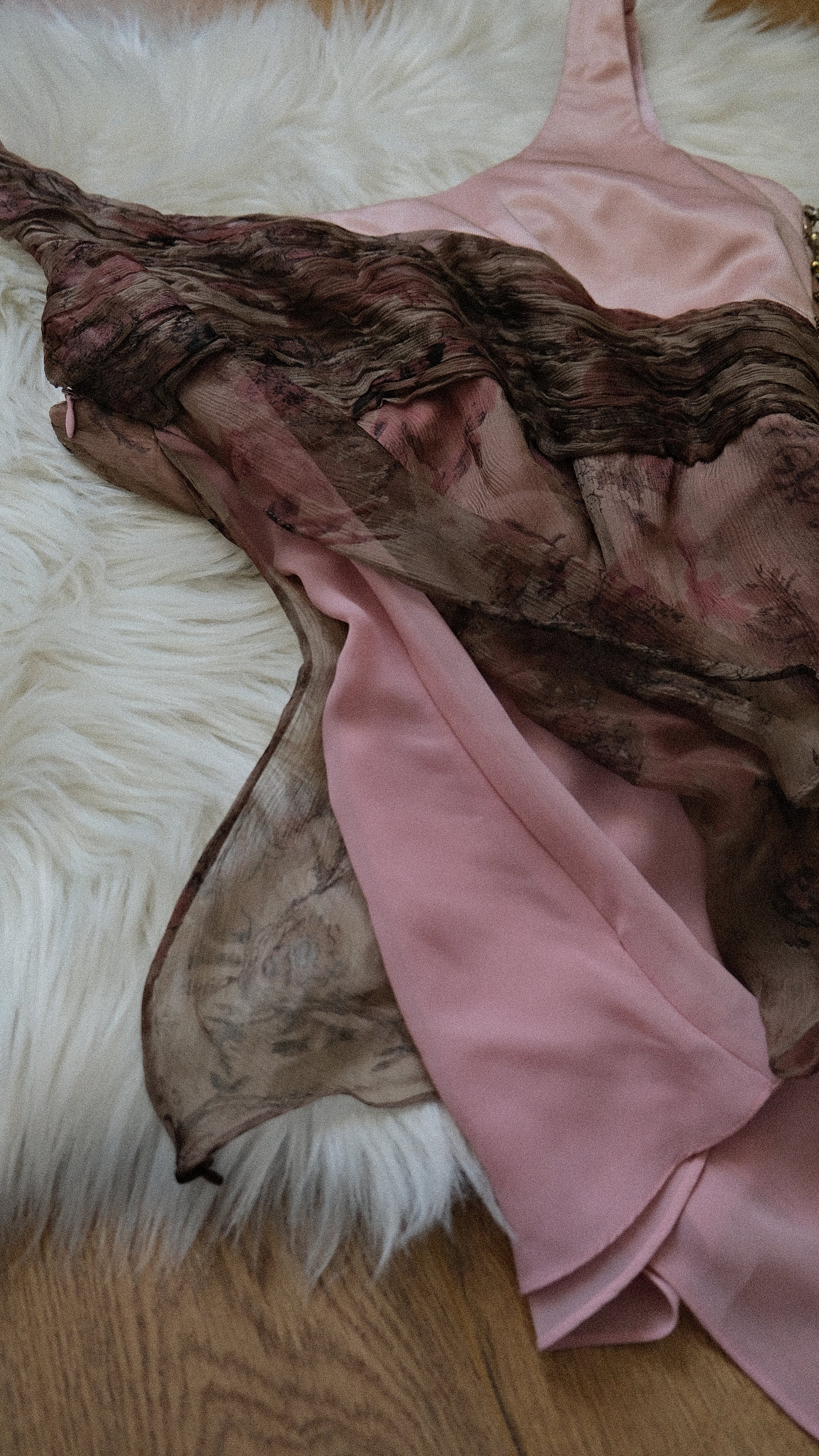 A blush colored embellished mermaidcore top with asymmetrical cut at the bottom.