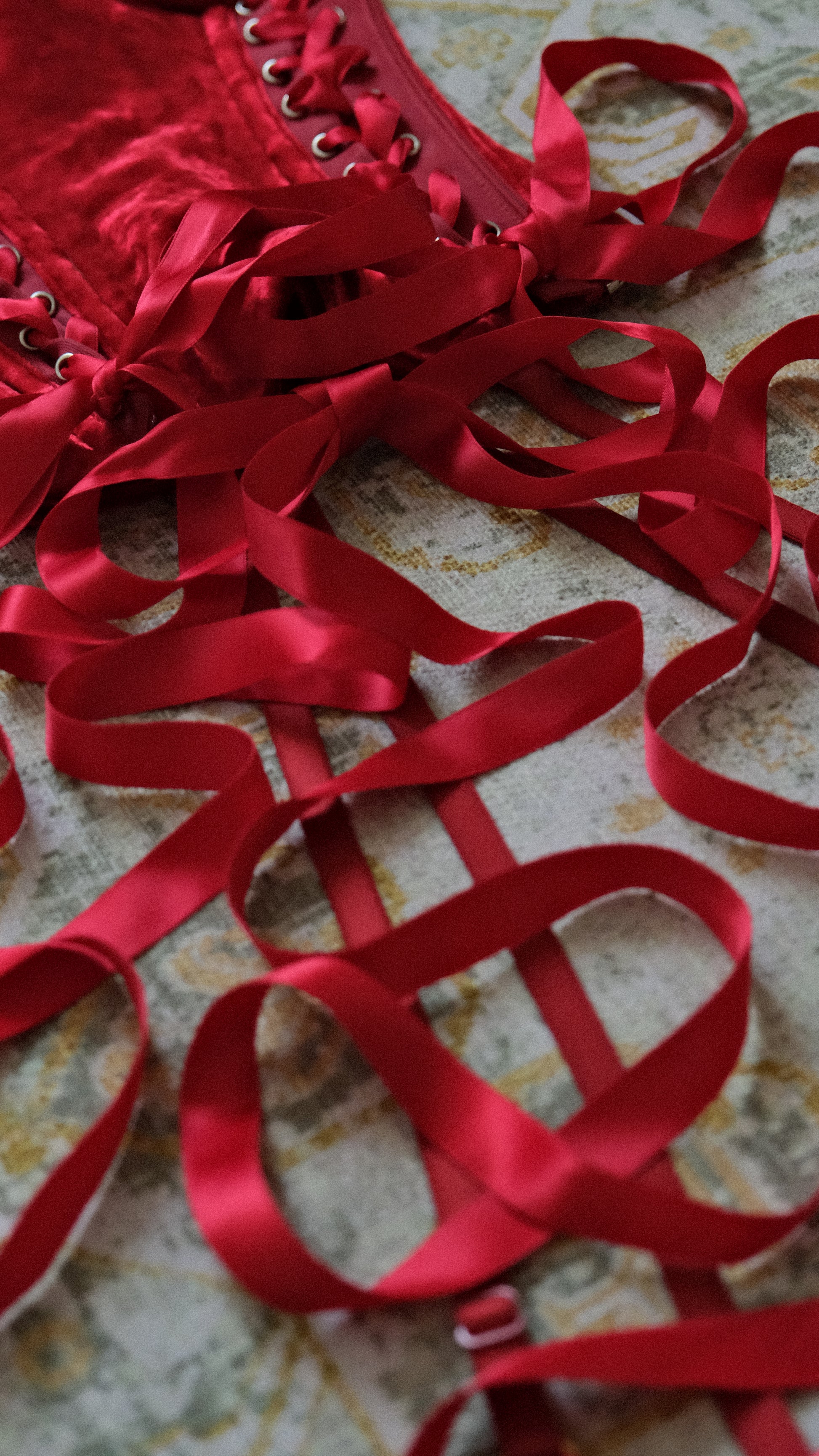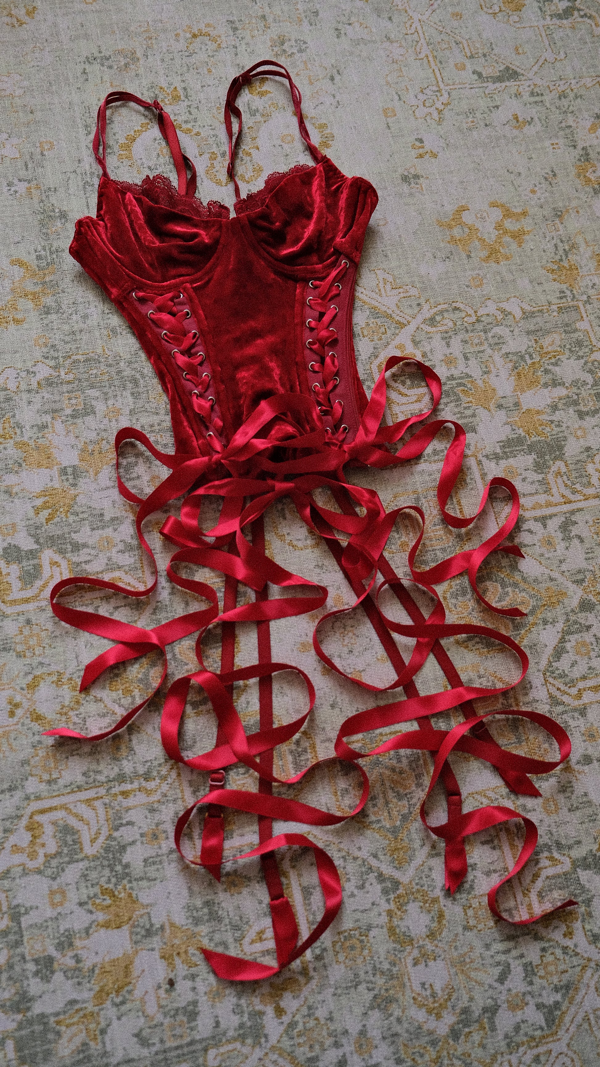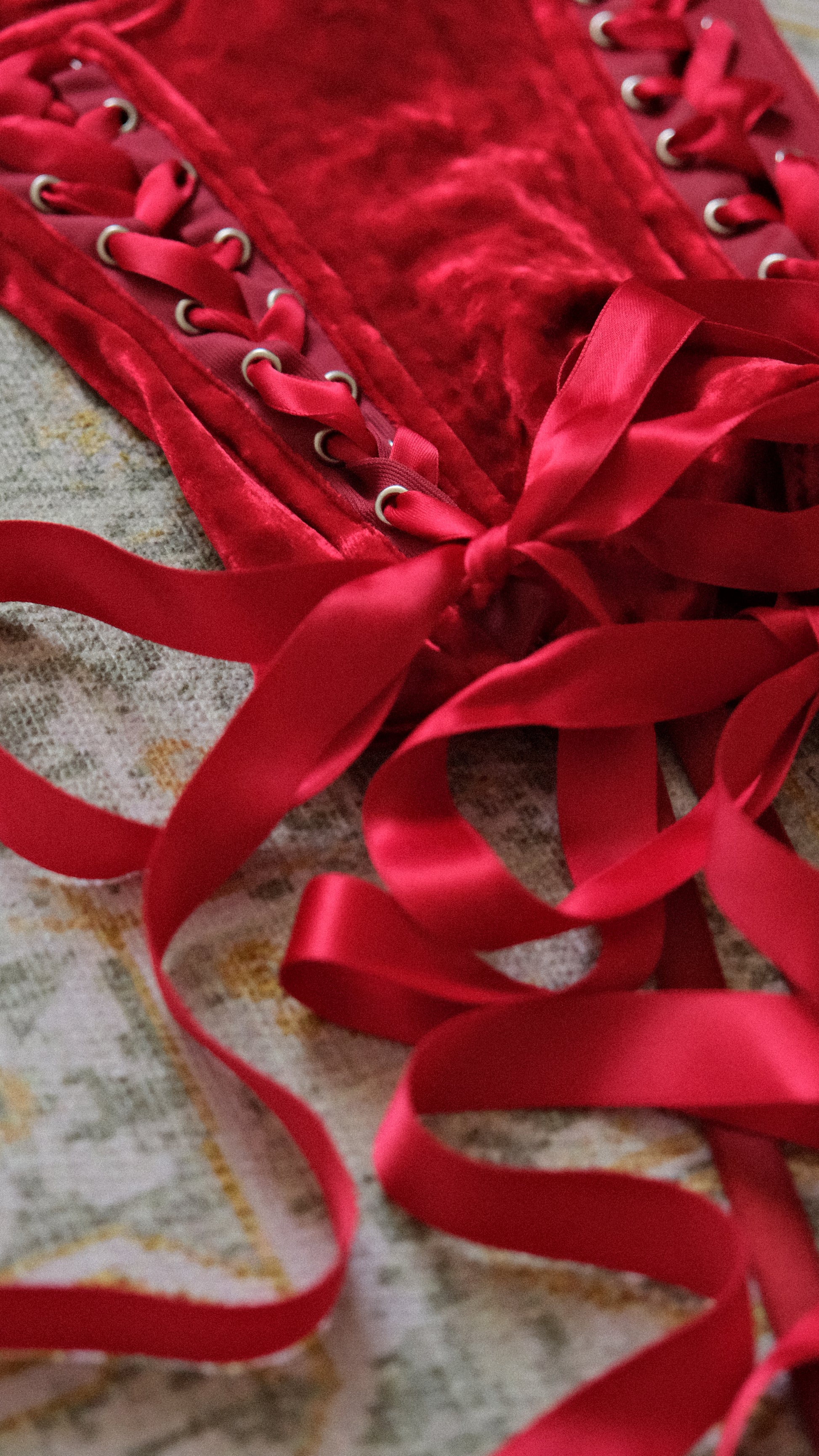 A vintage velours red winter aesthetic corset top with lacing at the front and in the middle at the back. Has a zipper on the side.