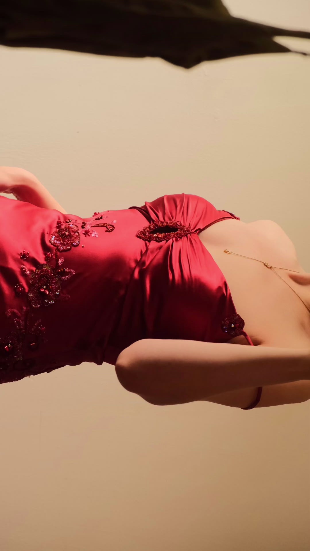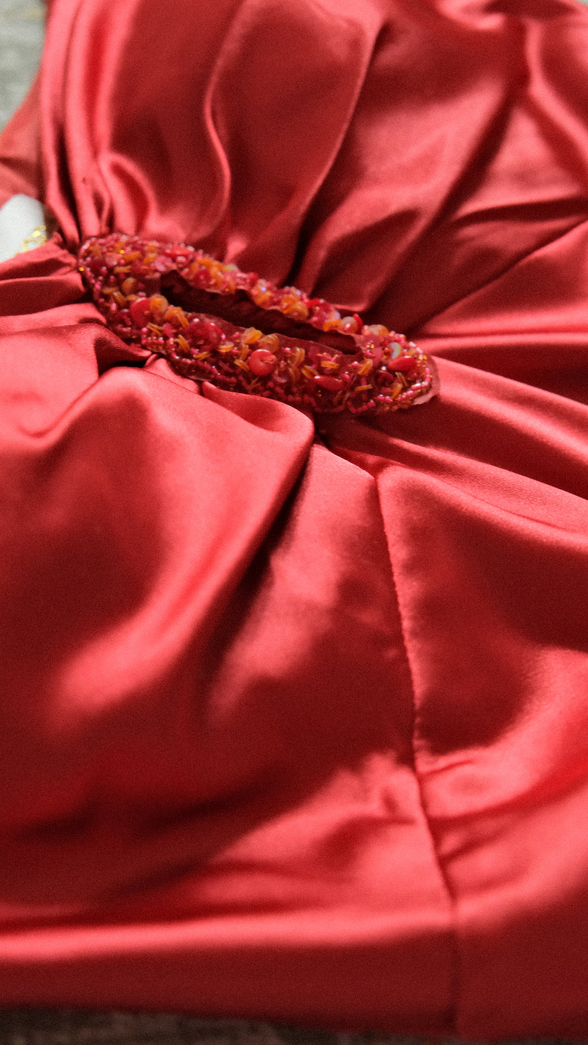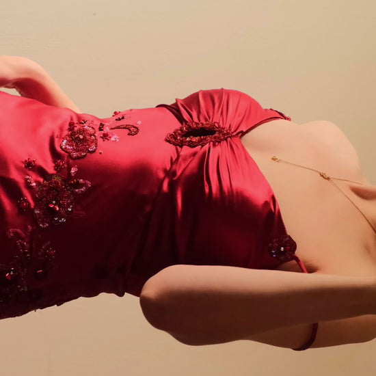 A vintage red romantic evening gown with embellished details.