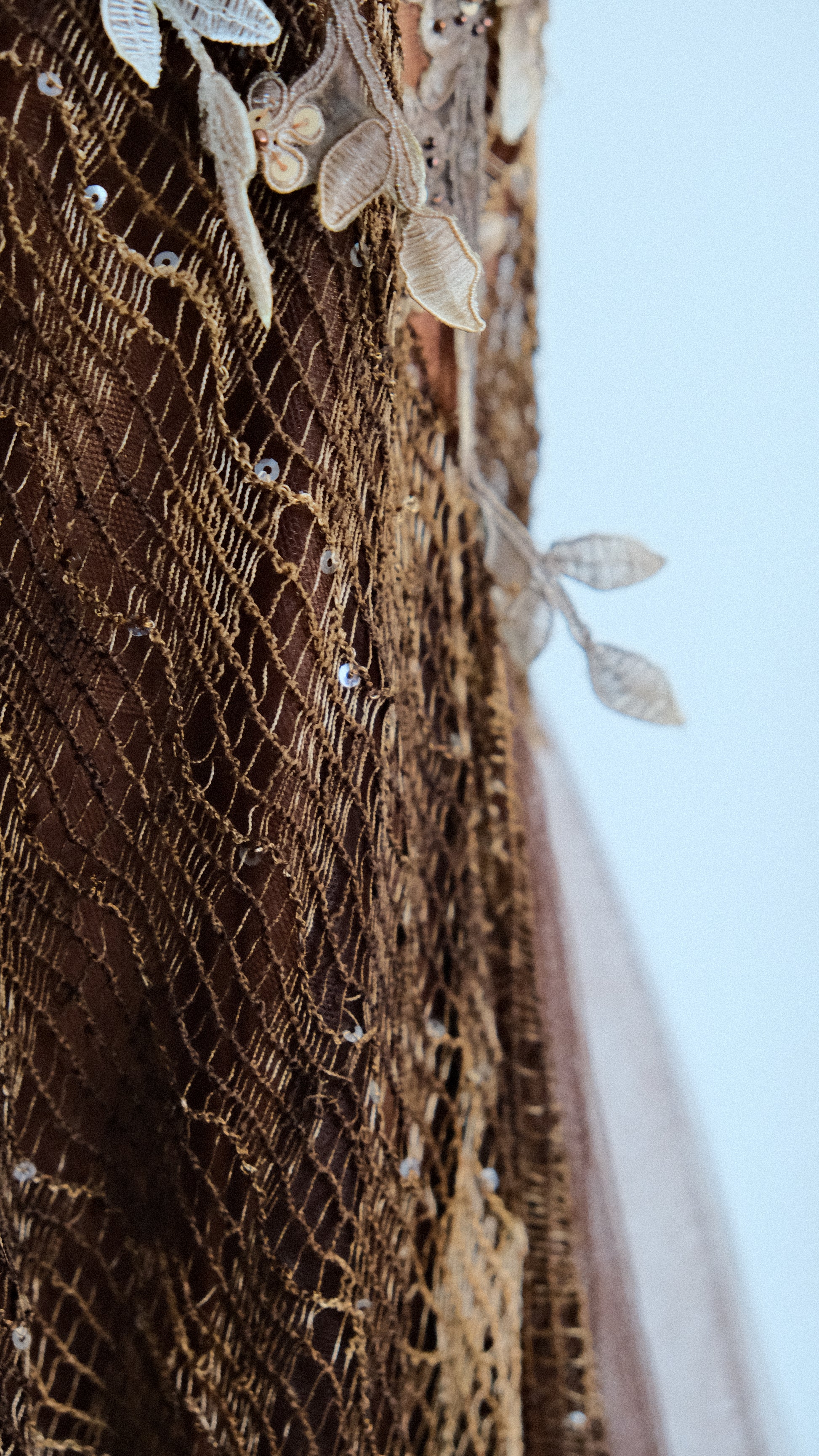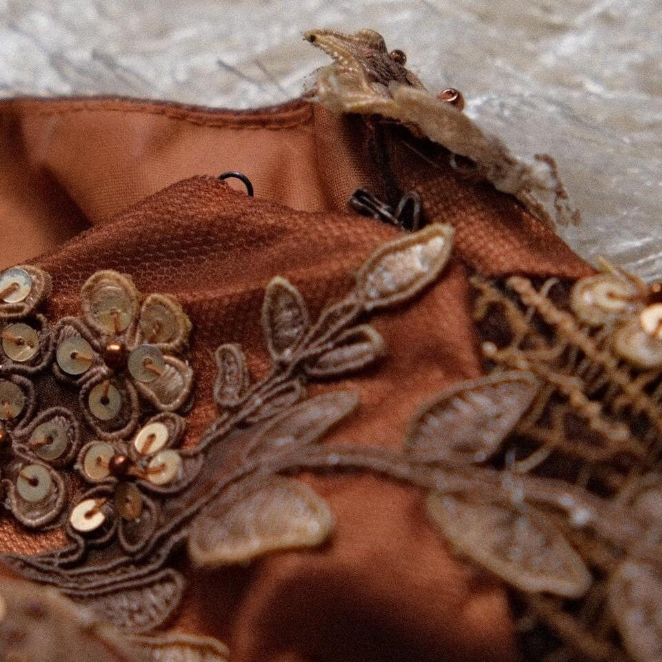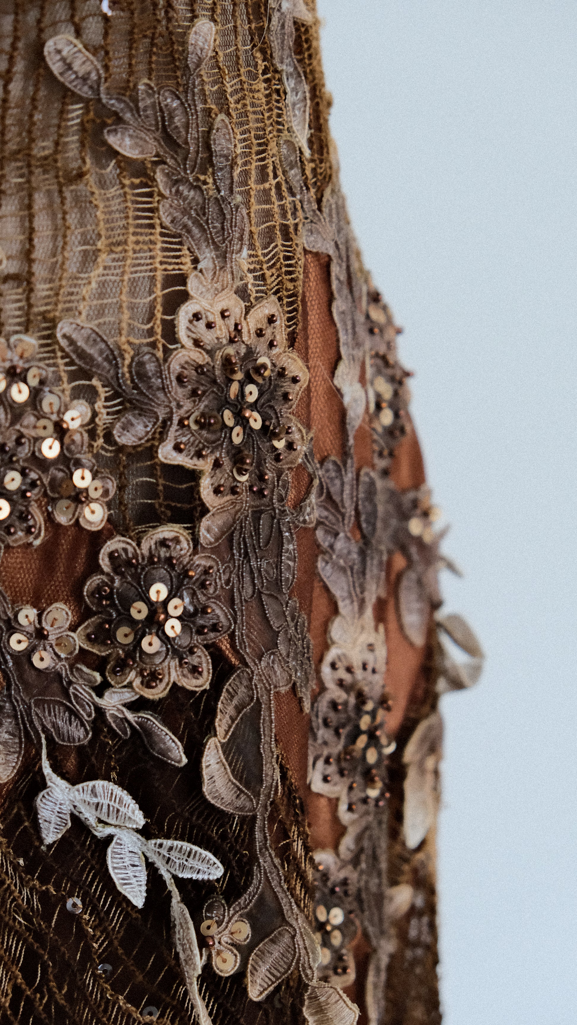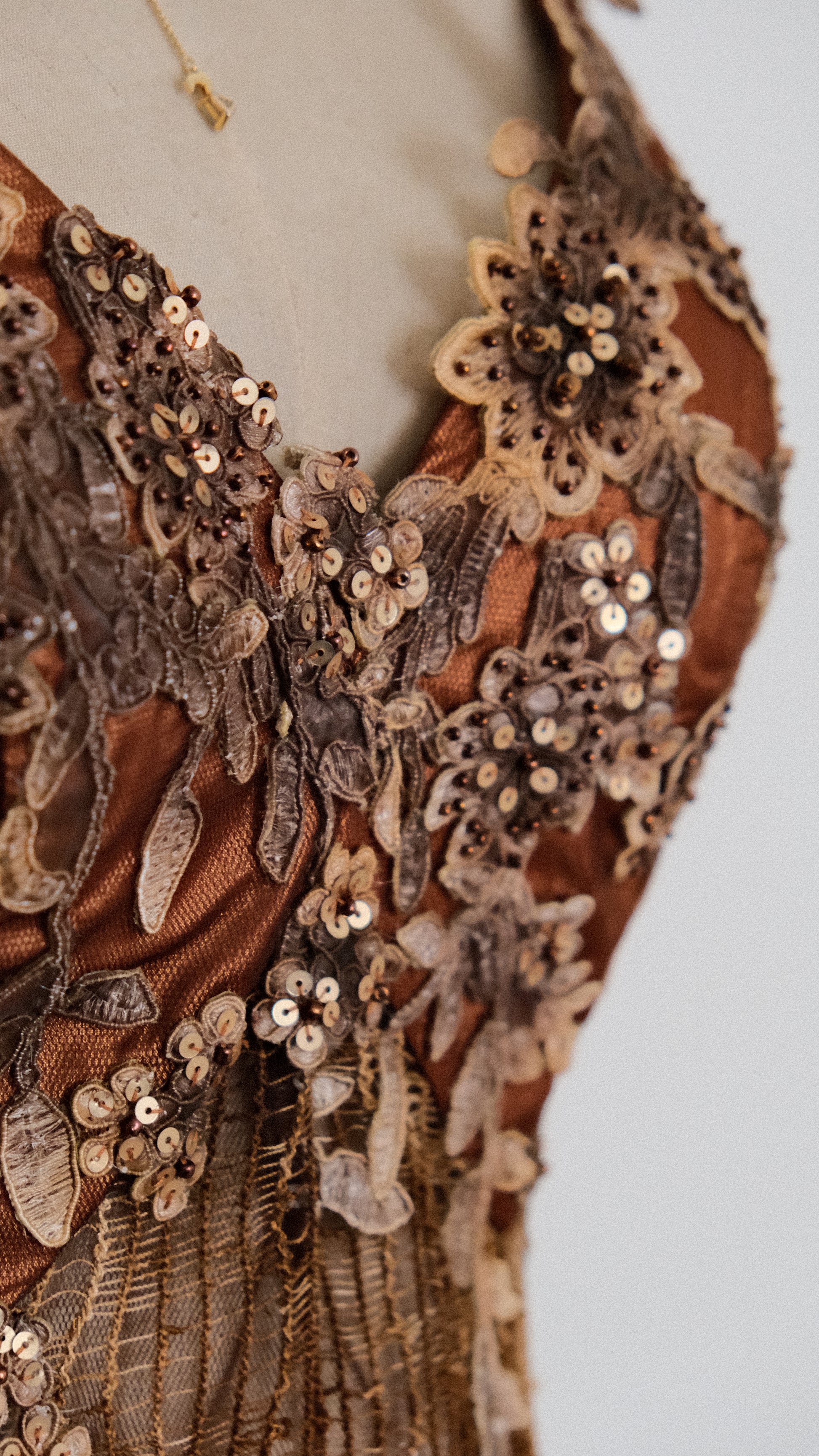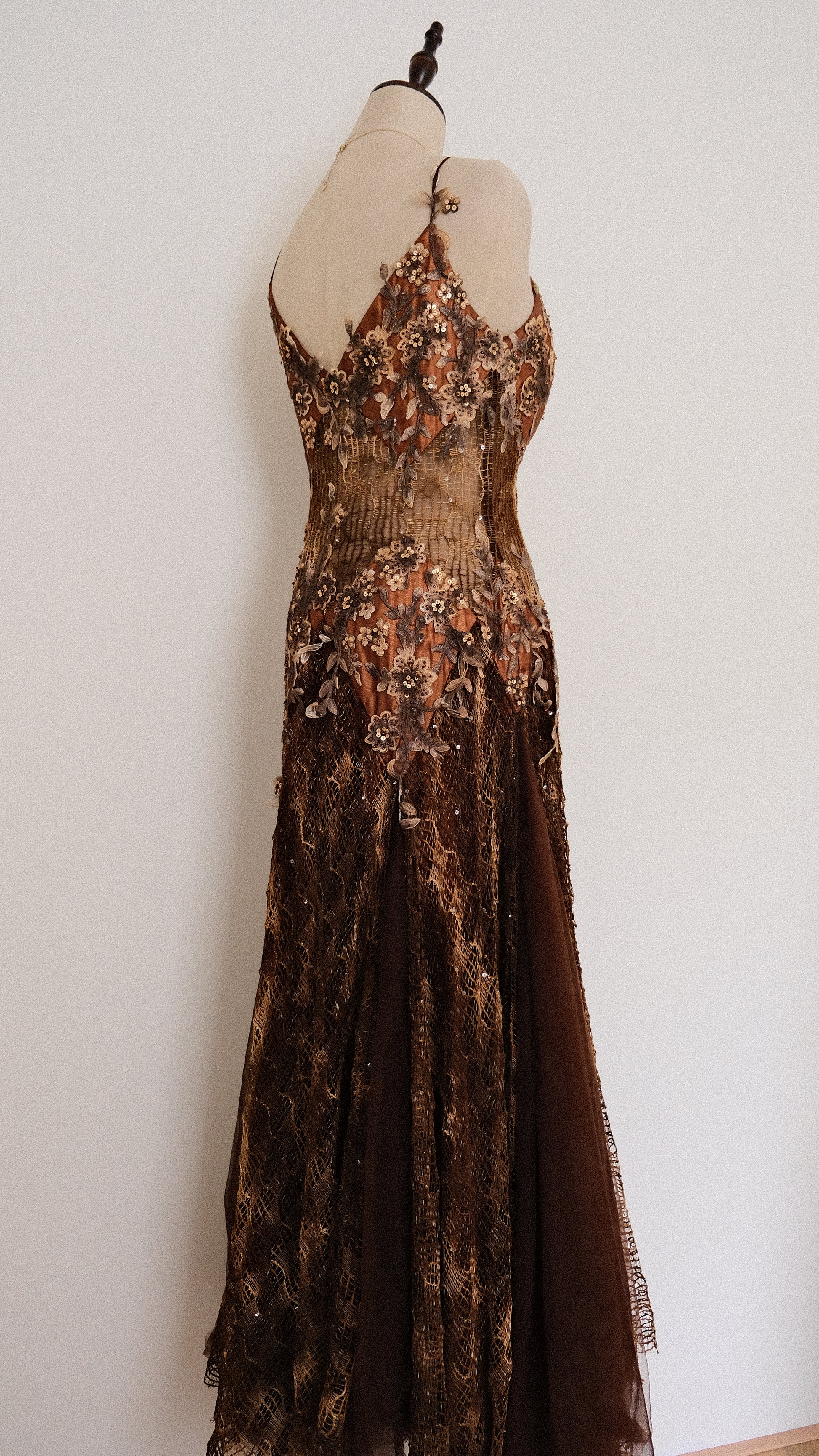 A dark brown whimsical evening dress with the most beautiful fairycore details. The dress has split detailing in the fabric for a flirty look and embroidery and sequin details around the chest.