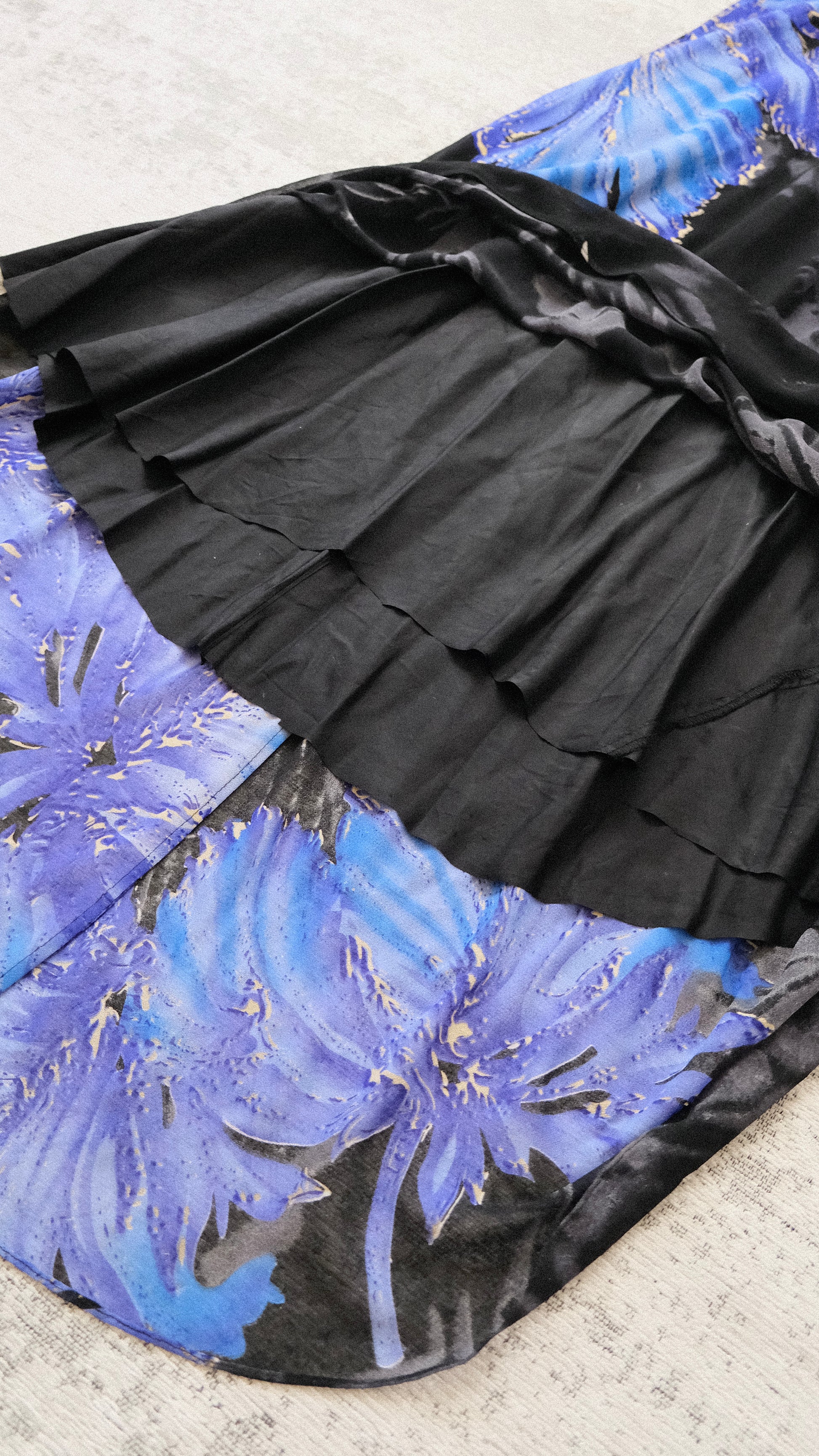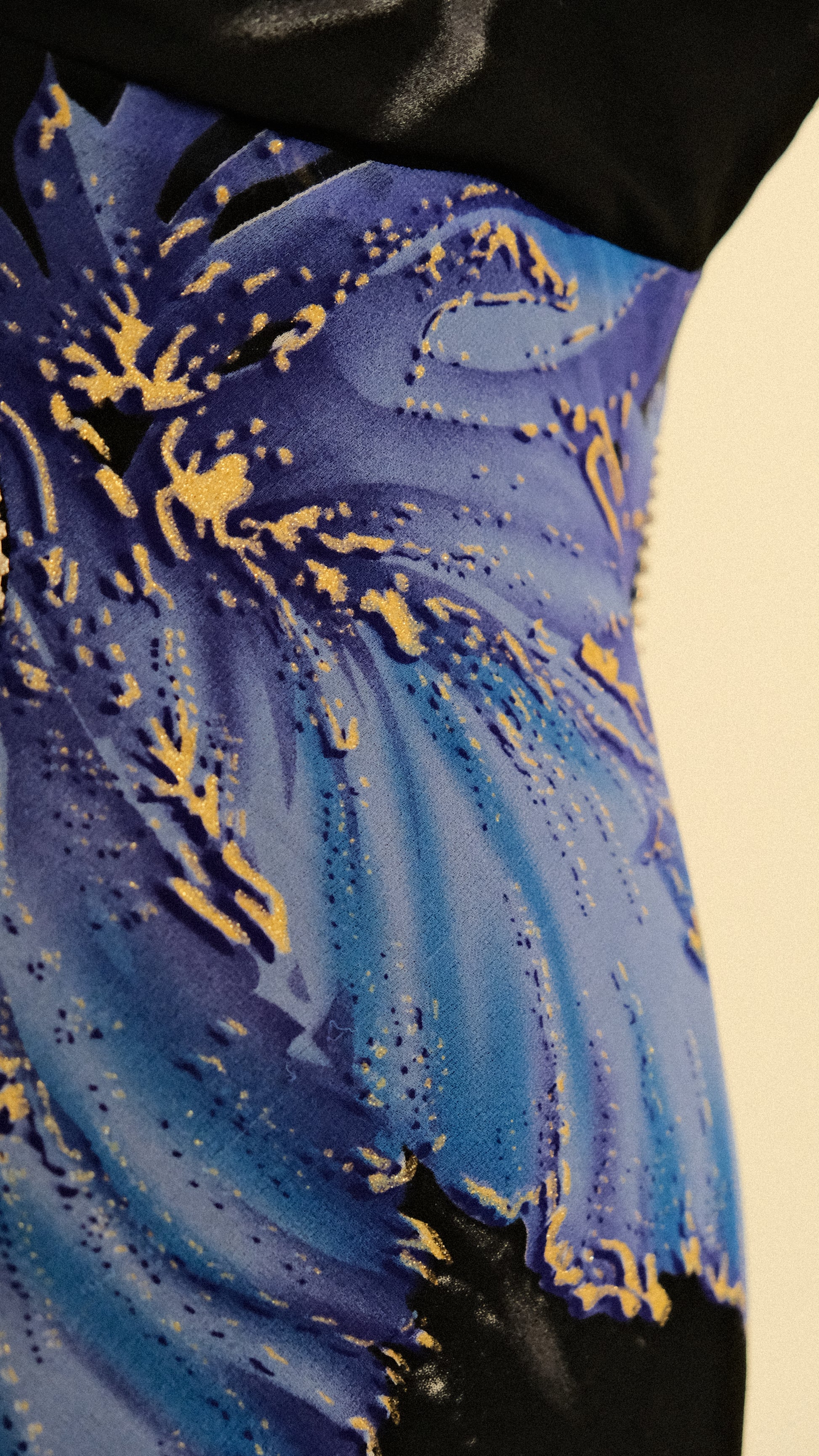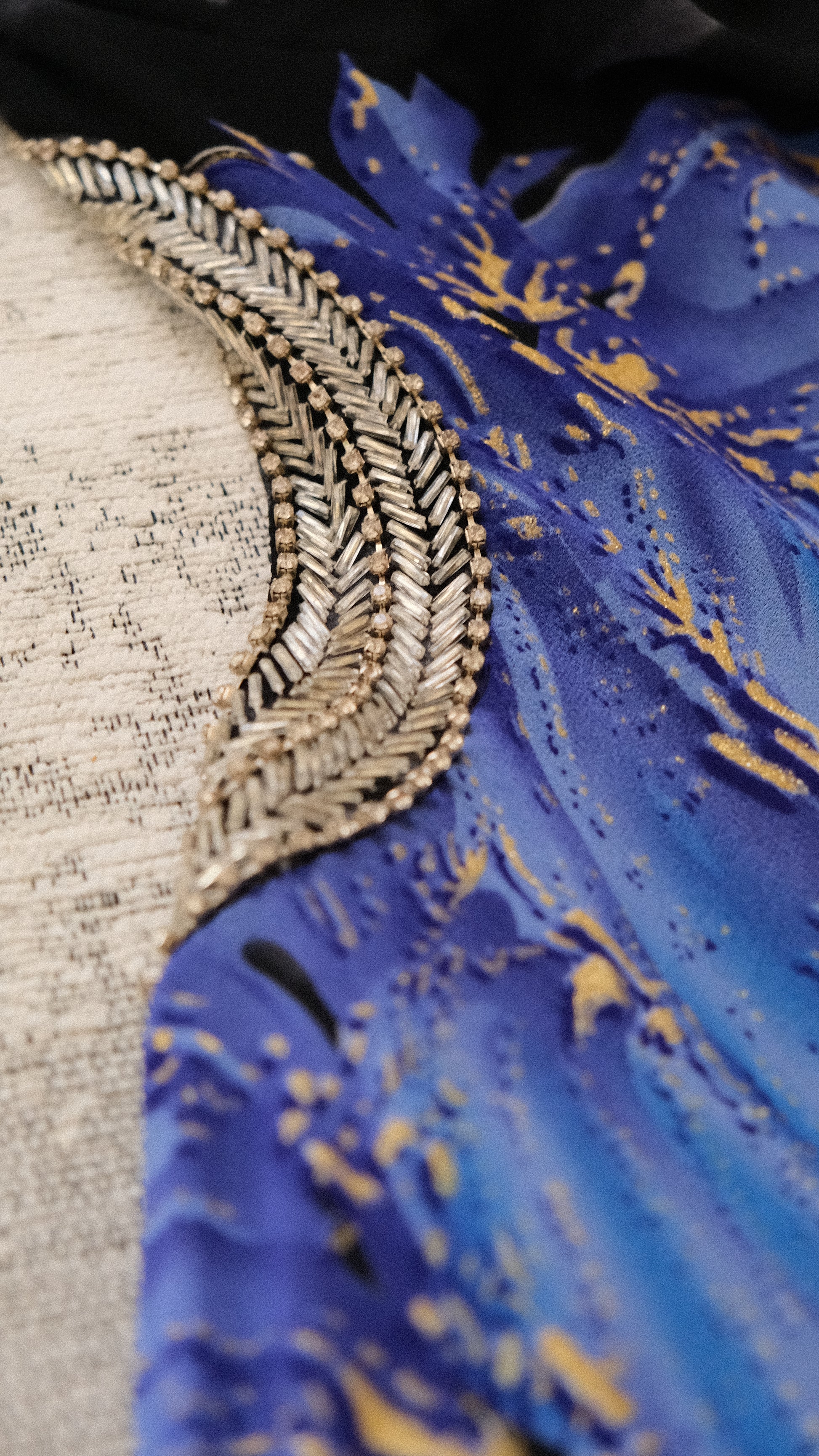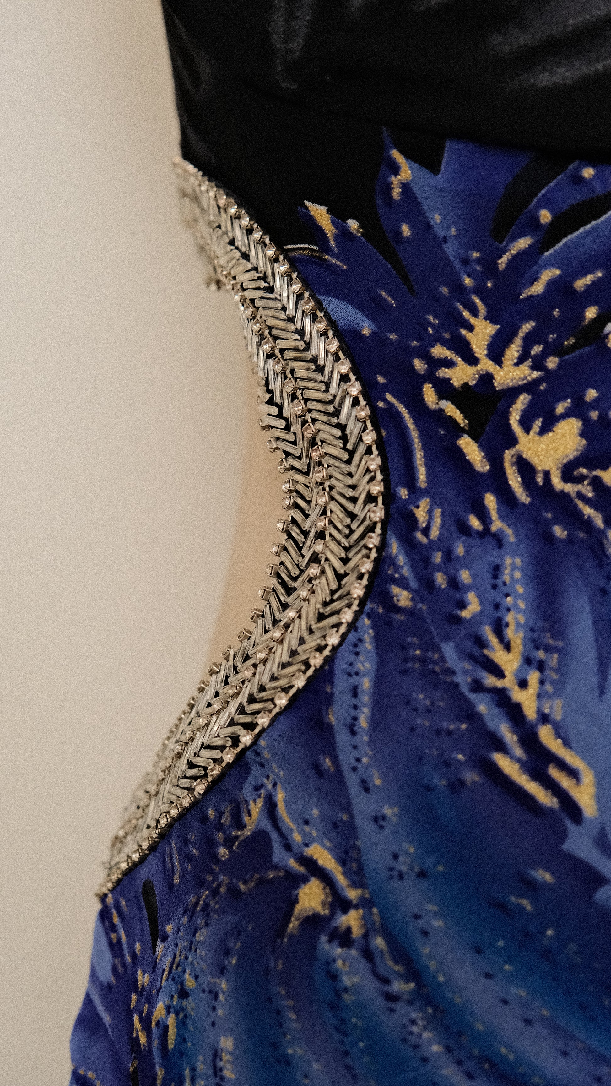 A dress that meets the dark tides and celestial wonders, flowing like starlit waves. The dress has an open back detail for a romantic look.