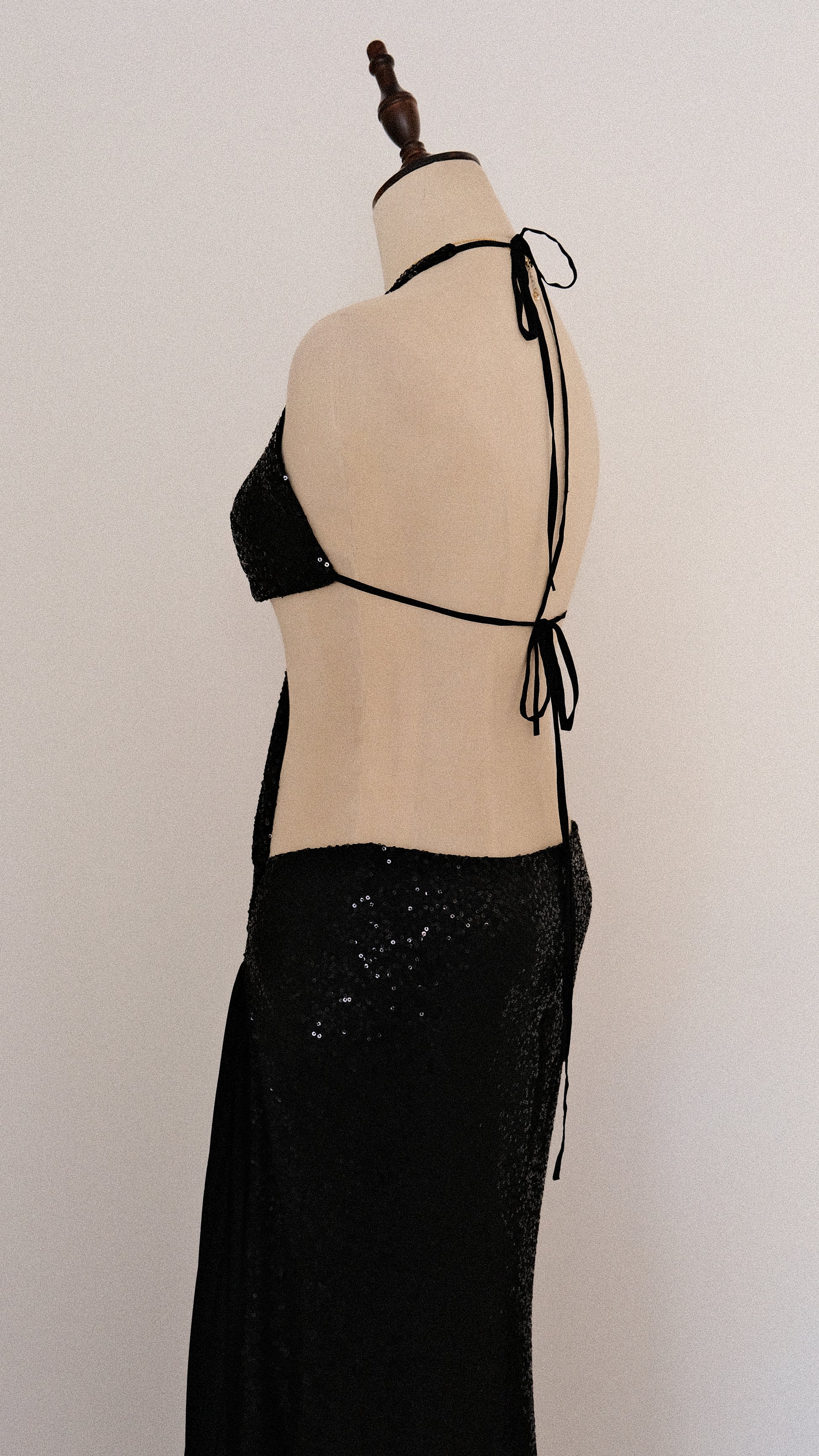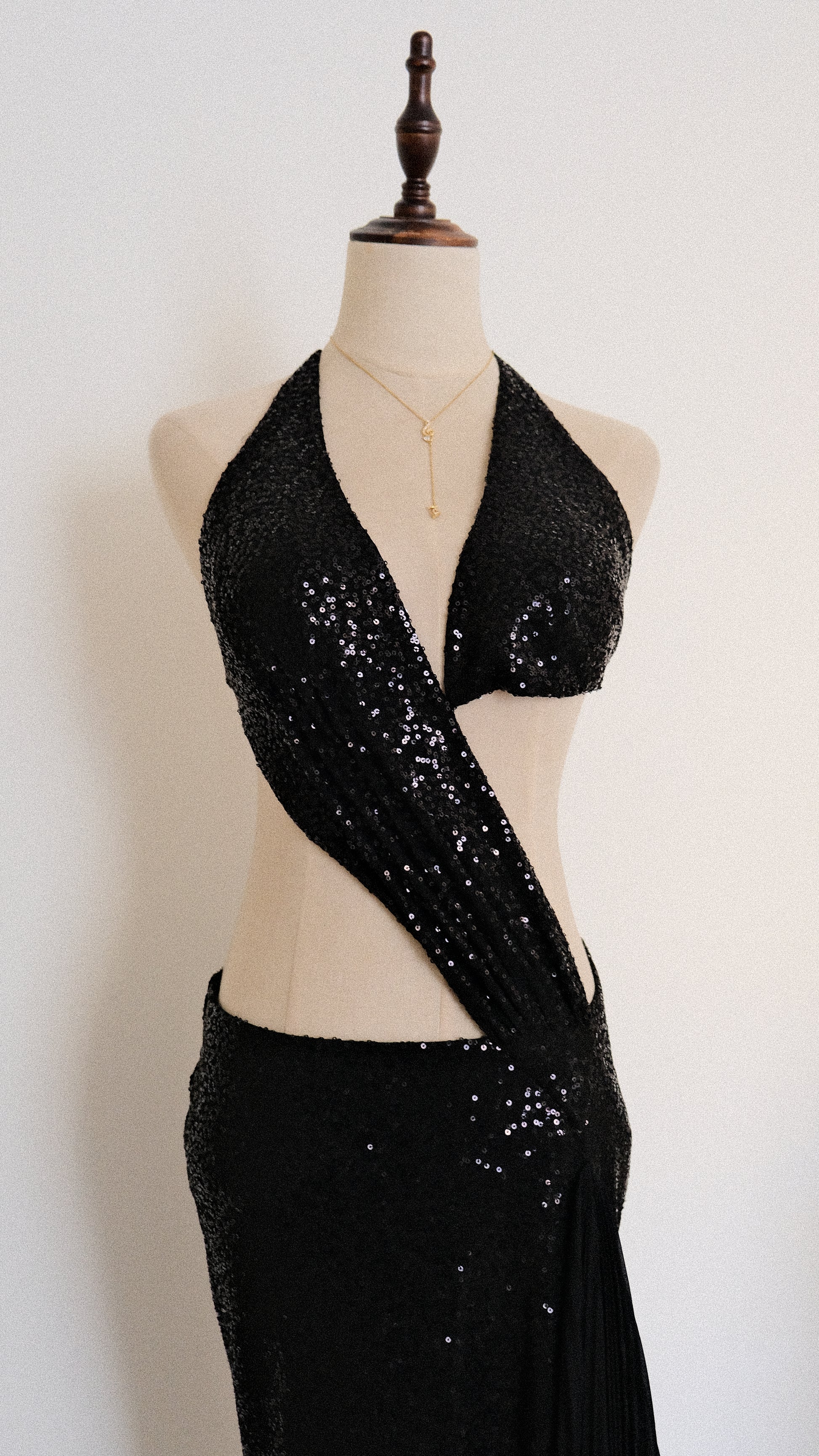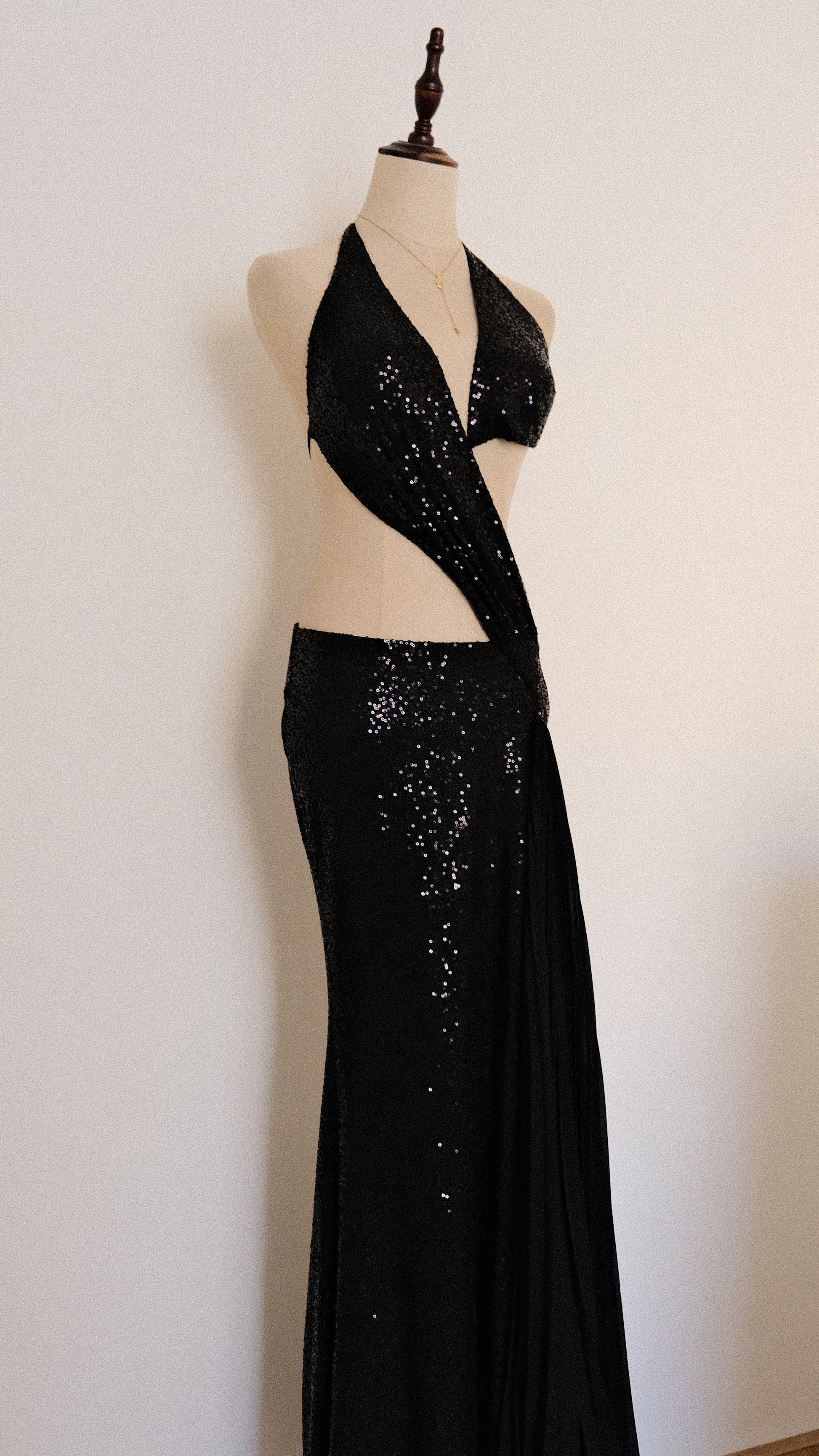 Wear the night itself. A dress with irrisistible cutout and fluttering details.