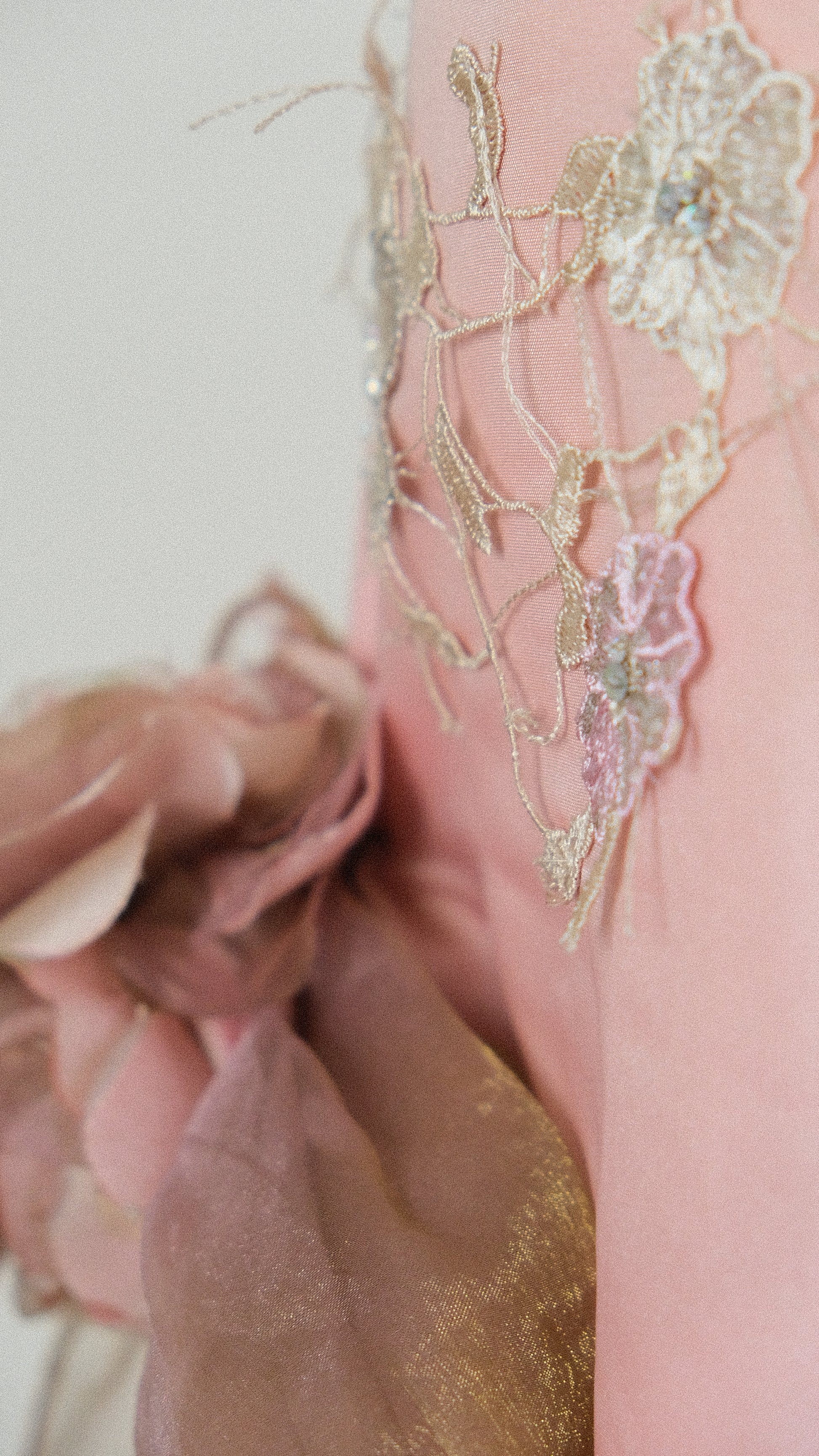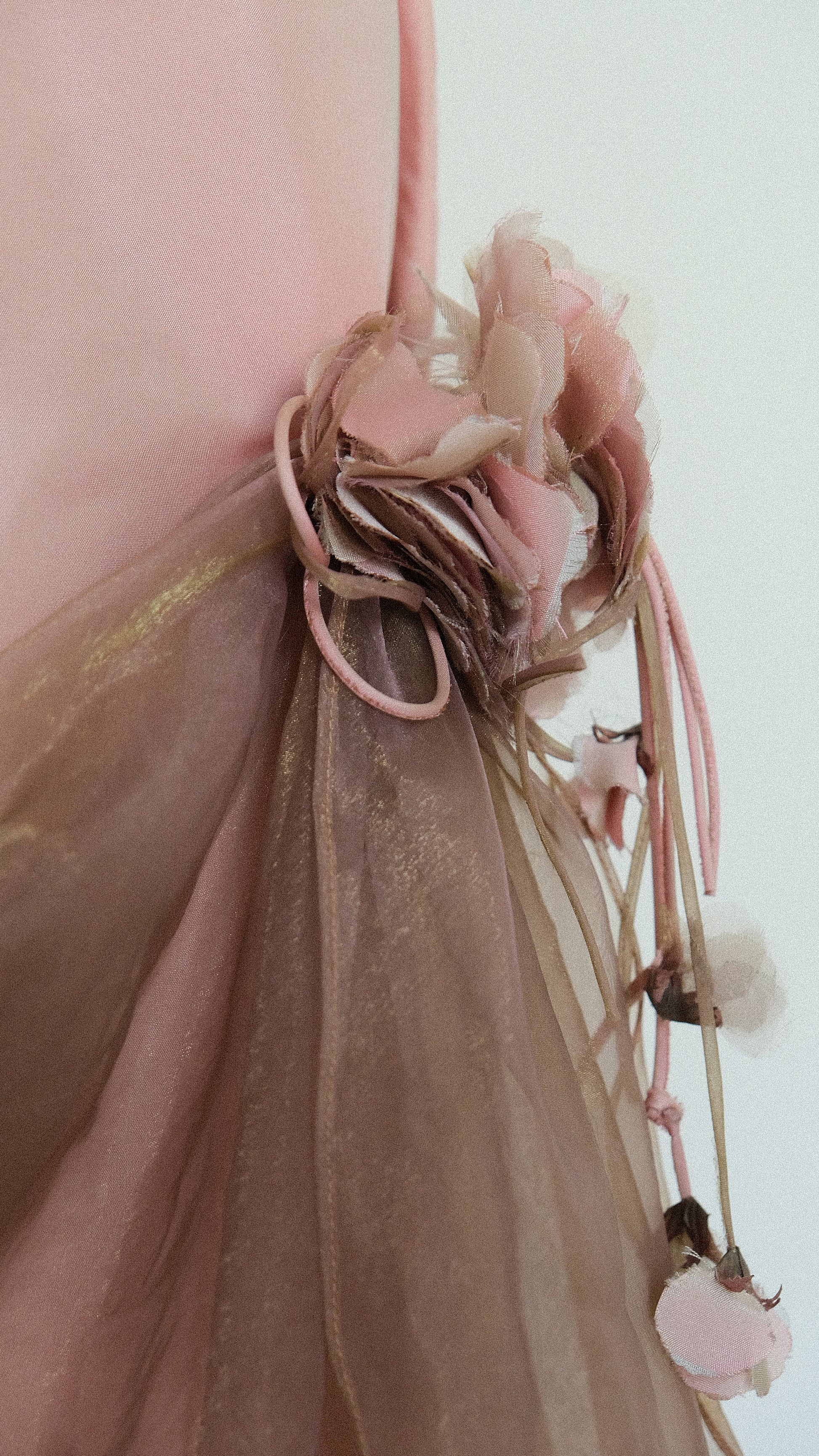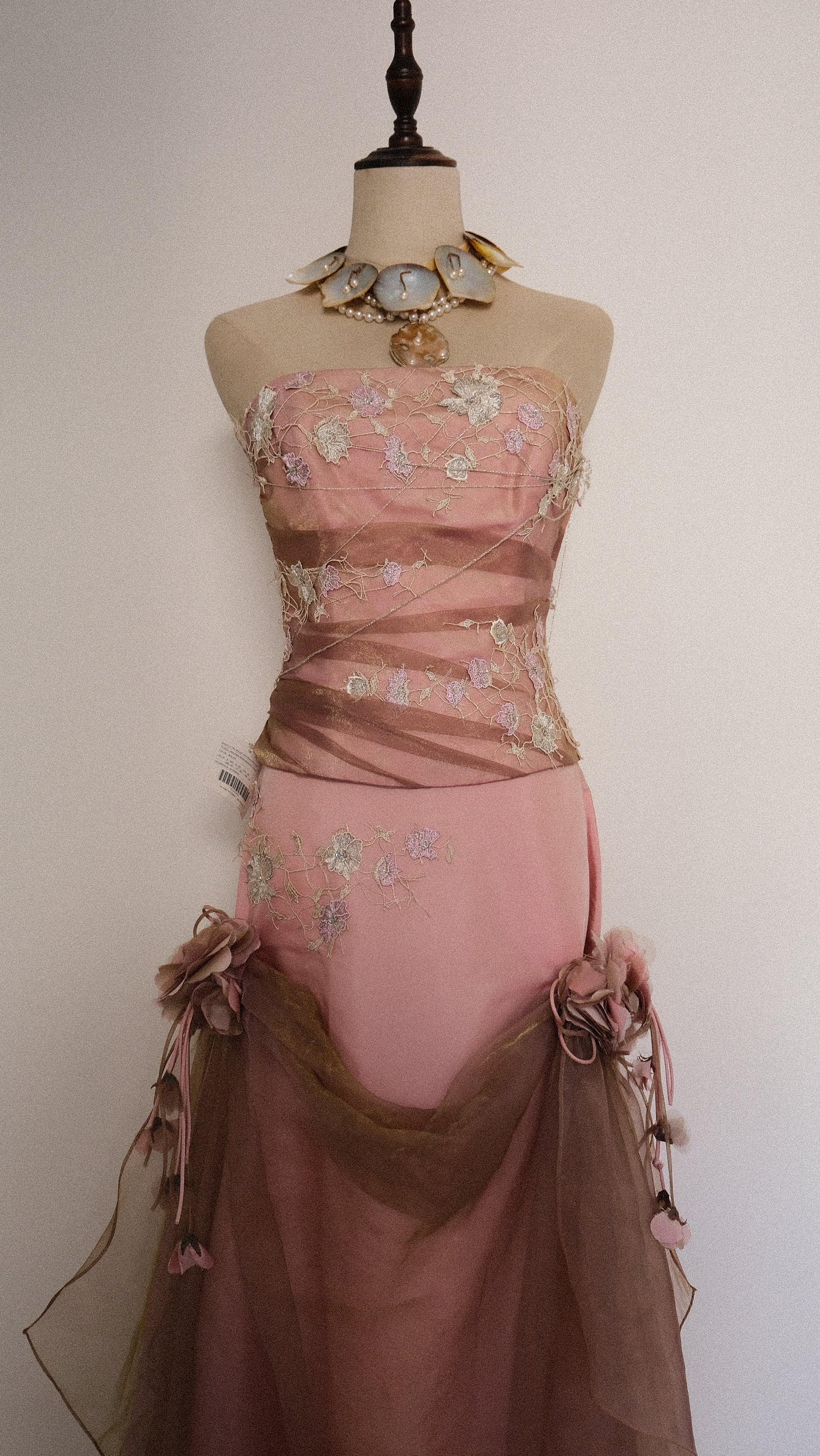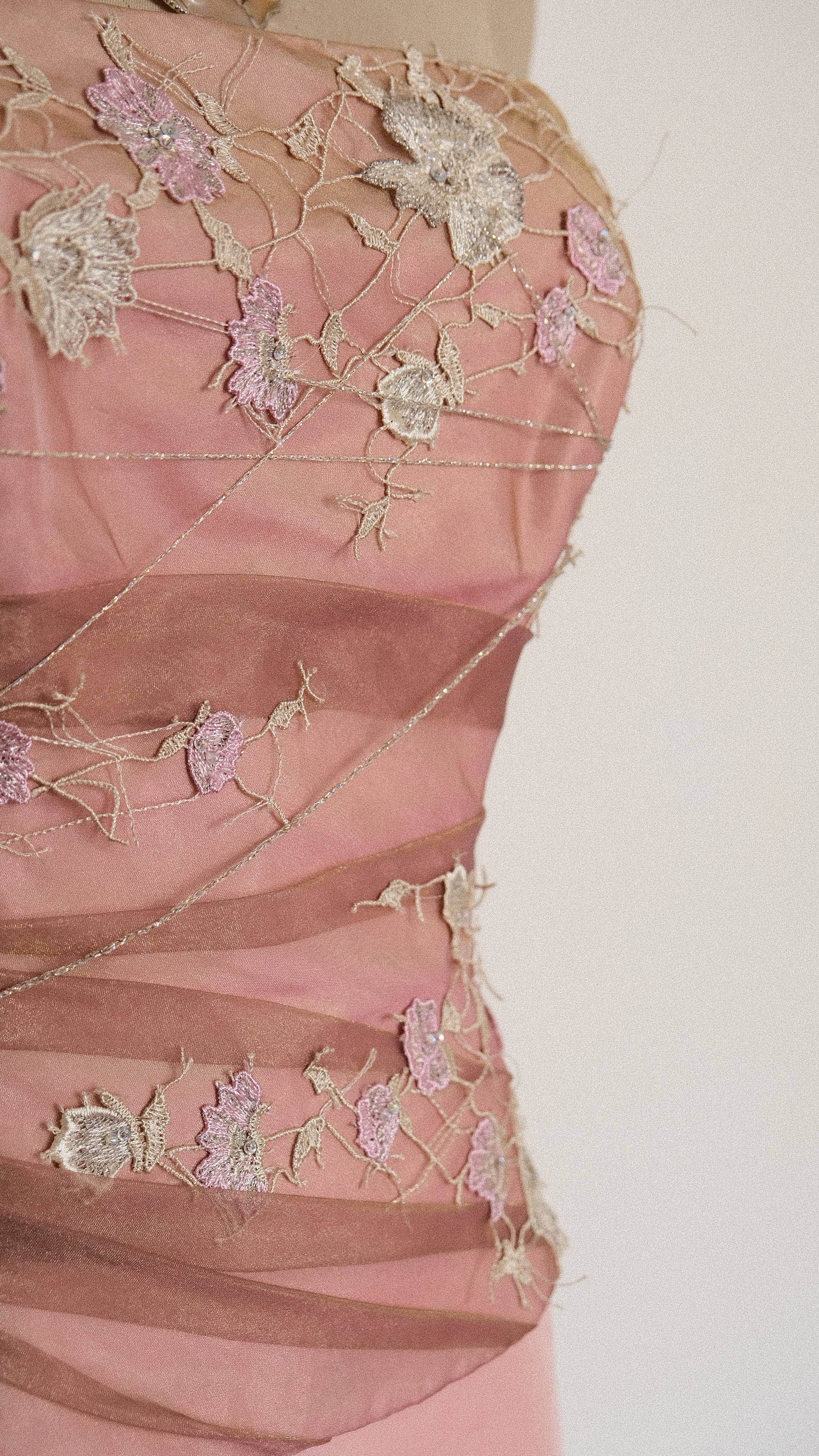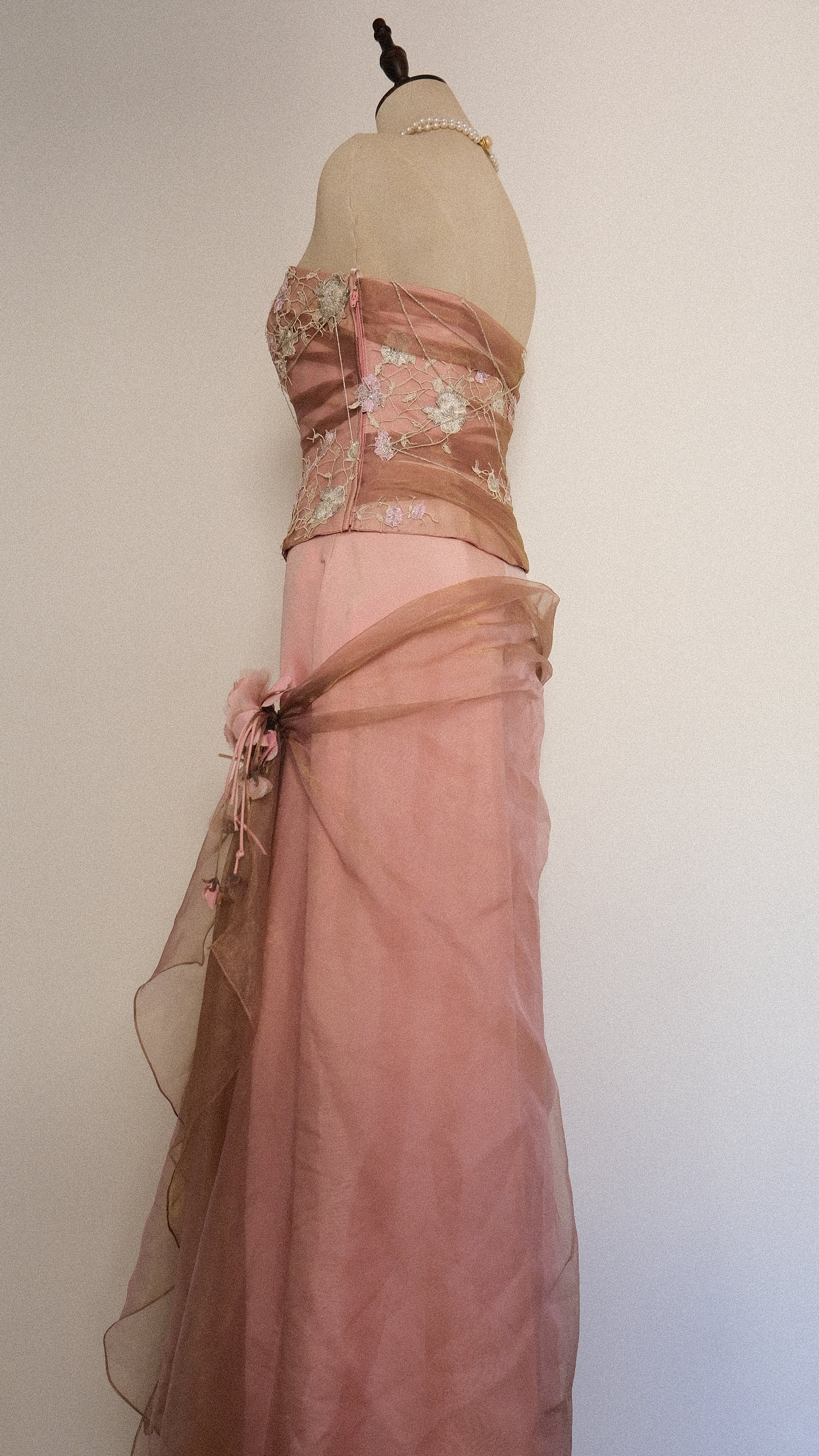 A 2 piece evening gown draped with mesh details and magical florals.