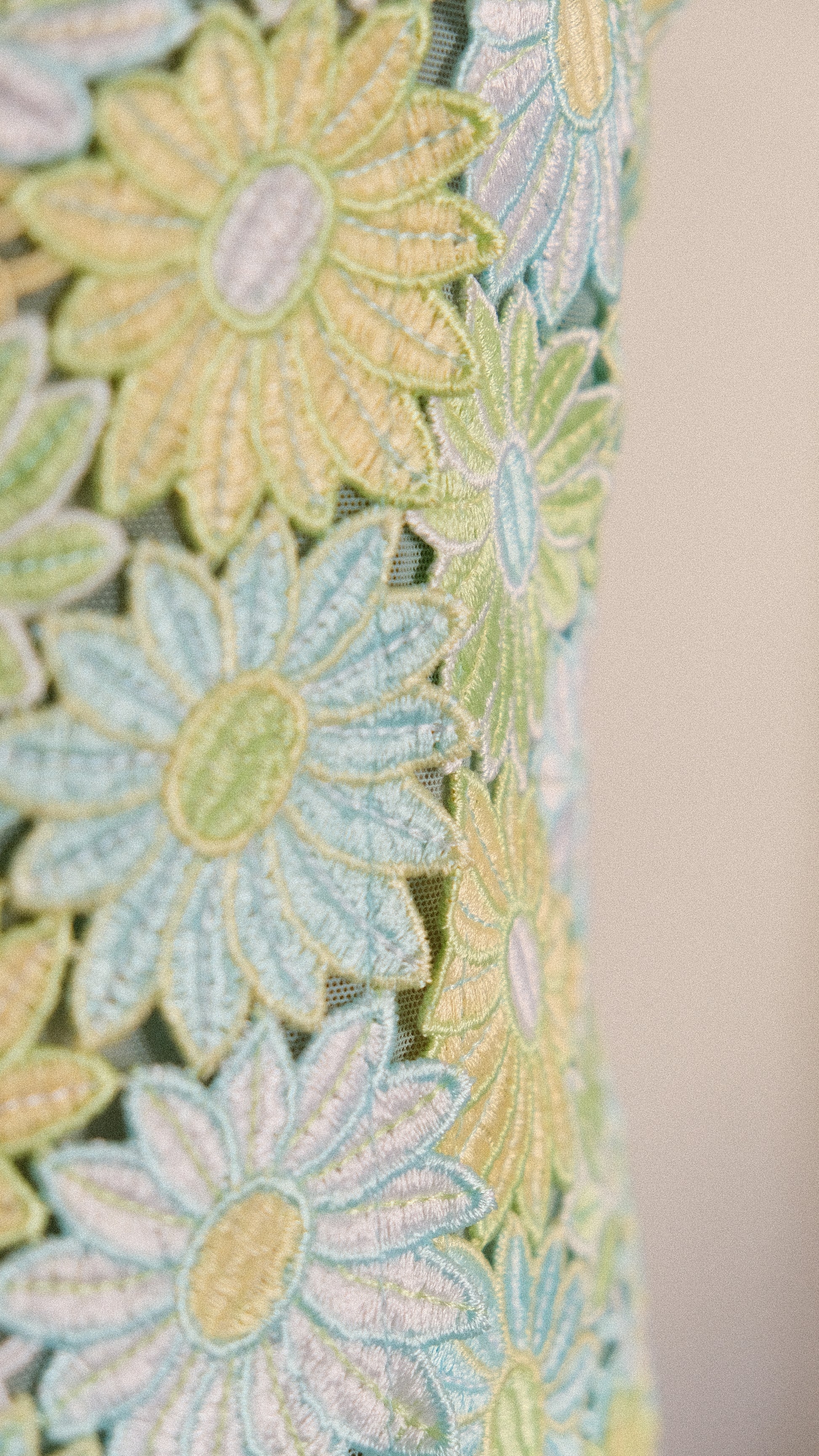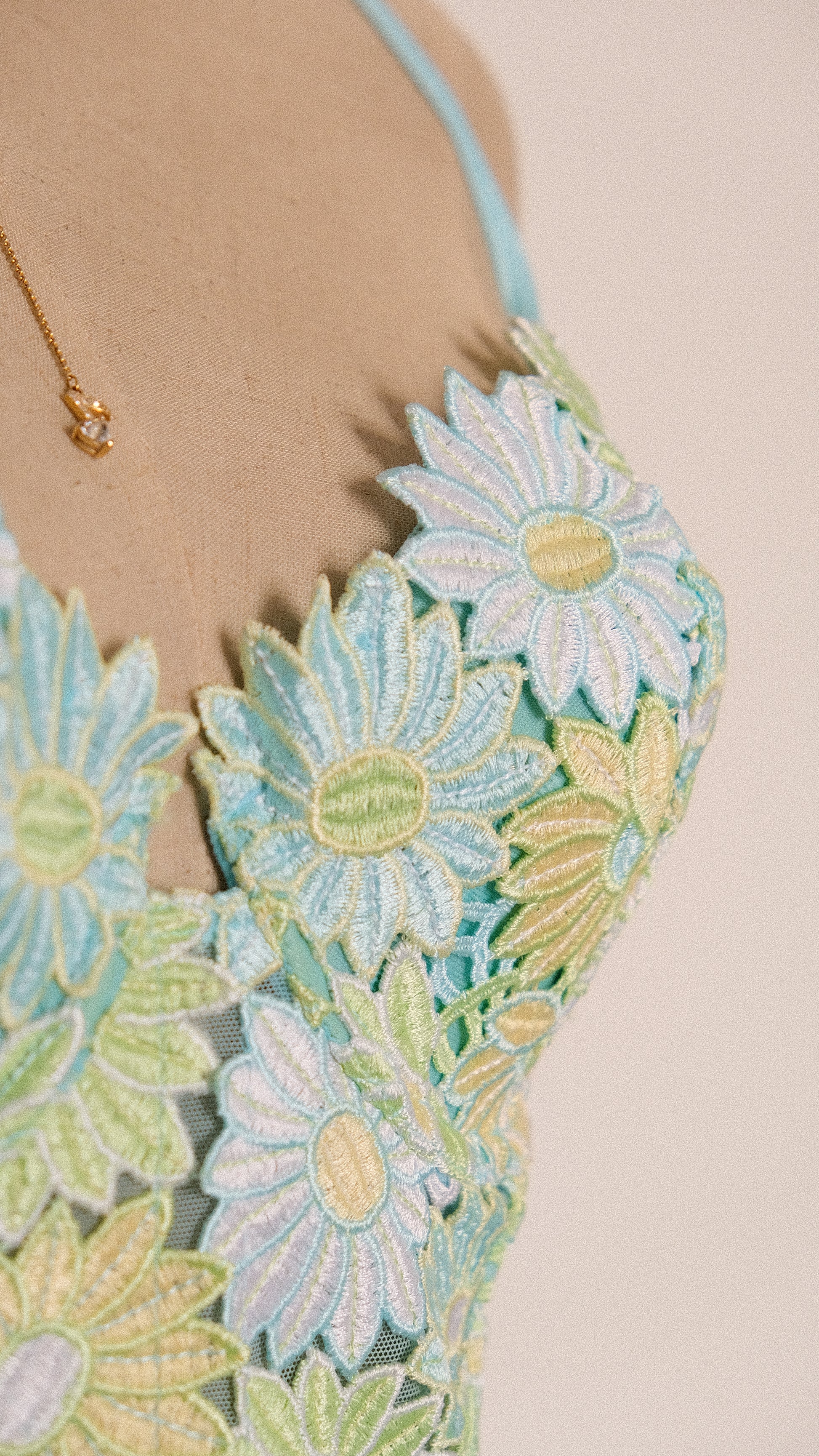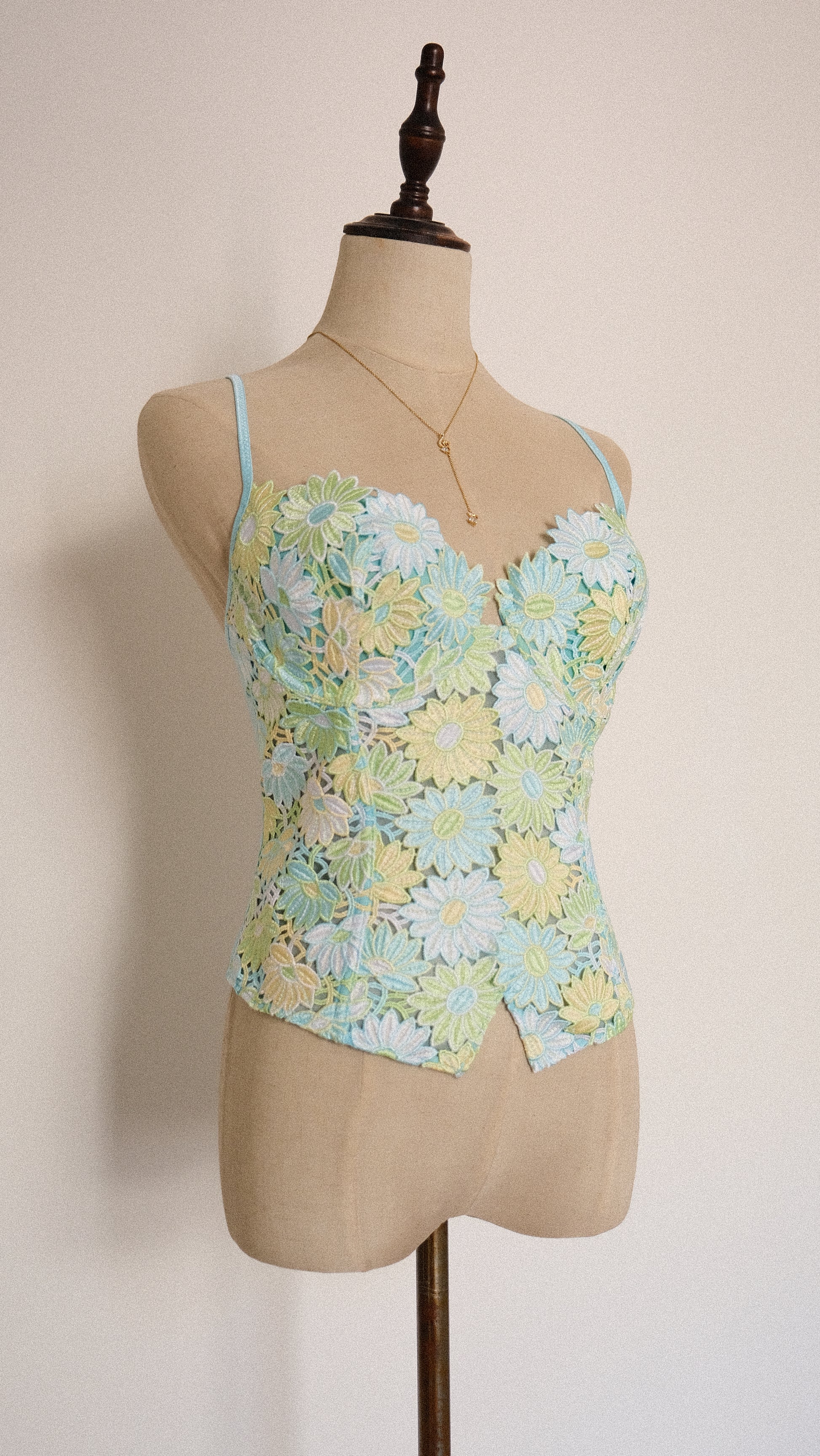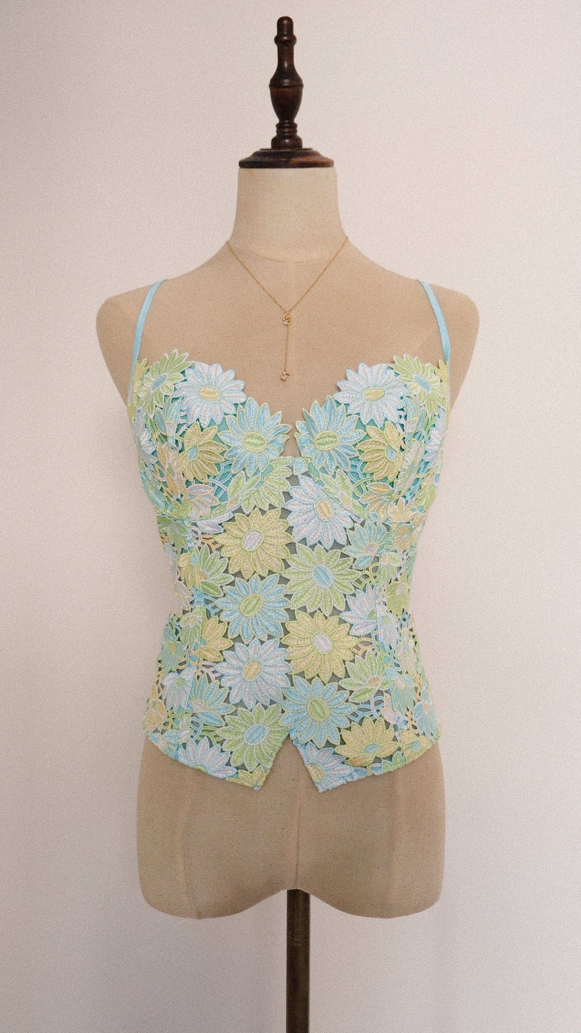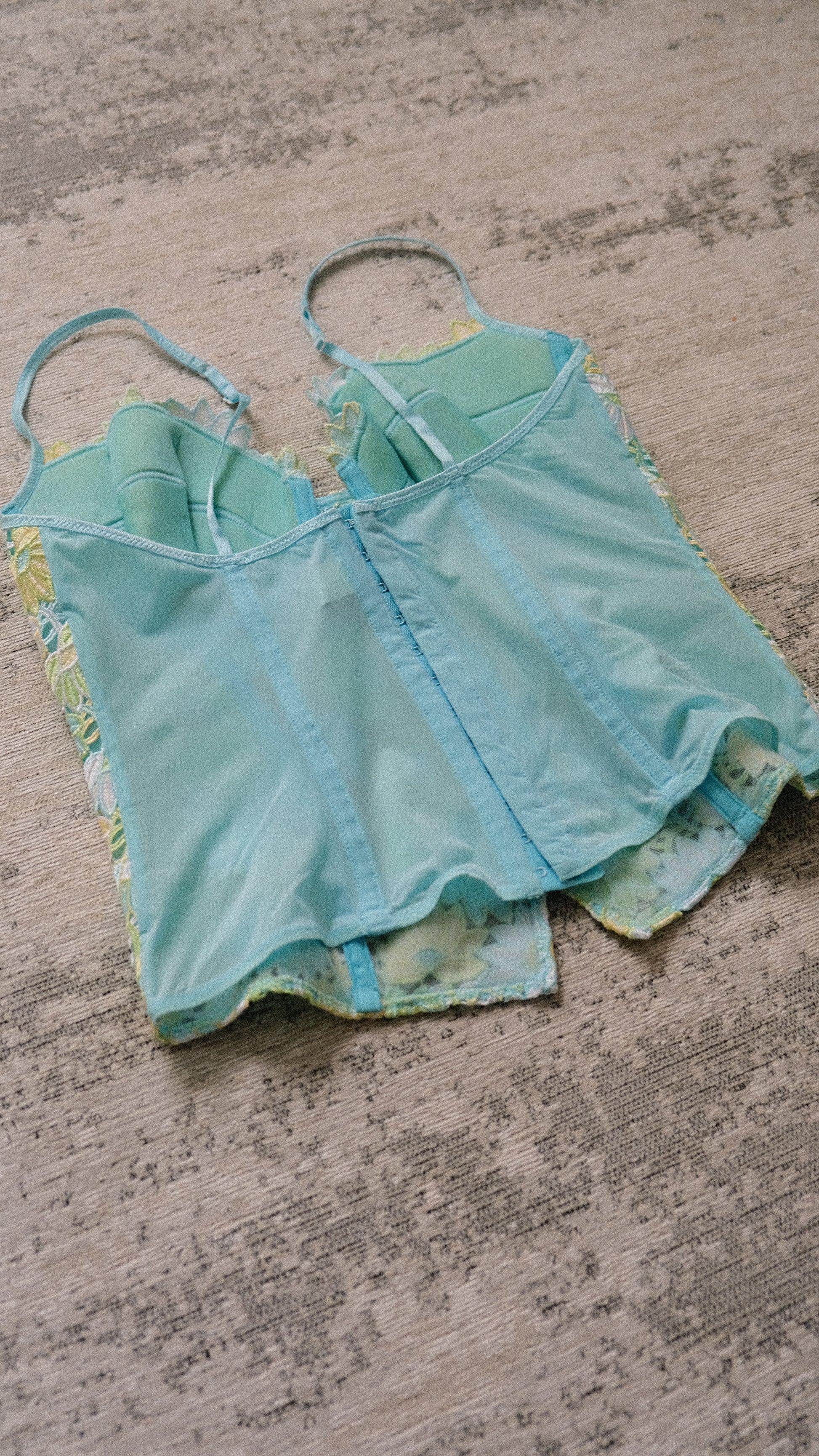 A rare floral corset top in an oceanic color palette from a French discontinued brand.