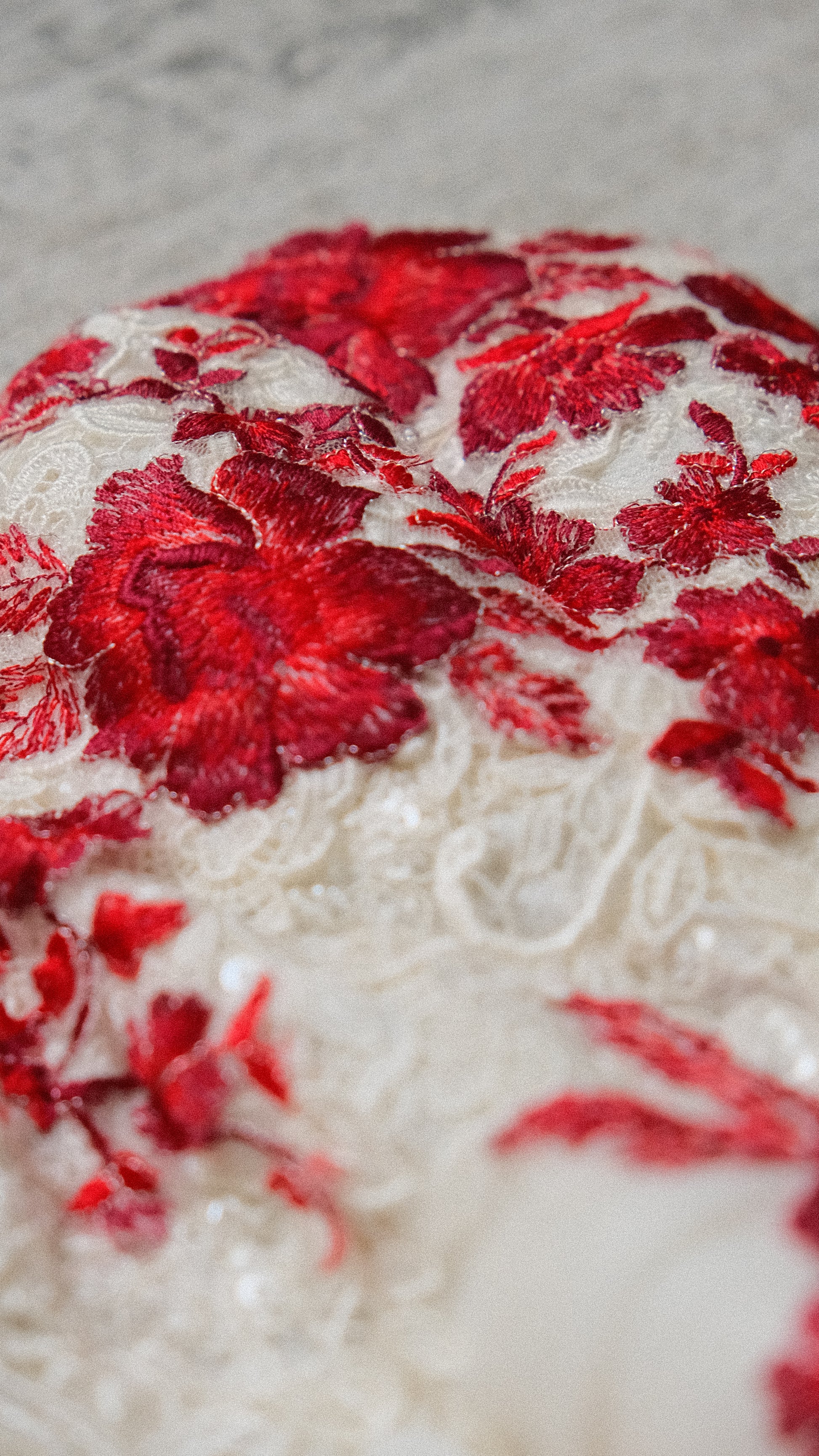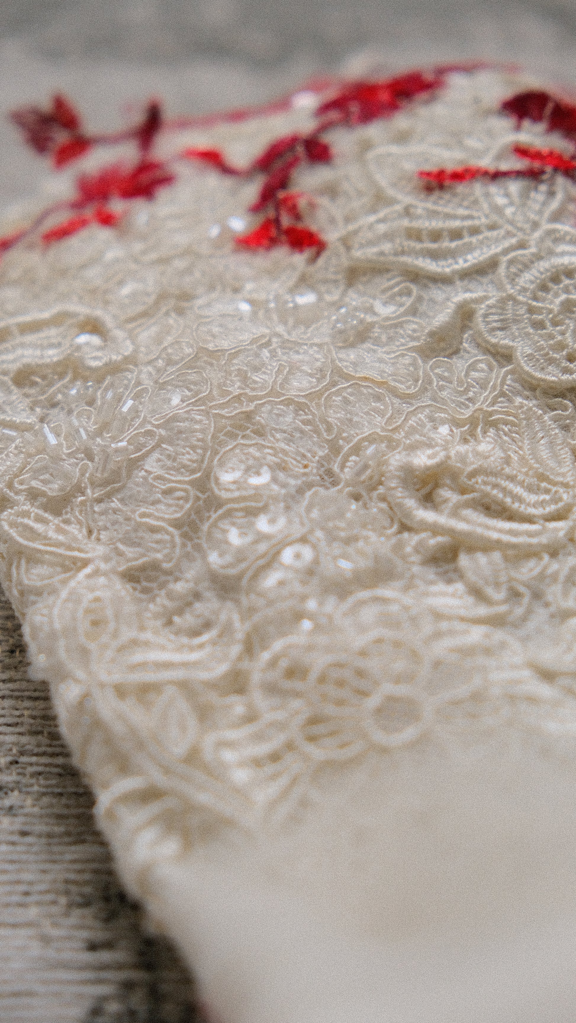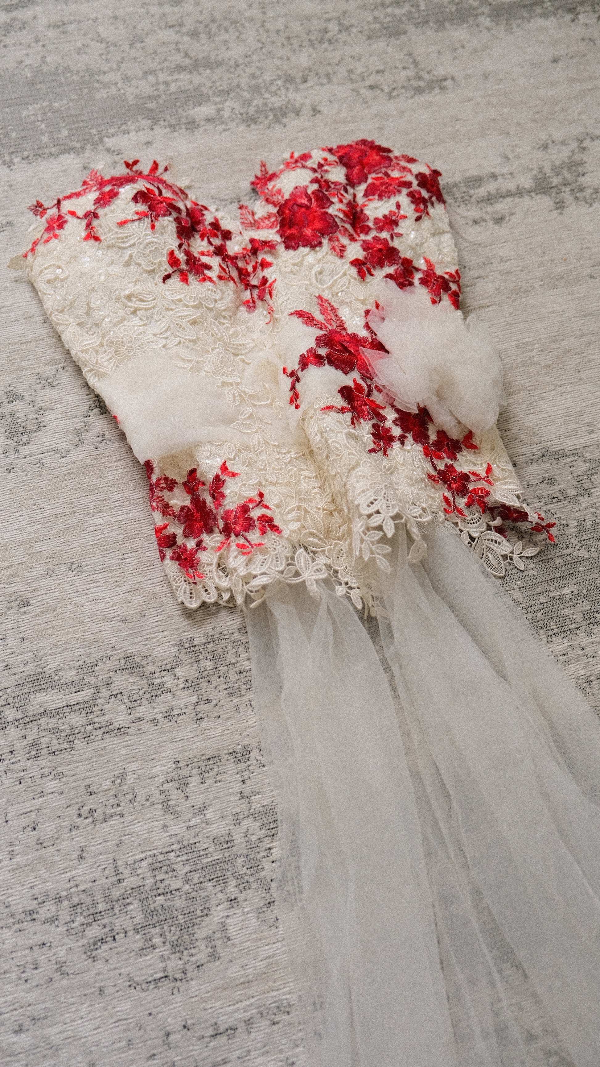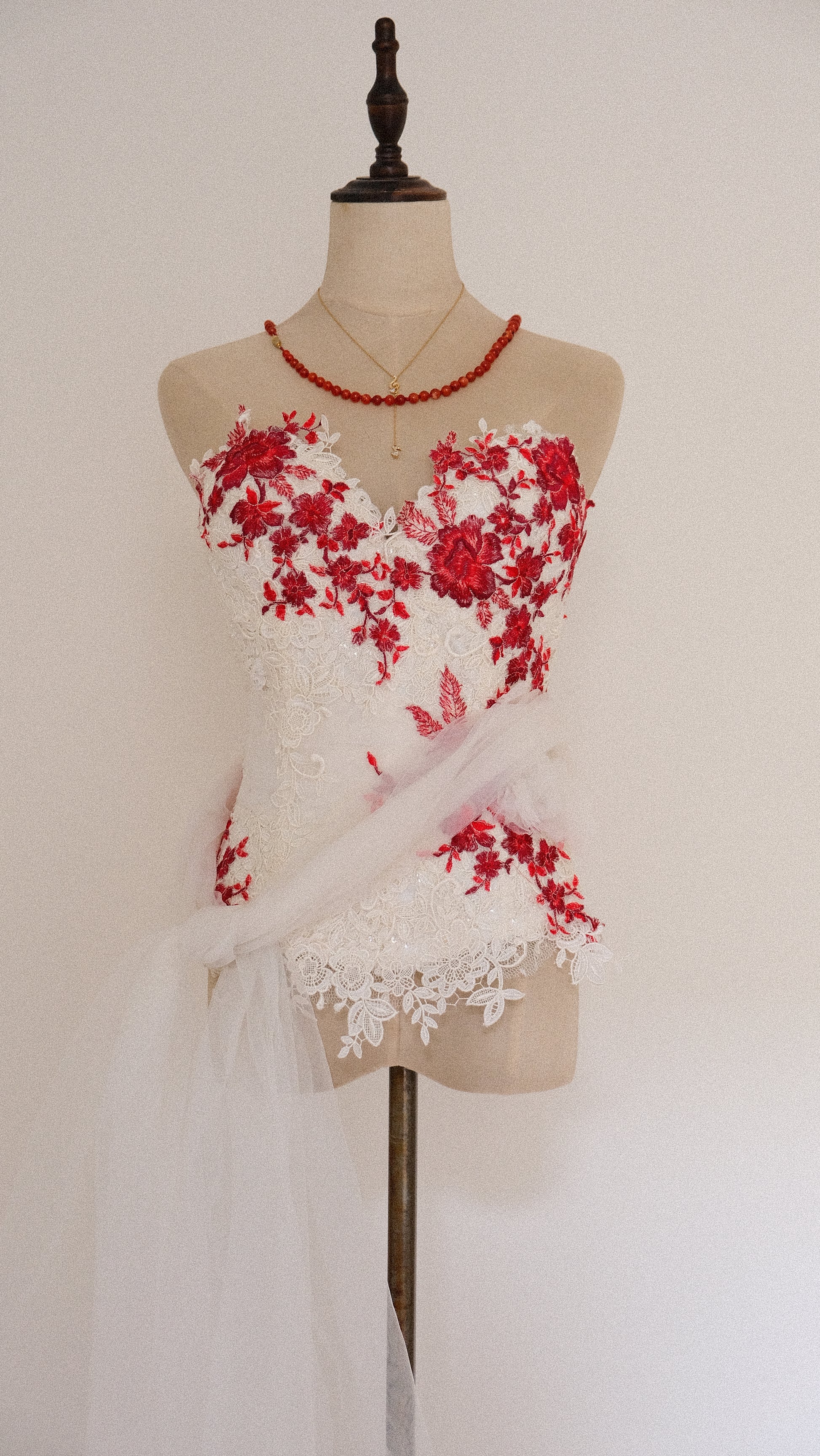 A vintage one of one bridal top with red romantic floral detailing and two sheer straps that can be tied into a romantic bow.