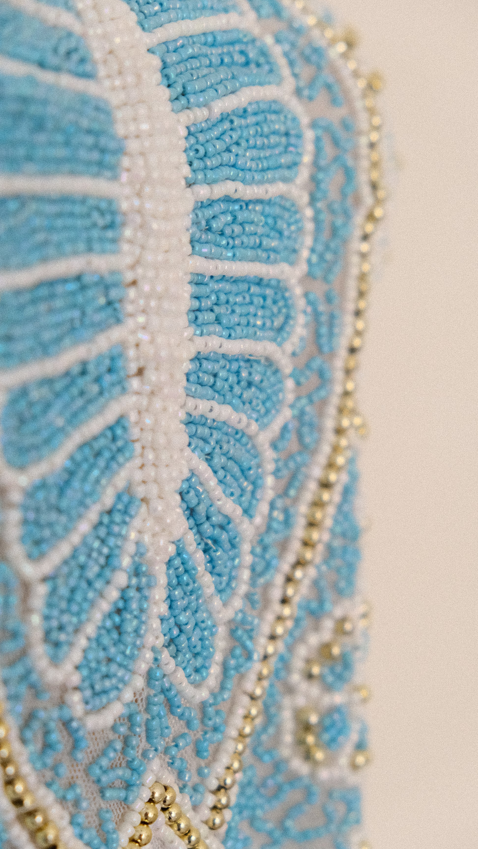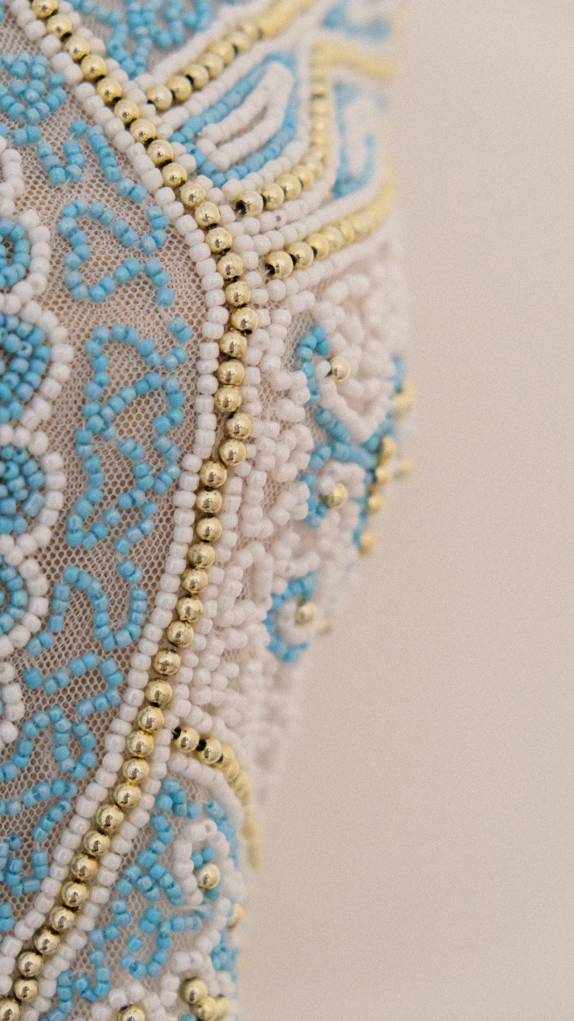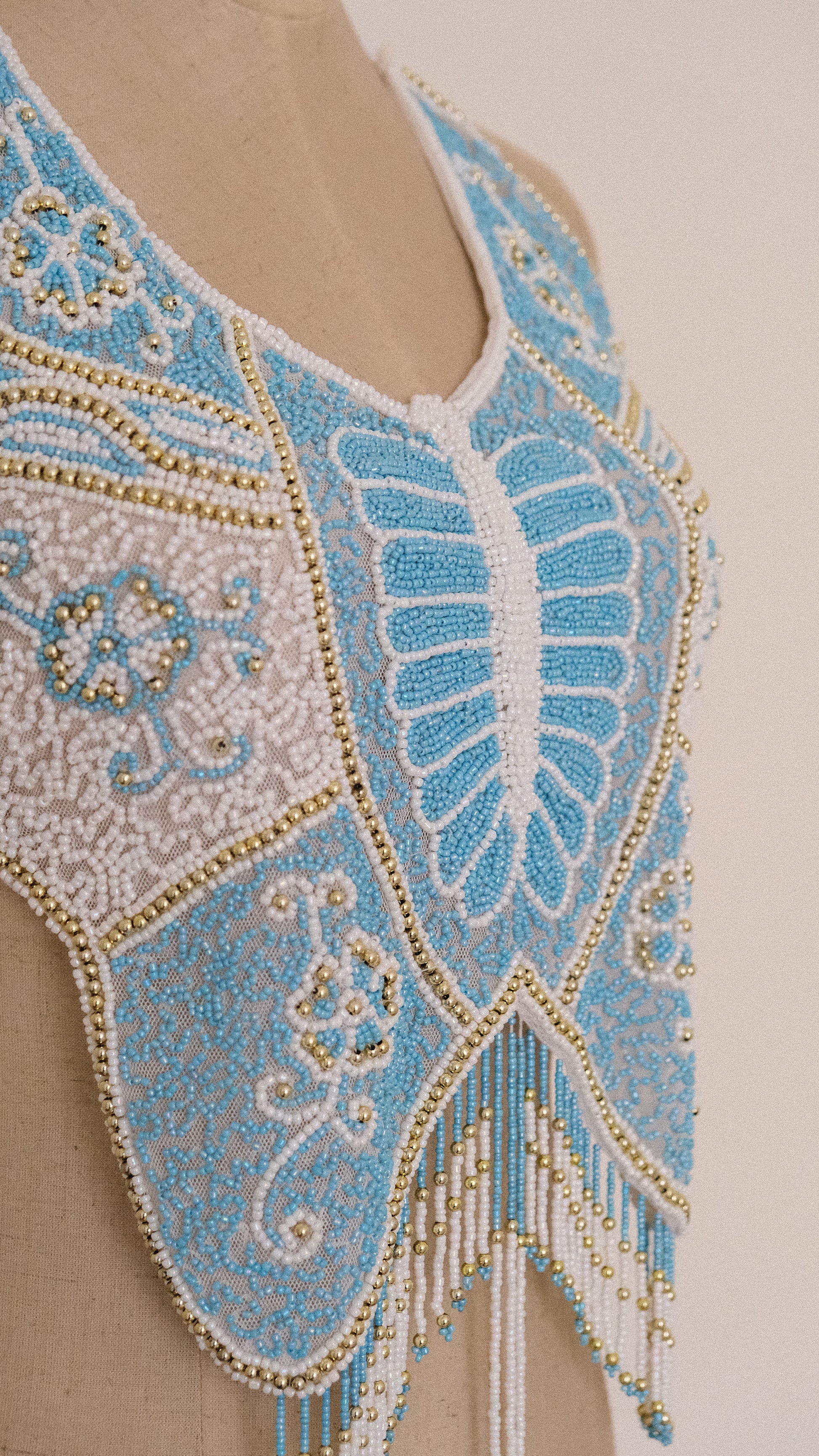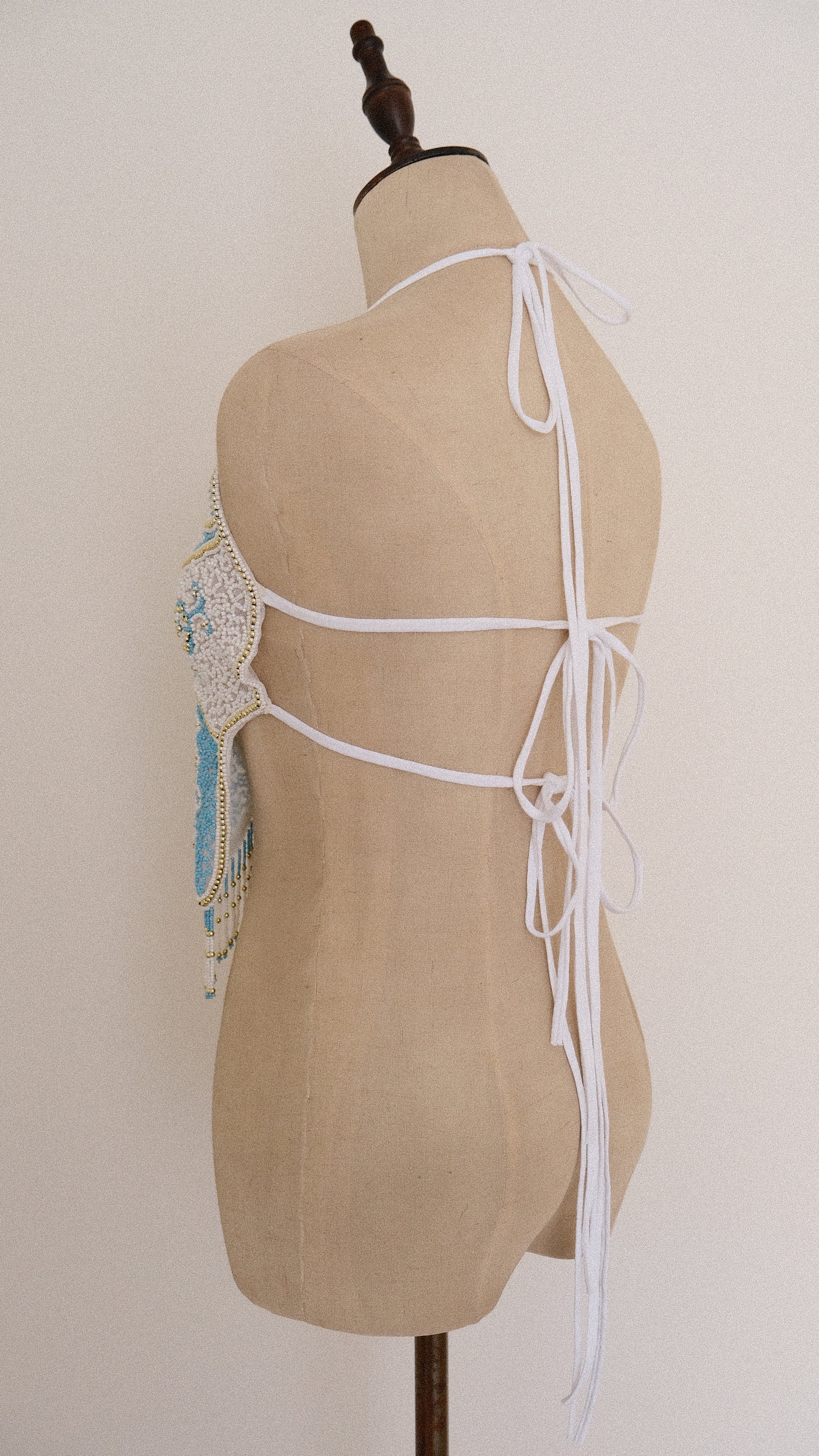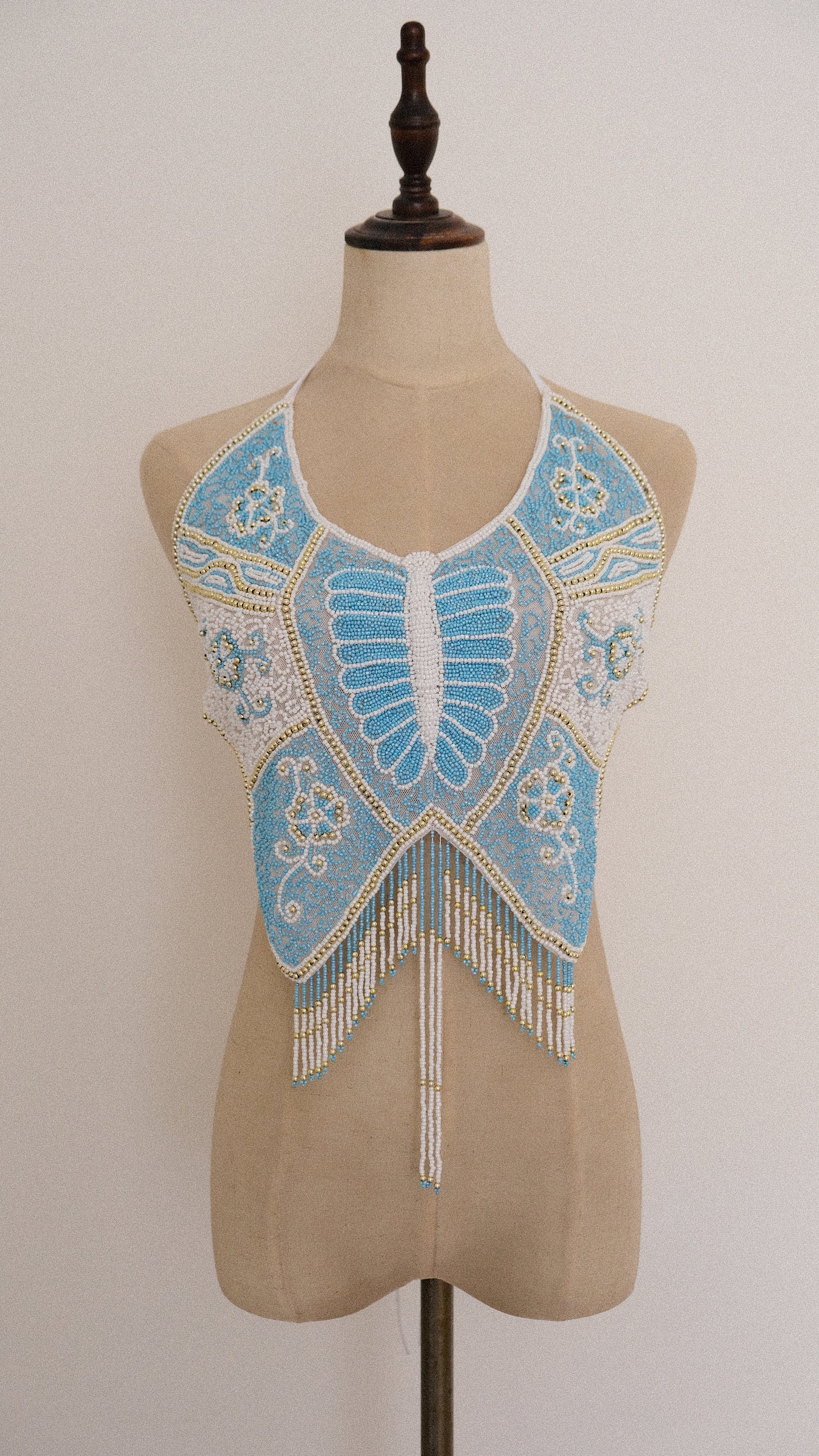 A vintage butterfly halter top with open back detailing in a white and light blue color.