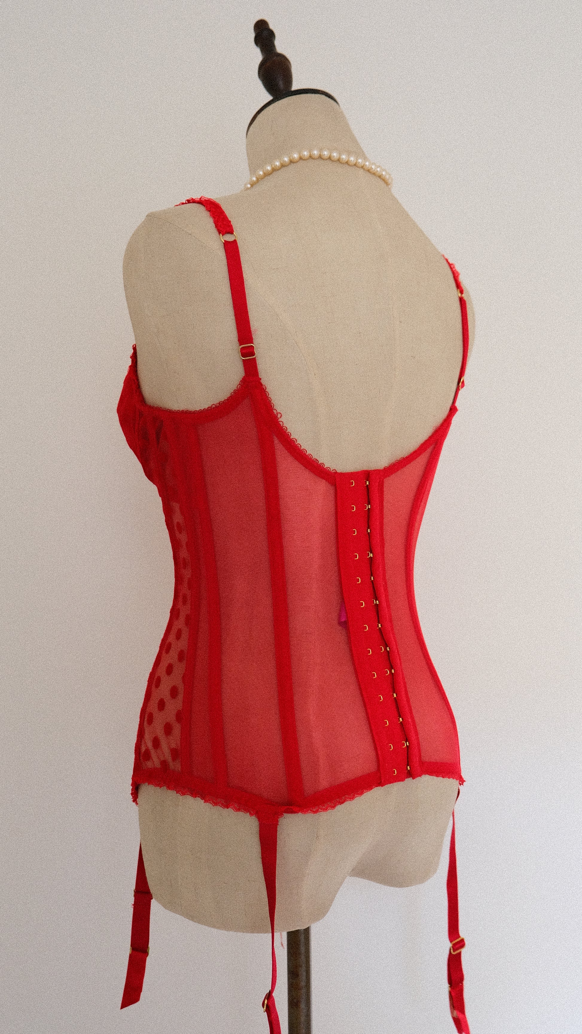 An L'Agent Provocateur red polka dot corset with little ruffled lace details.