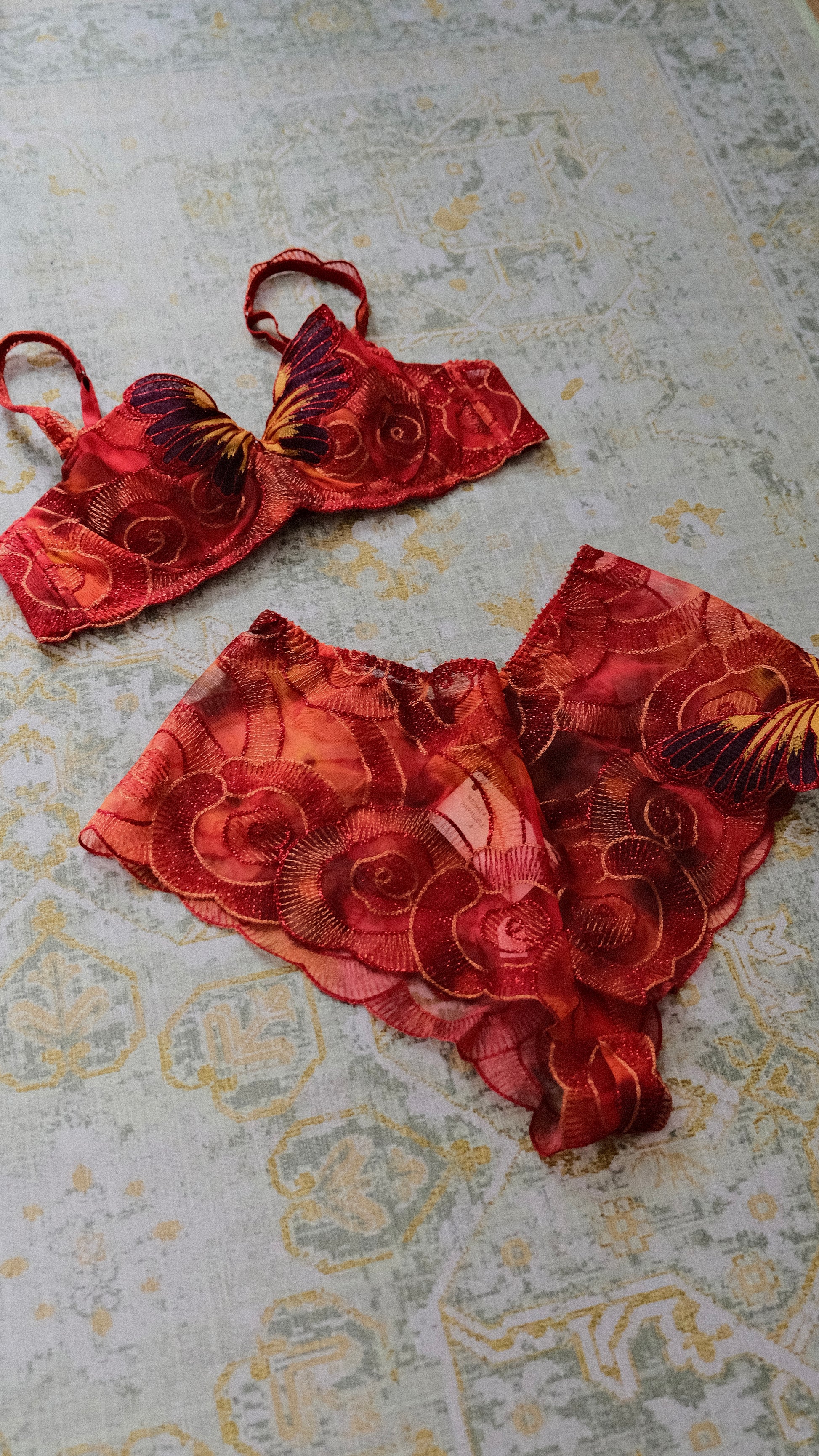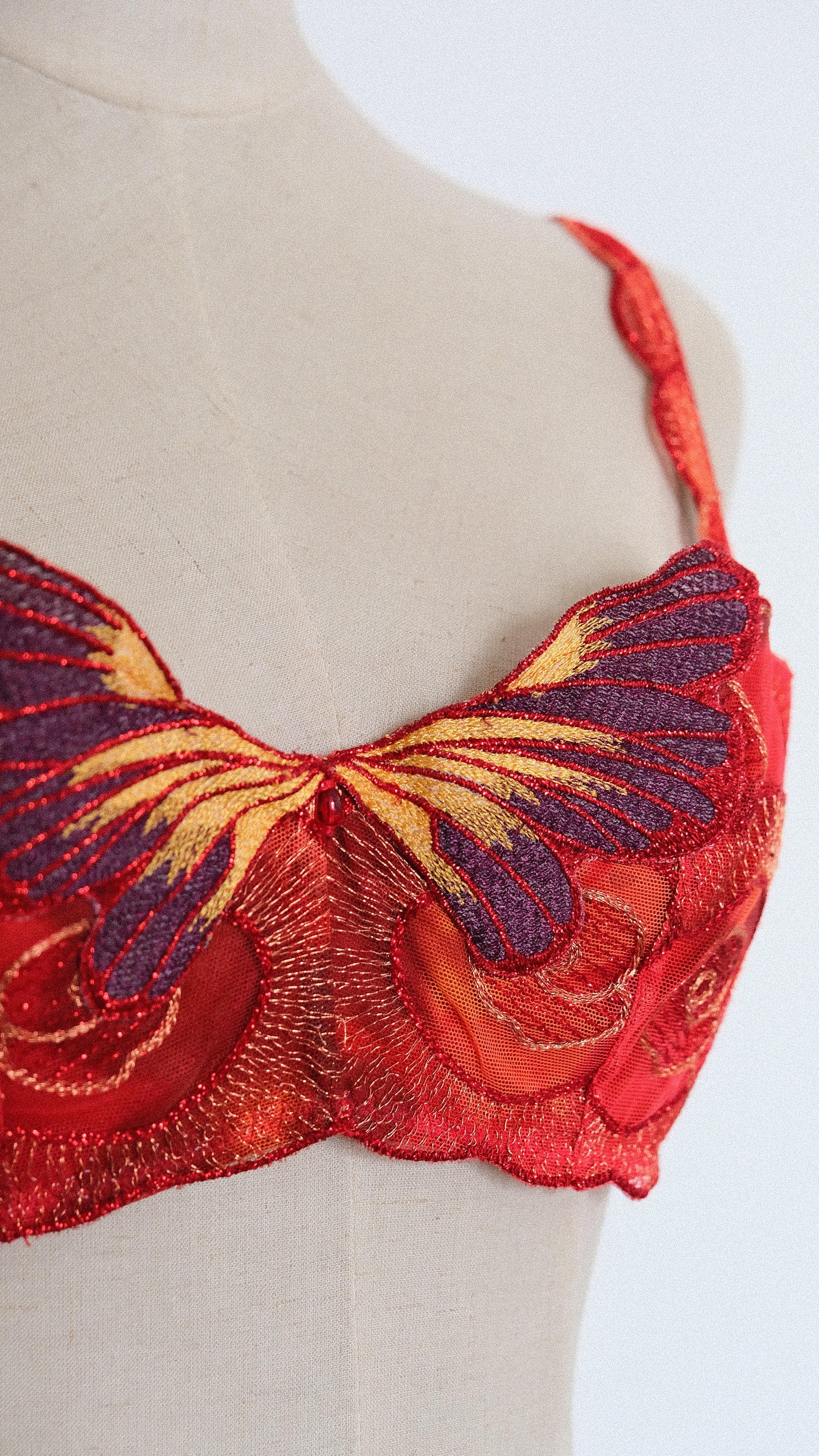 Made to make hearts flutter! One of the most sought after vintage French butterfly balconette in deep crimson and golden tones. It caries the story of transformation and the magic of metamorphosis.