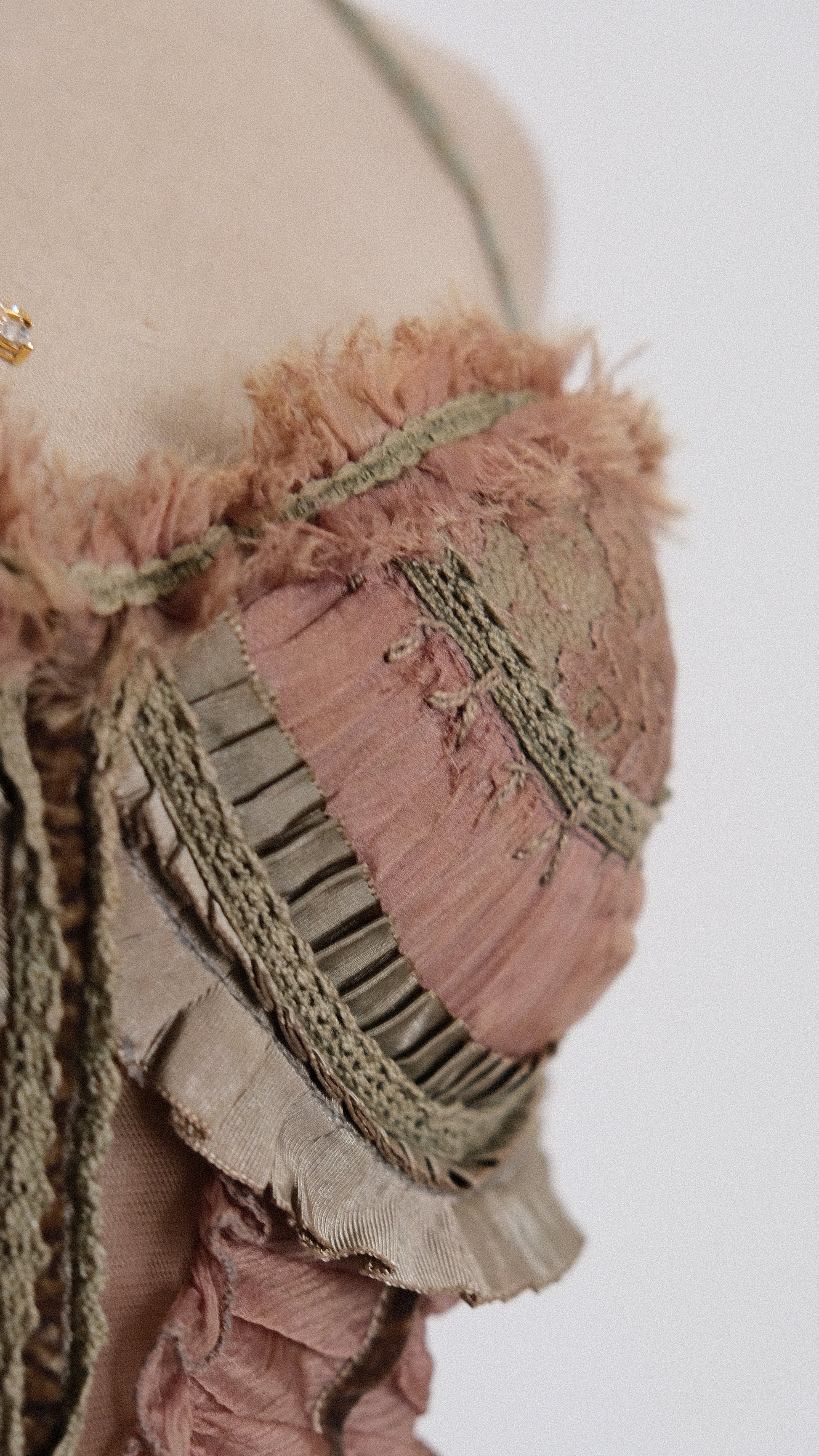 The picture does not capture the color properly. We tried every setting but it changes everytime the color to a more brown color. The top is closest to the underbust ruffled color, a kaki green color and not brown.