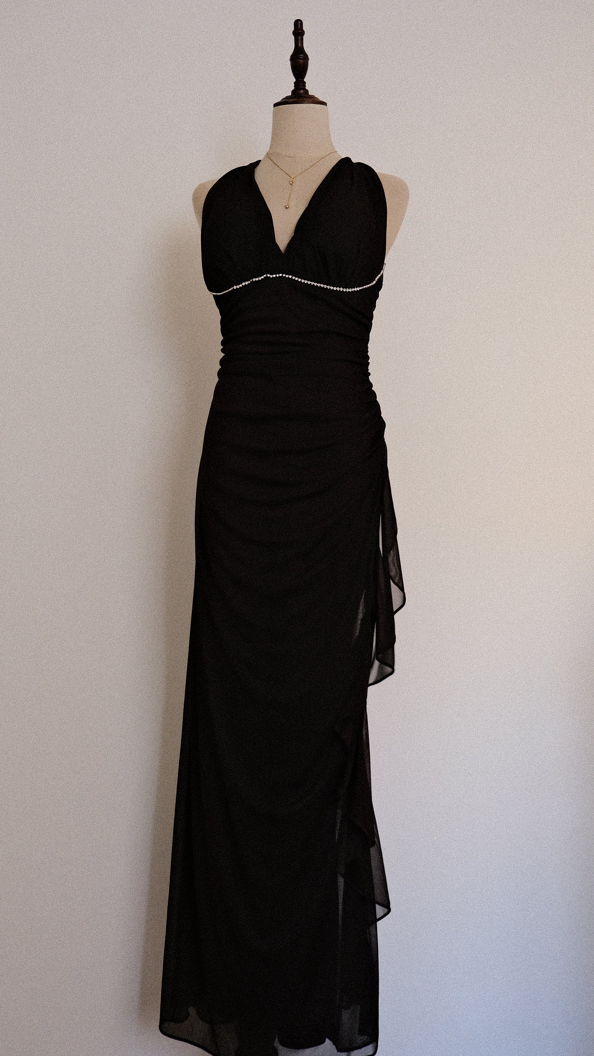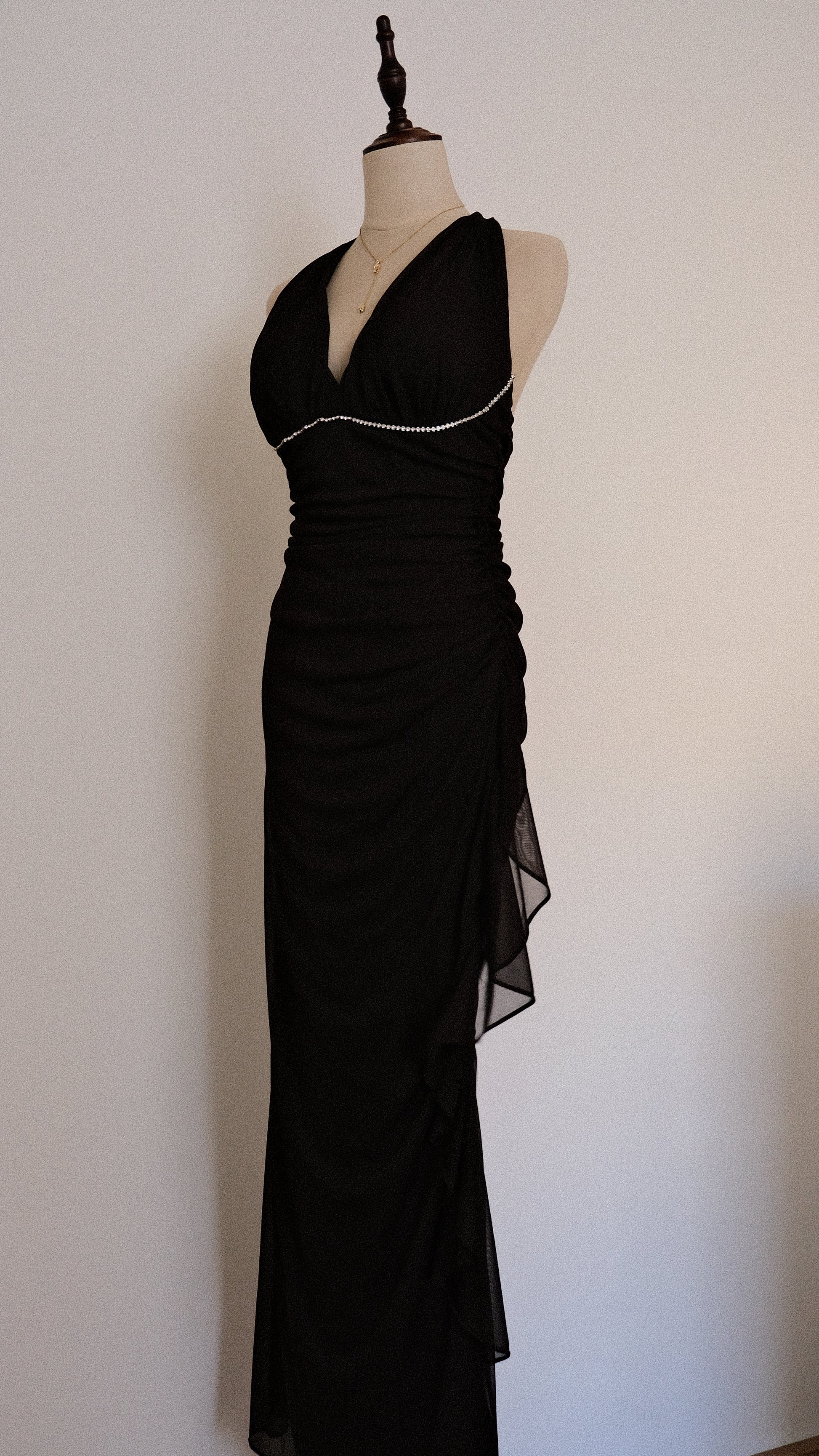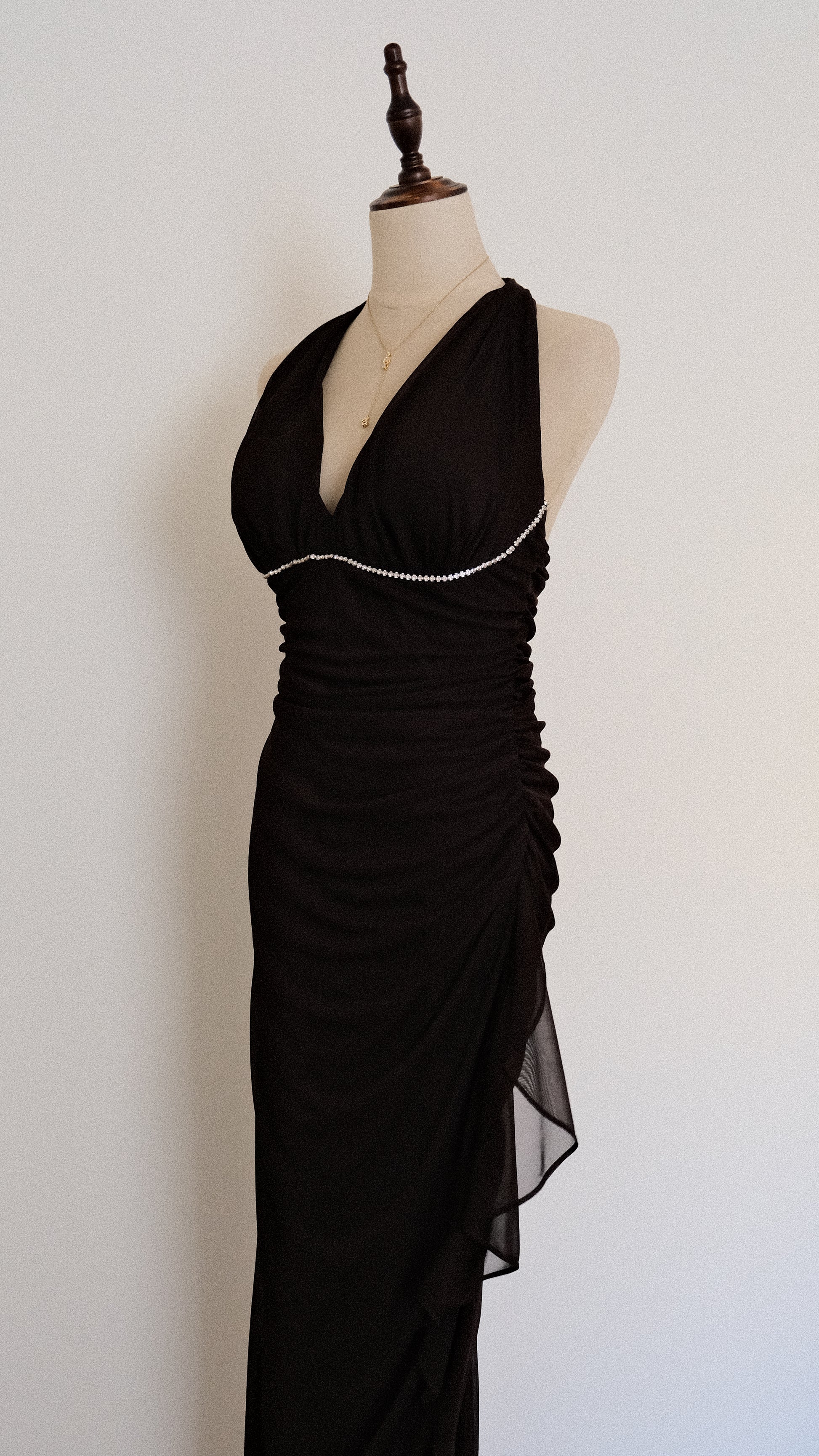 A fairygrunge romantic halter dress with draped material on the sides and a ruffled edge on one of the sides of the dress. The dress has adorable rhinestone details around the cups.