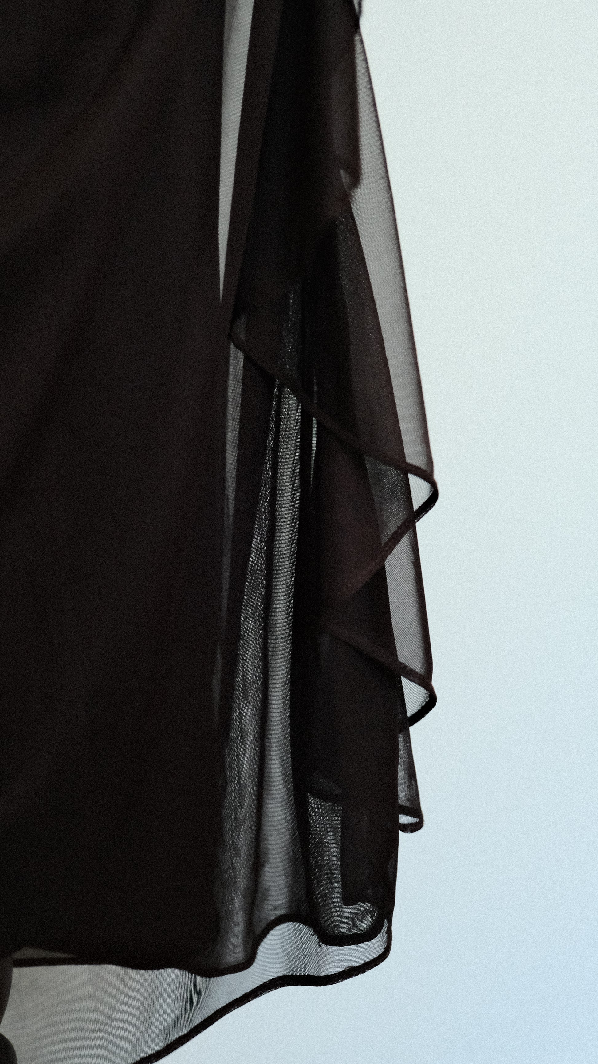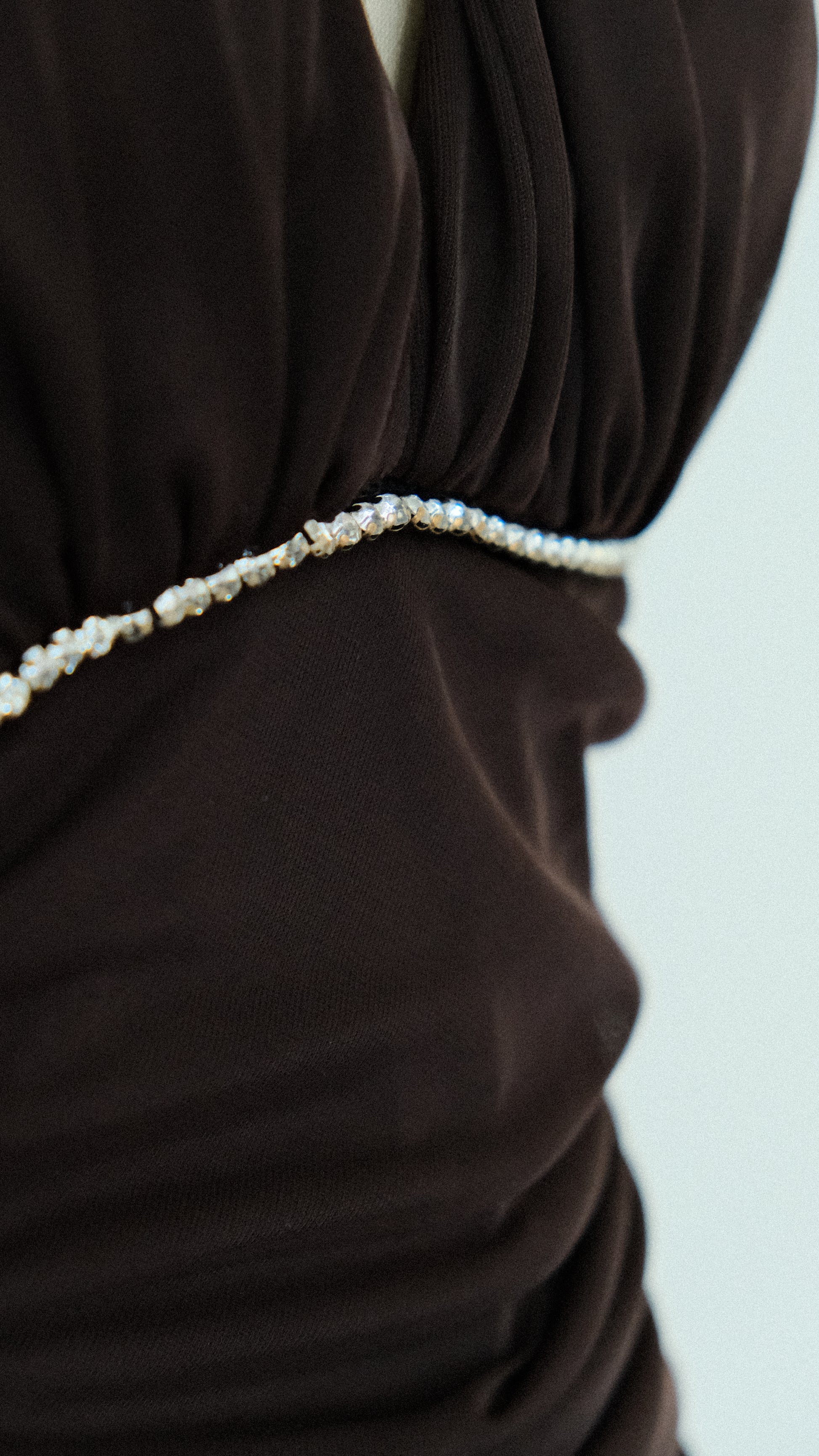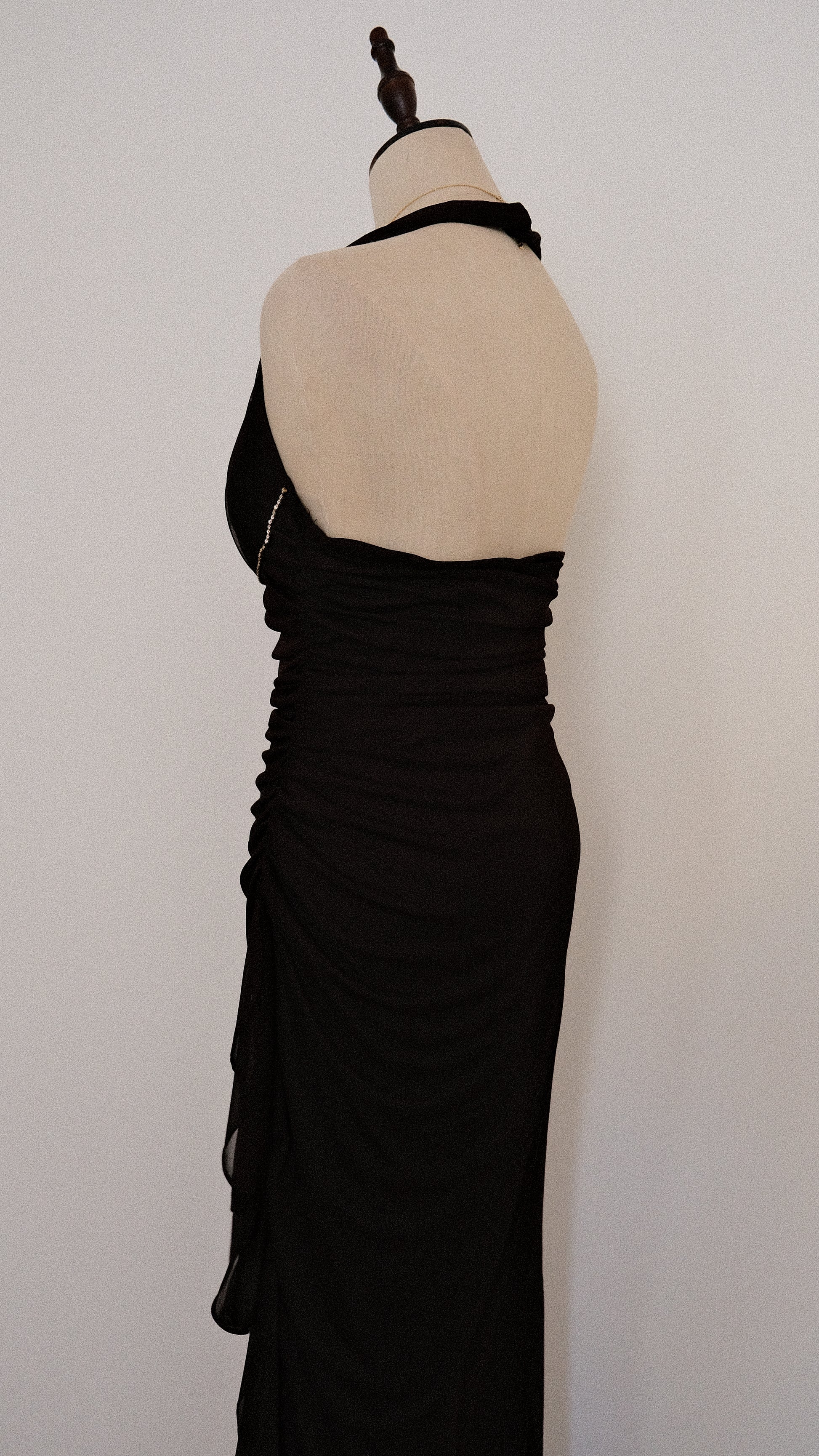 A fairygrunge romantic halter dress with draped material on the sides and a ruffled edge on one of the sides of the dress. The dress has adorable rhinestone details around the cups.