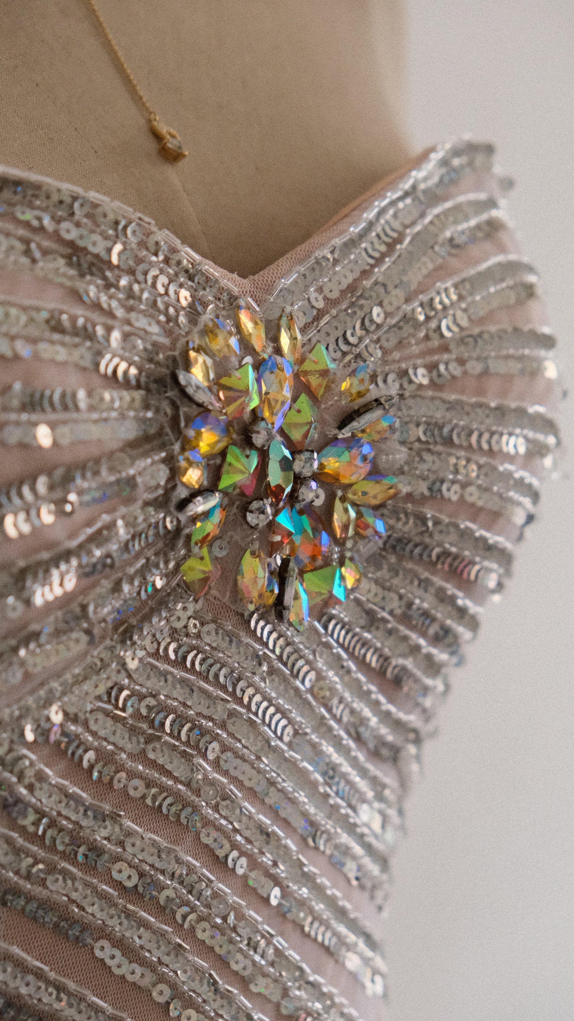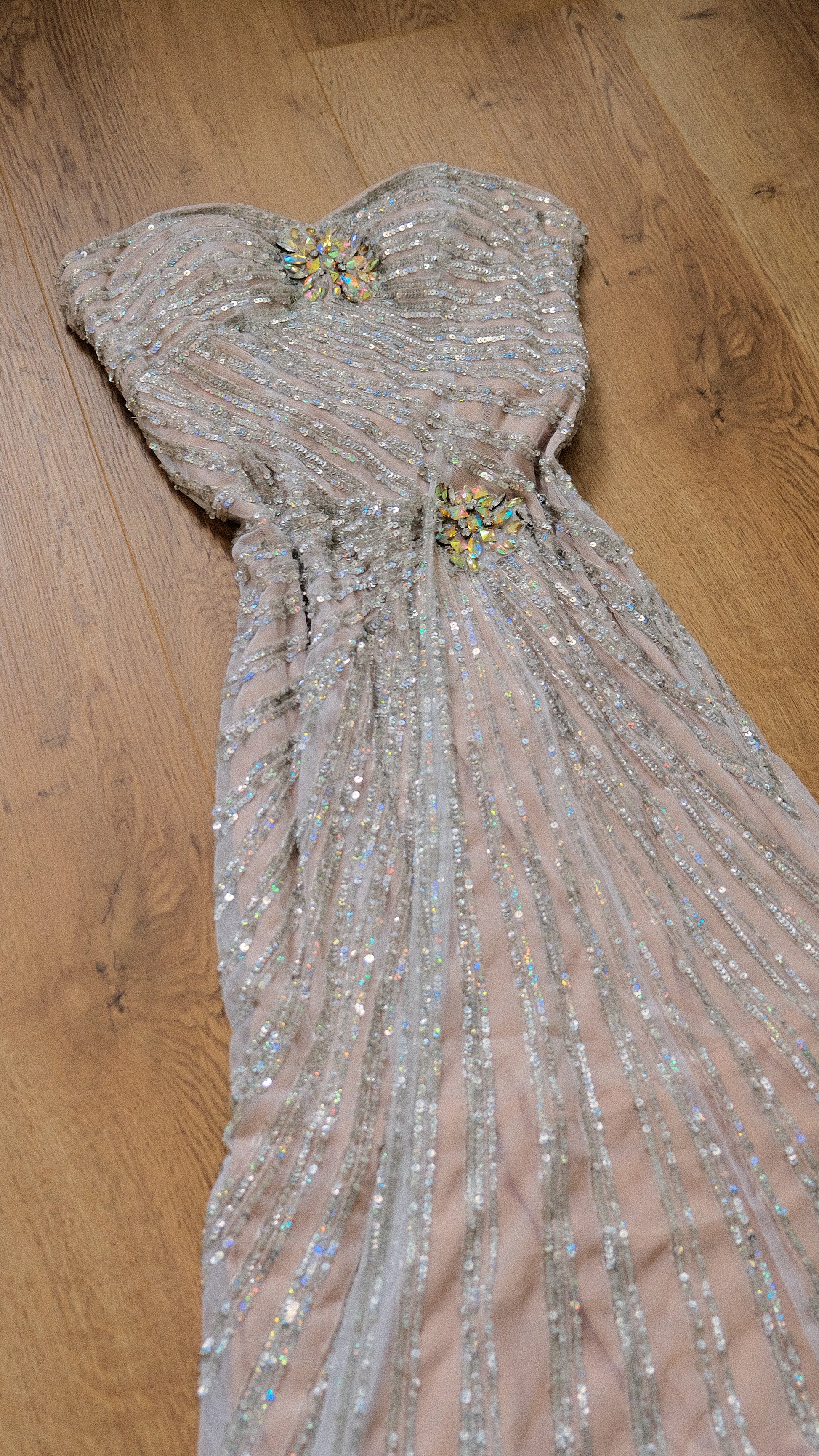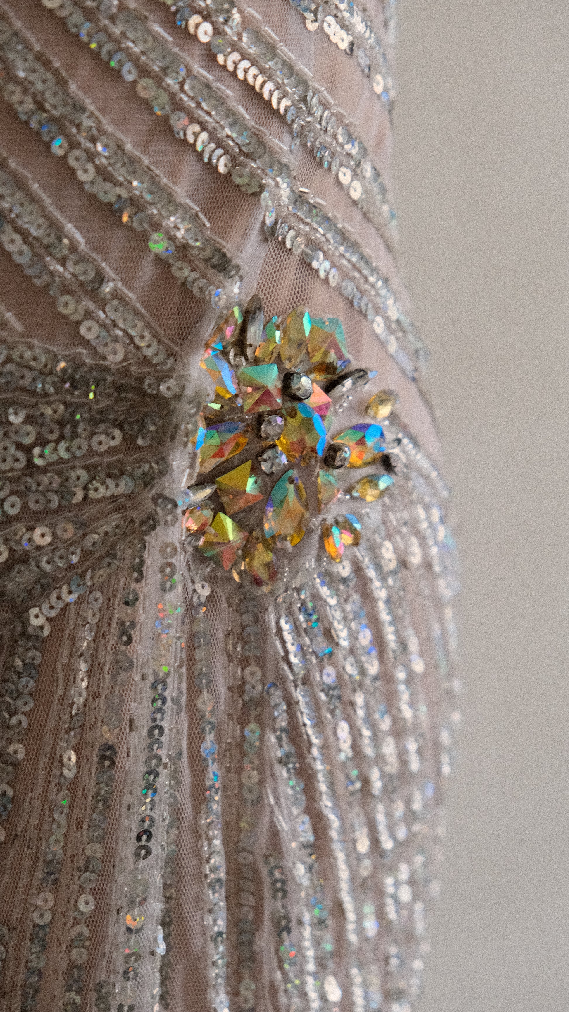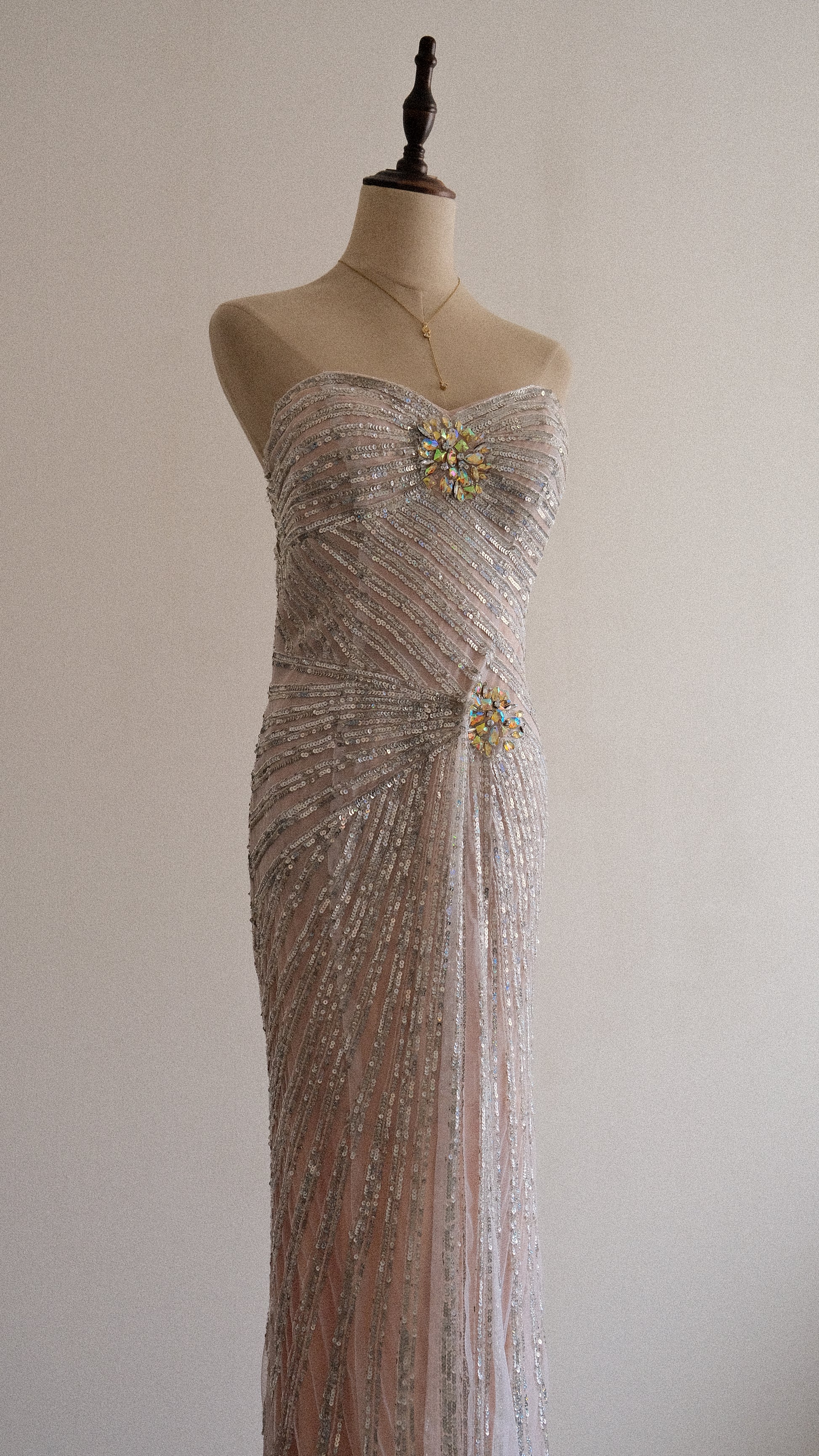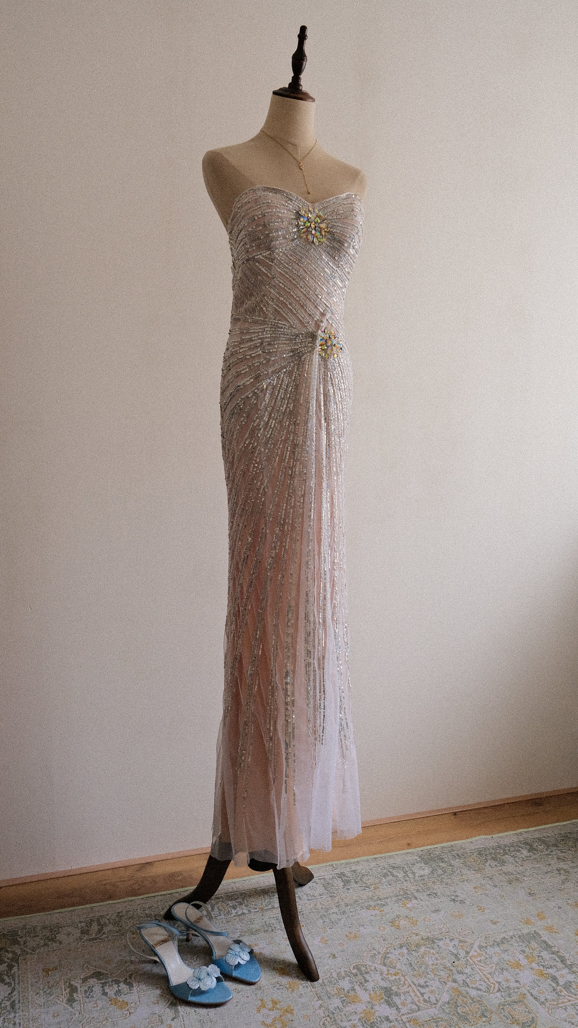 A cascading silver streak dress that mirrors the soft glint of moonlight on rippling waves.