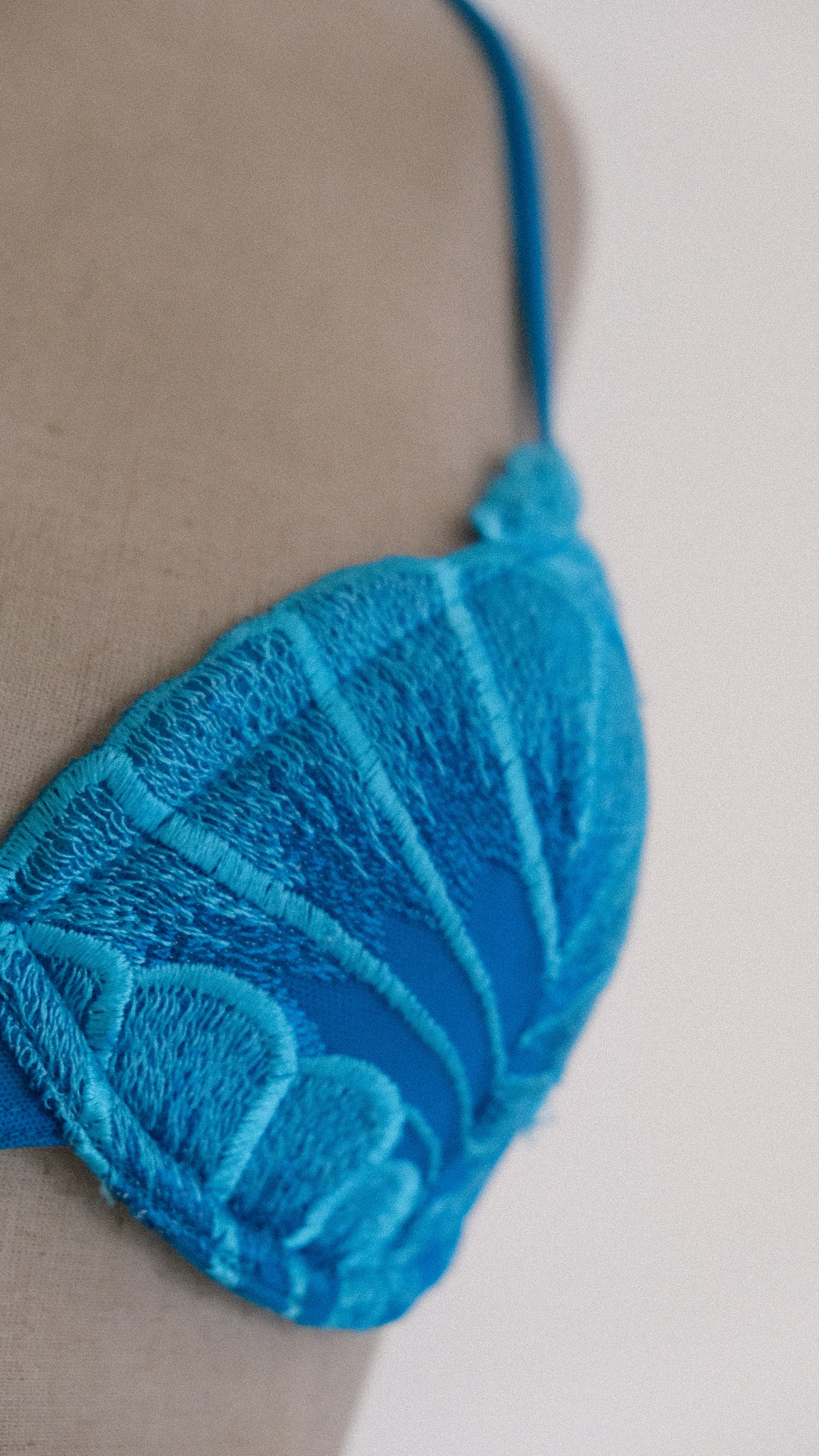 Rare French seashell mermaid bra: a darker blue bra with light blue ocean embroidery.