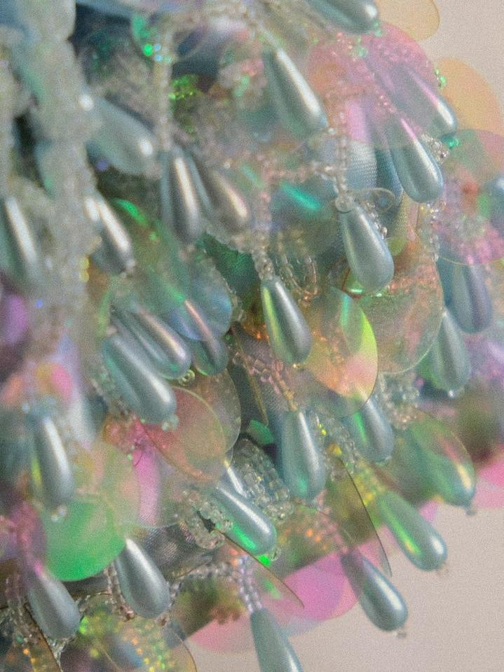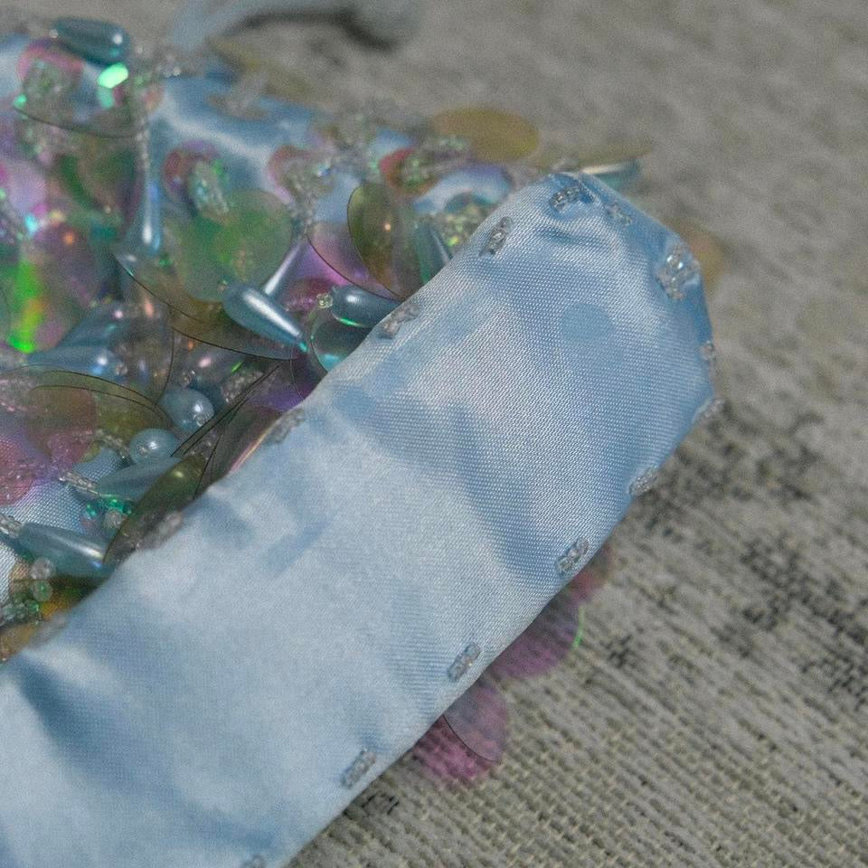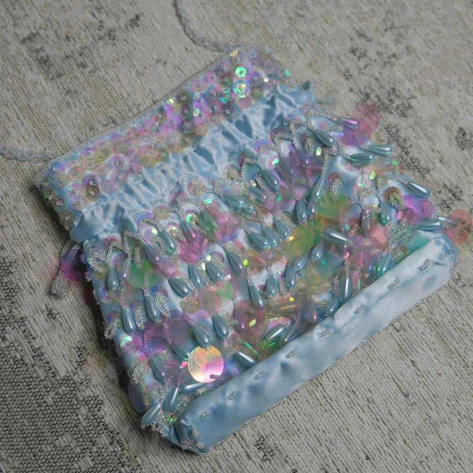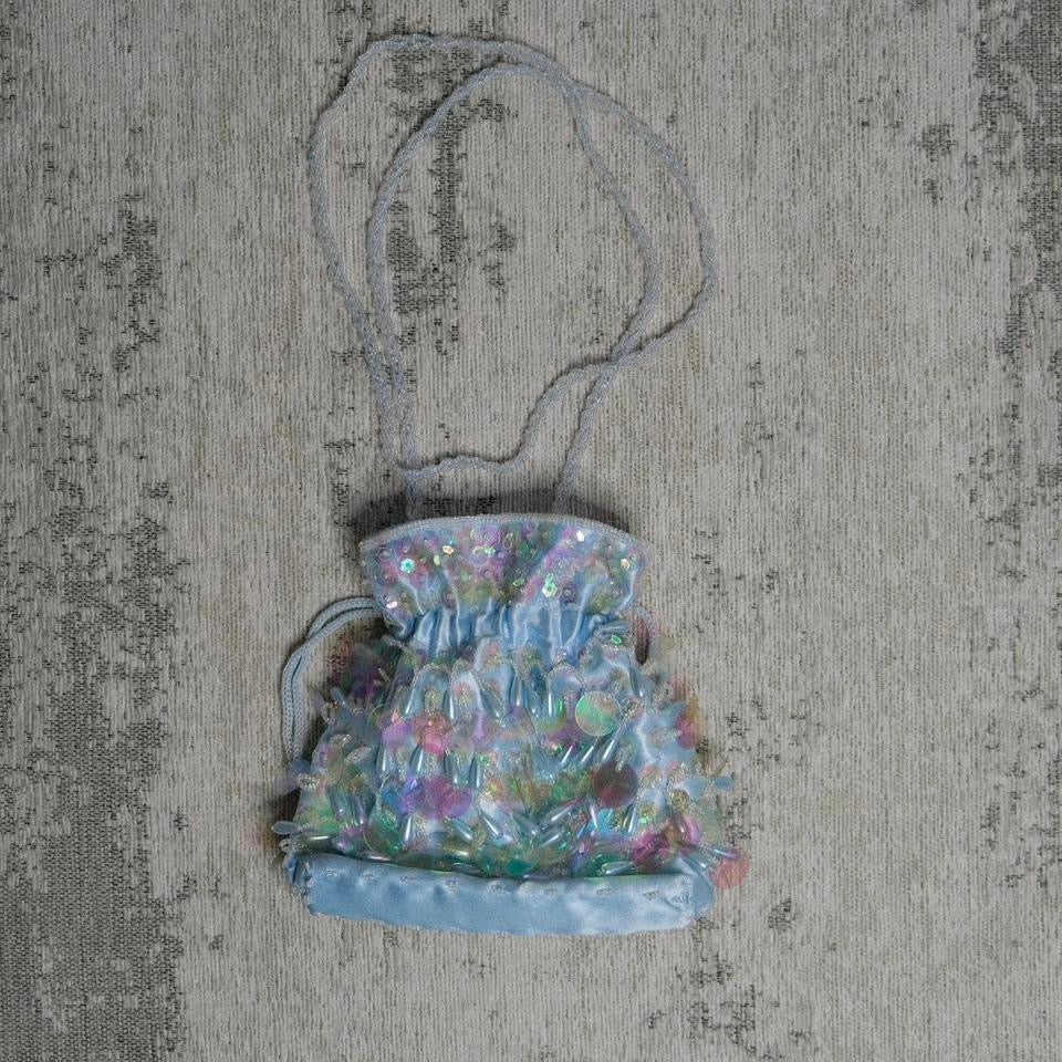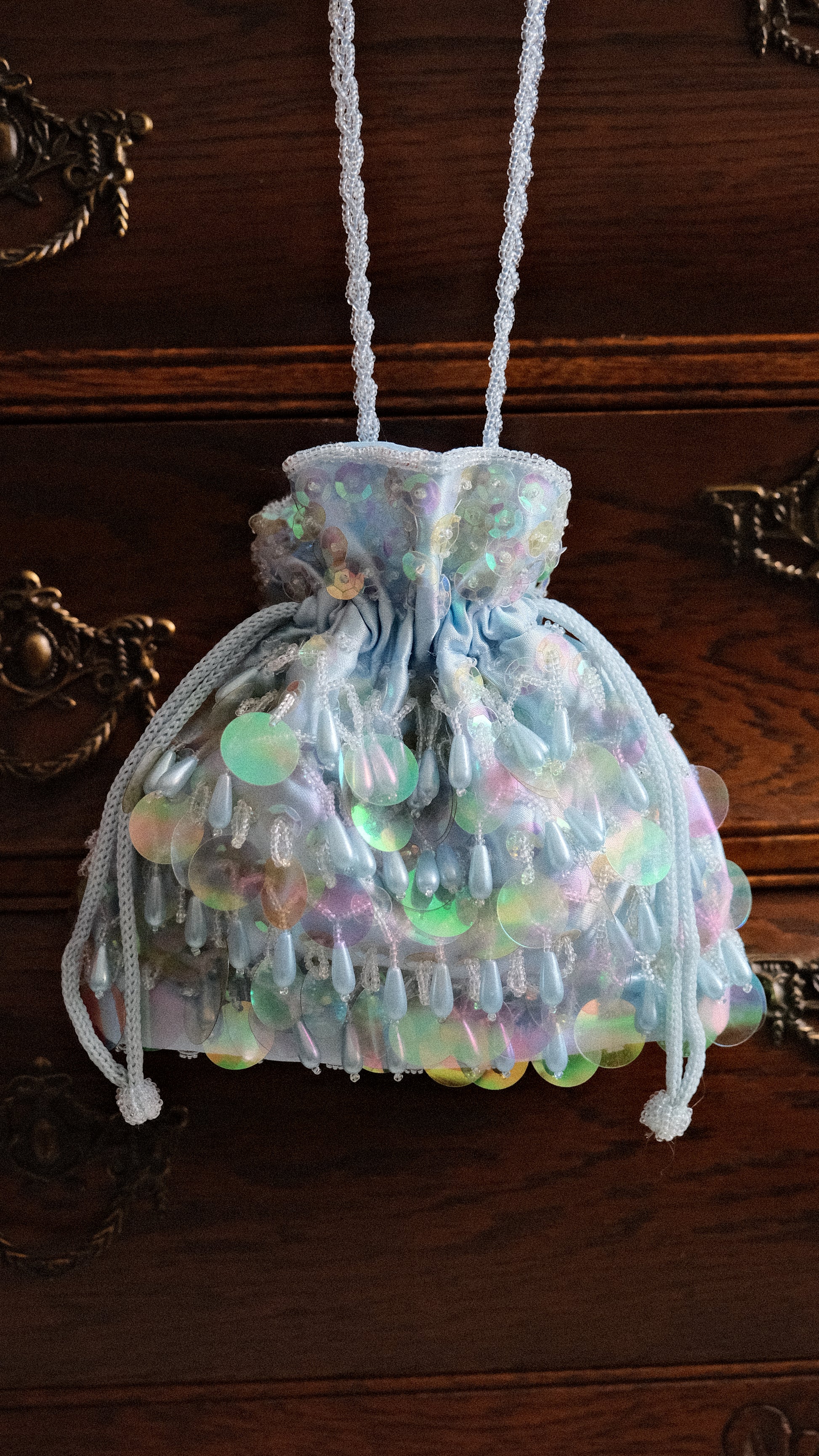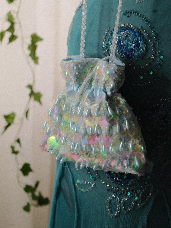 A dreamlike pouch with drawstrings, adorned with shimmering sequins that evoke a tidepool under the moonlight.
