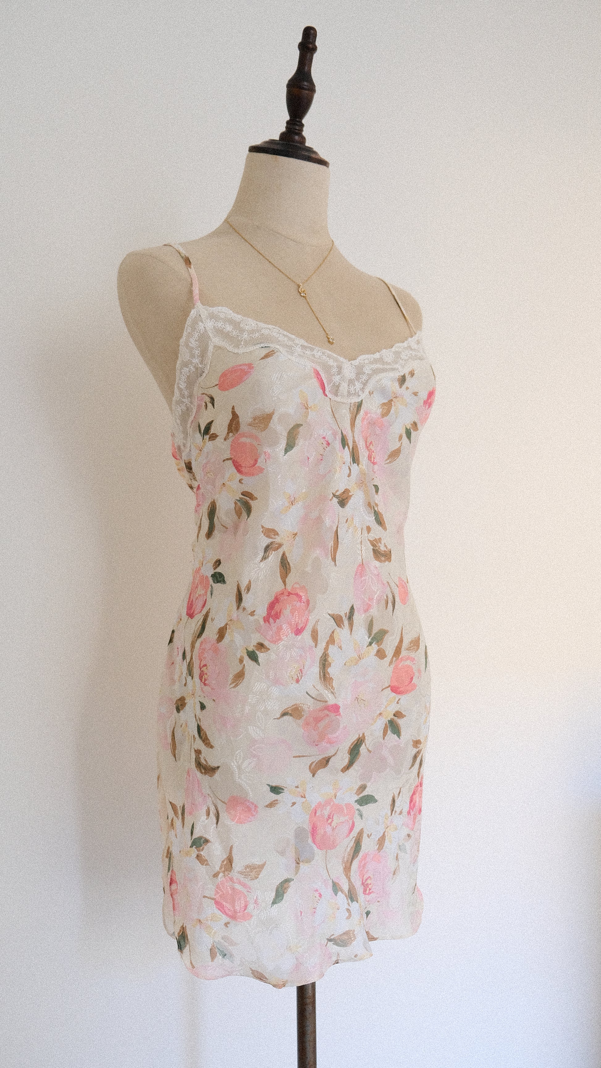 A delicate babydoll adorned with soft blush and cream blossoms.