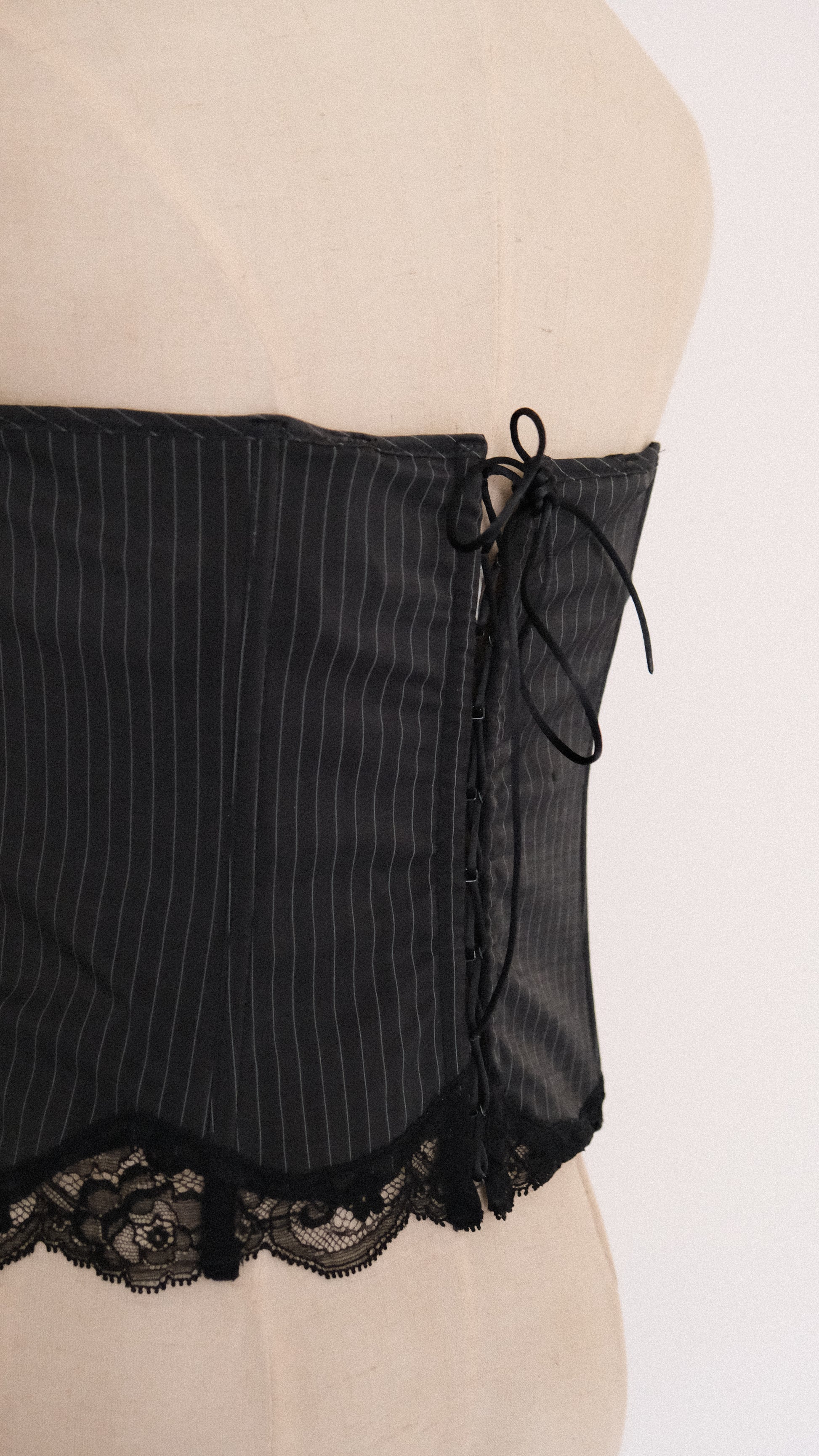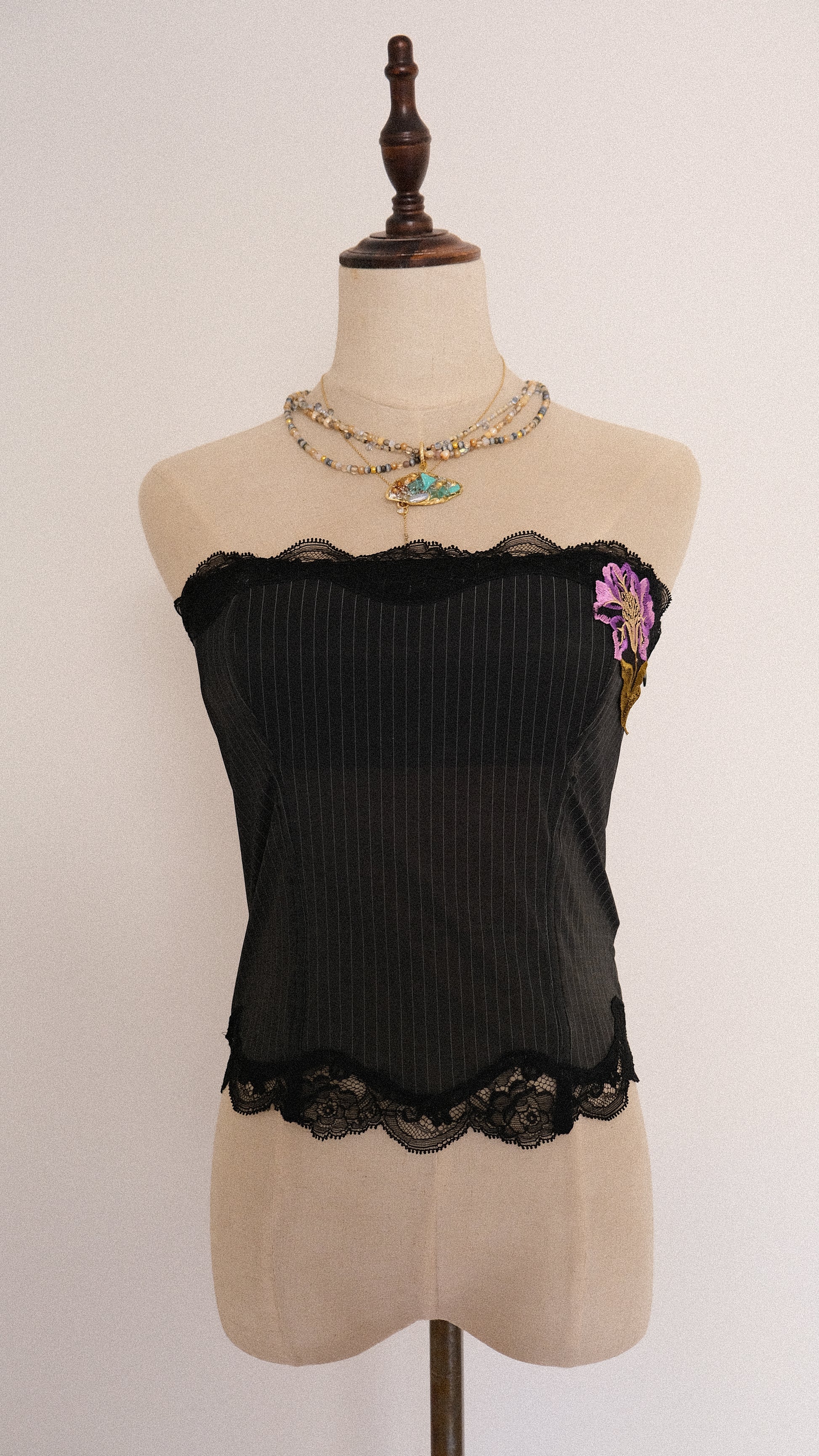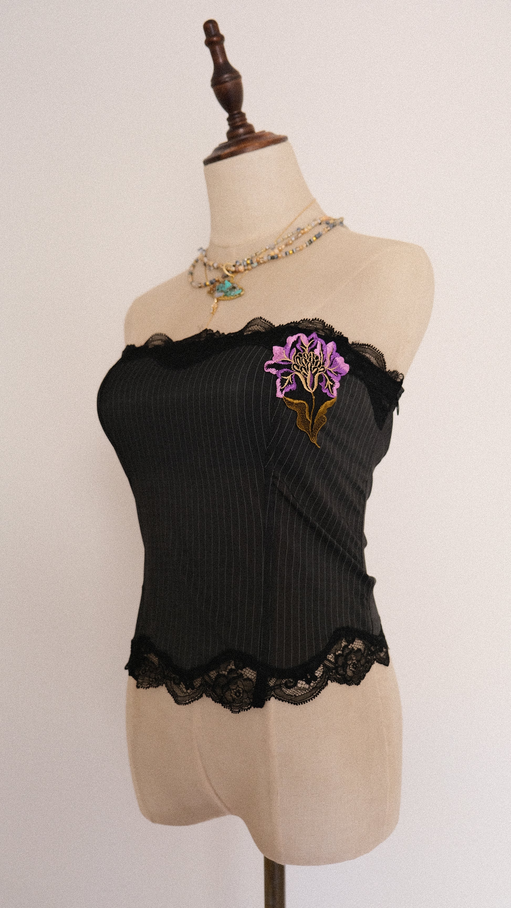 A garment that whispers of mystery and quiet allure. A perfect bustier for a fairy on a business trip. The bustier has a sophisticated striped pattern with lace edges and an purple flower detail.