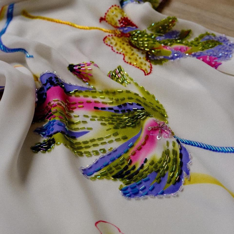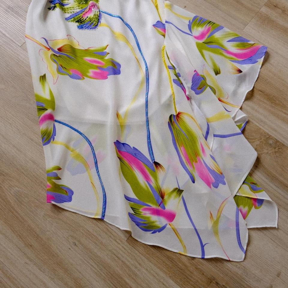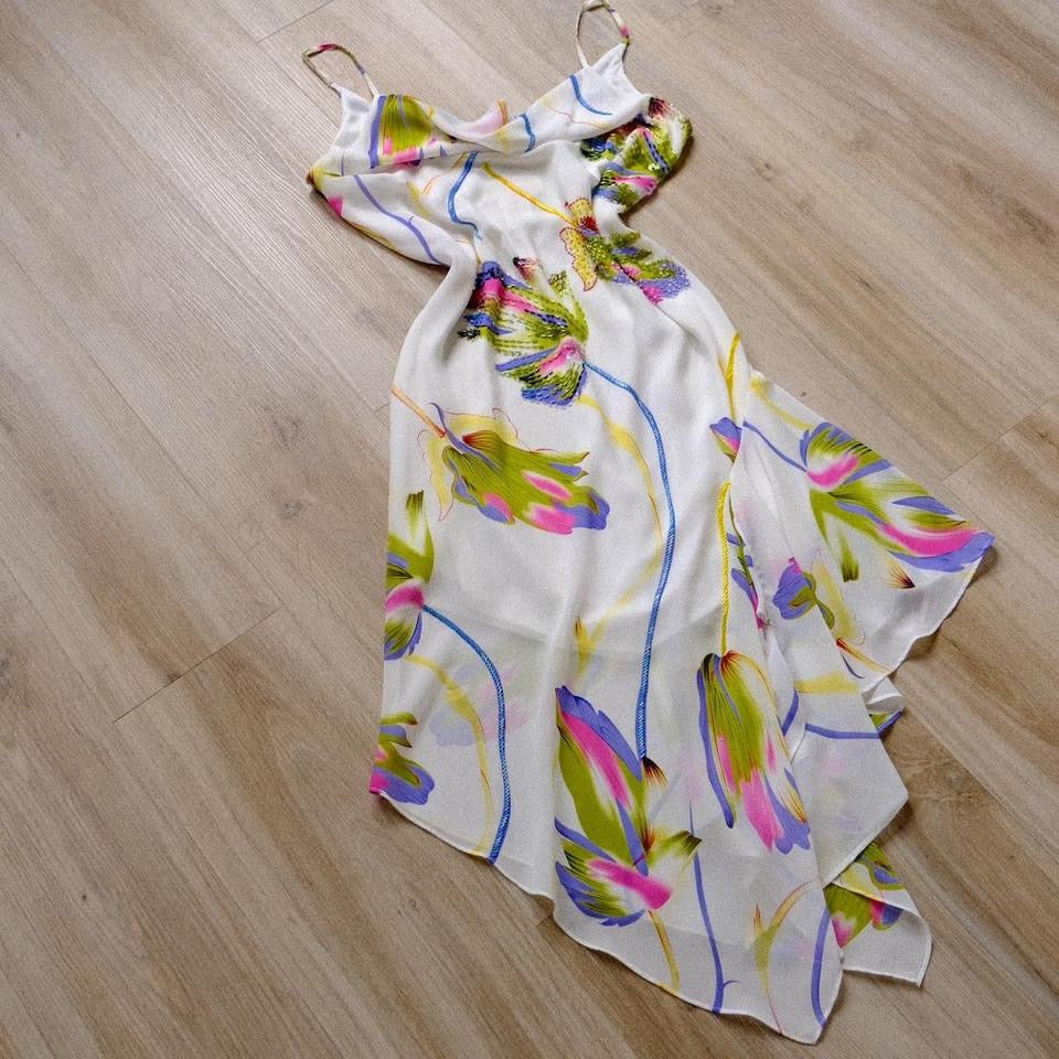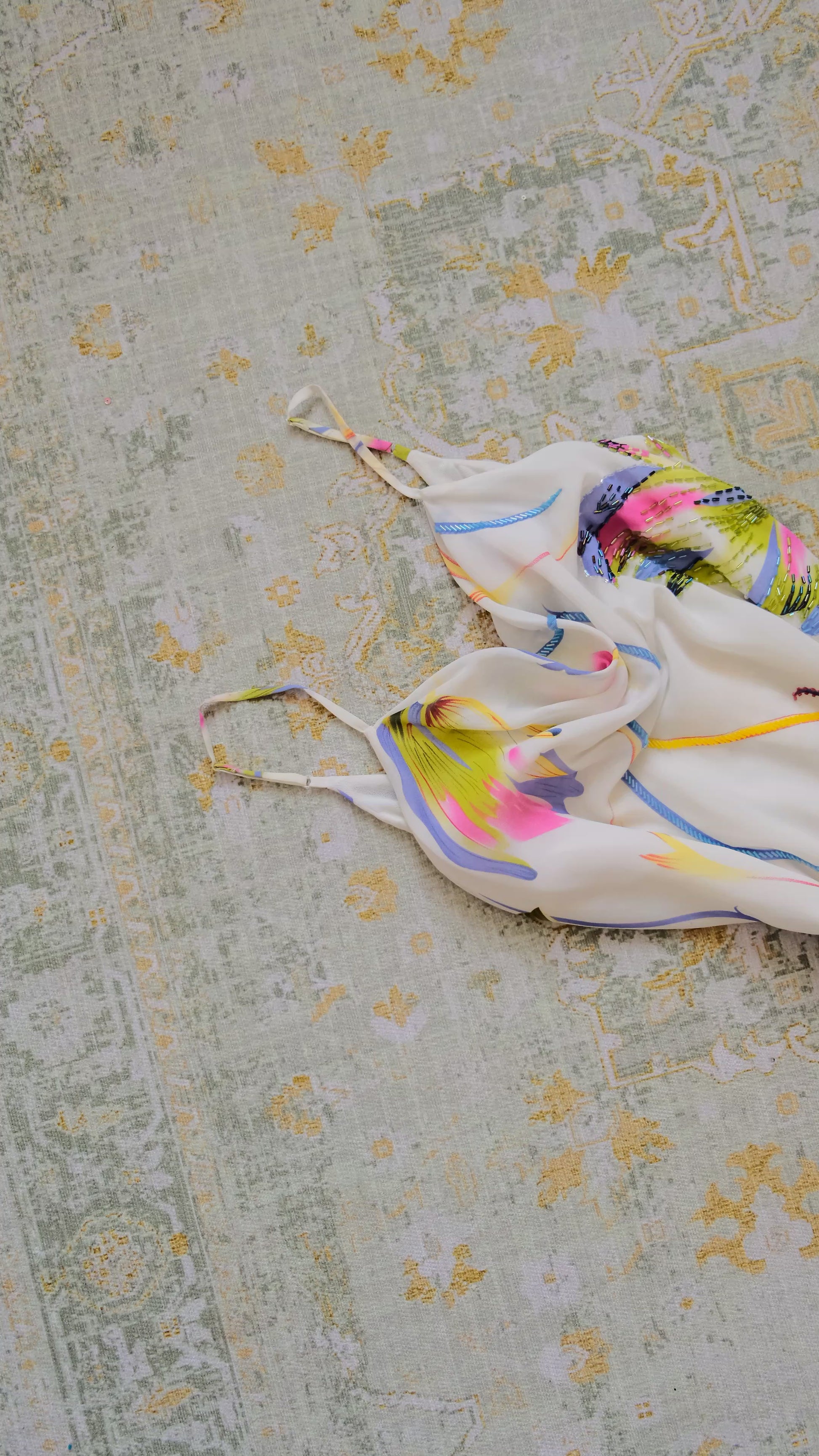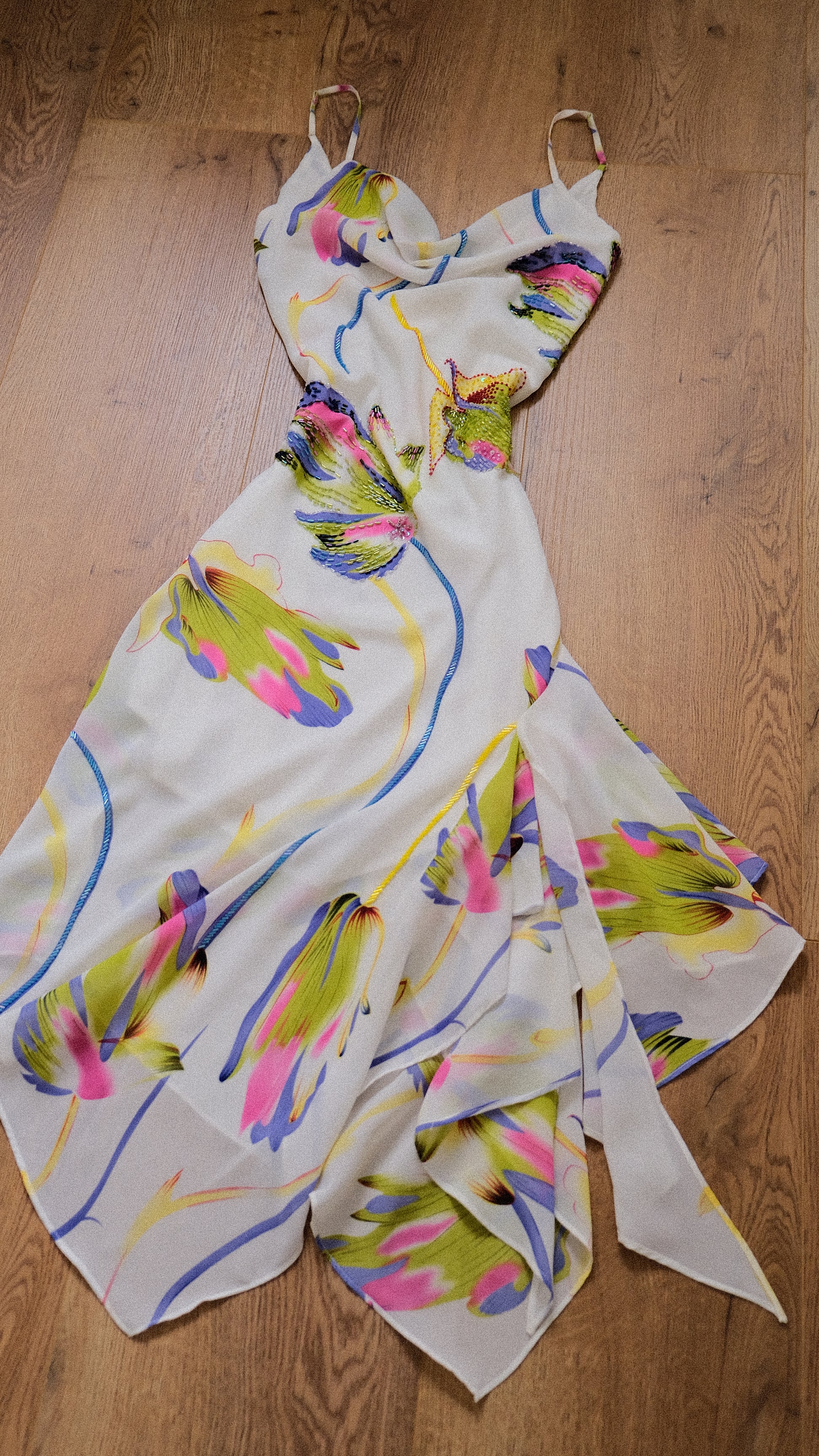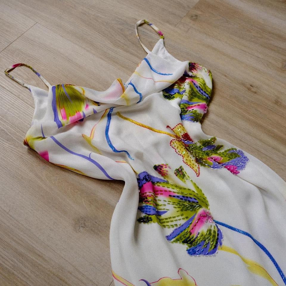 An angelic dress with colorful flower pattern and embellishments. A floral dress which is perfect for Spring.