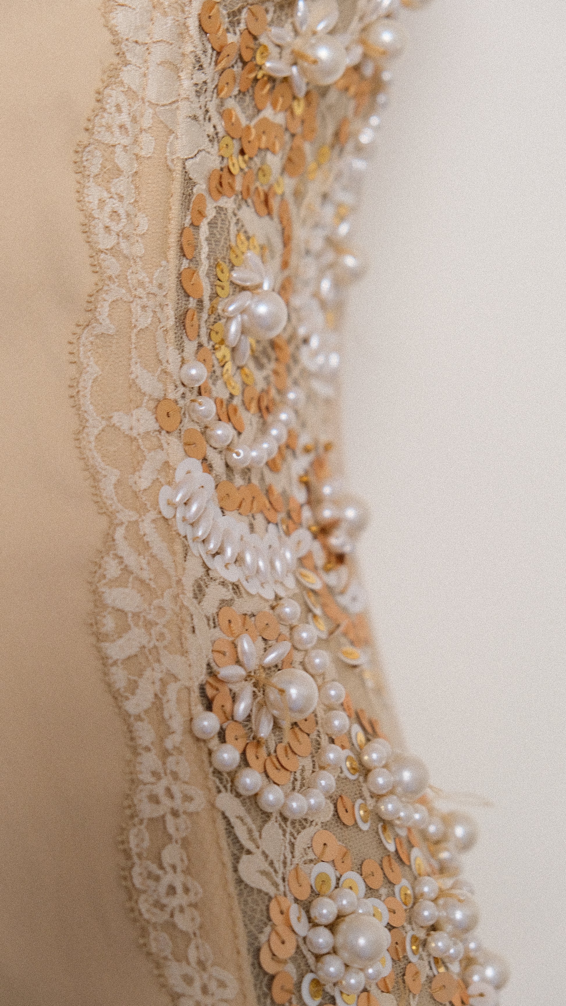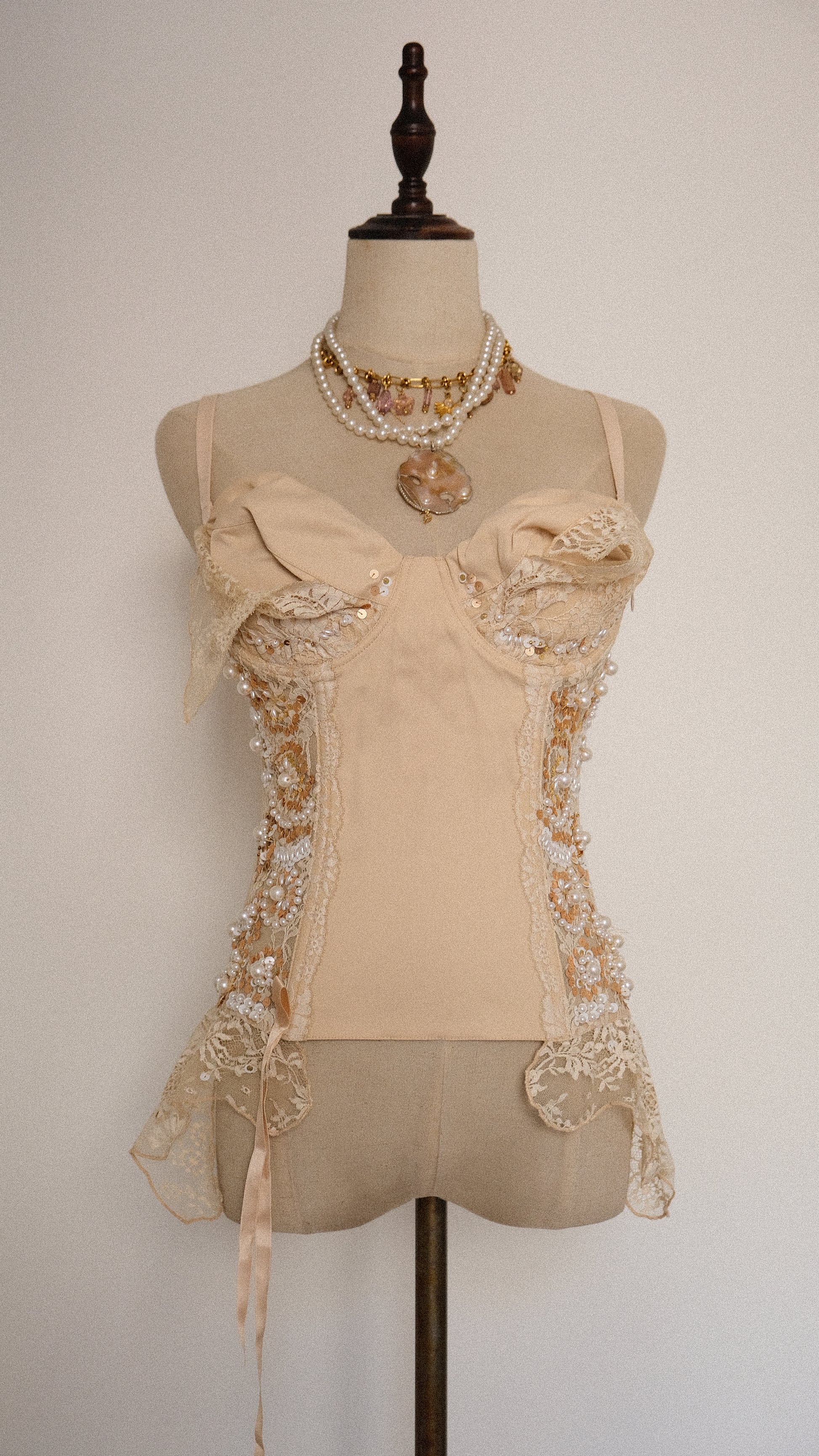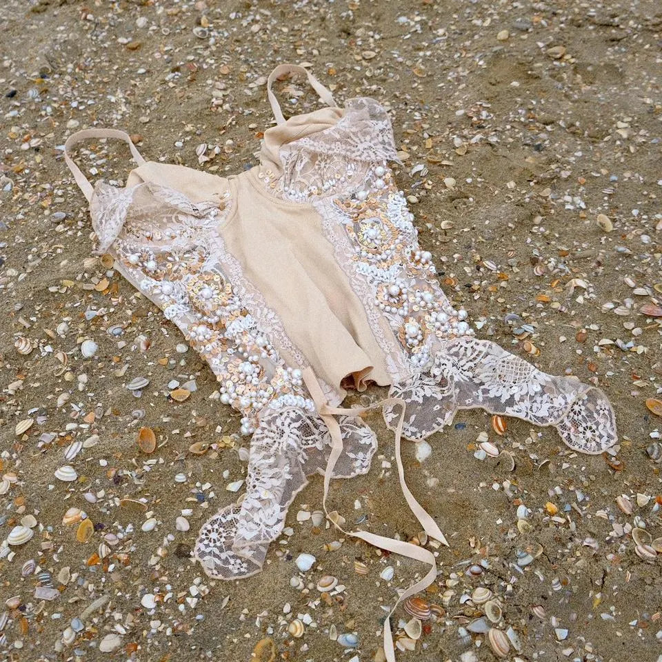 A delicate sandy corset top, embellished with faux pearls and sequins mirroring treasures of hidden ocean caves.