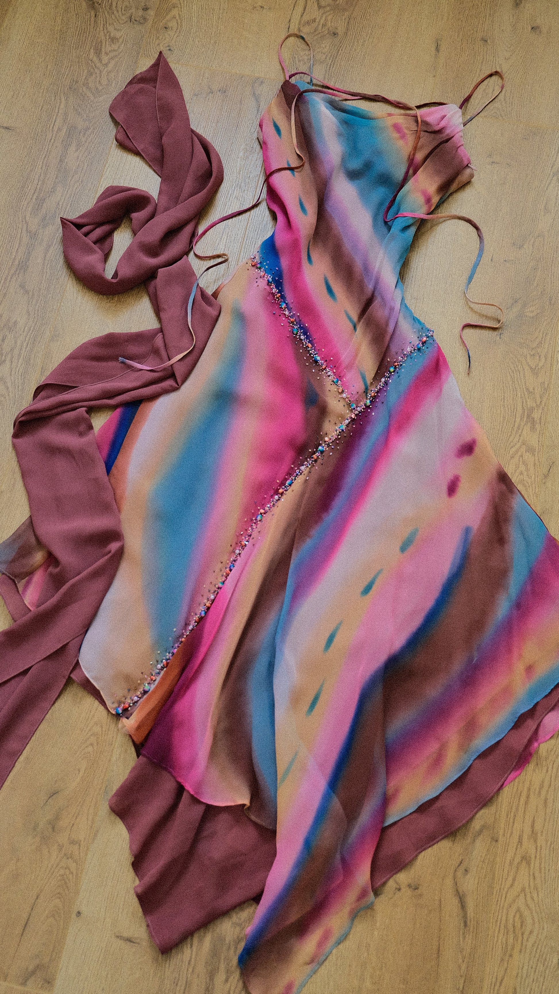 If a romantic sunset could be a dress, this would be a it! A rare embellished dress with a beautiful sunset hue color palette.