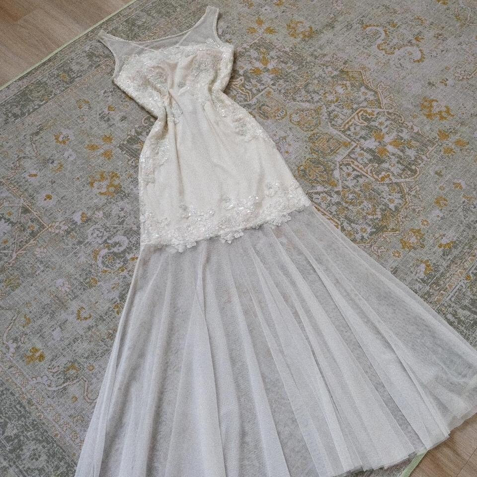A romantic embellished bridal dress with angelic embroidery, embellishments and ethereal tulle at the bottom.